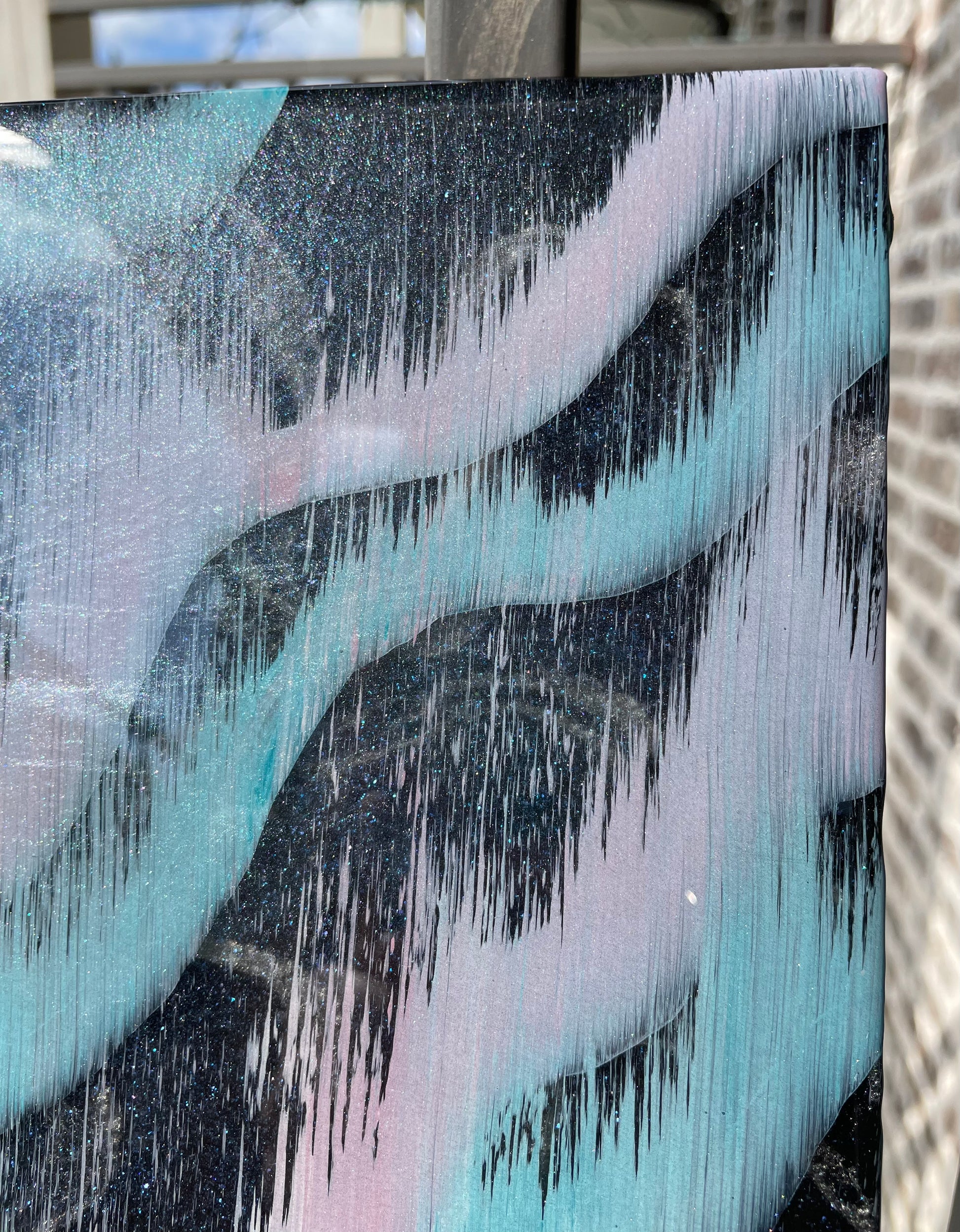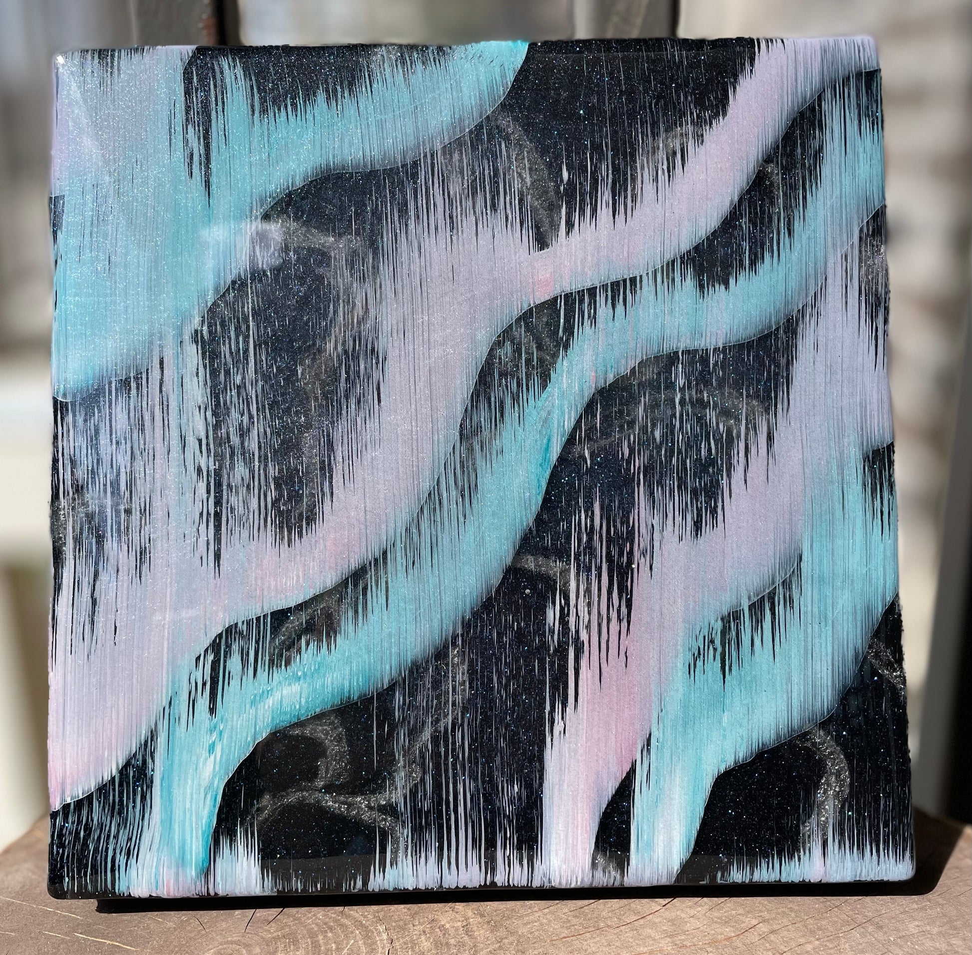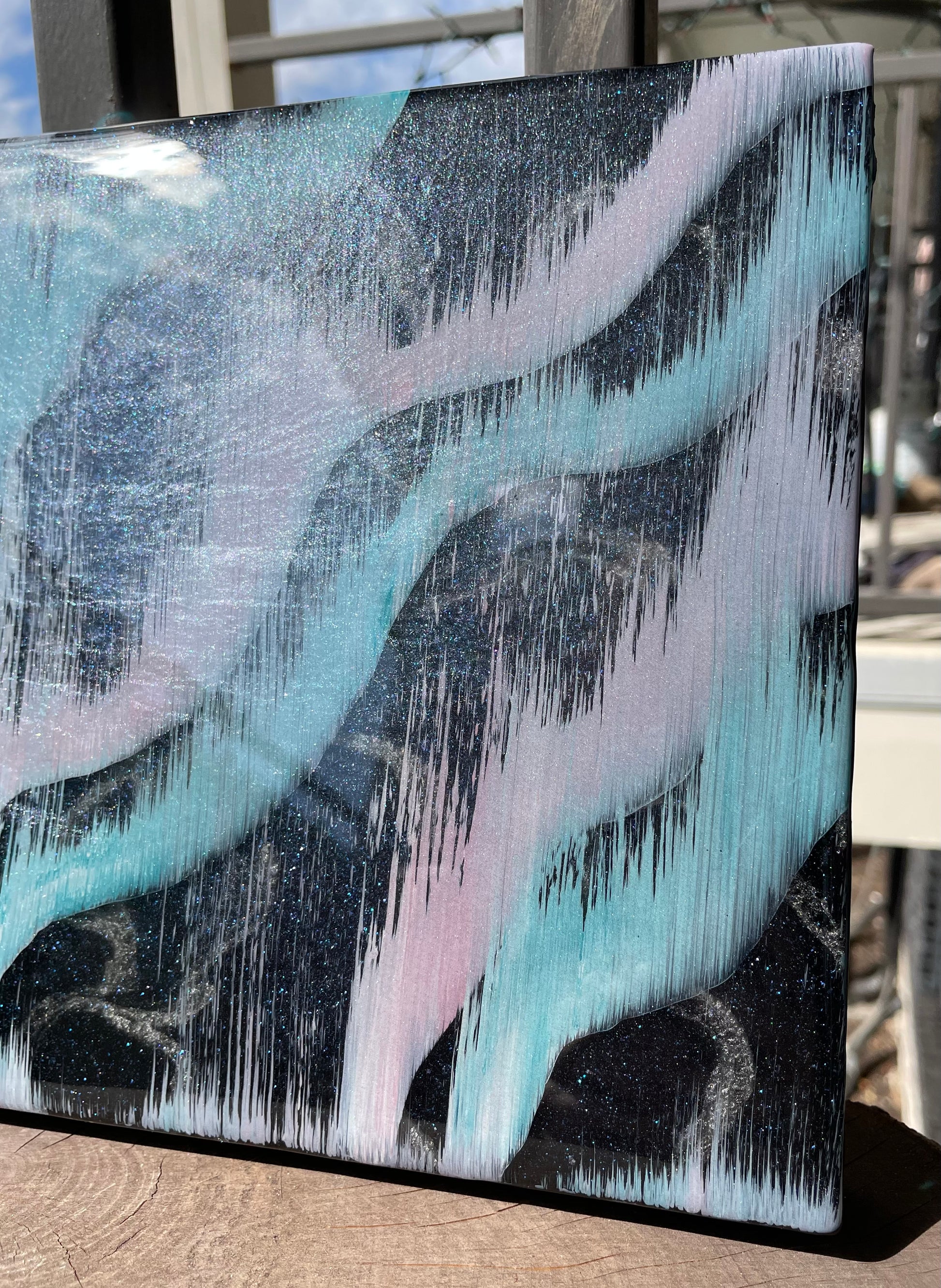 8x8 abstract wall art inspired by the northern lights and the night sky. This piece of artwork has multiple layers of depth to truly appreciate the night sky. There is a layer of metallic silver enhancement, a layer of sparkle pigment, a painted layer of the northern lights and the last layer is a tinted black layer of resin.
