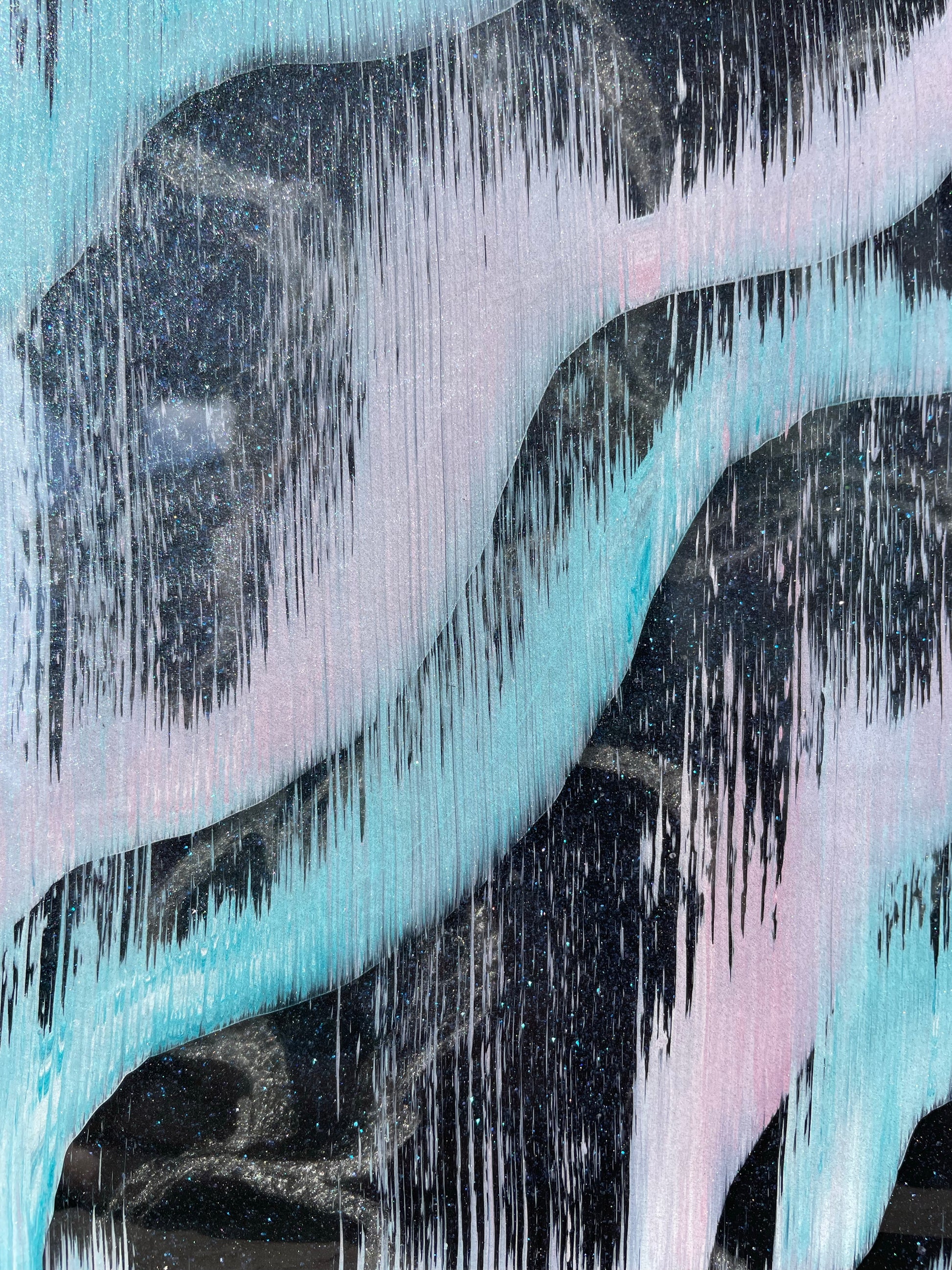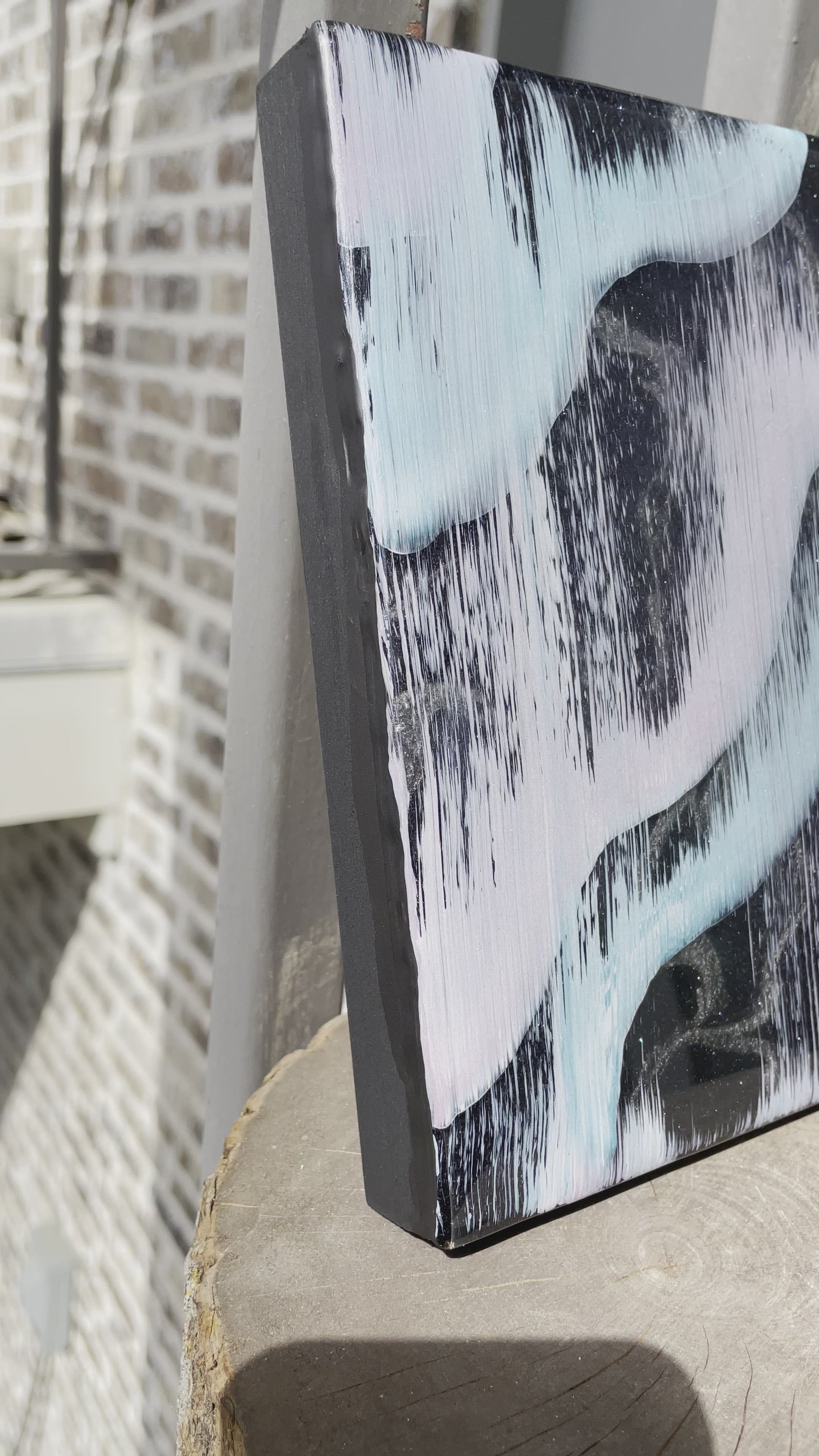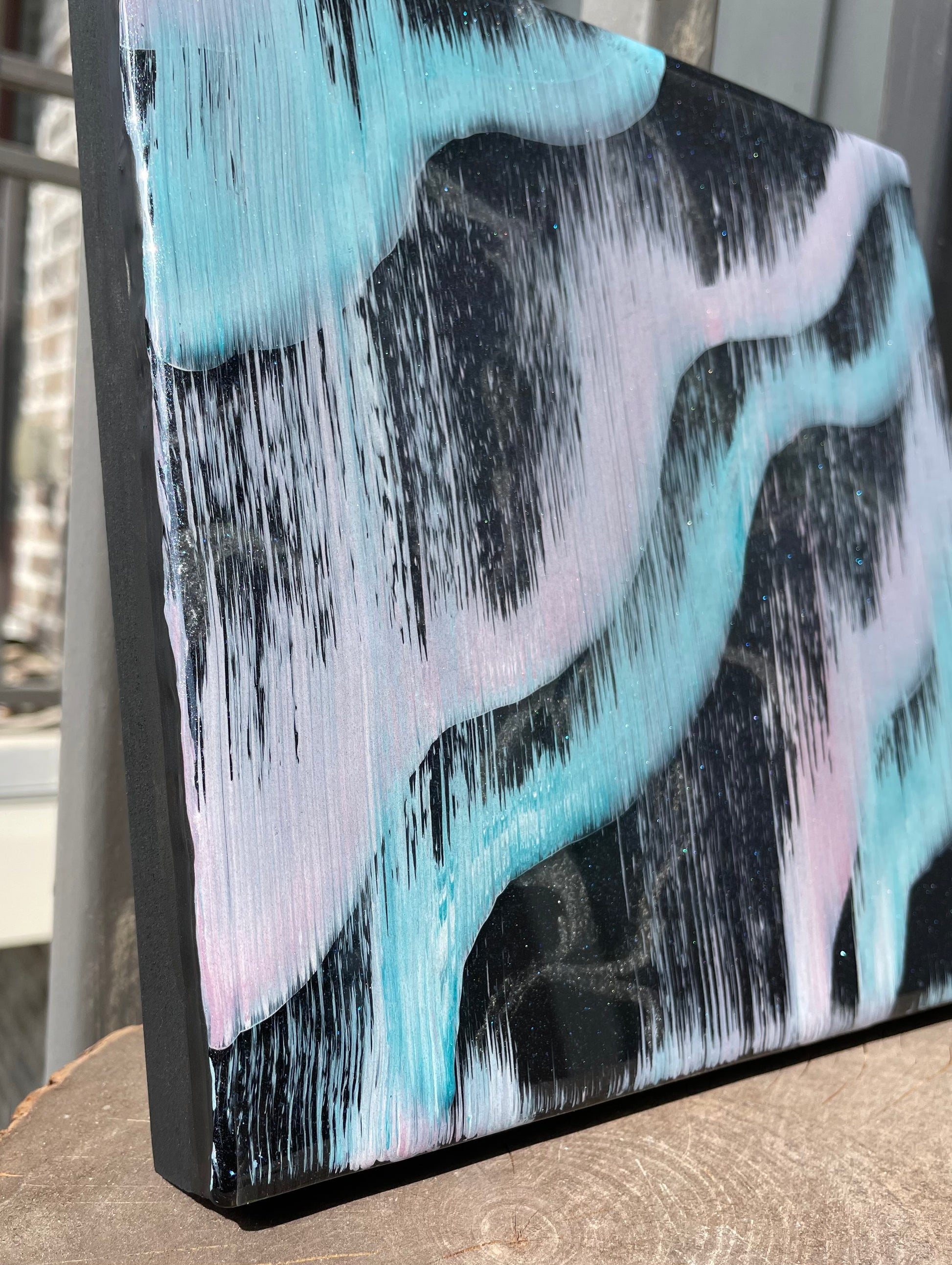 8x8 abstract wall art inspired by the northern lights and the night sky. This piece of artwork has multiple layers of depth to truly appreciate the night sky. There is a layer of metallic silver enhancement, a layer of sparkle pigment, a painted layer of the northern lights and the last layer is a tinted black layer of resin.