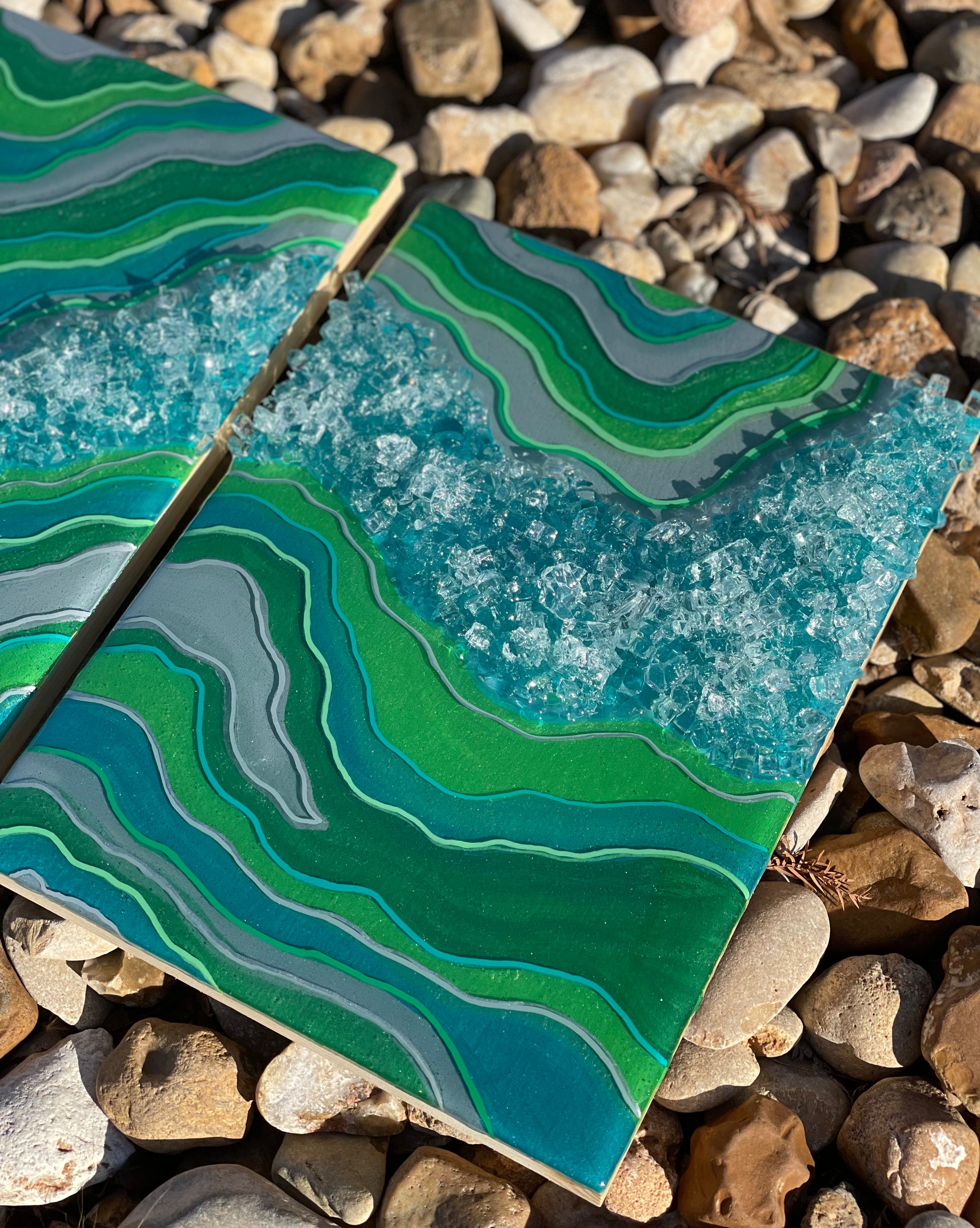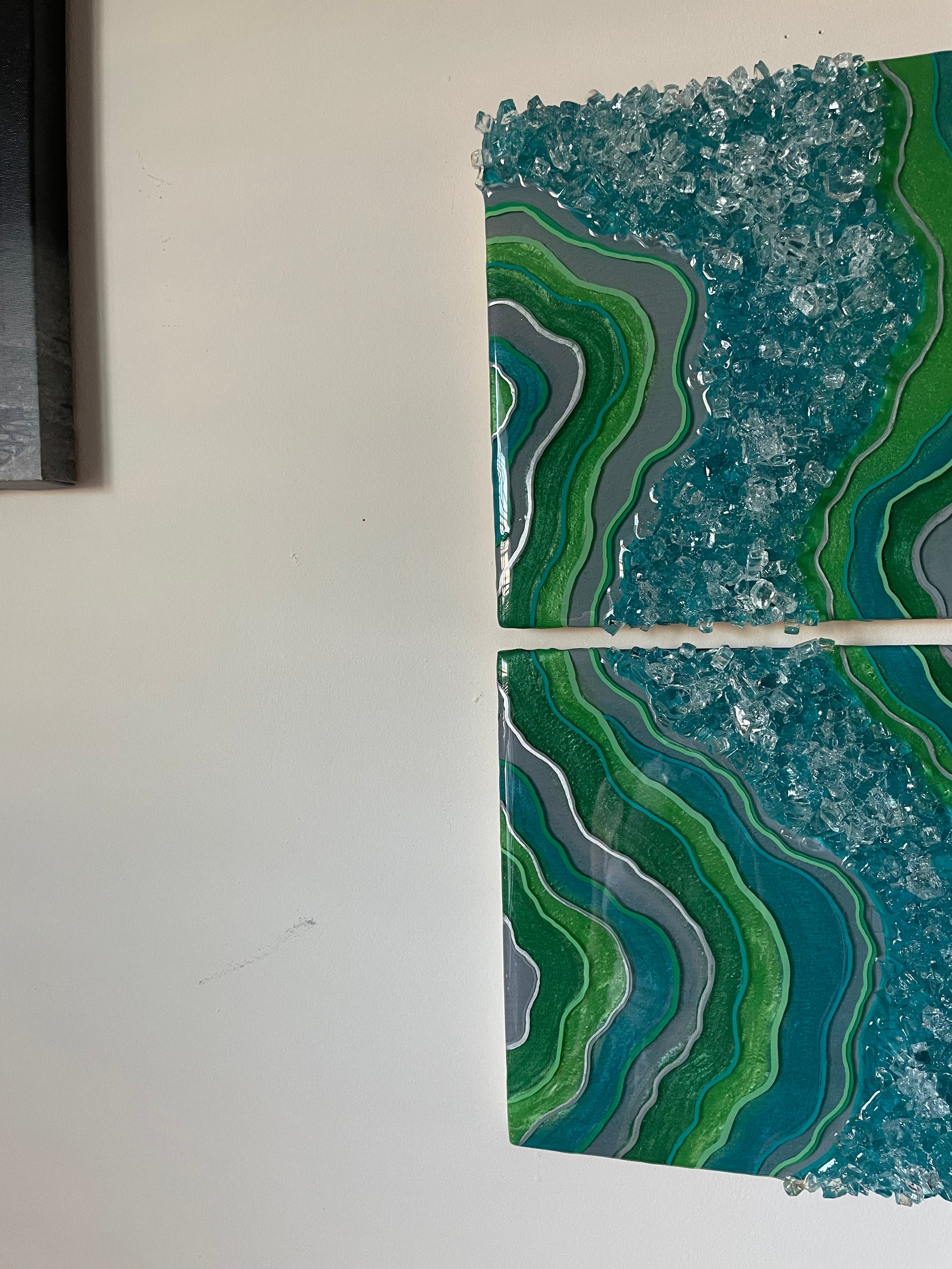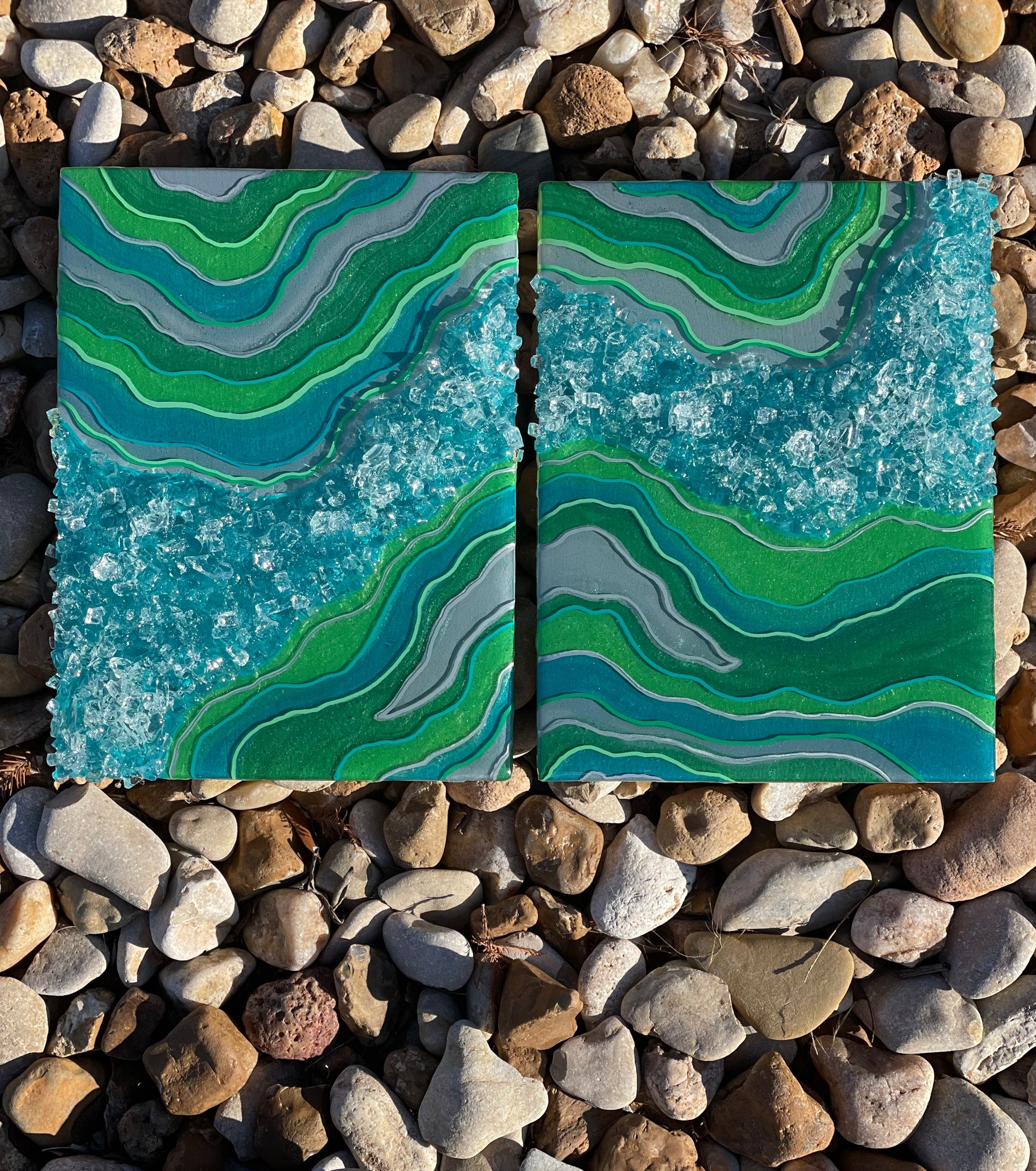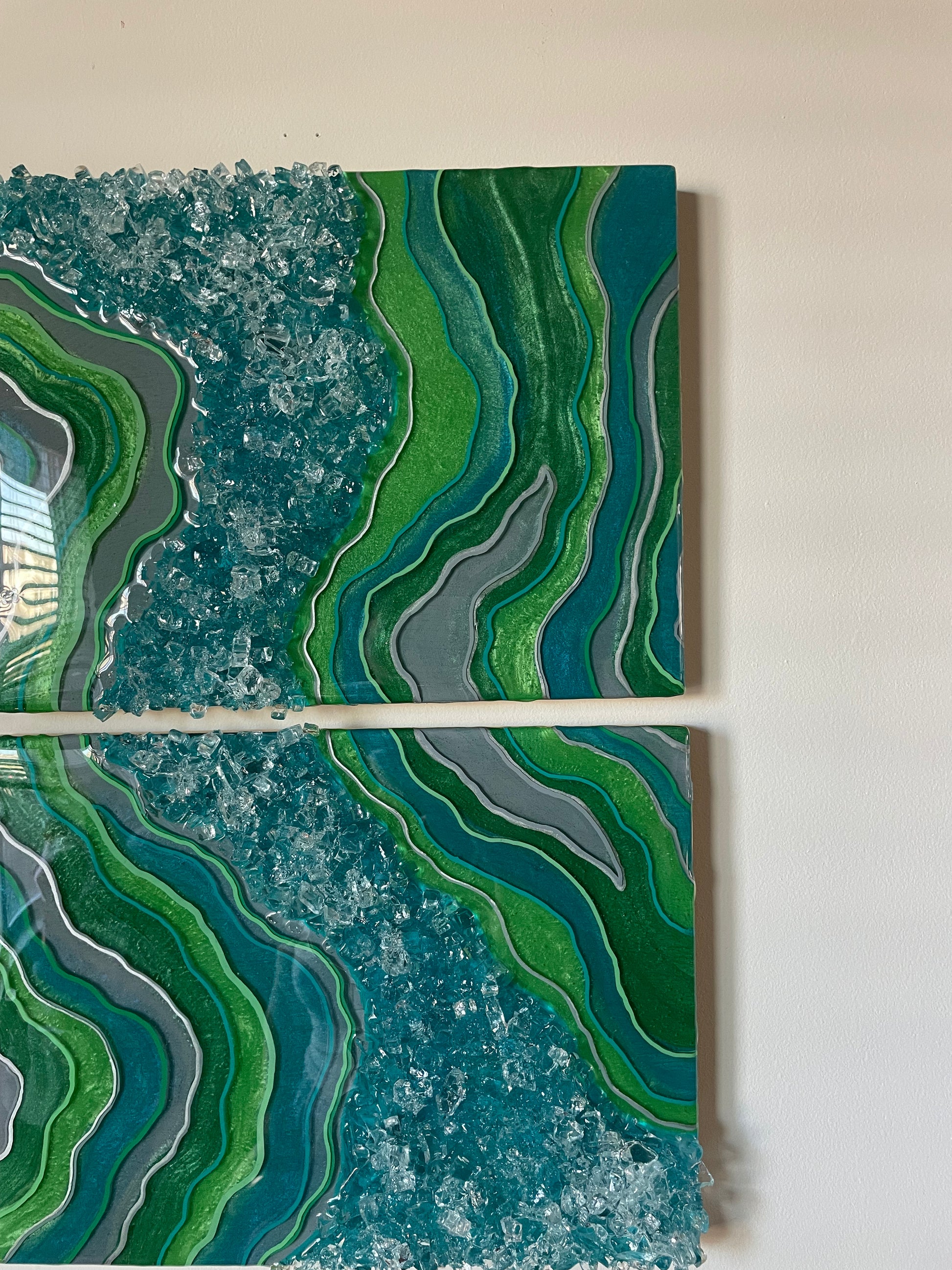 9x12in wood canvas x 2 (18x12 when hung together) geode set mixed media made. This set has a painted layer background, under pigmented resin layers, clear layers to enhance the depth of this set, detailed lines and crushed mirror pieces to mimic the texture of a geode slice.