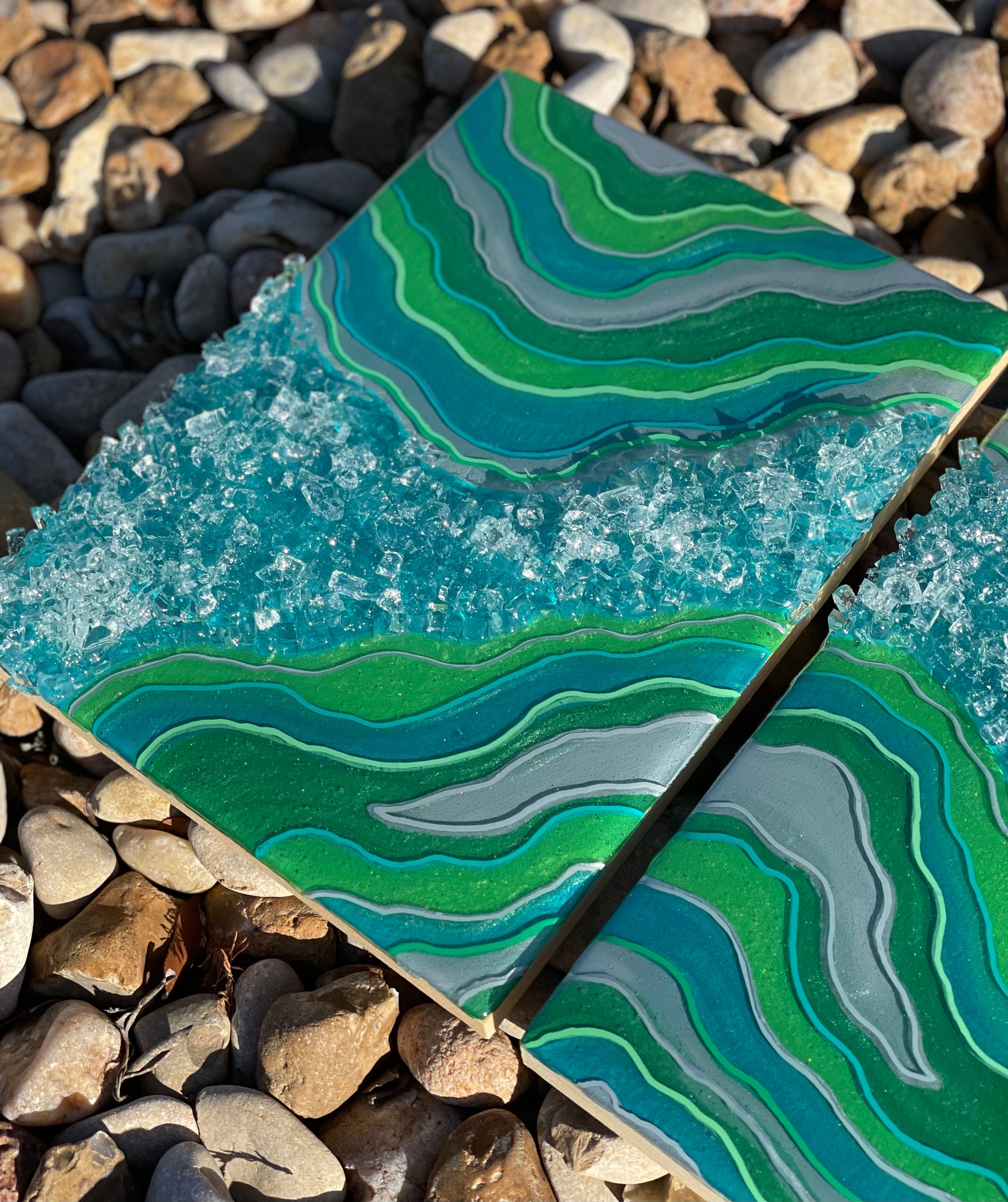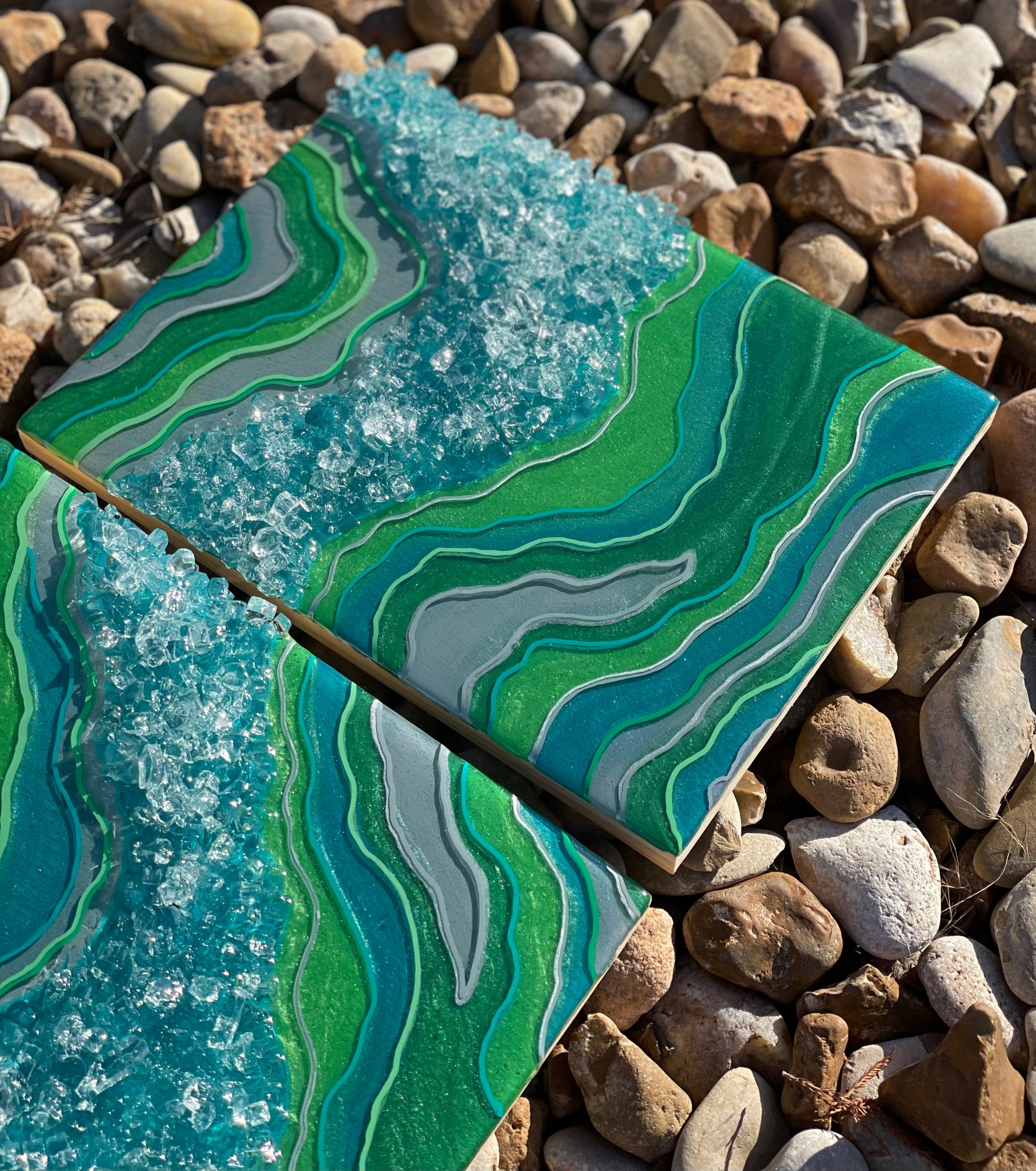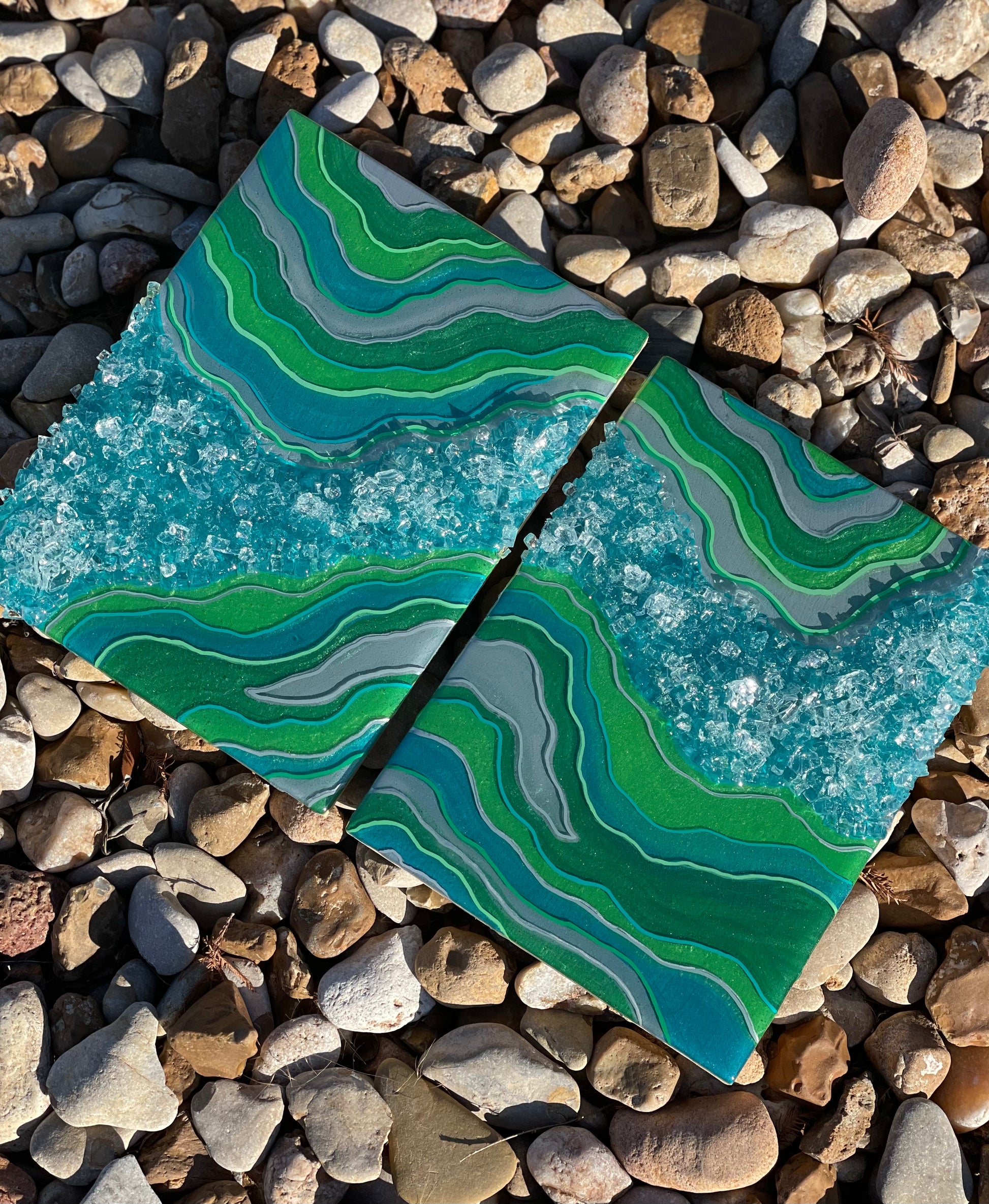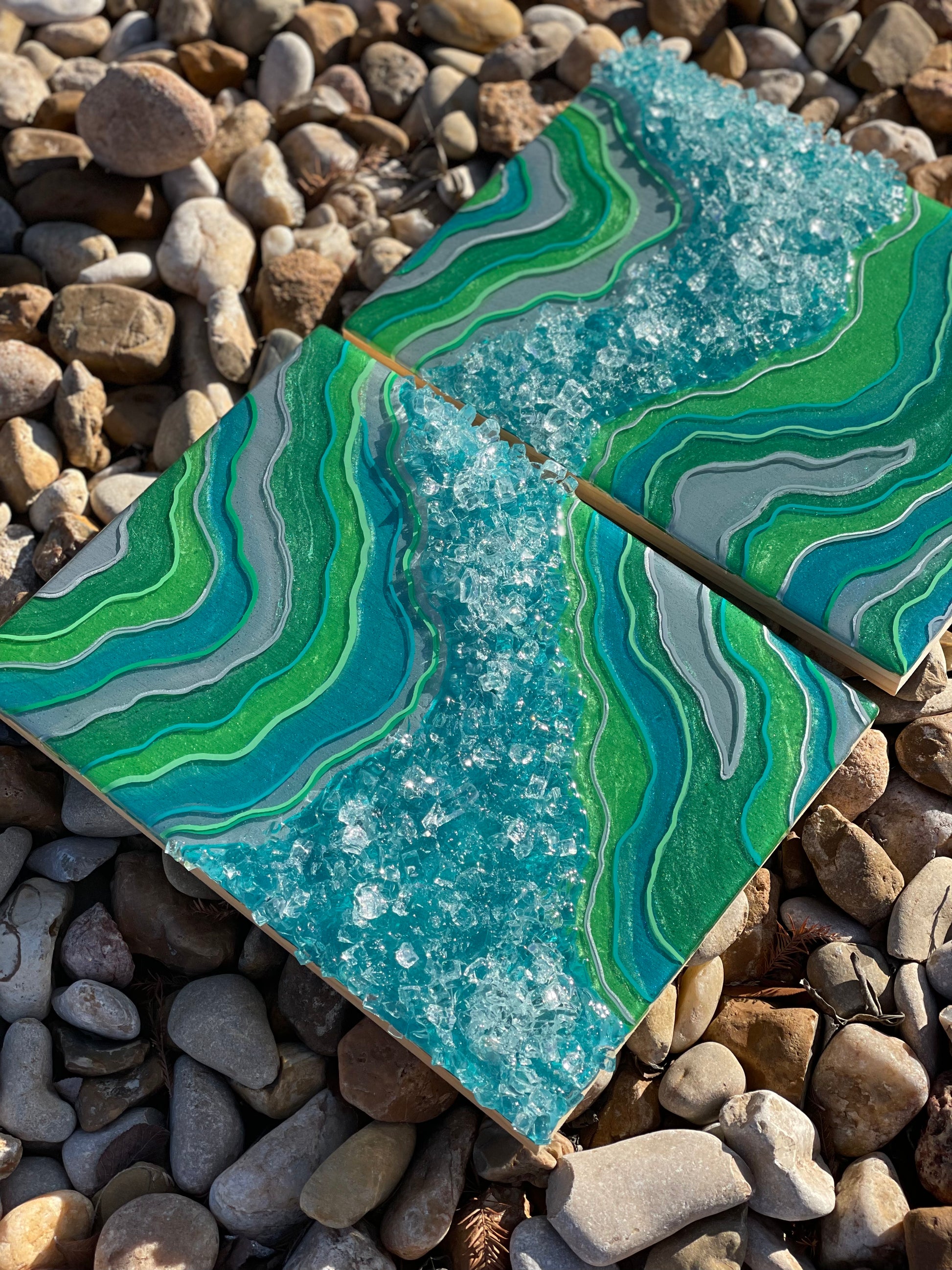 9x12in wood canvas x 2 (18x12 when hung together) geode set mixed media made. This set has a painted layer background, under pigmented resin layers, clear layers to enhance the depth of this set, detailed lines and crushed mirror pieces to mimic the texture of a geode slice.