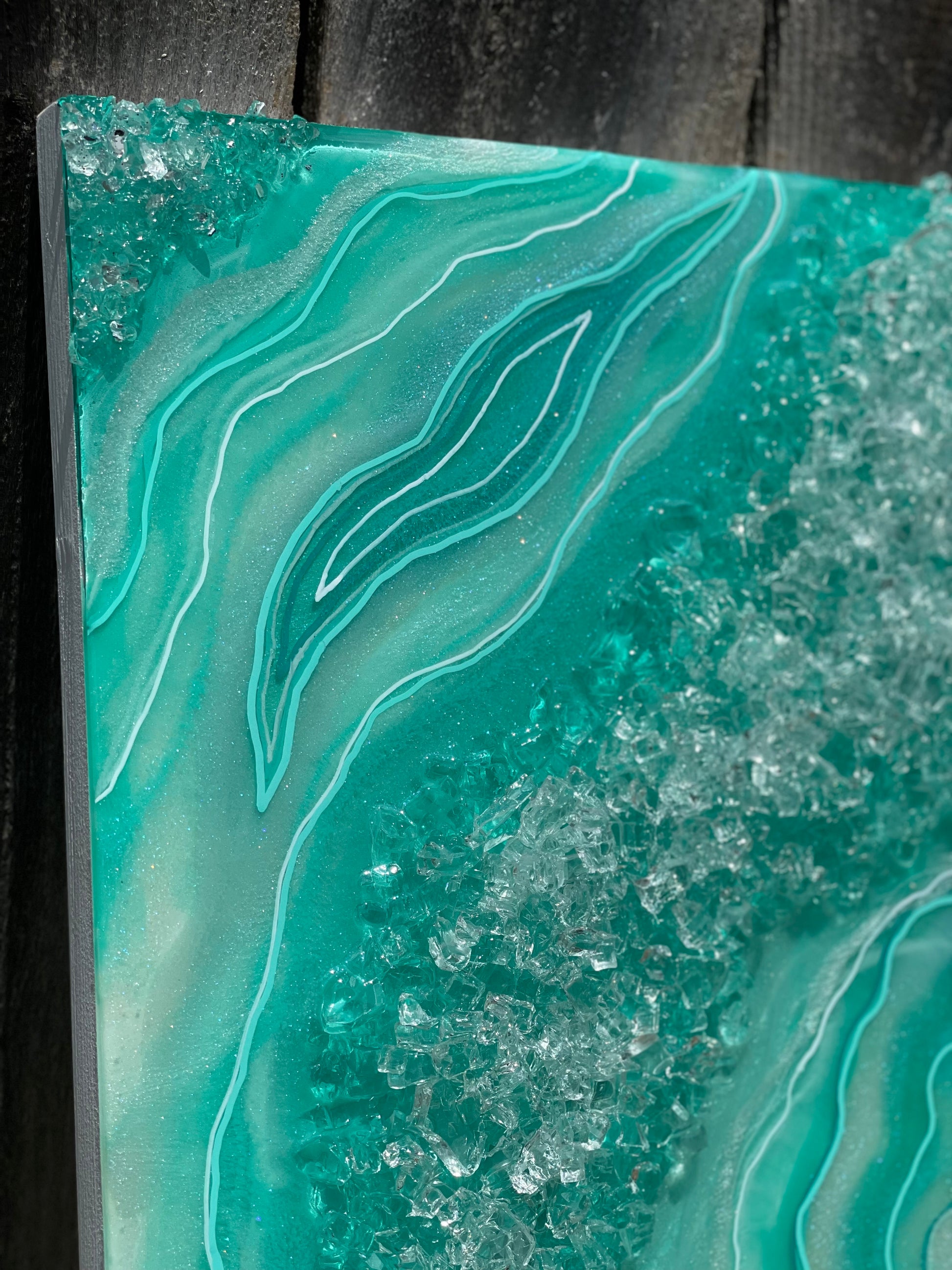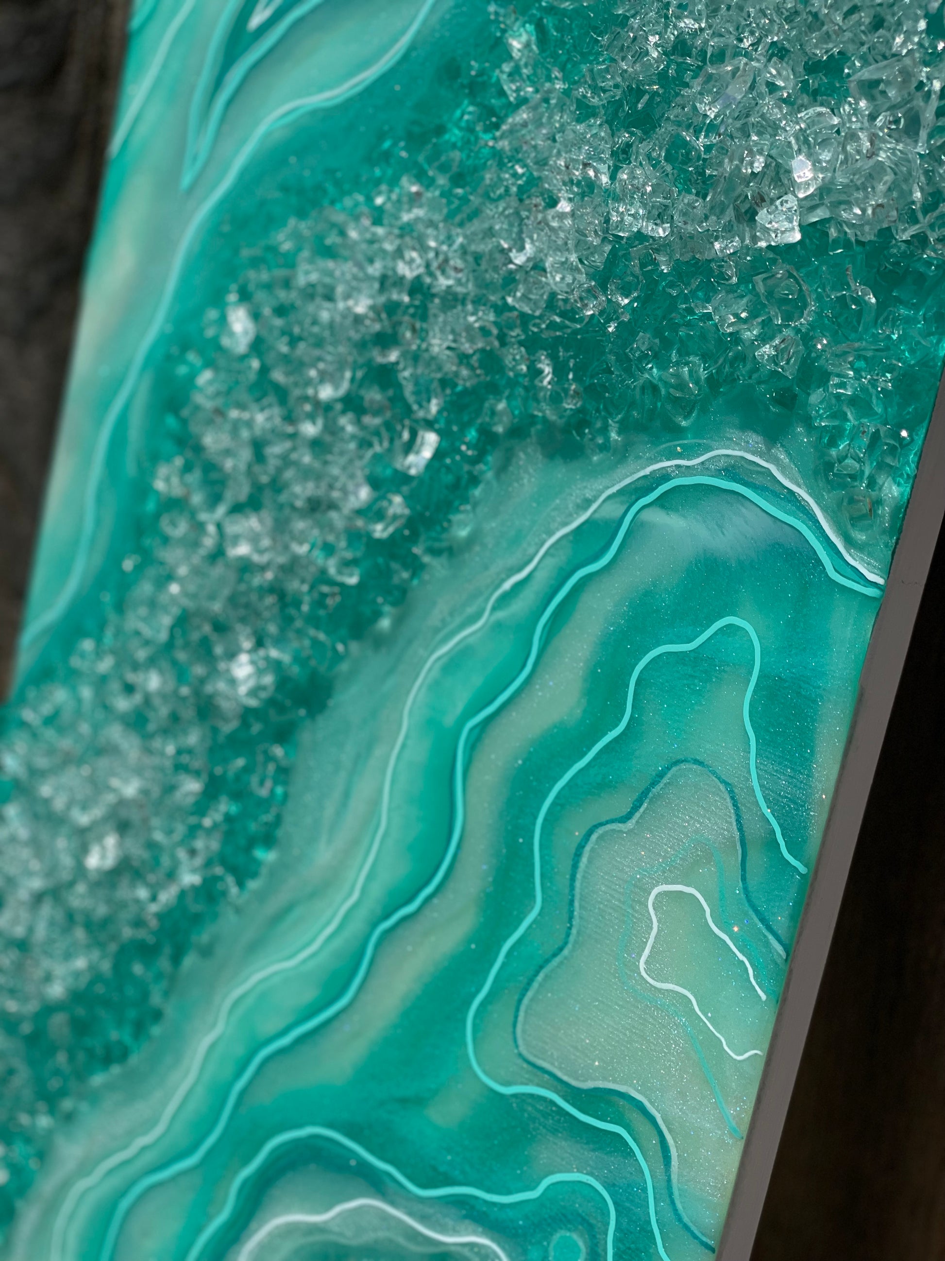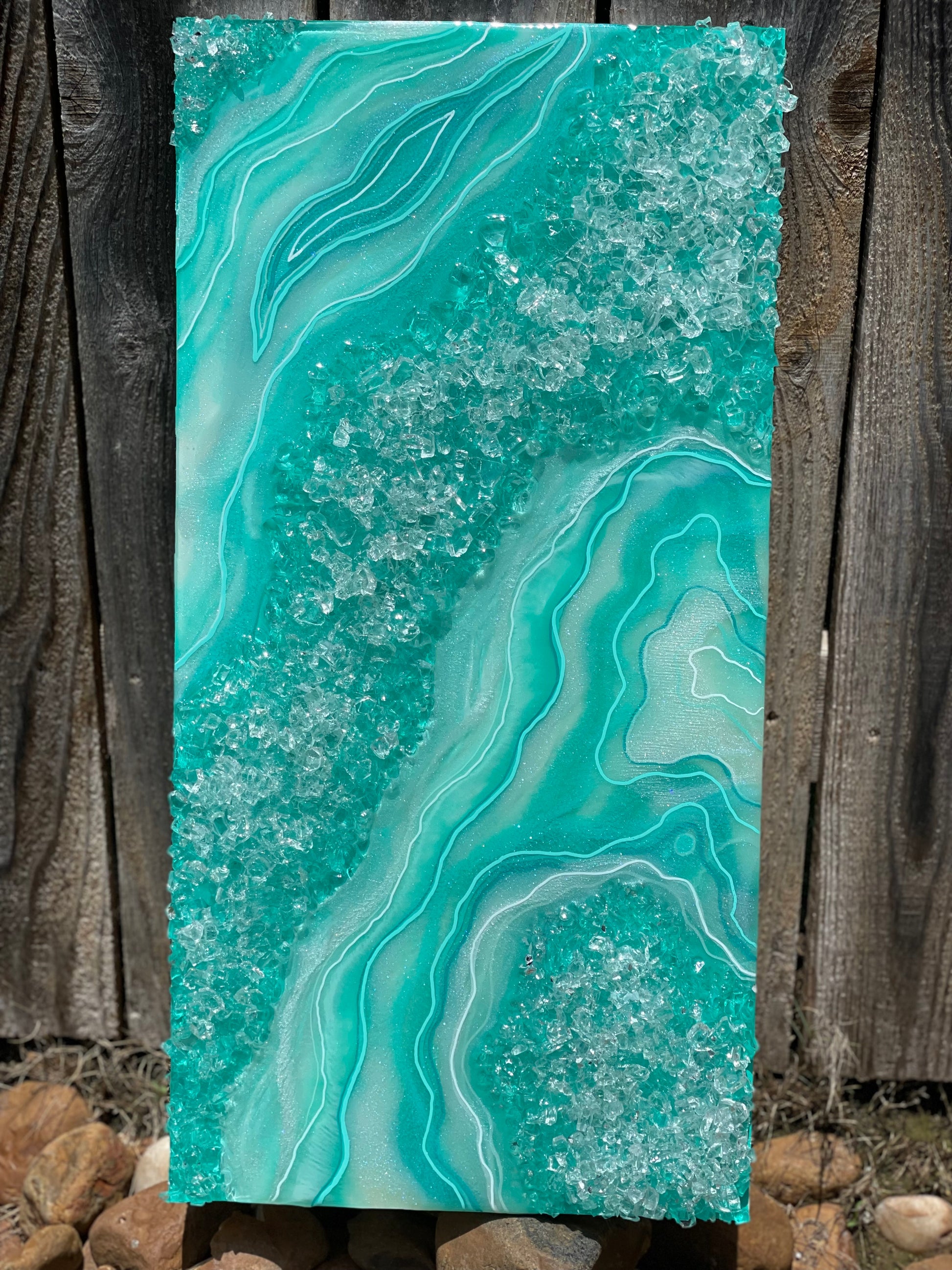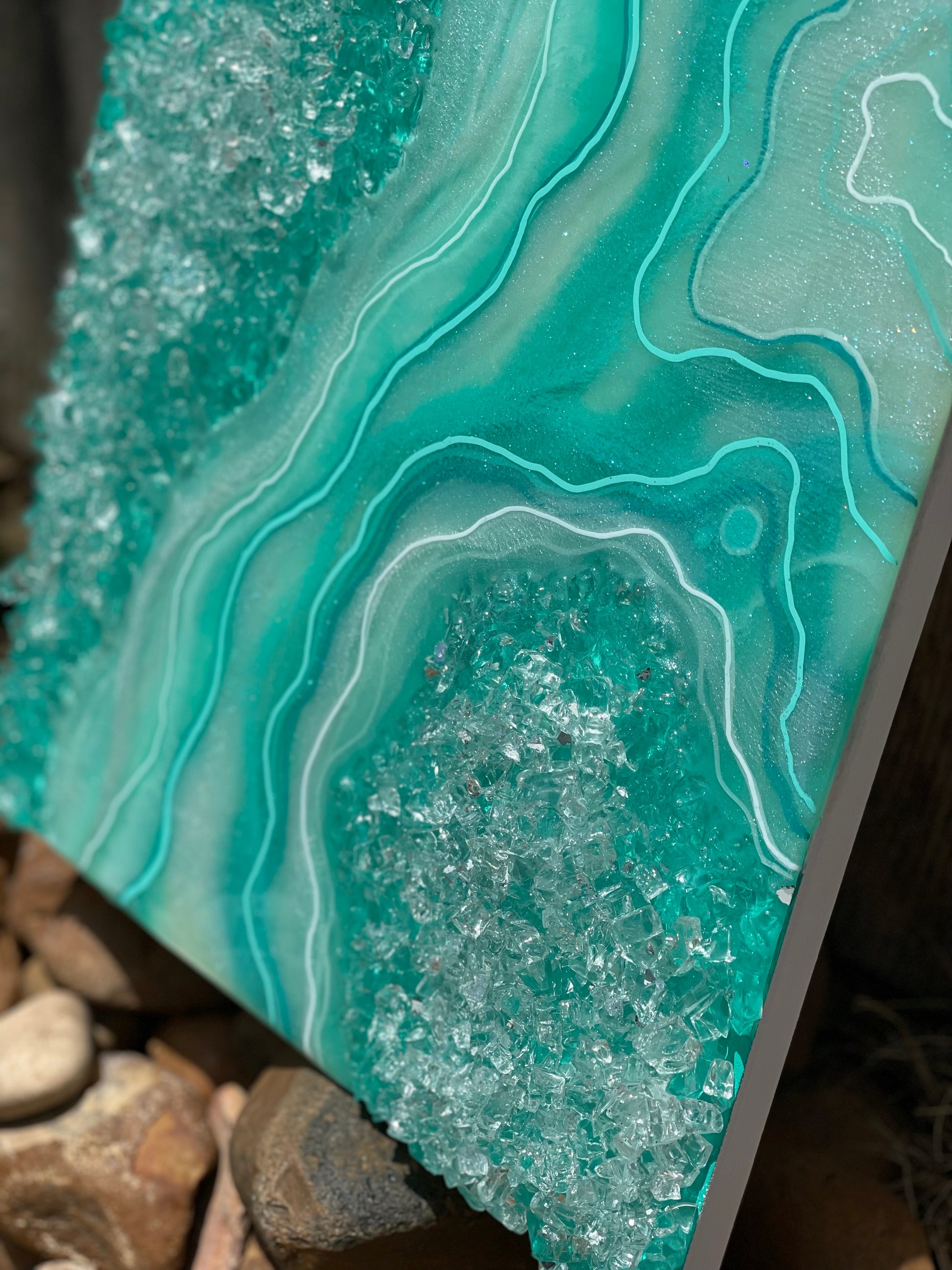 Made with shades of teal, white & sparkly pigments. Faux rocks embedded into the resin to give off that rough rocky texture.