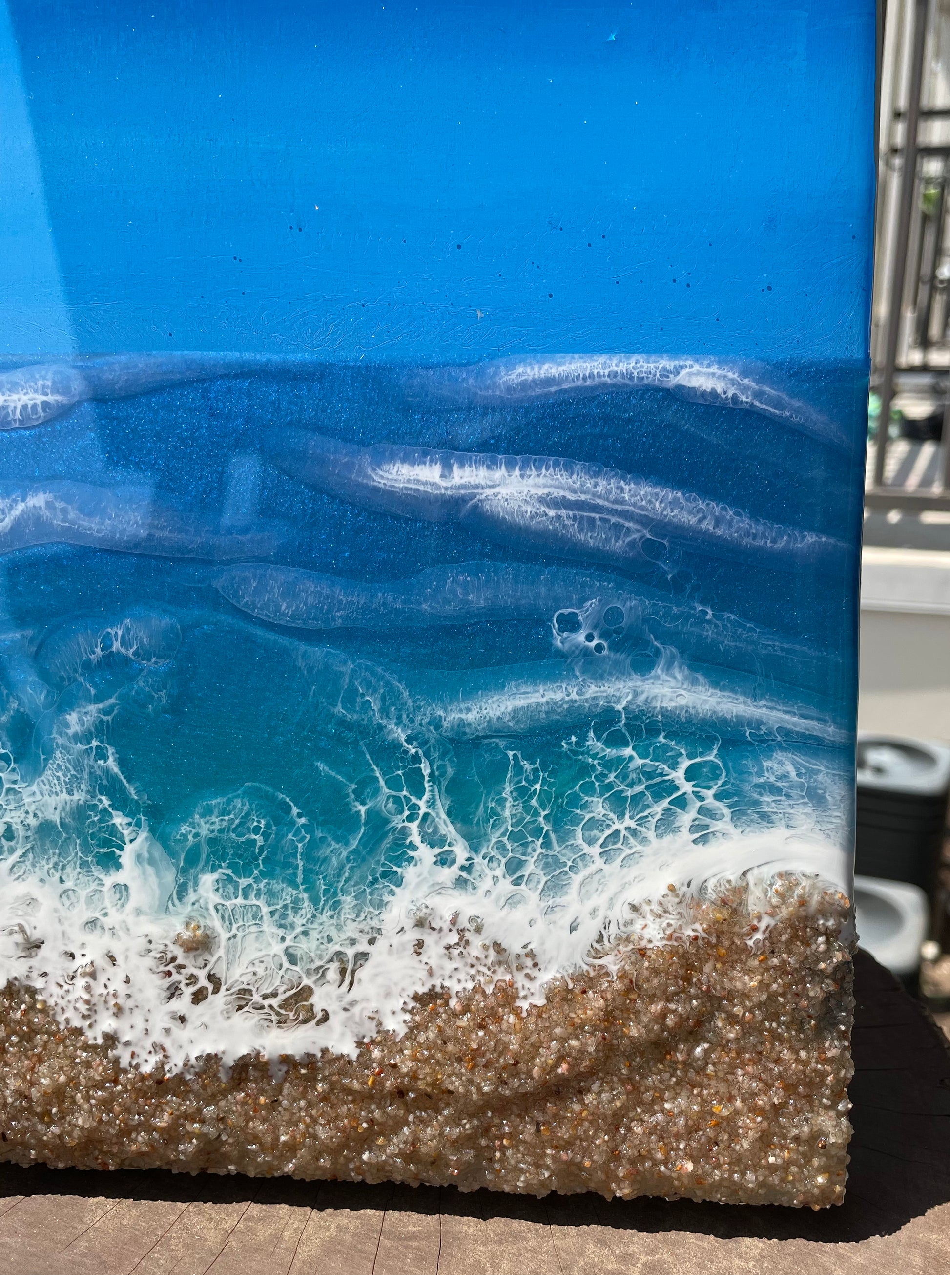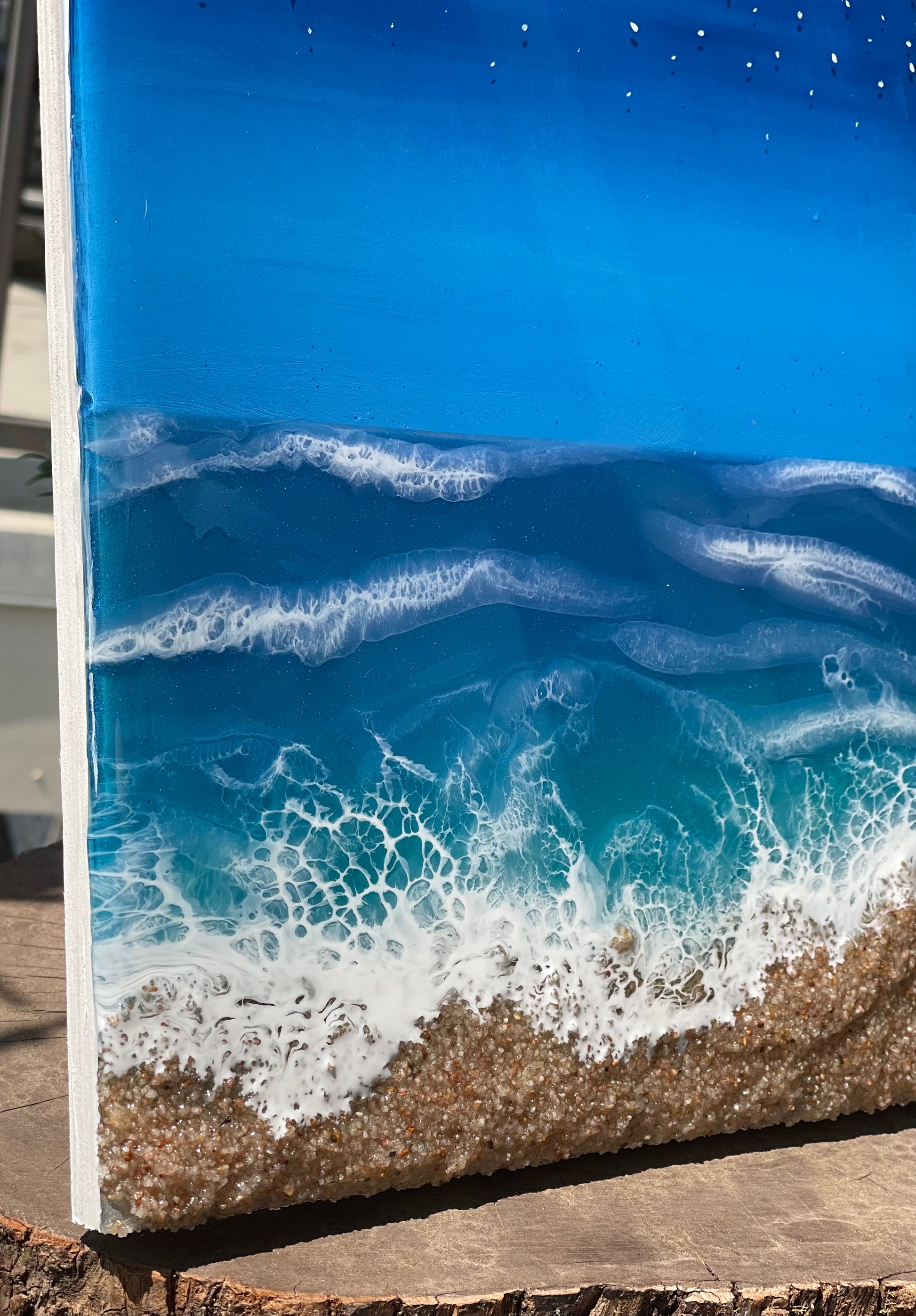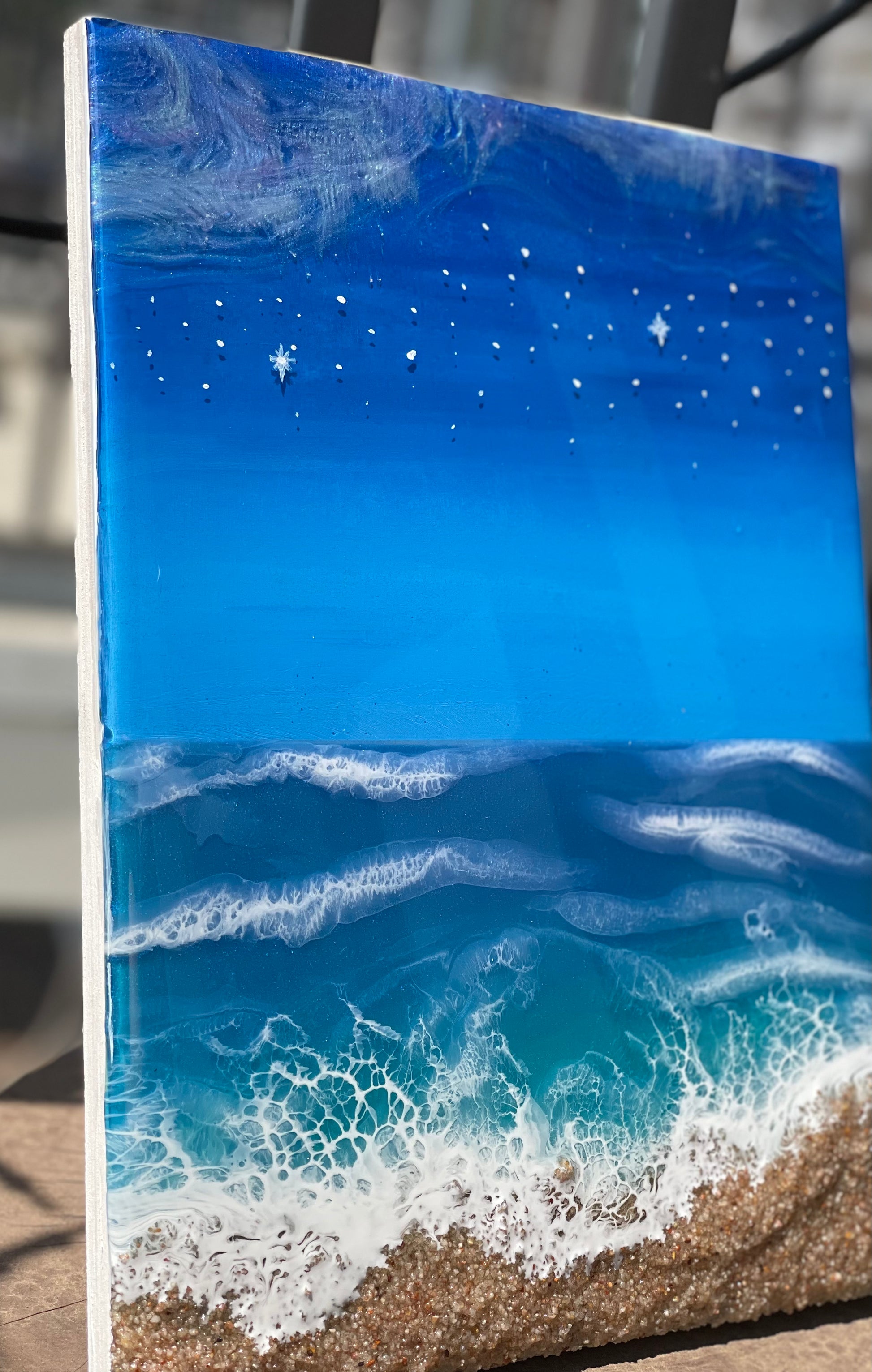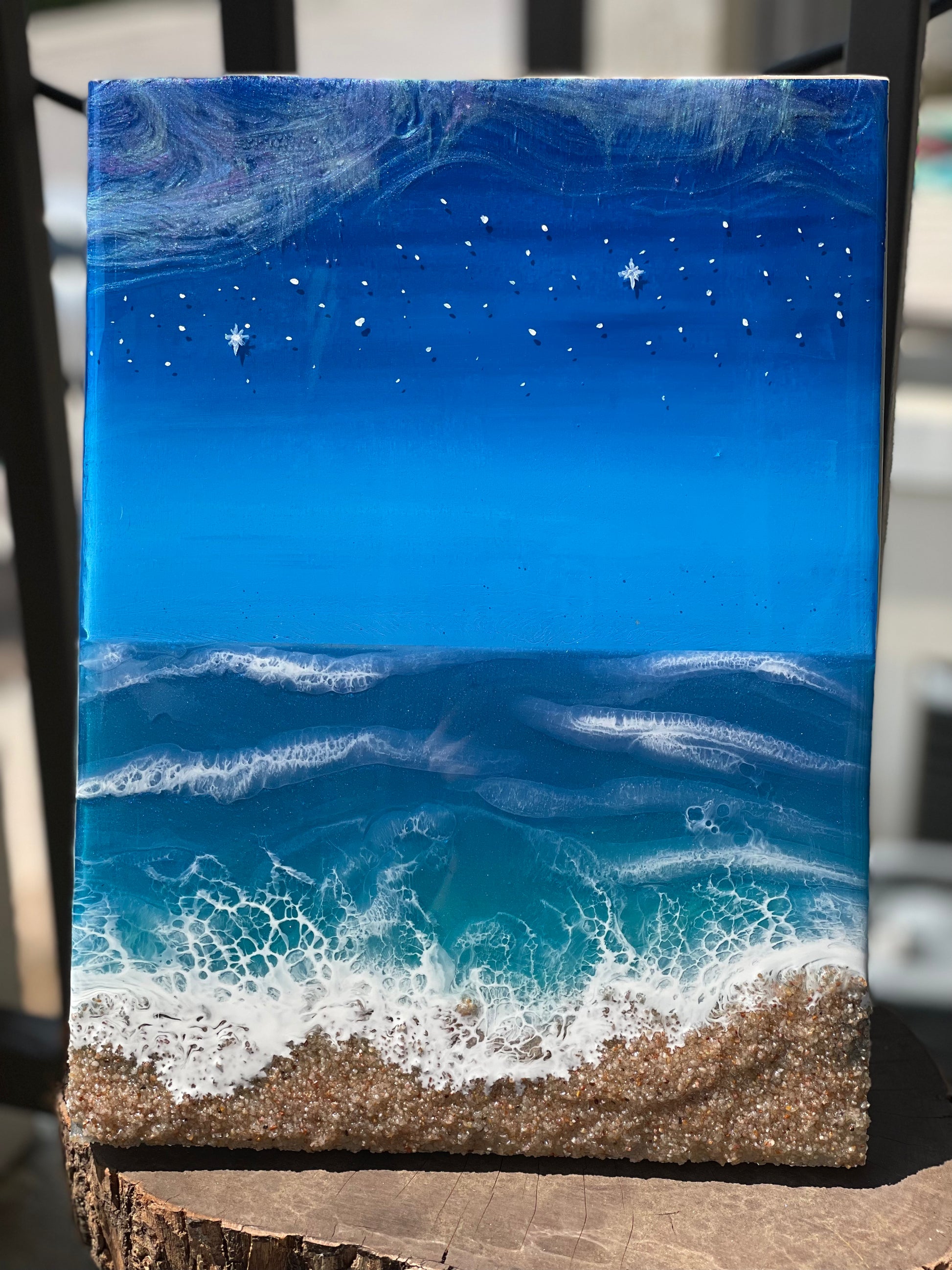 An ocean inspired piece with northern lights and hand painted stars at the top.