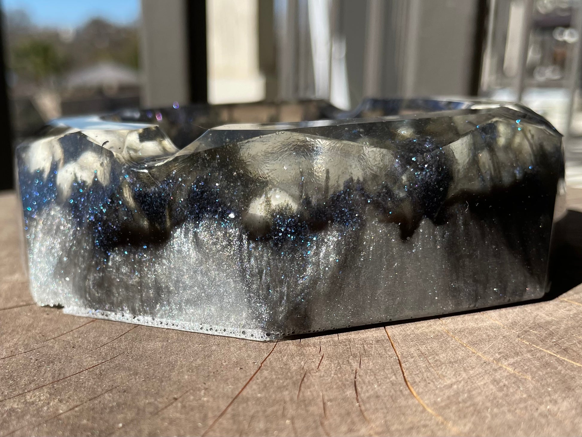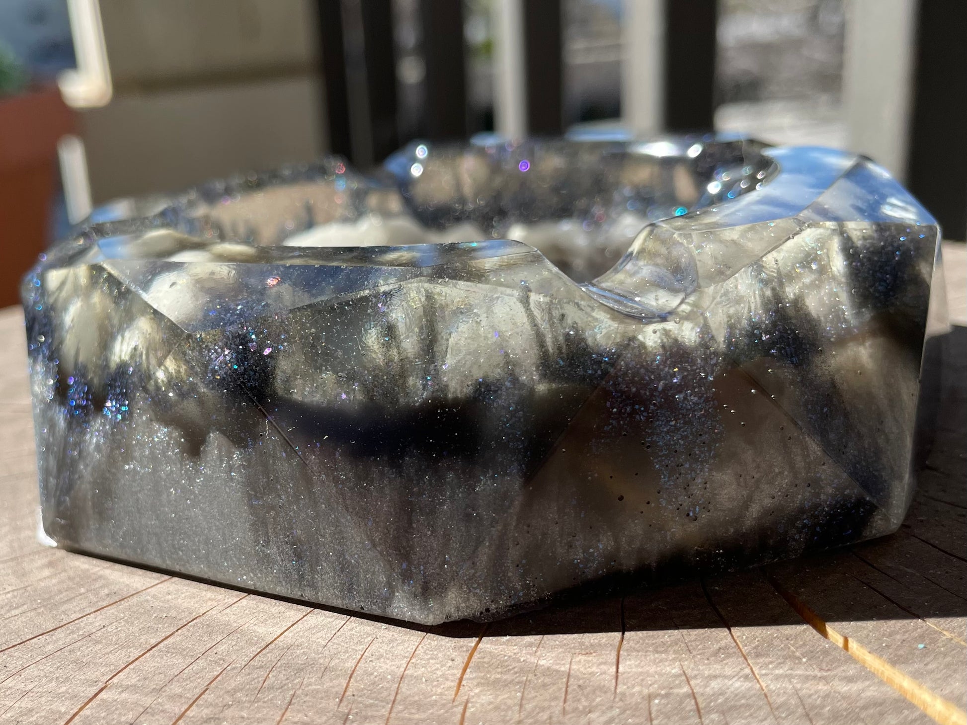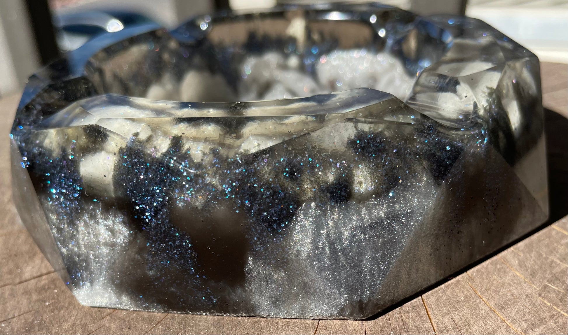 This dish is made with black and white pigment, and added holographic pigment sparkles.