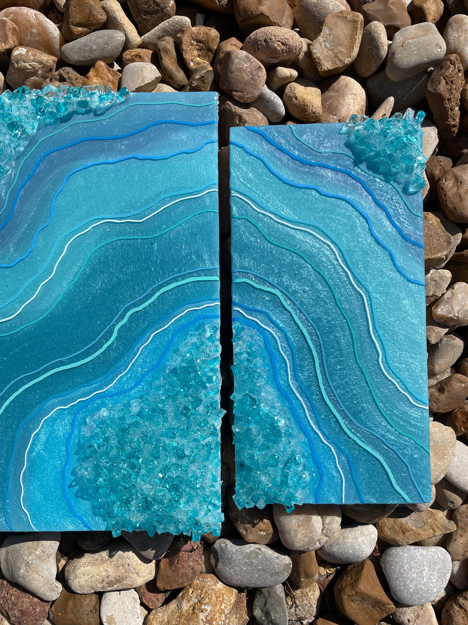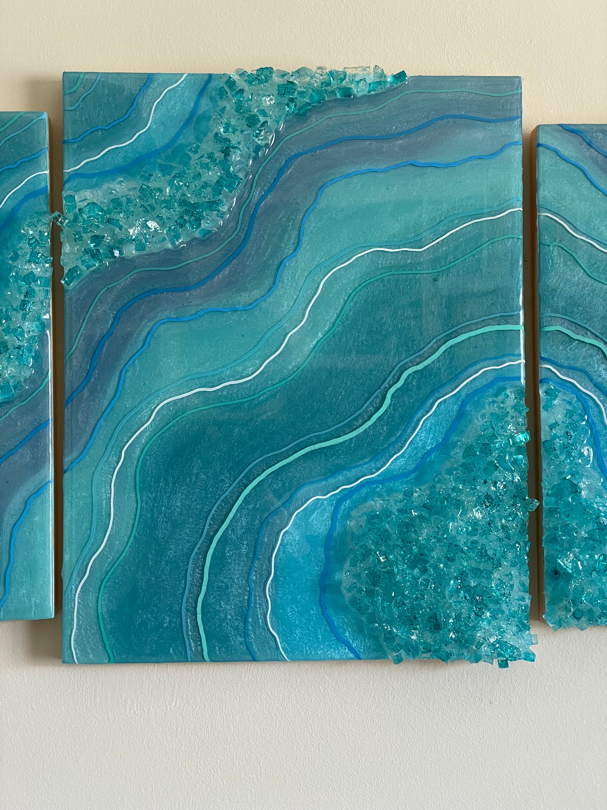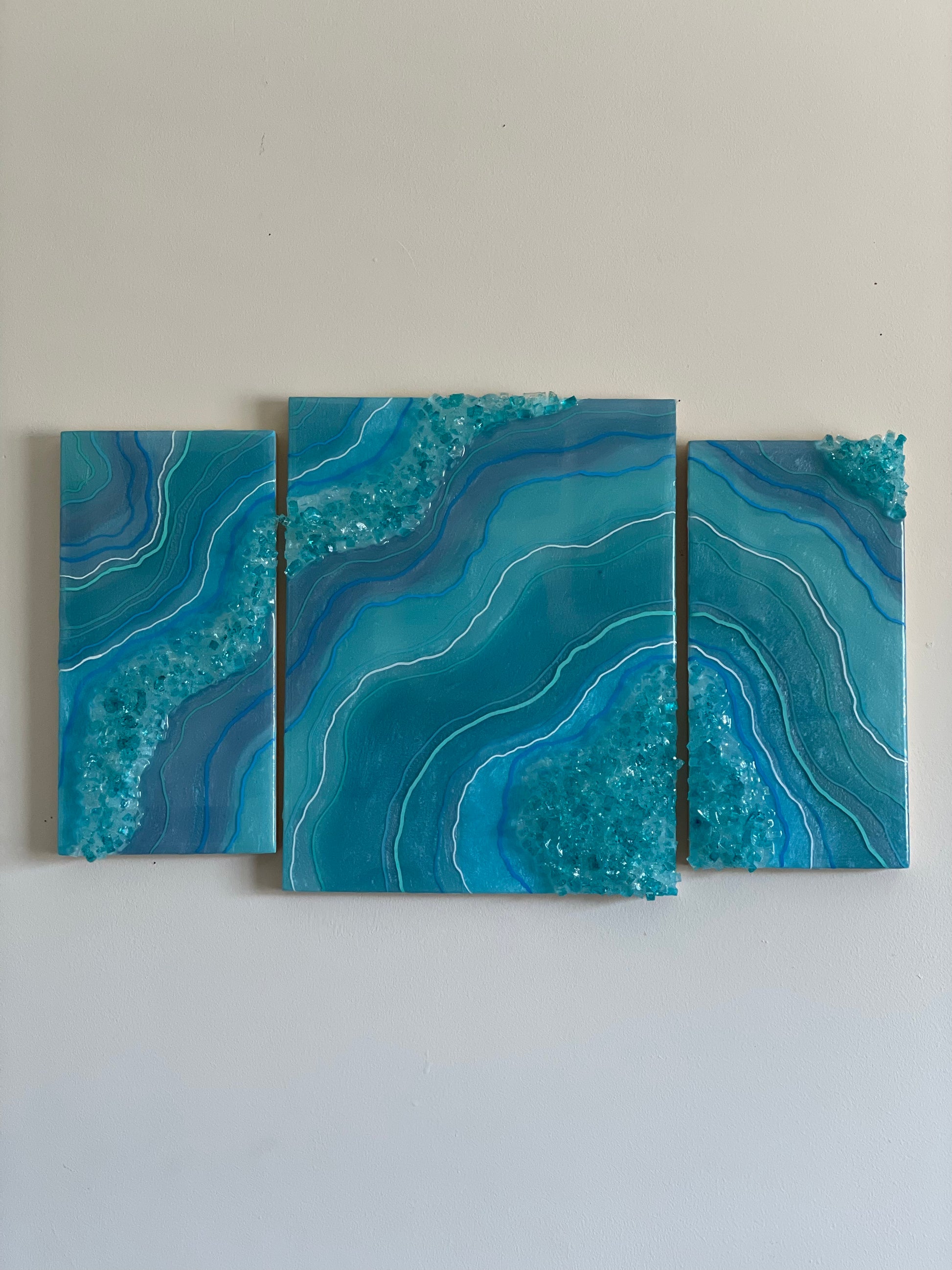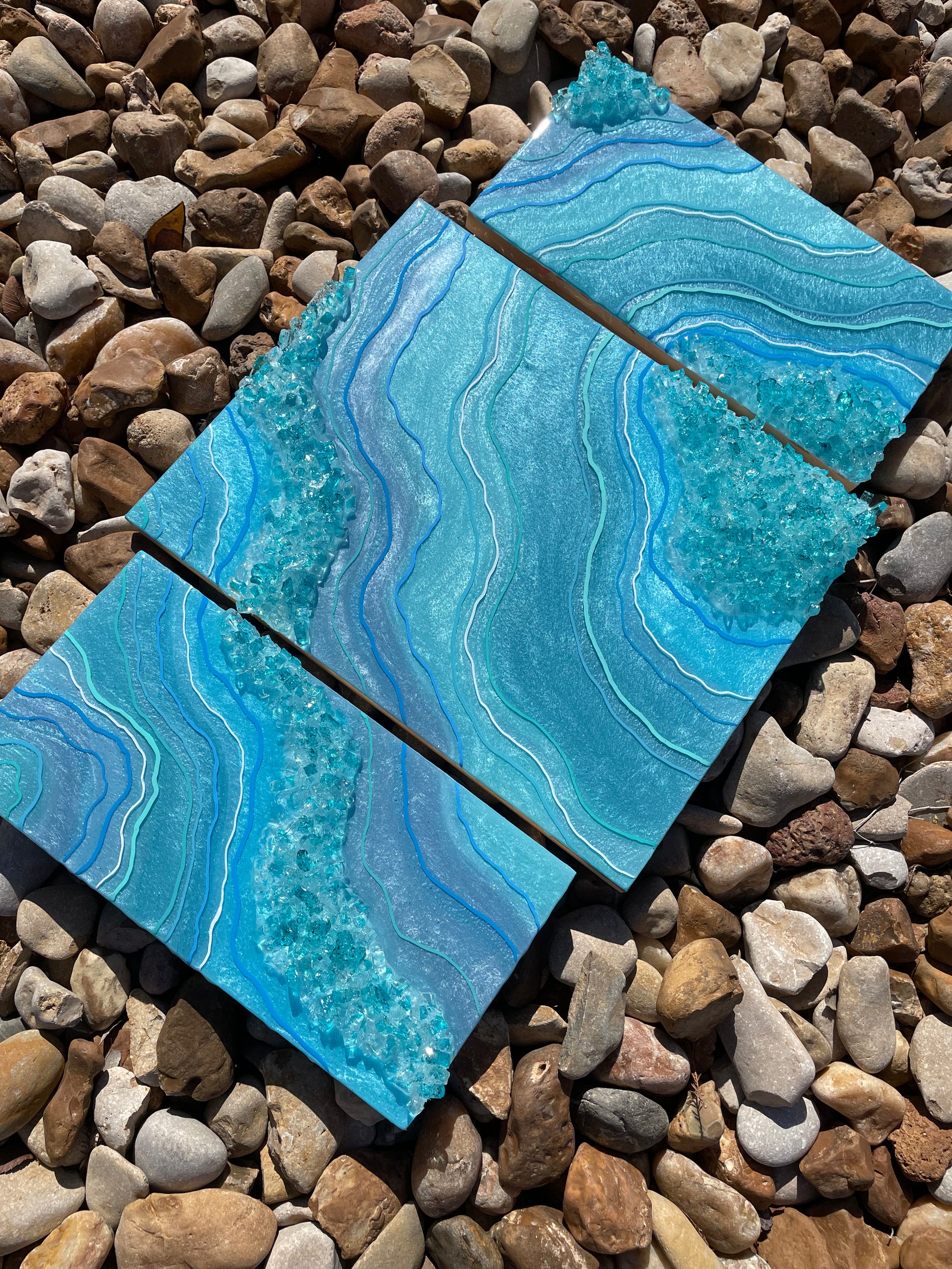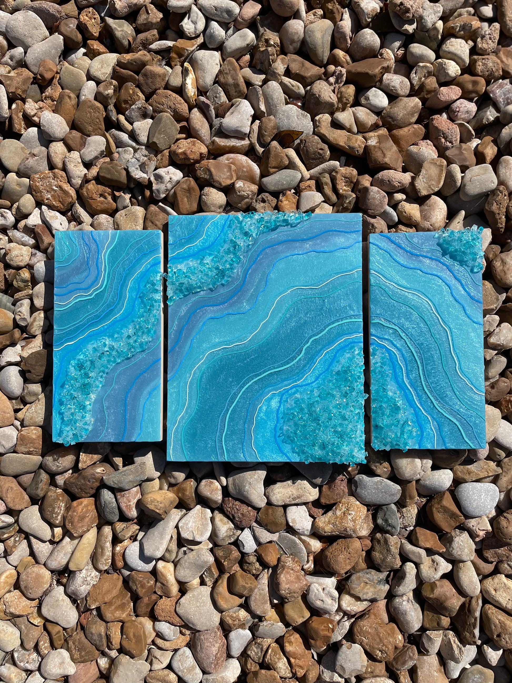 This geode set is made on two 6x12 inch canvases & an 11x14 inch canvas in the middle (measuring 23 inches wide when hung together) Made with varying shades of blue, textured rocks, and detailed lines.