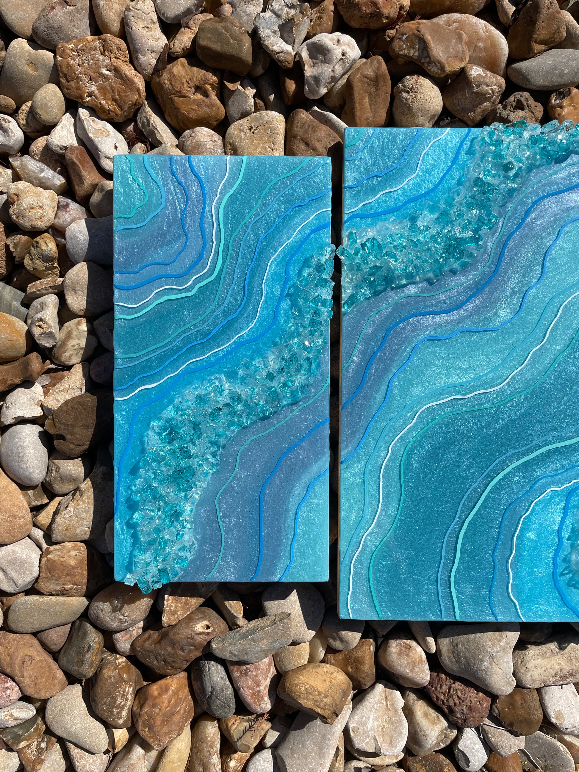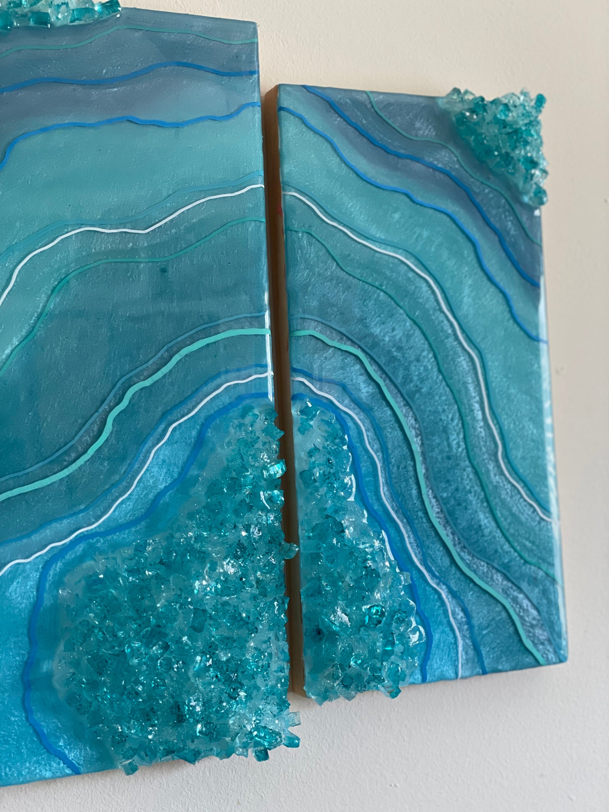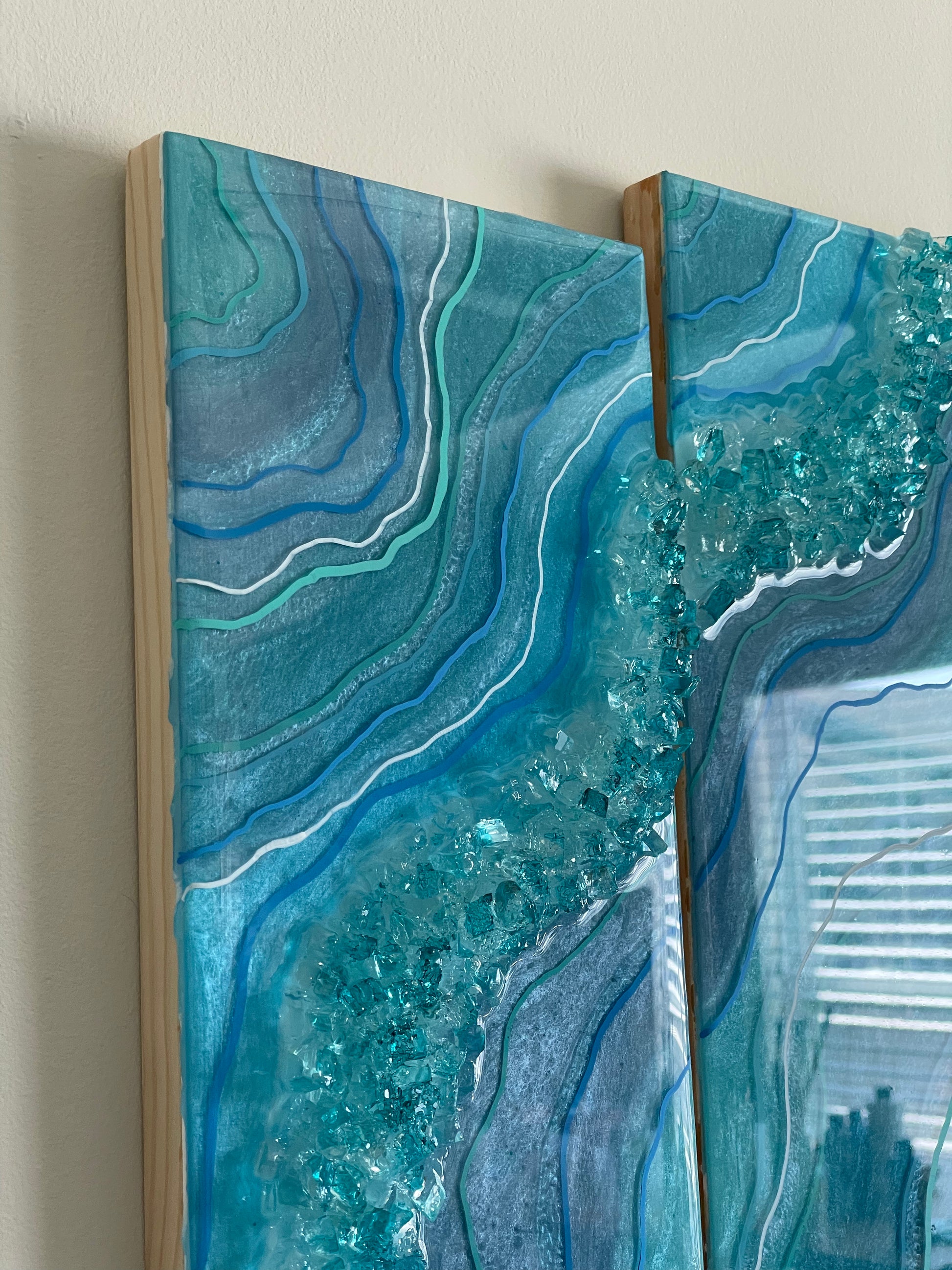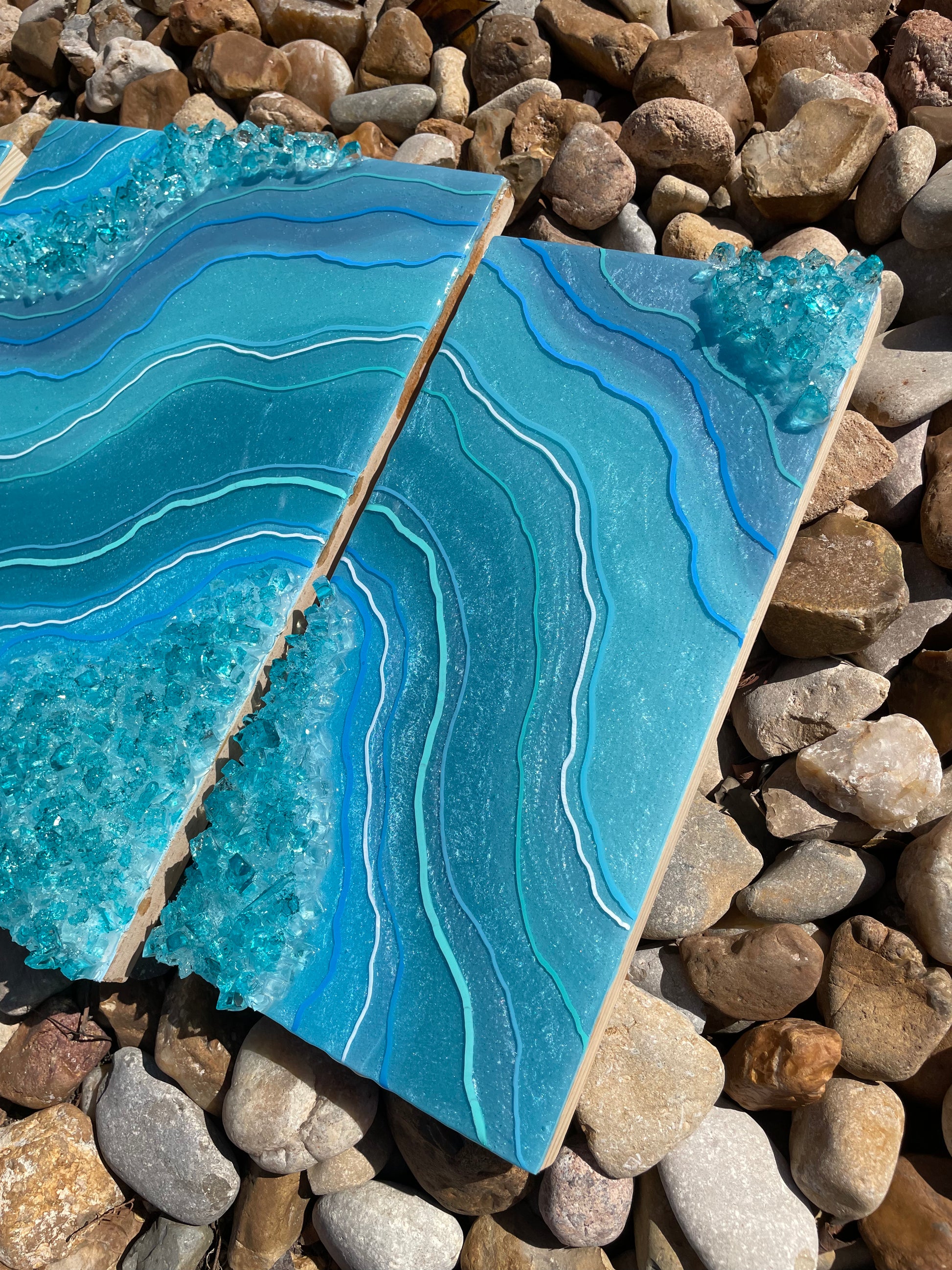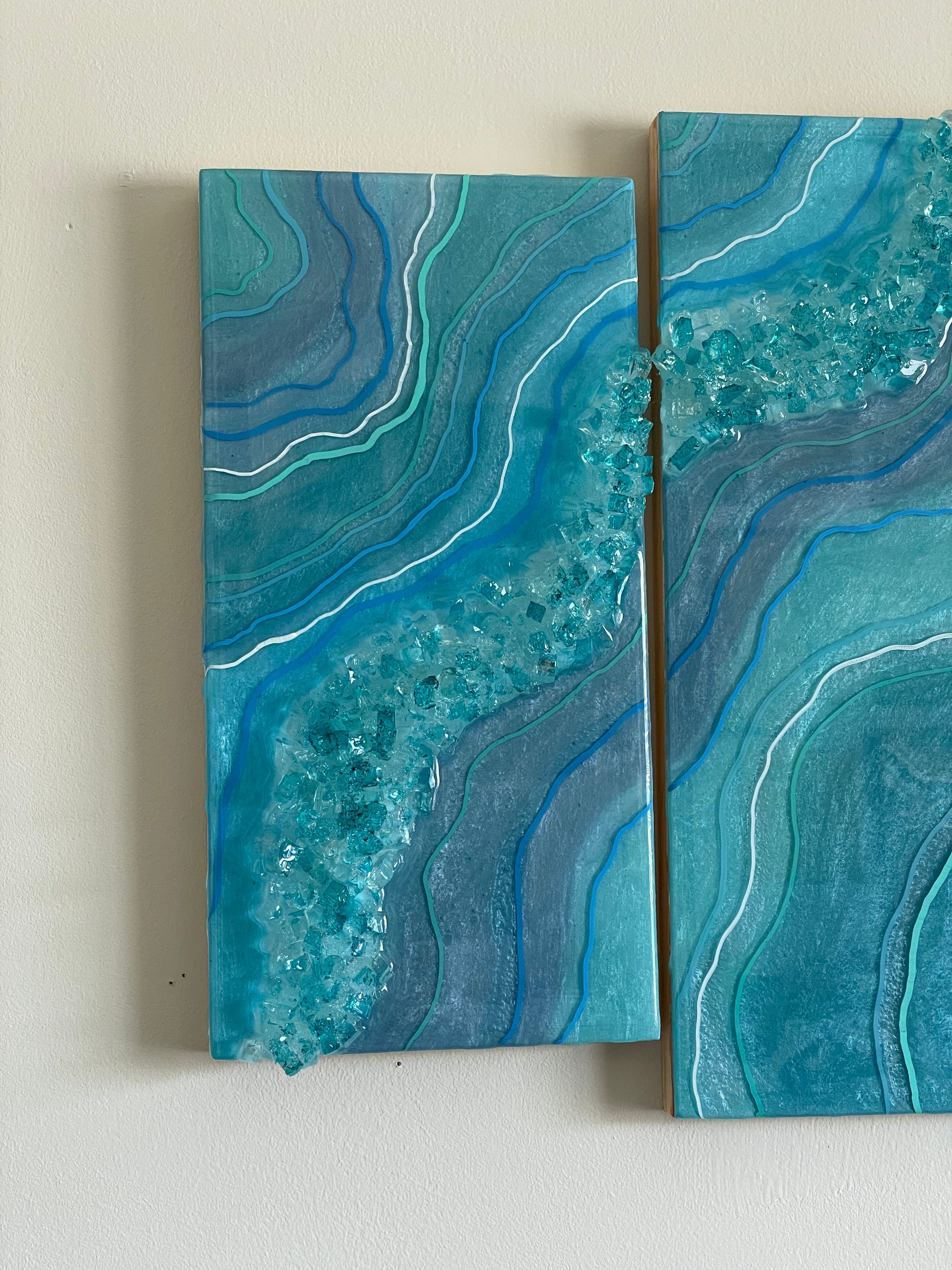 This geode set is made on two 6x12 inch canvases & an 11x14 inch canvas in the middle (measuring 23 inches wide when hung together) Made with varying shades of blue, textured rocks, and detailed lines.