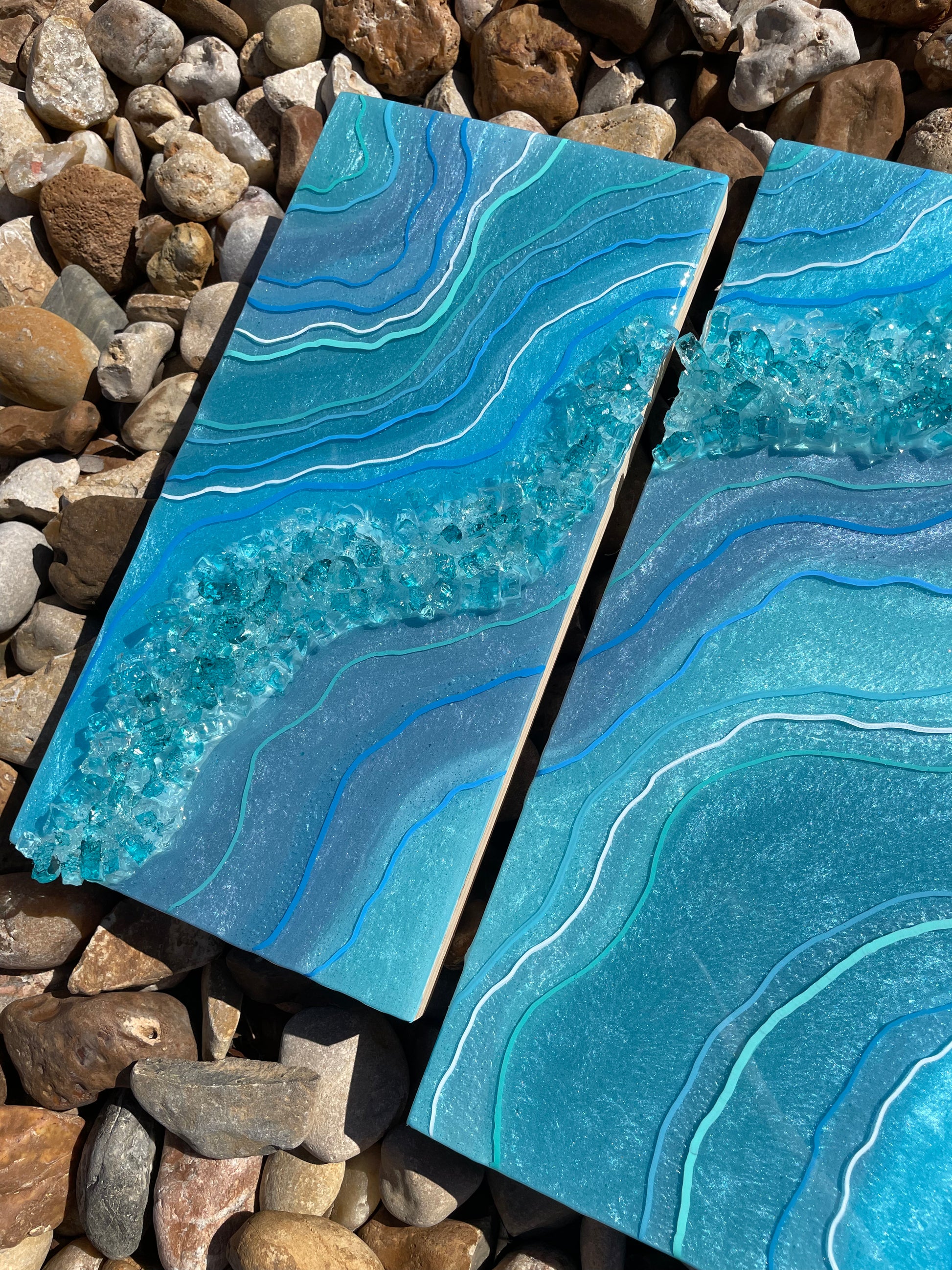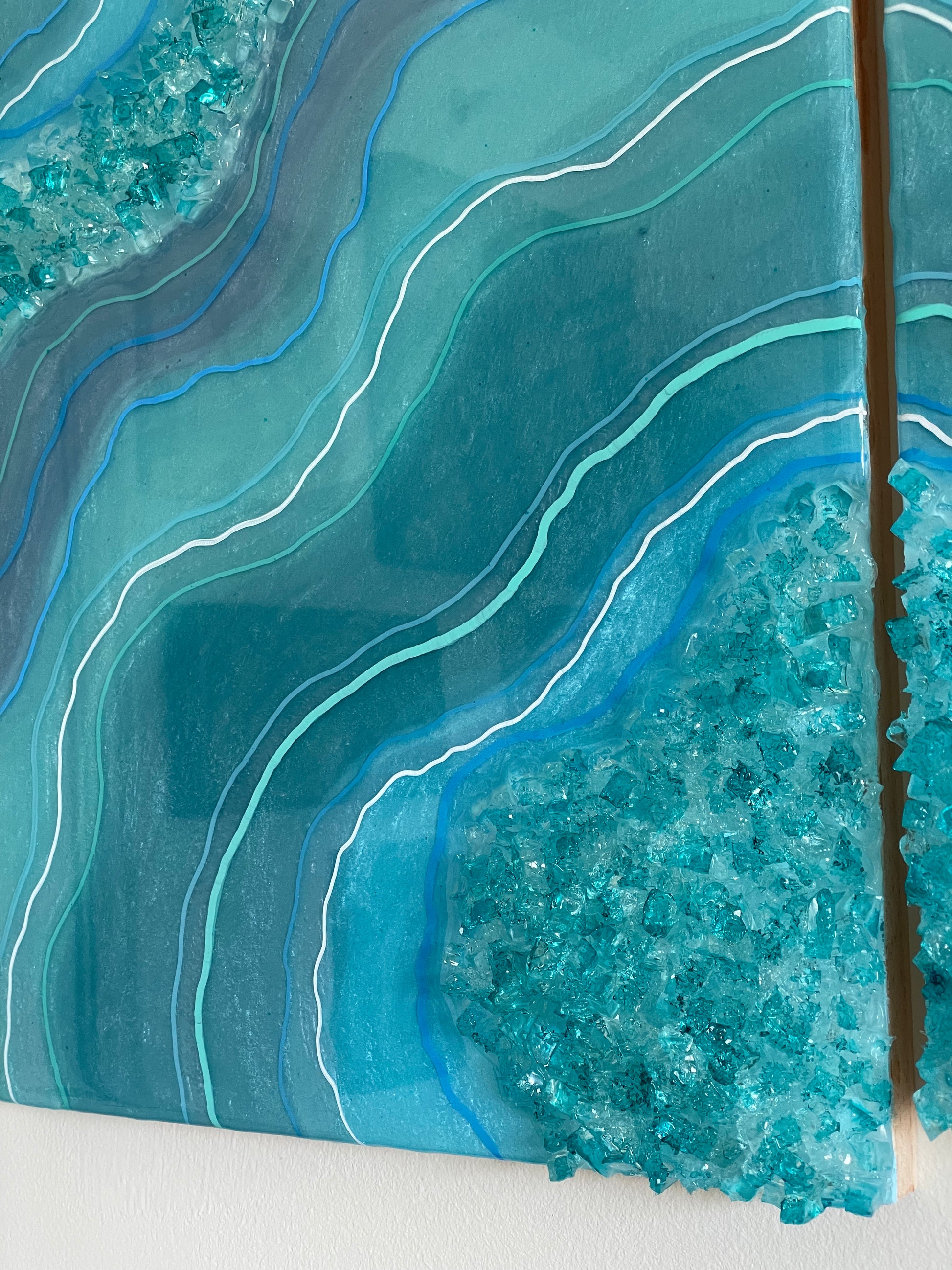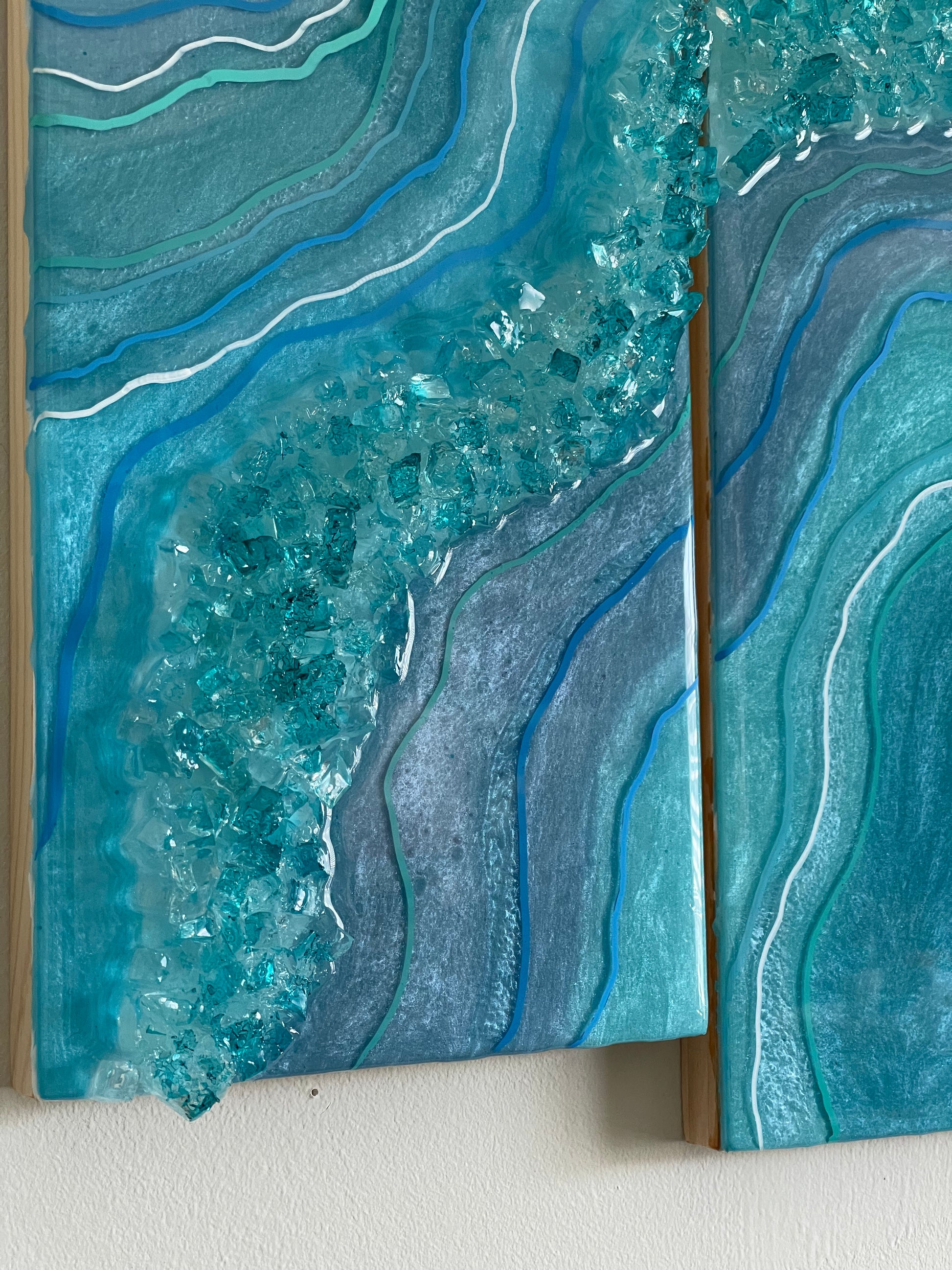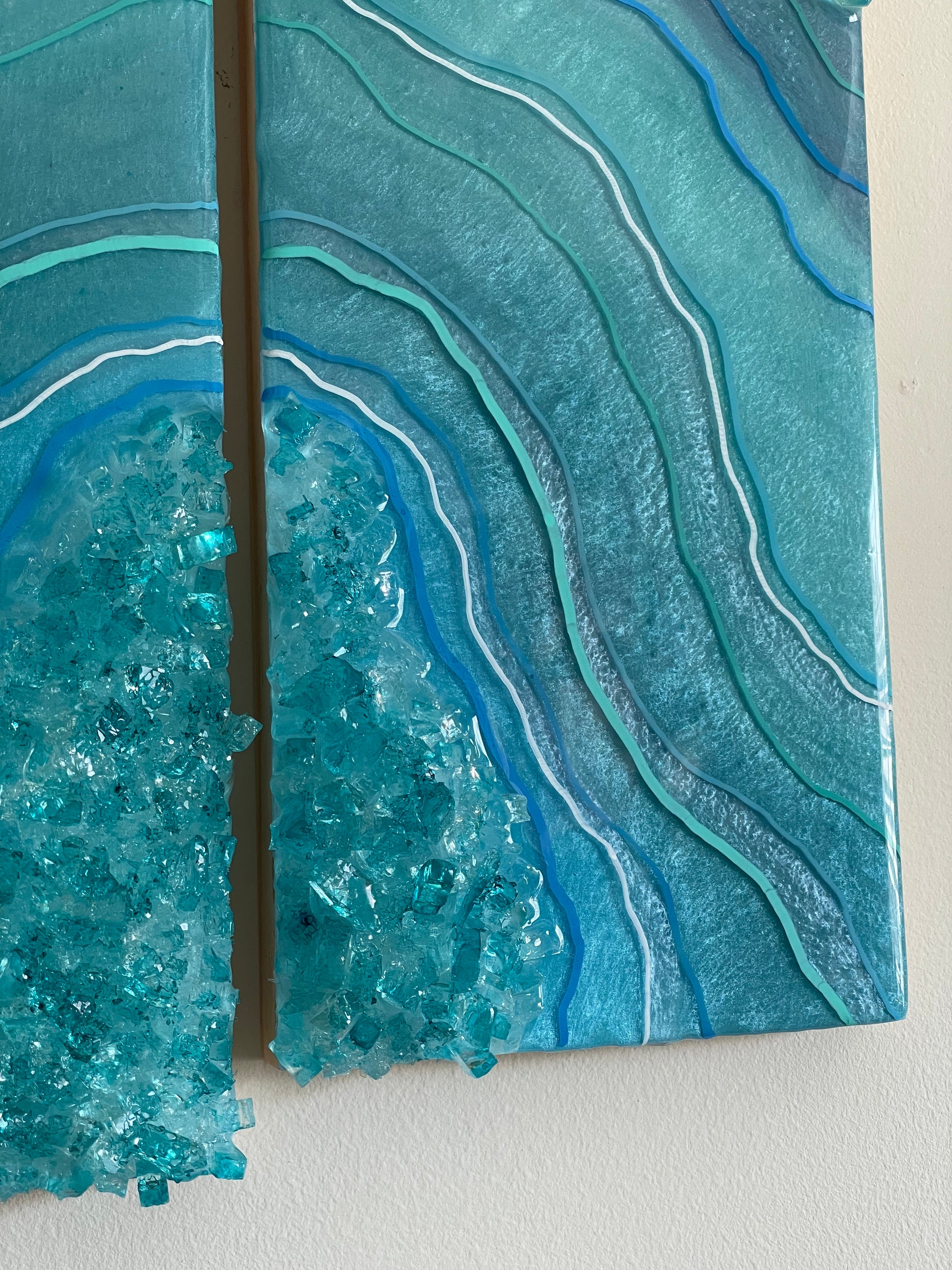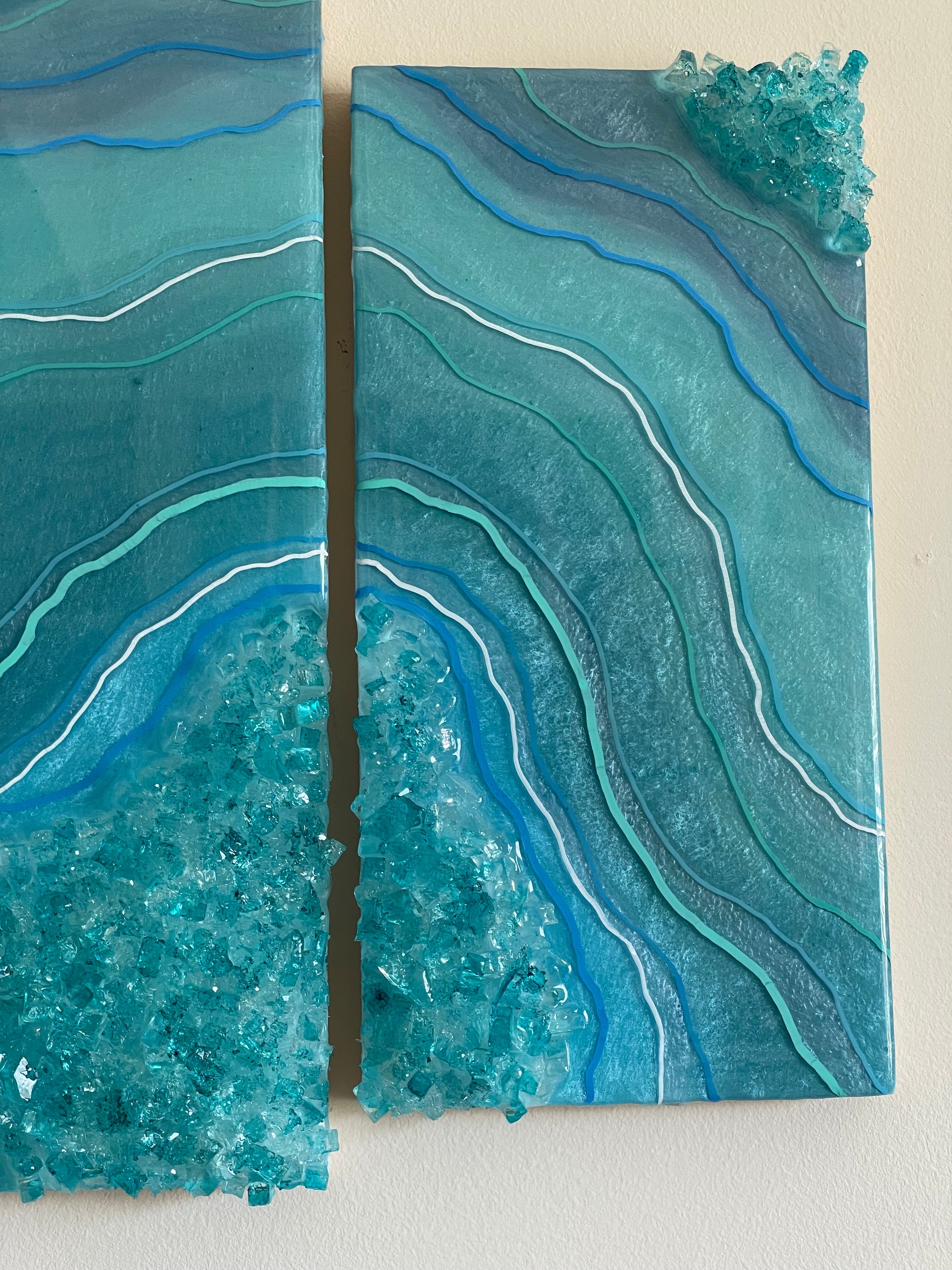 This geode set is made on two 6x12 inch canvases & an 11x14 inch canvas in the middle (measuring 23 inches wide when hung together) Made with varying shades of blue, textured rocks, and detailed lines.