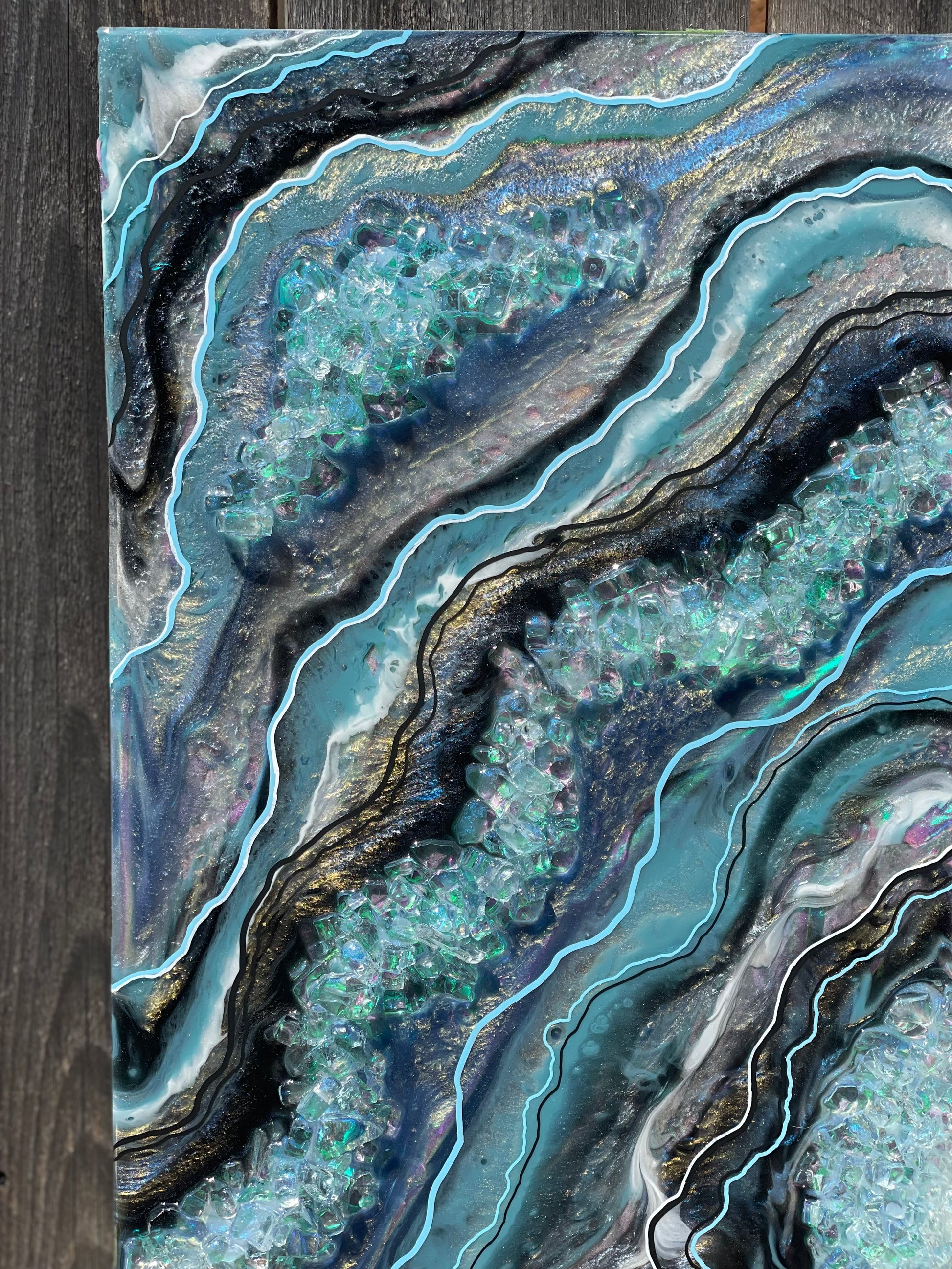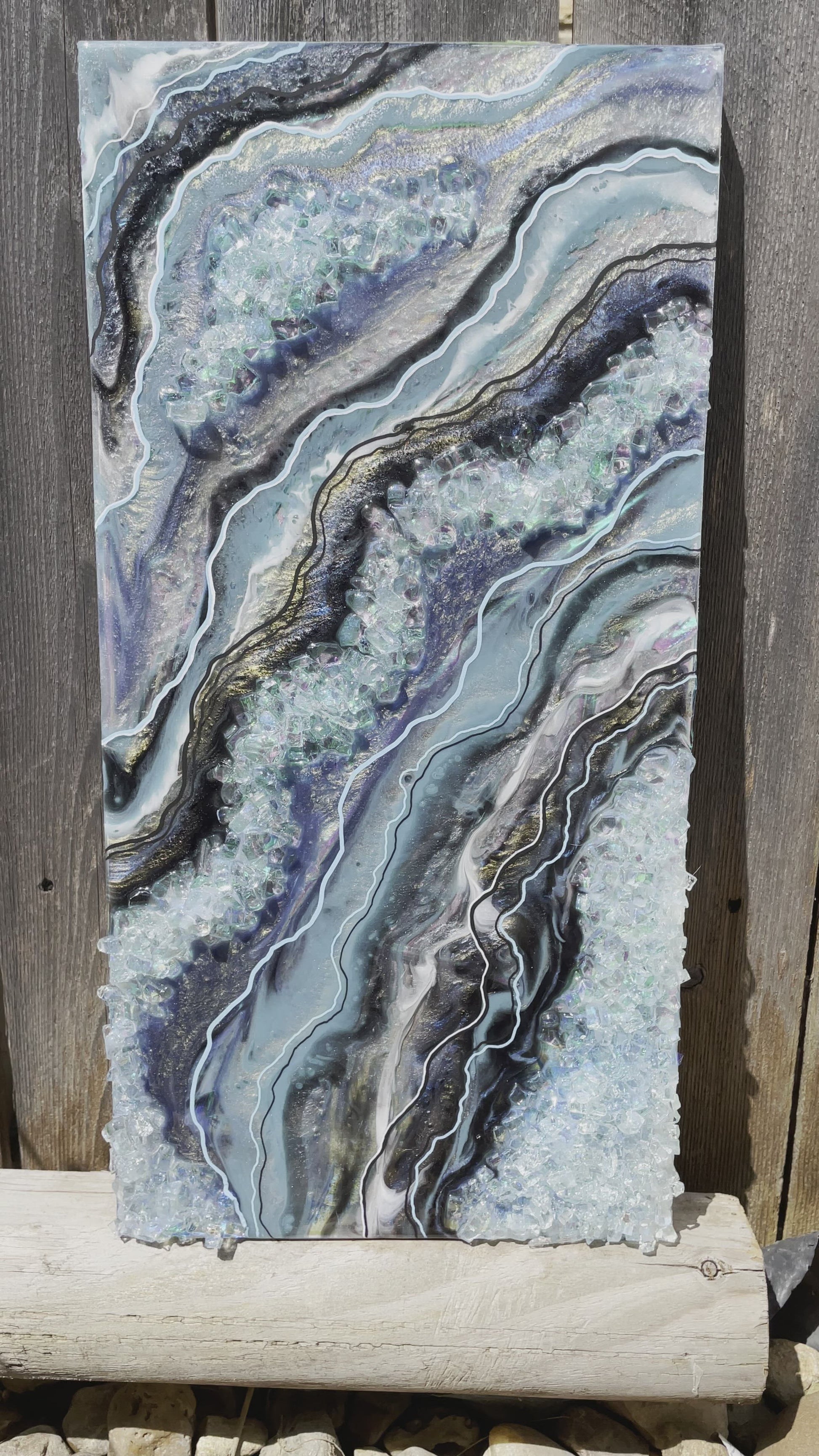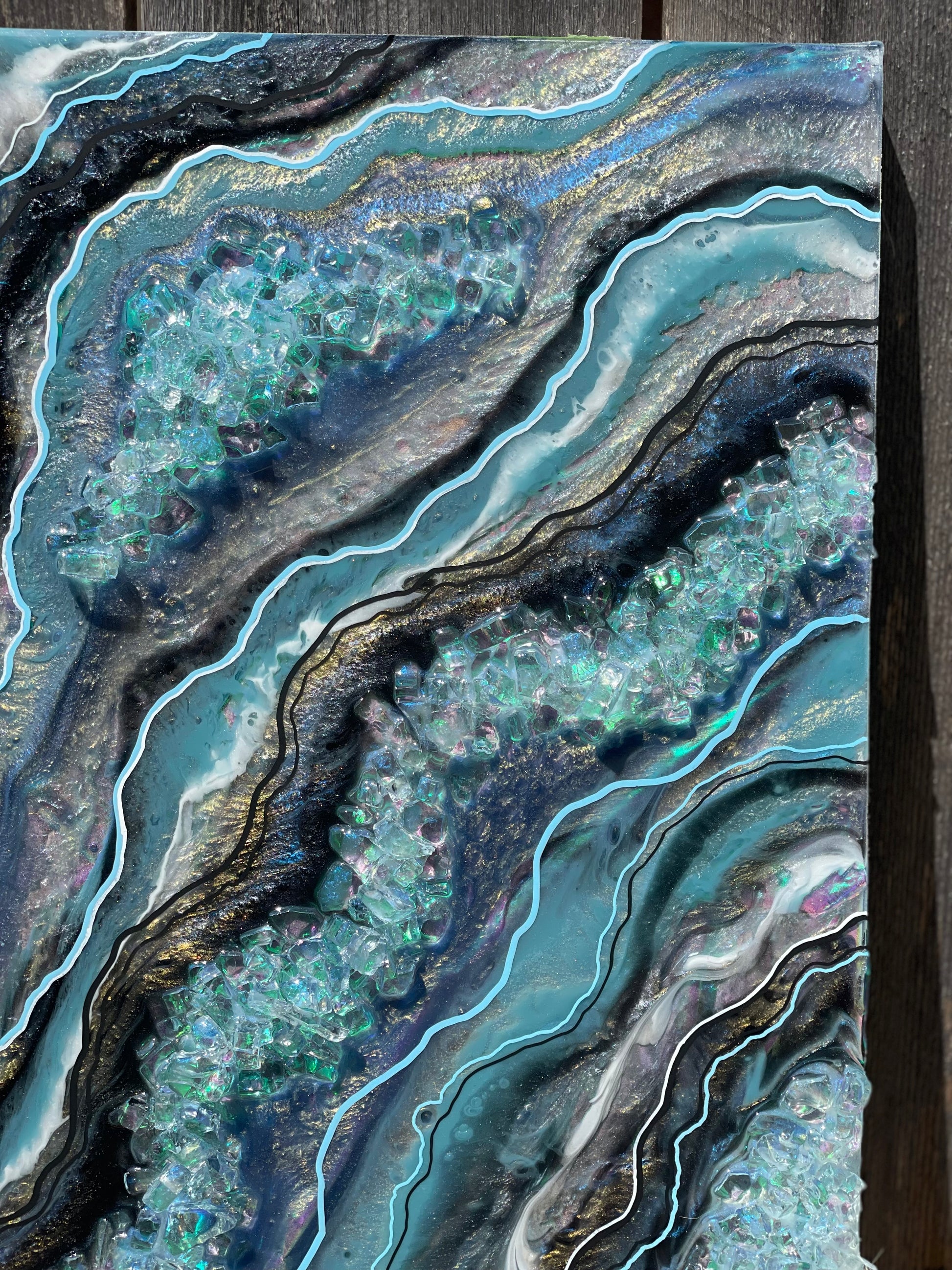 10x20 resin art geode; made with varying interference colors, slate blue/grey, black, silver, white & holographic accents.