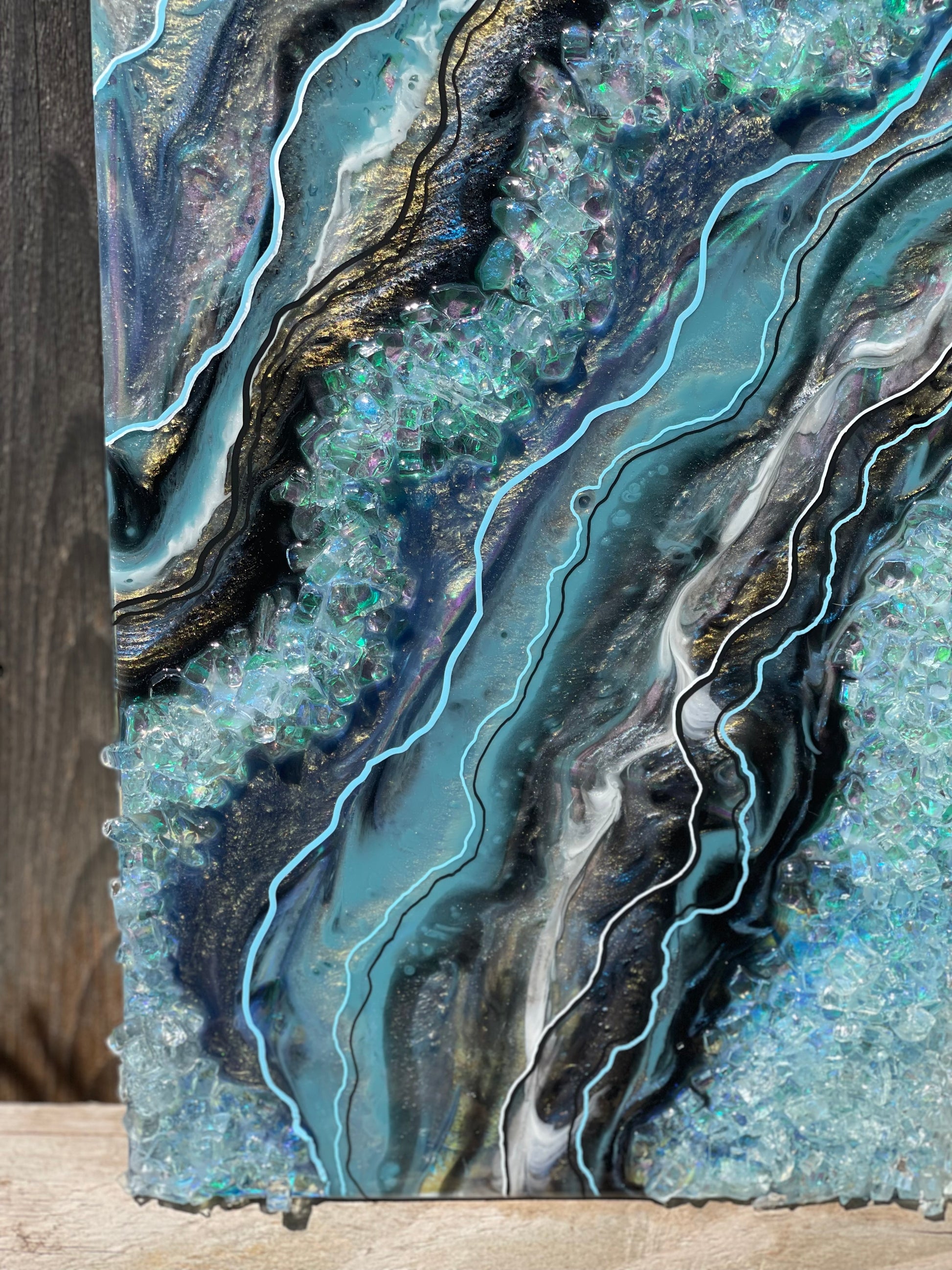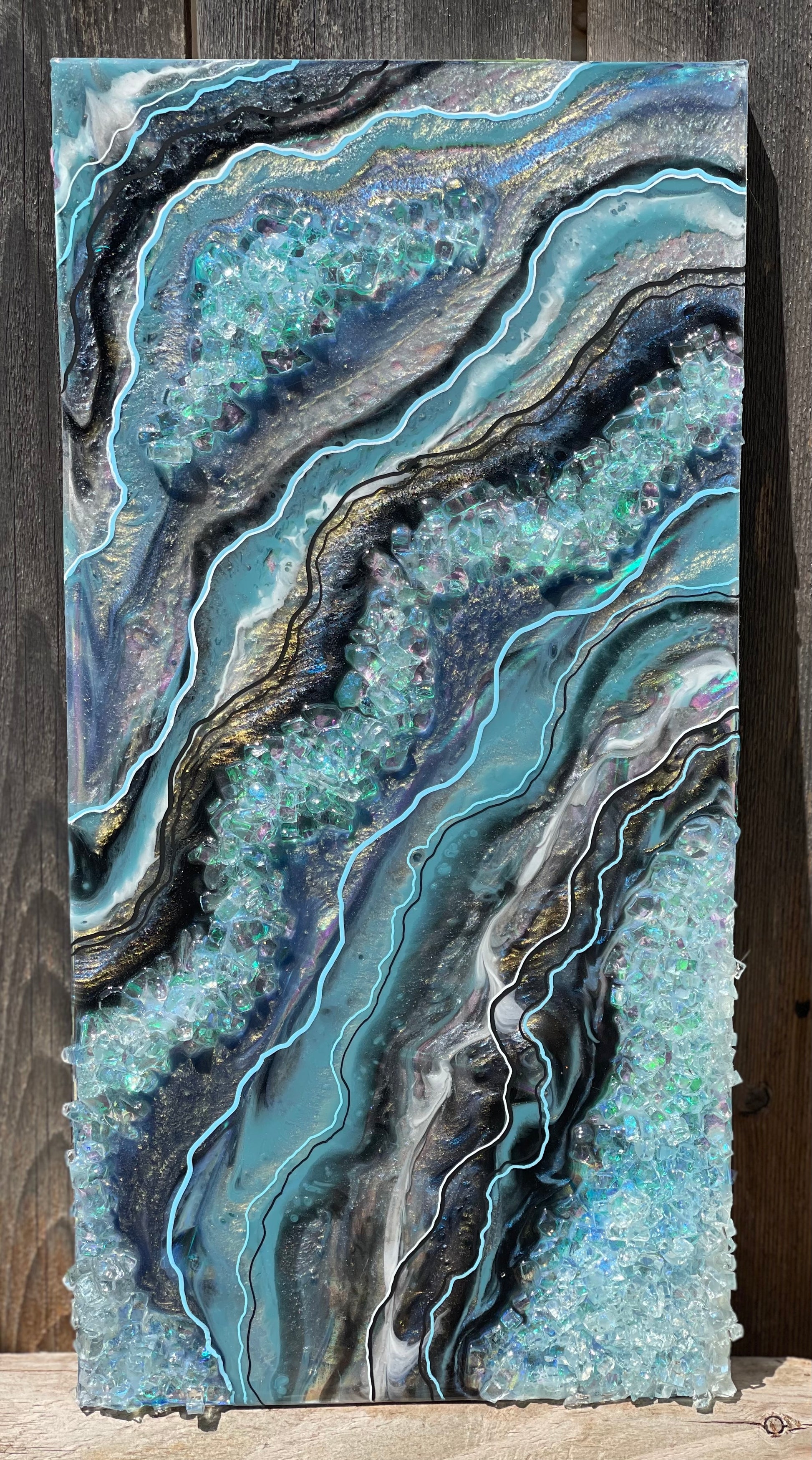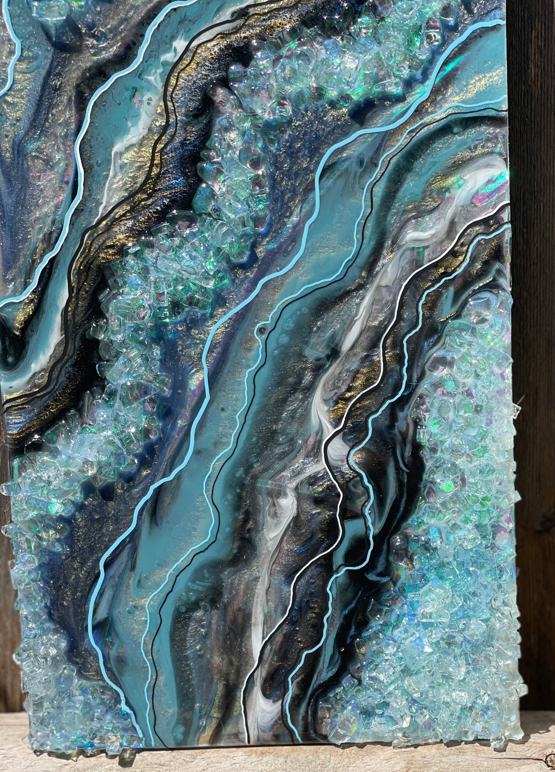 10x20 resin art geode; made with varying interference colors, slate blue/grey, black, silver, white & holographic accents.