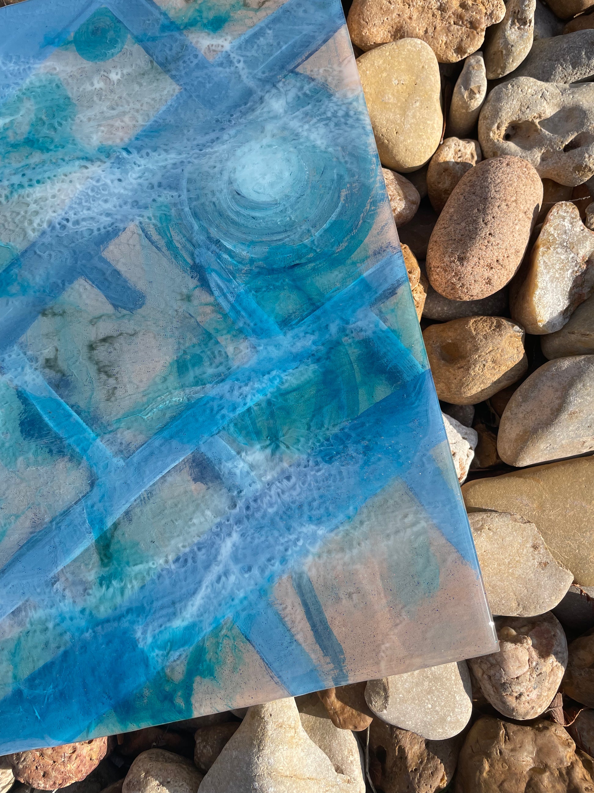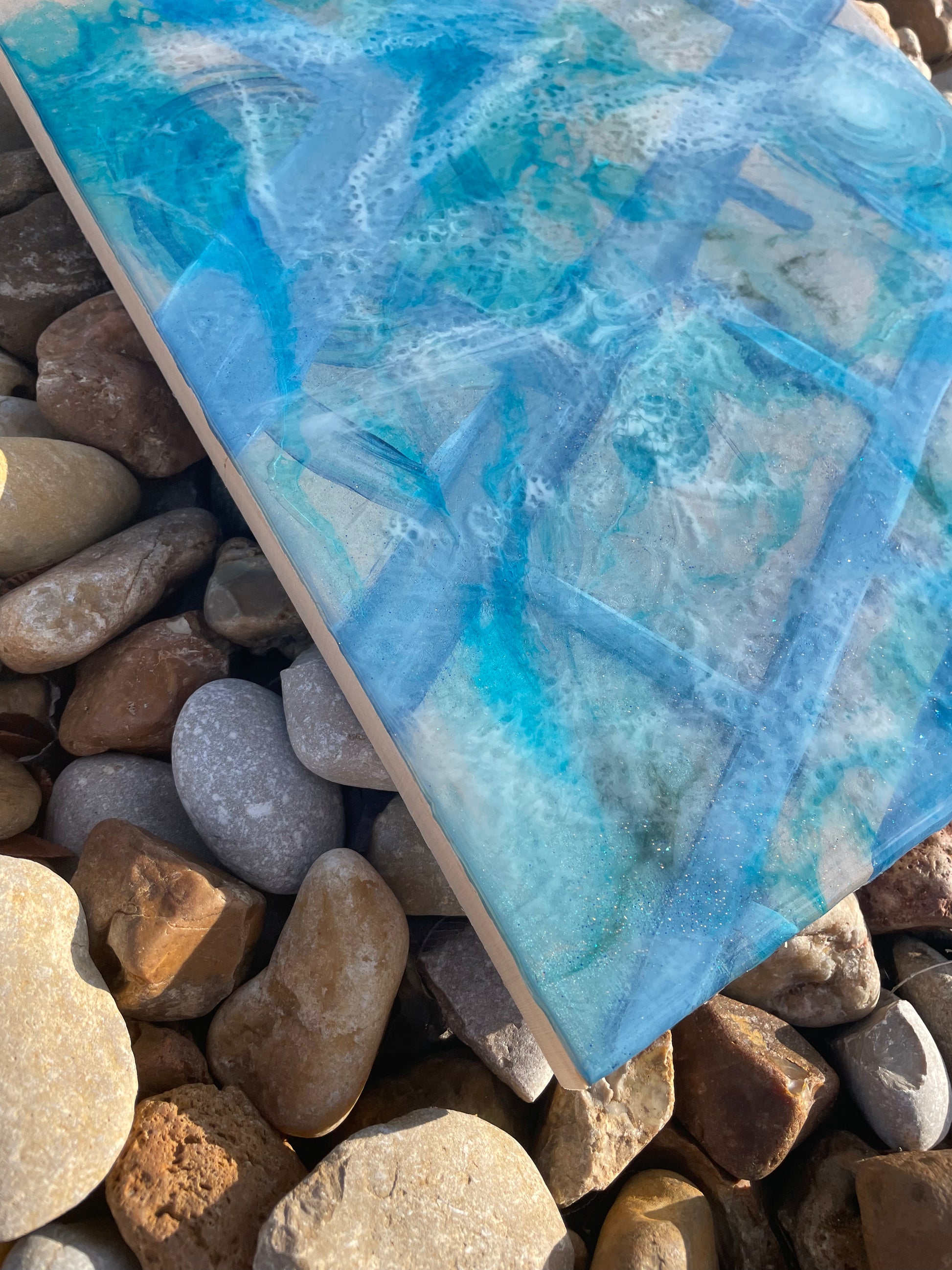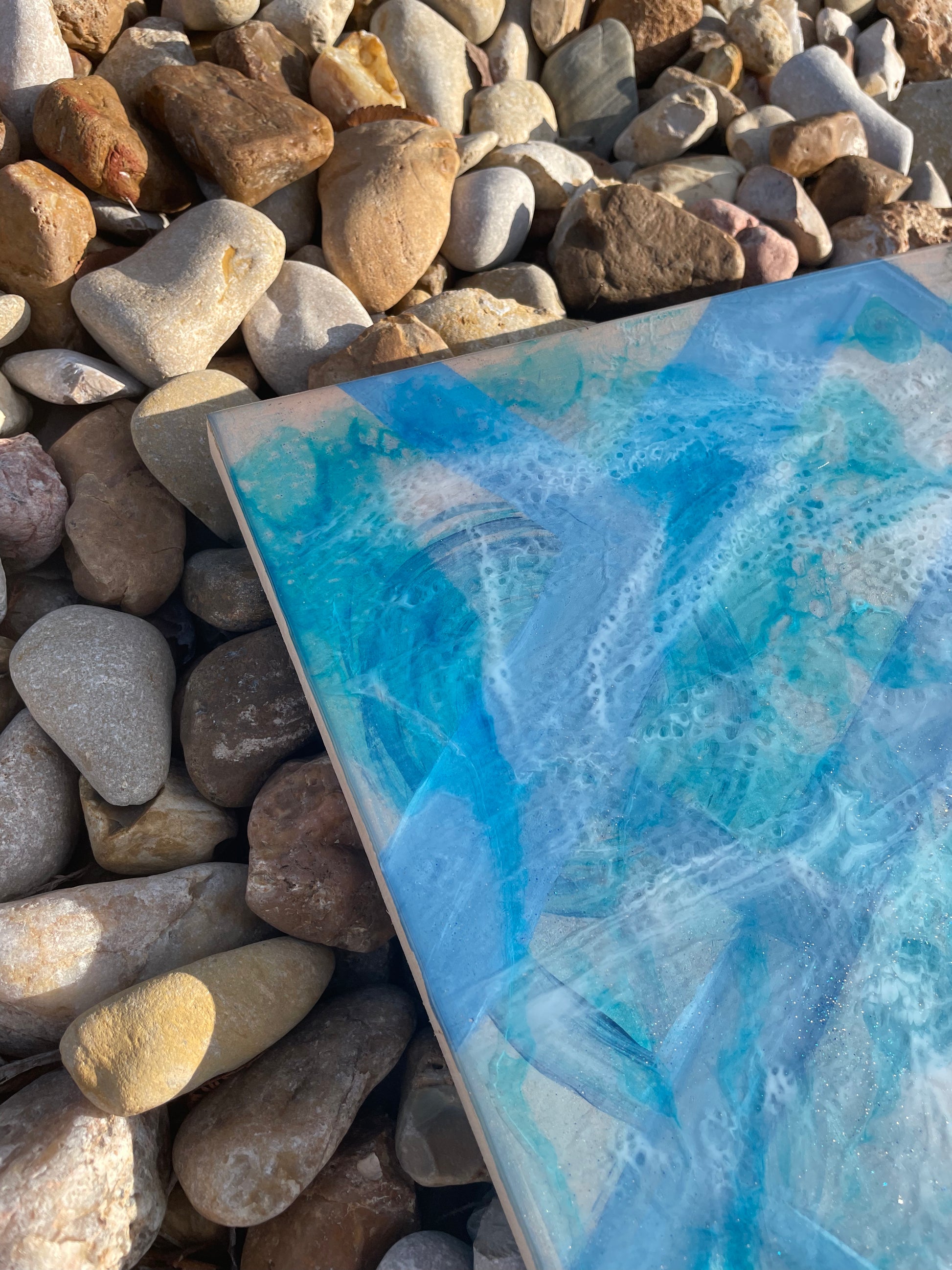 This piece consist of a painted background, and 3 resin layers of enhanced detail (glitter, and foggy effect).