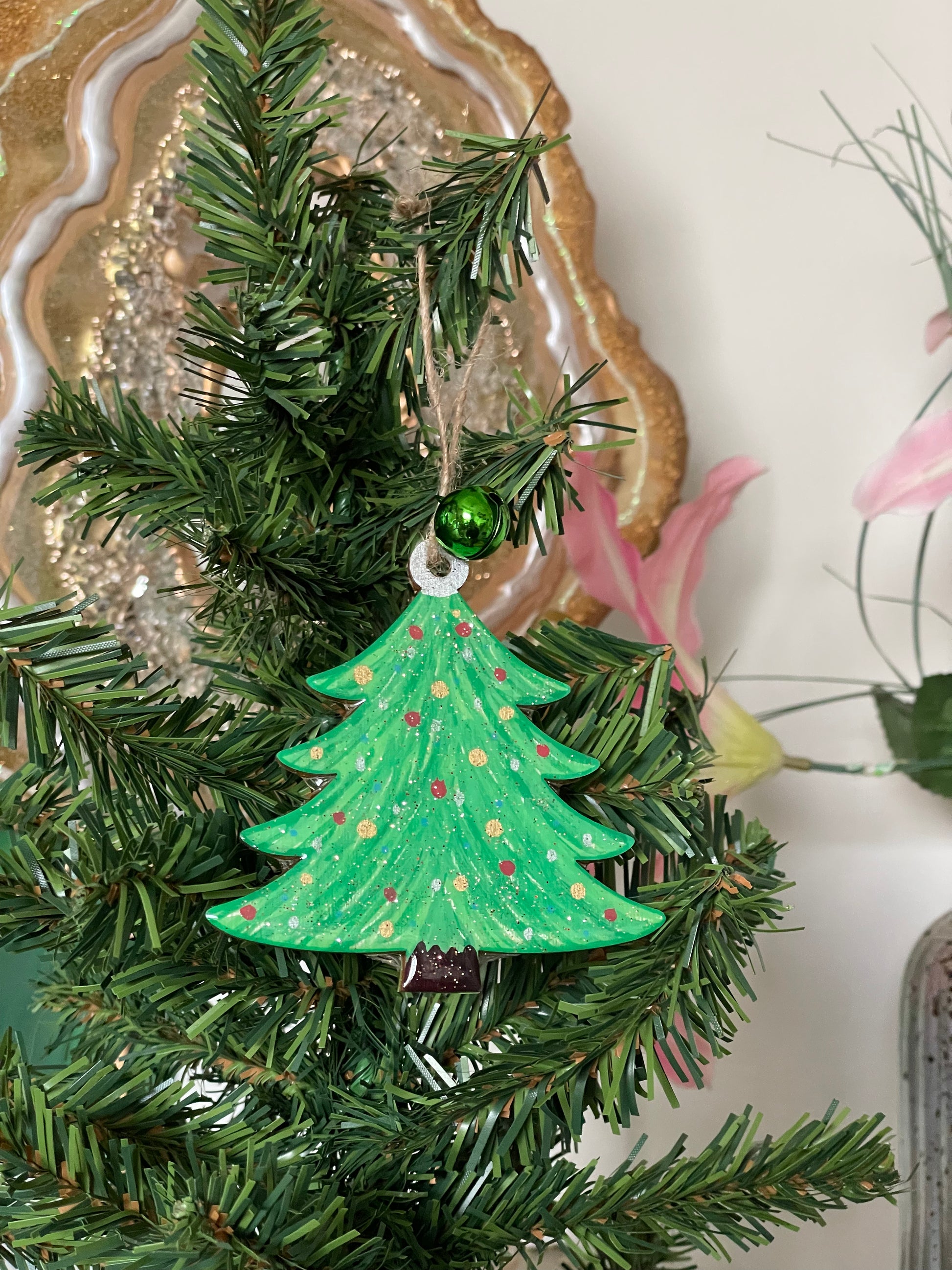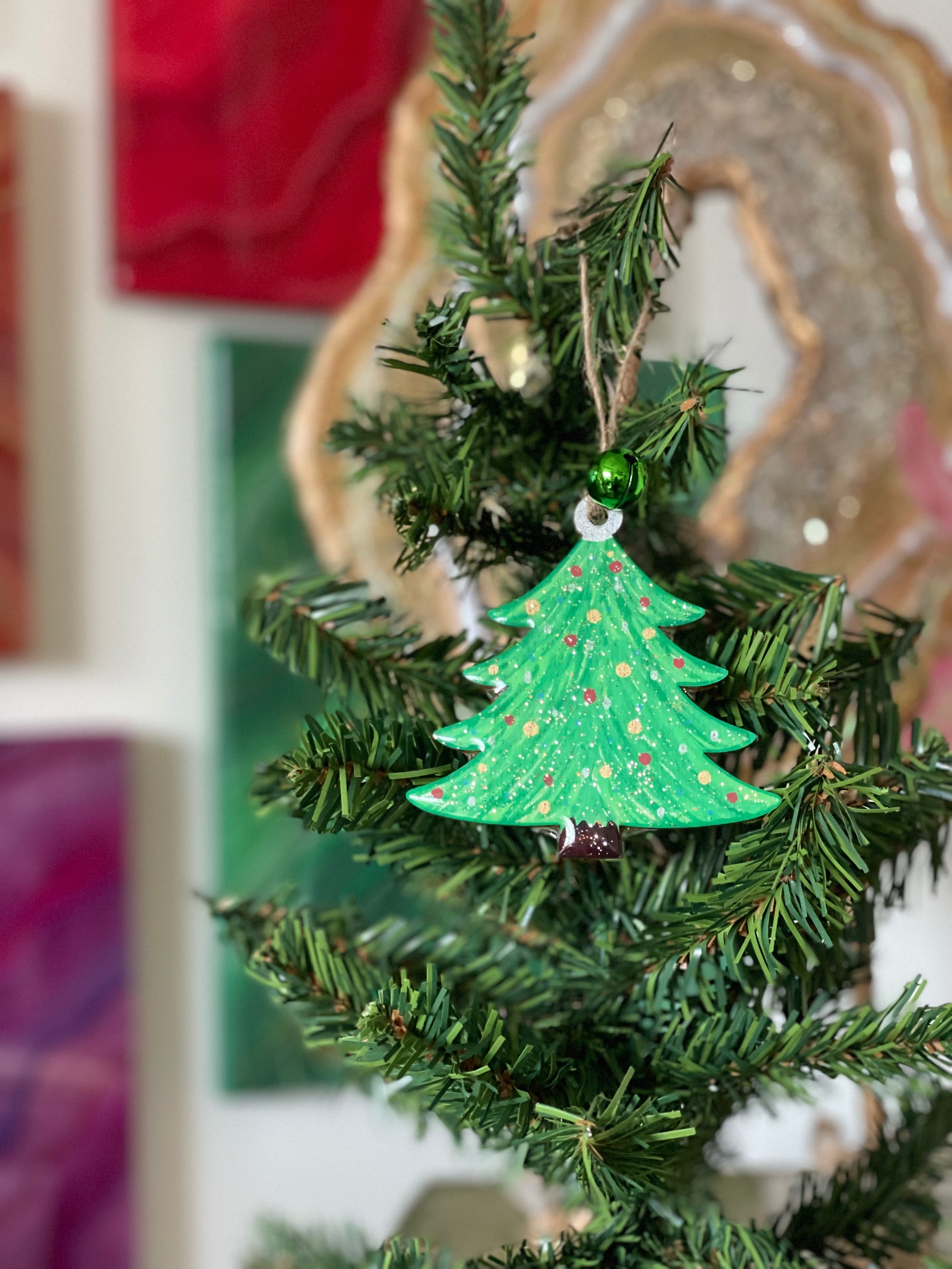3x3 inch wood ornament decorated with paint, paint pens, and resin enhancements; also a twine rope so you can easily hang it on your tree. ((Comes with a green bell attached)).