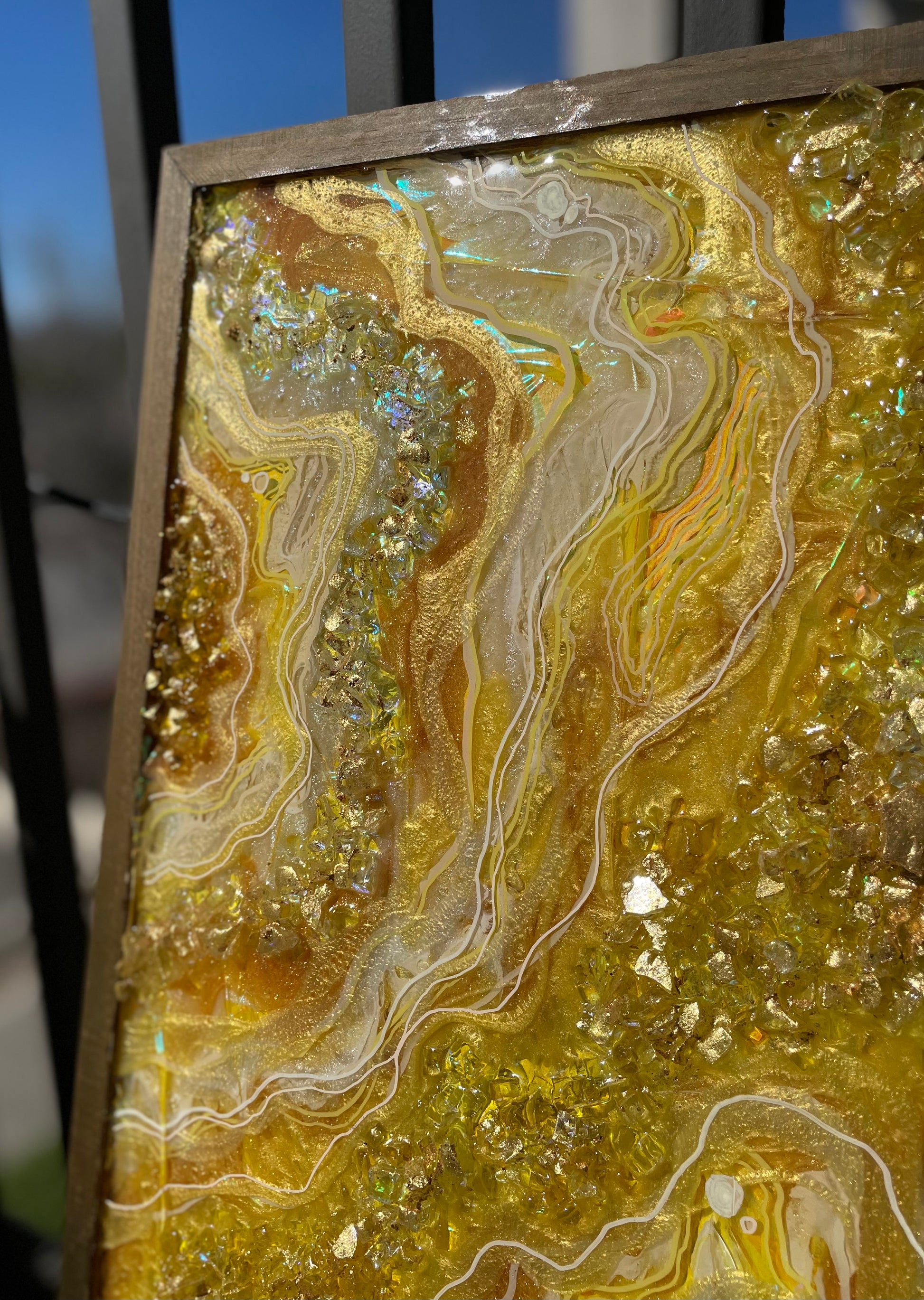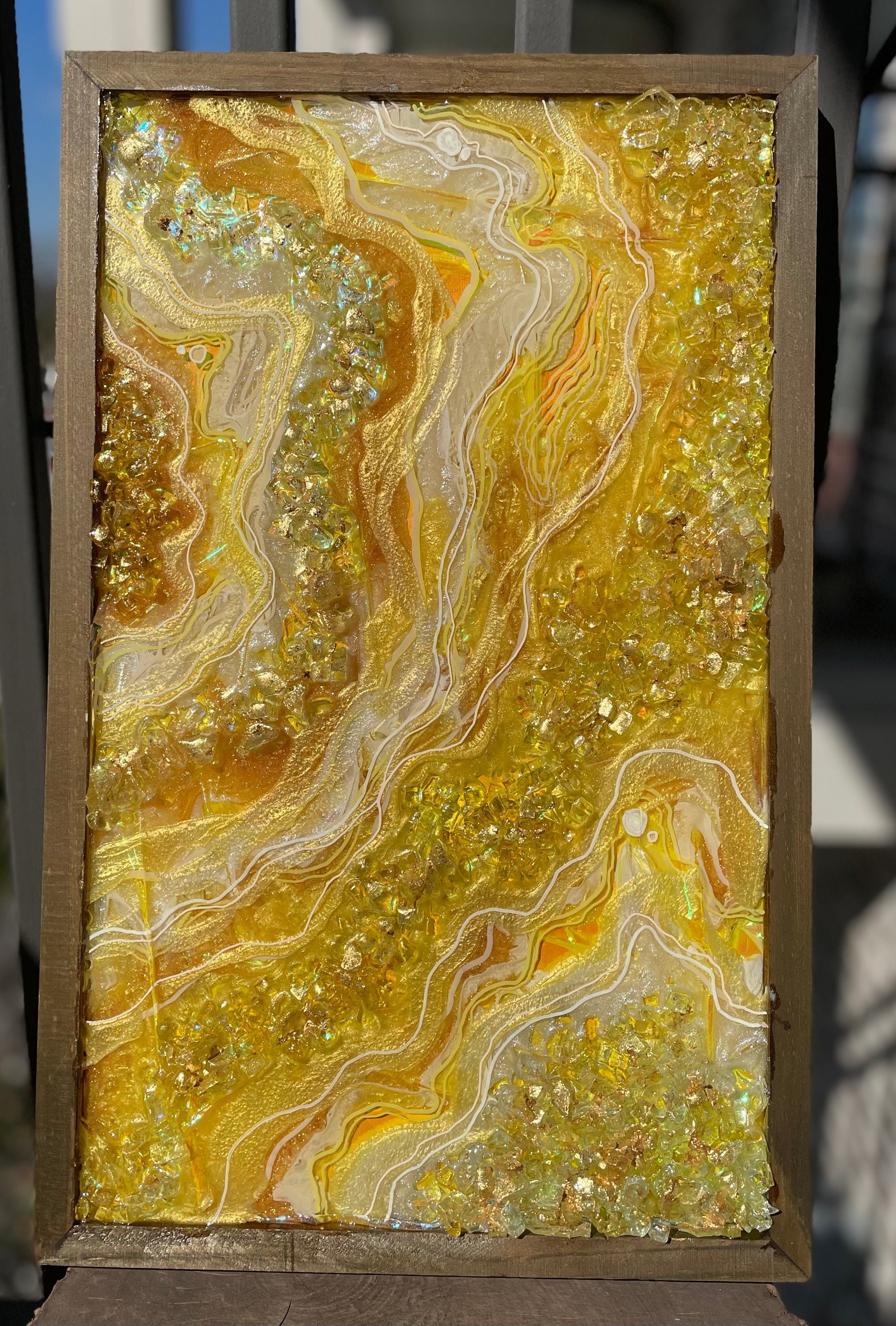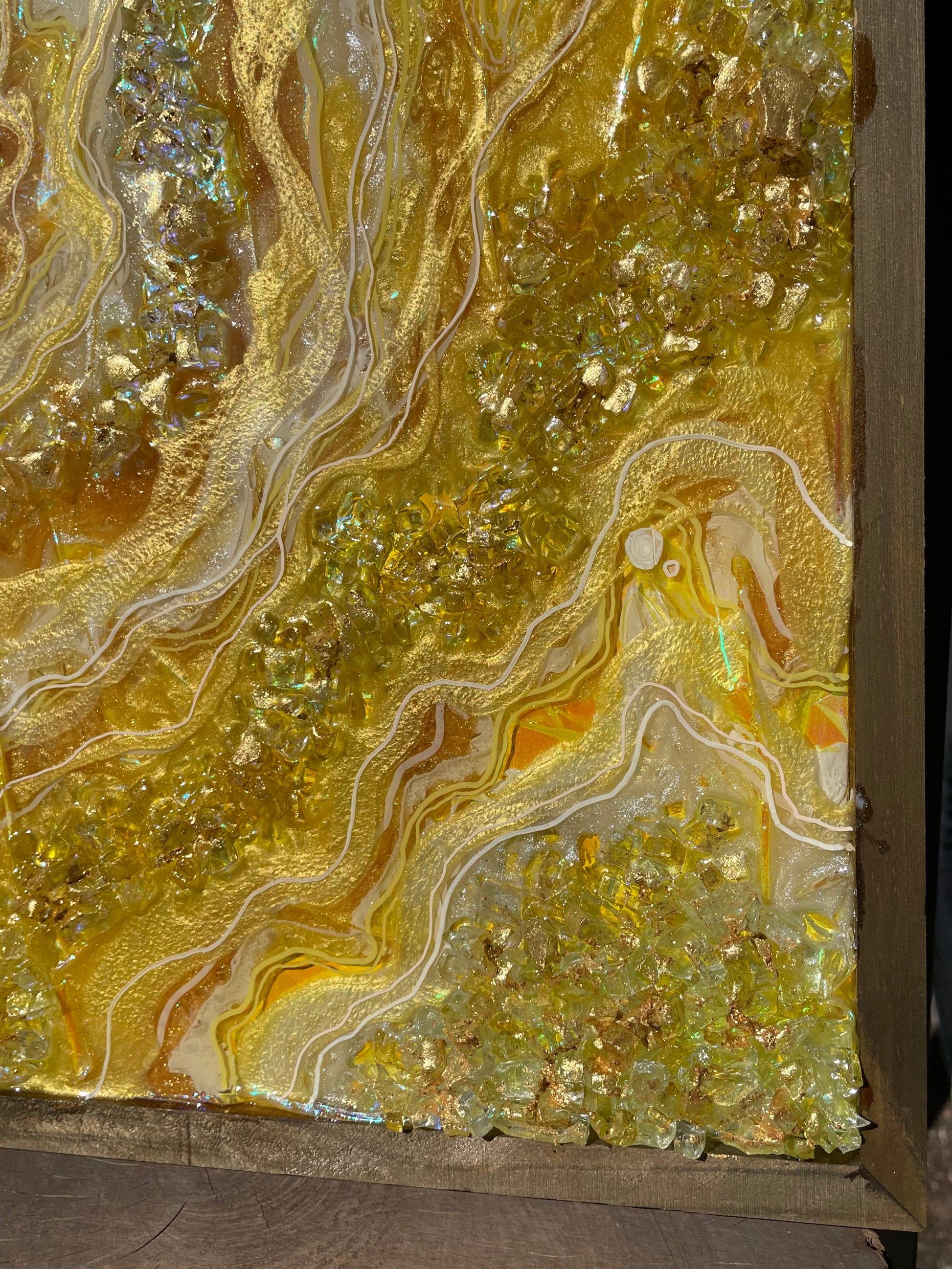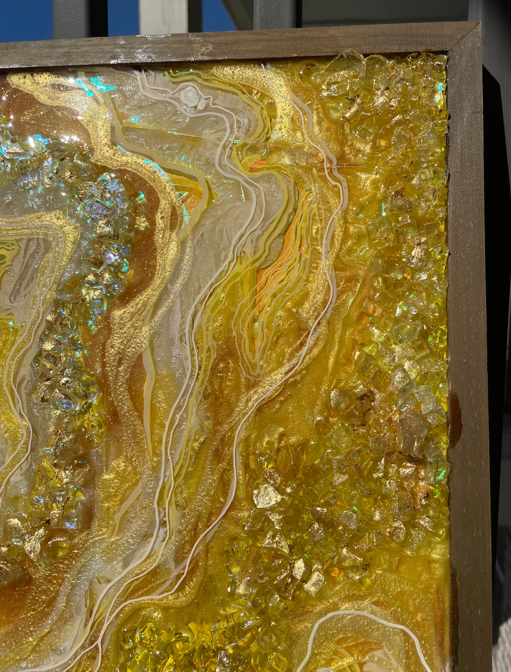 This Citrine inspired geode is made on a framed canvas. There is a mixtures of yellows, white, creme and gold to recreate a citrine geode slice. In this piece there is also holographic feature.