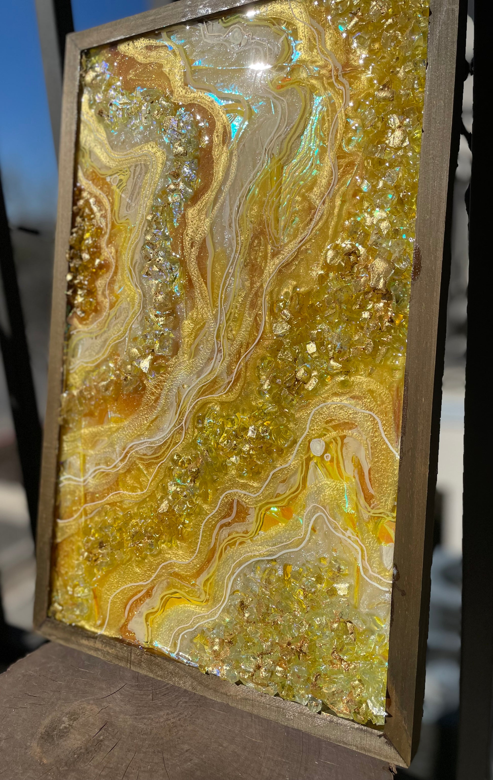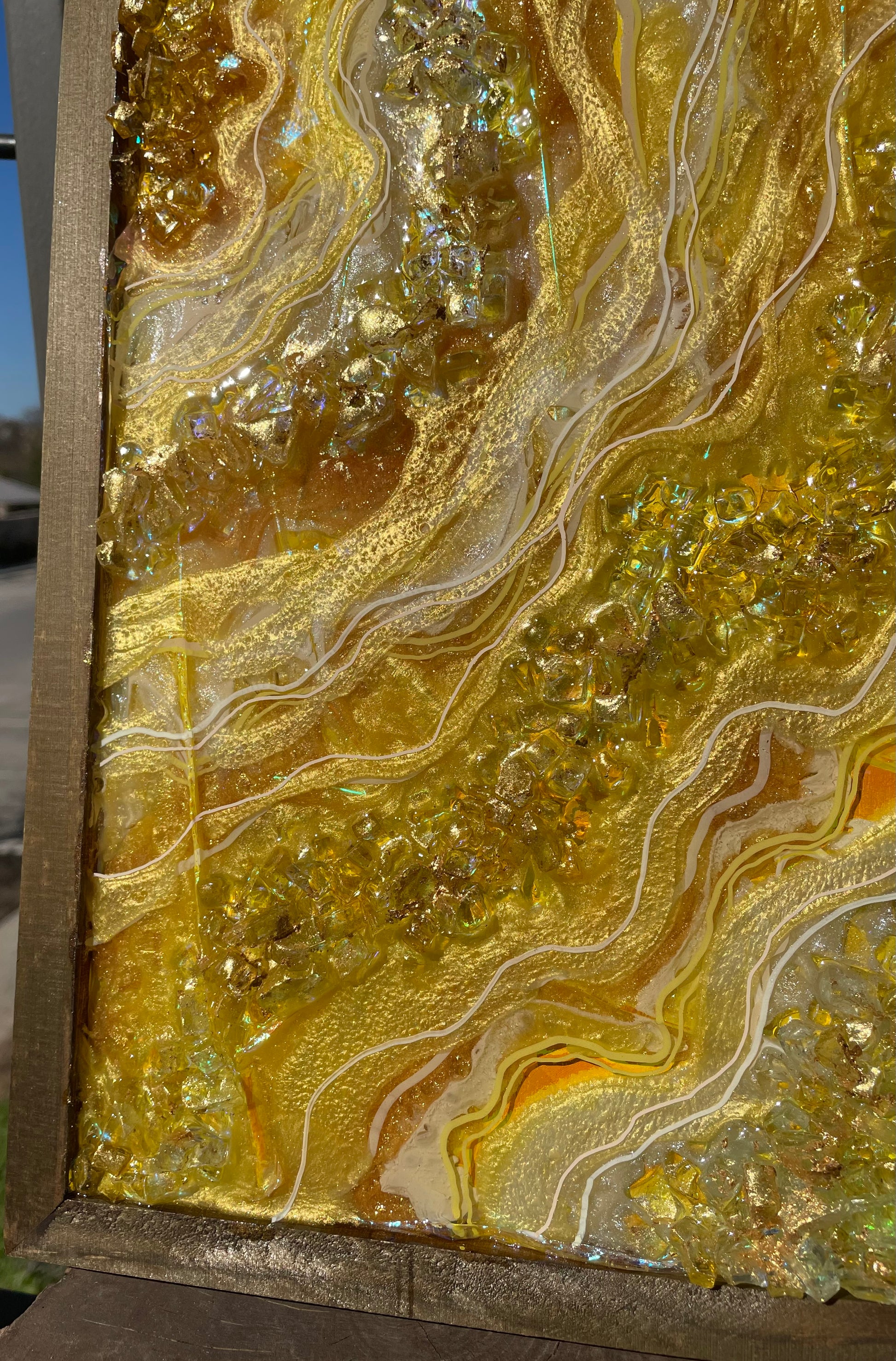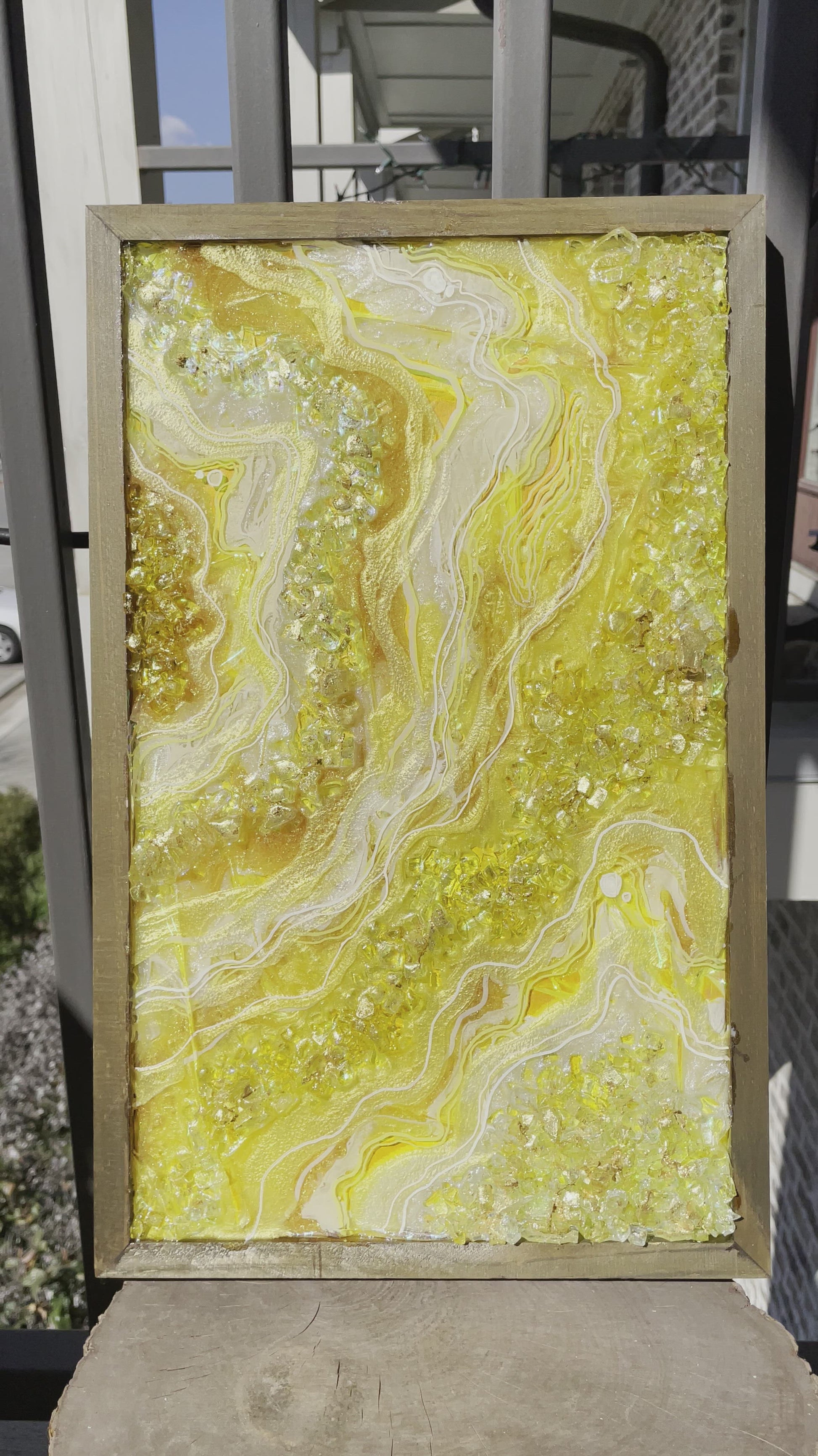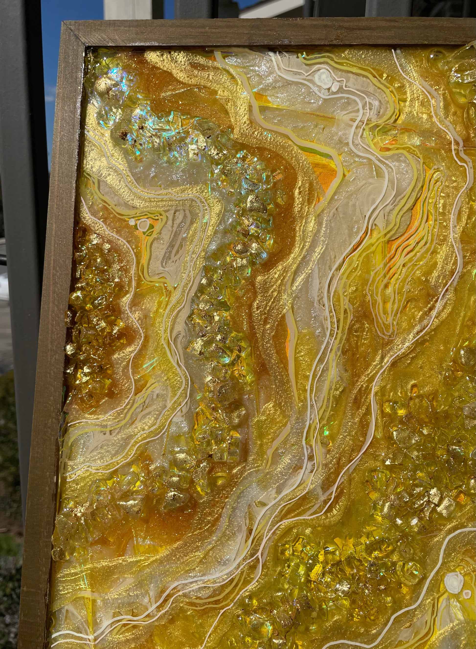 This Citrine inspired geode is made on a framed canvas. There is a mixtures of yellows, white, creme and gold to recreate a citrine geode slice. In this piece there is also holographic feature.