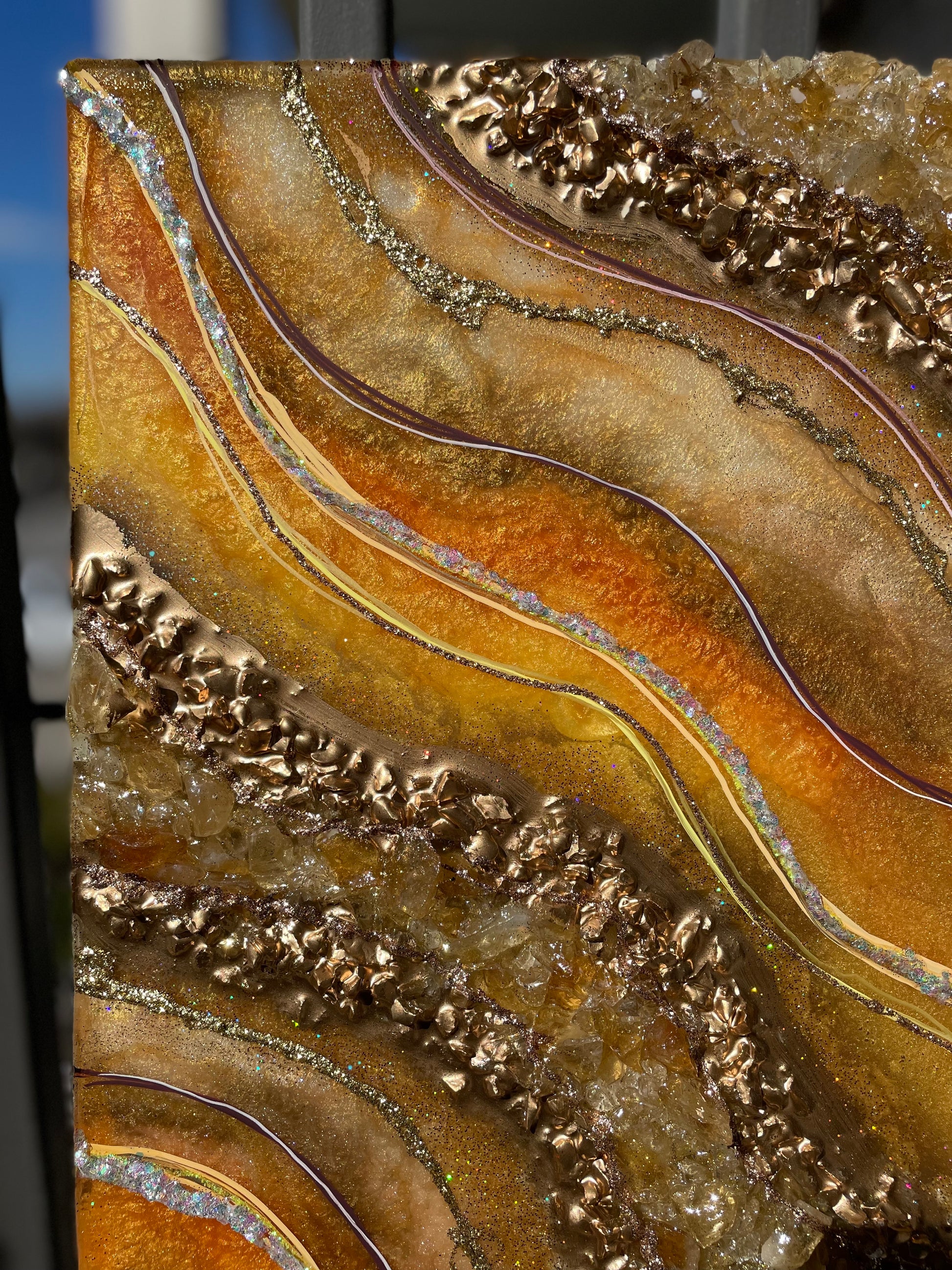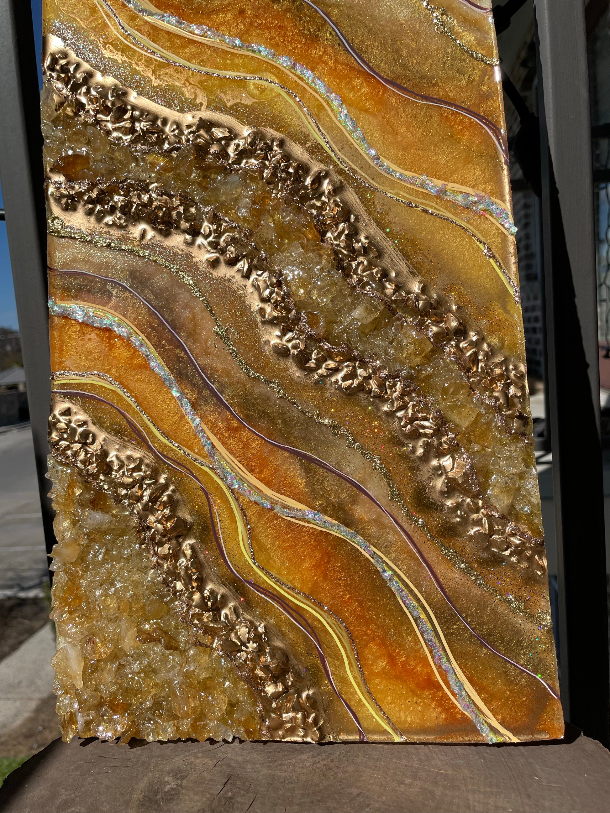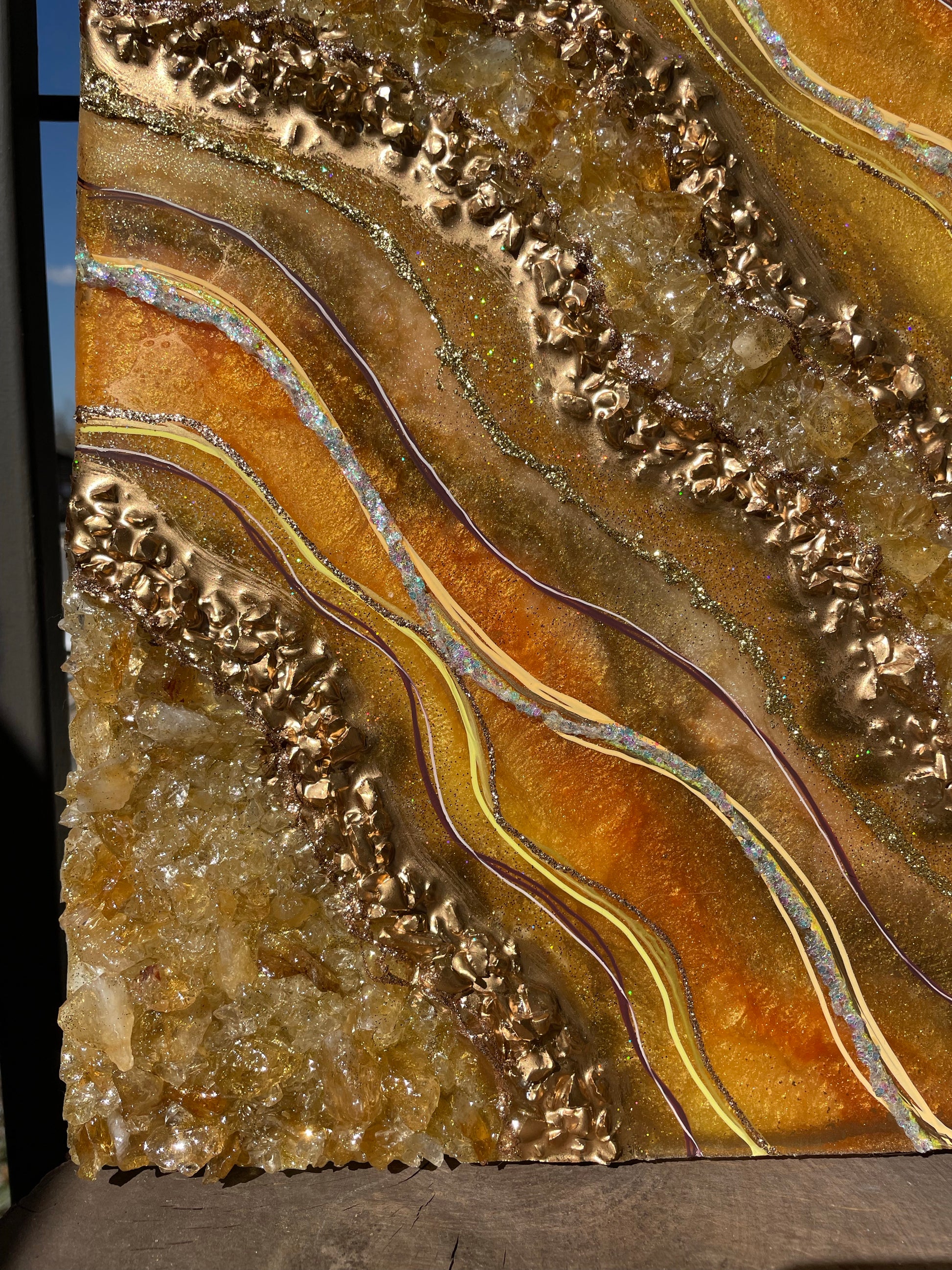 This citrine inspired piece has genuine citrine chips & gold painted rocks to mimic a real citrine geode slice.