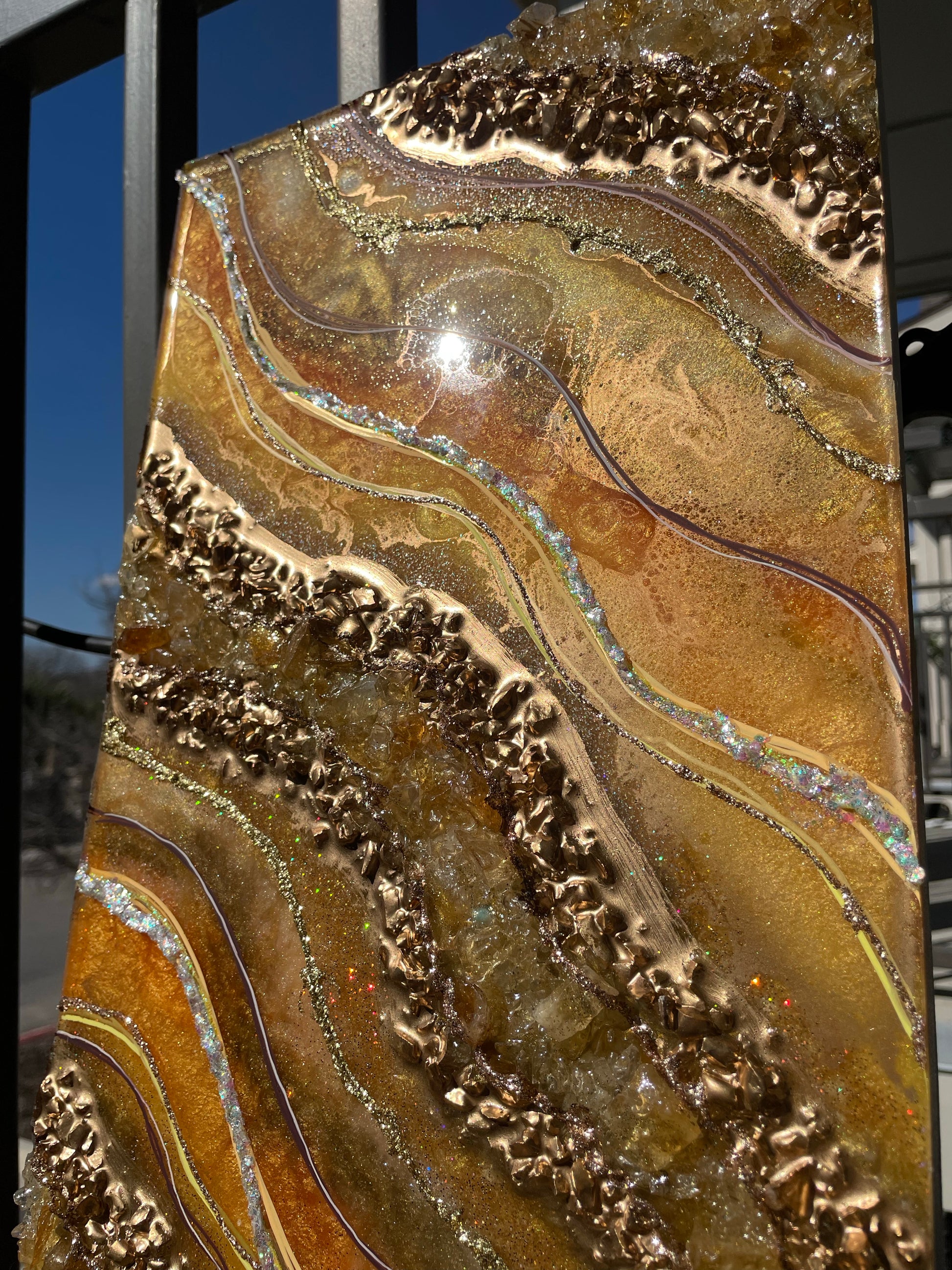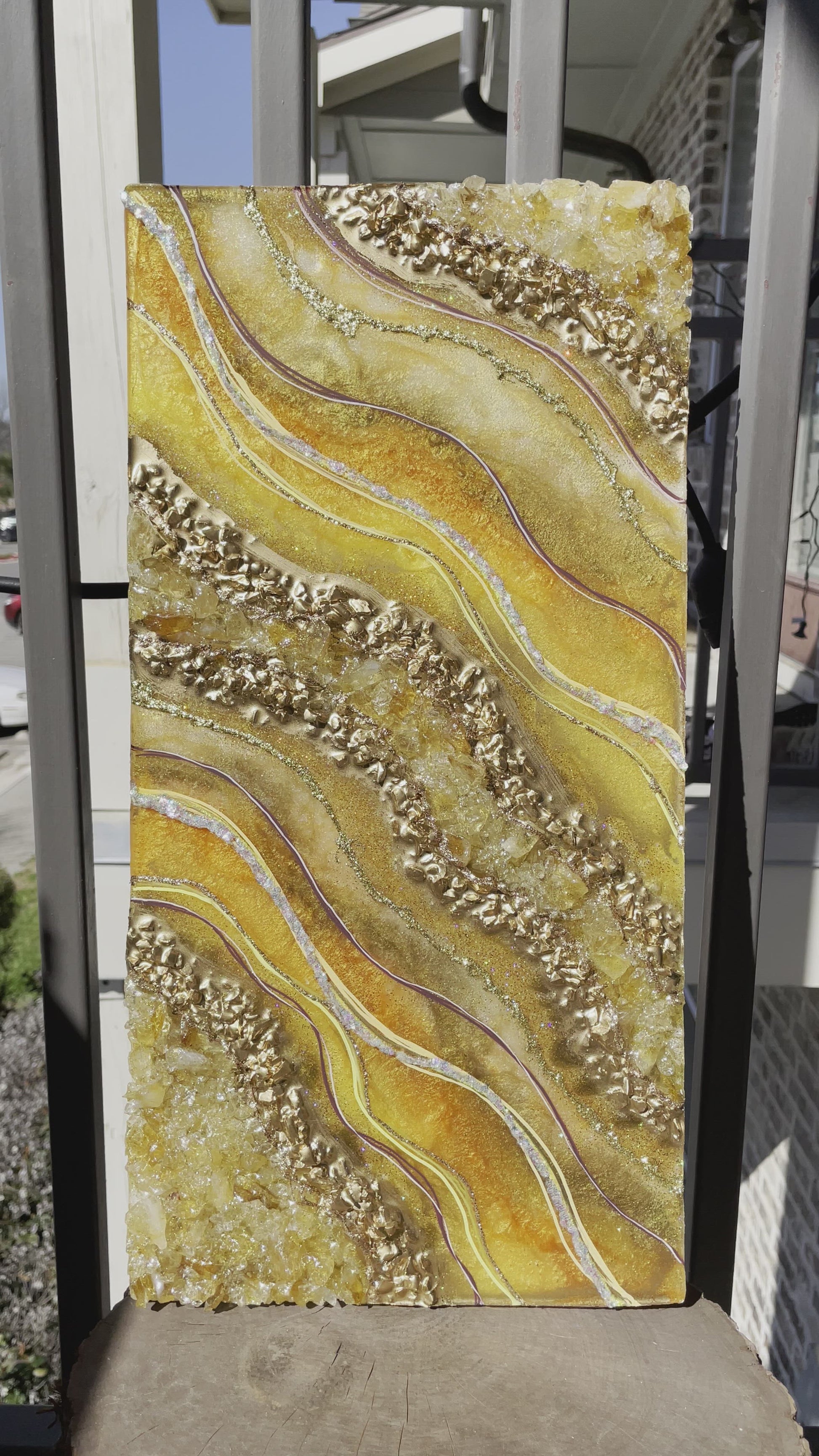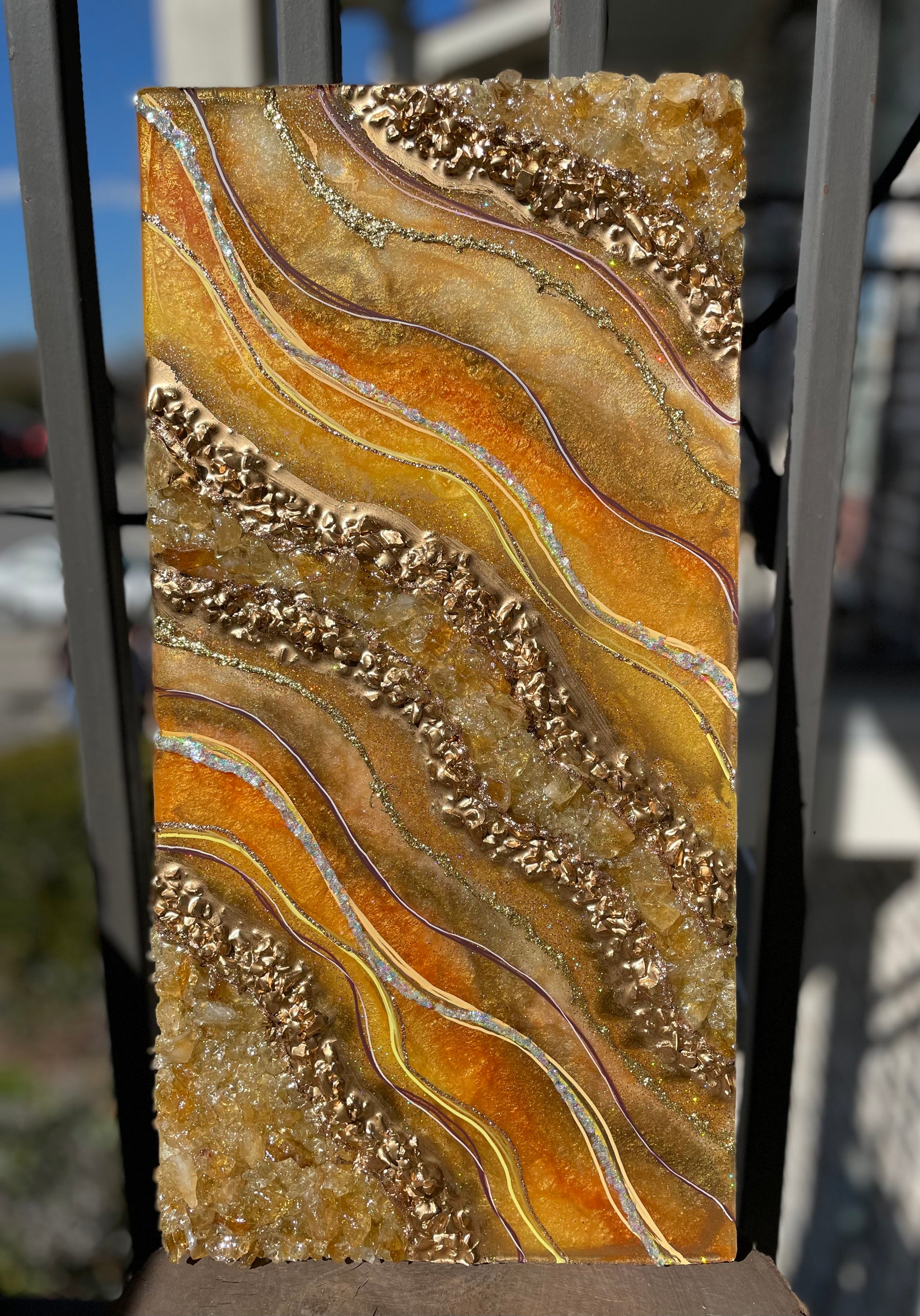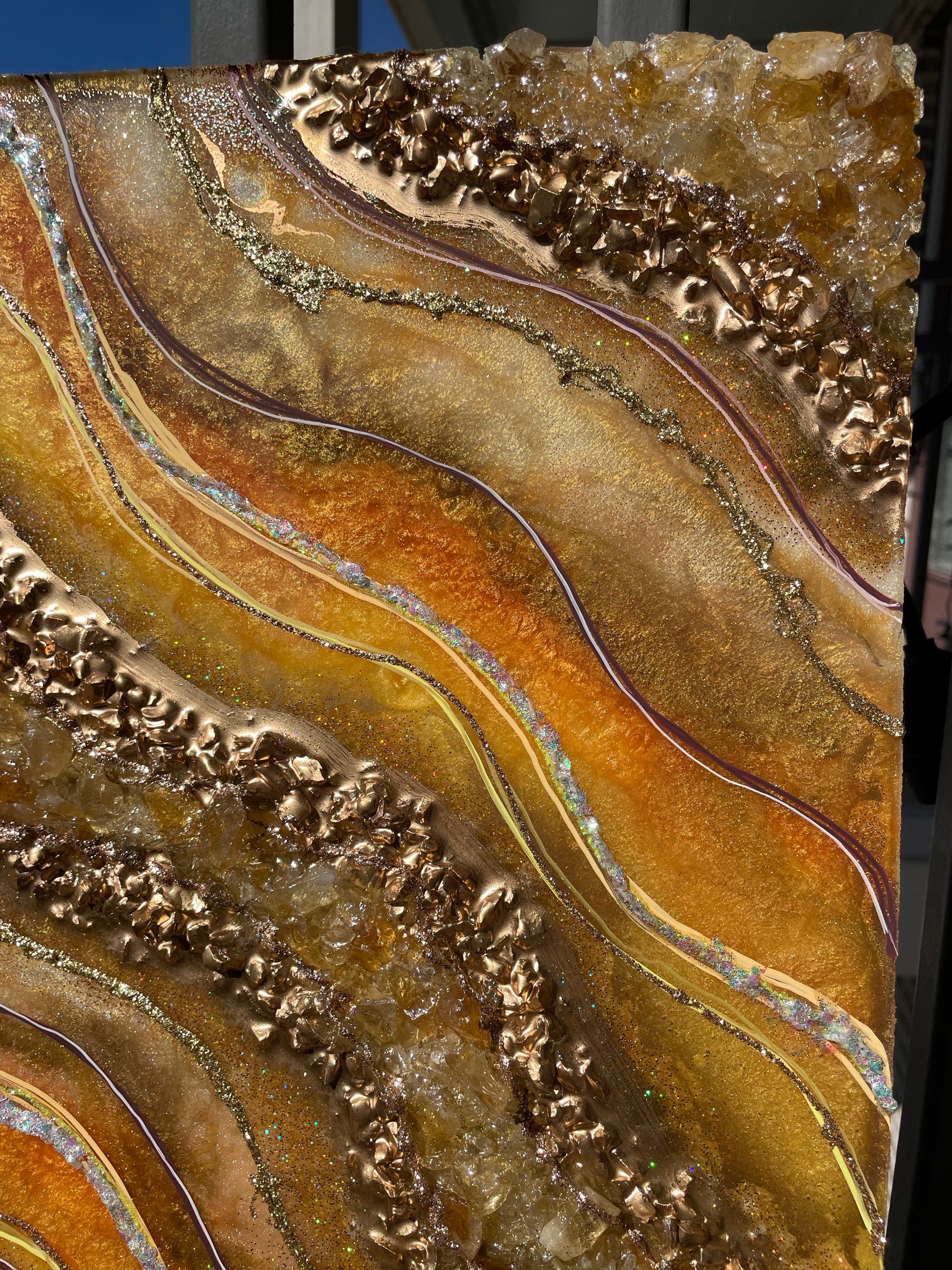 This citrine inspired piece has genuine citrine chips & gold painted rocks to mimic a real citrine geode slice.