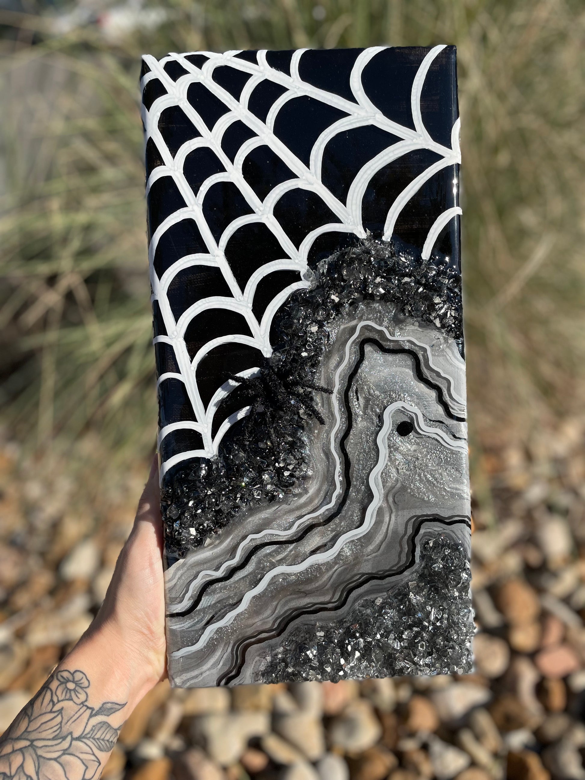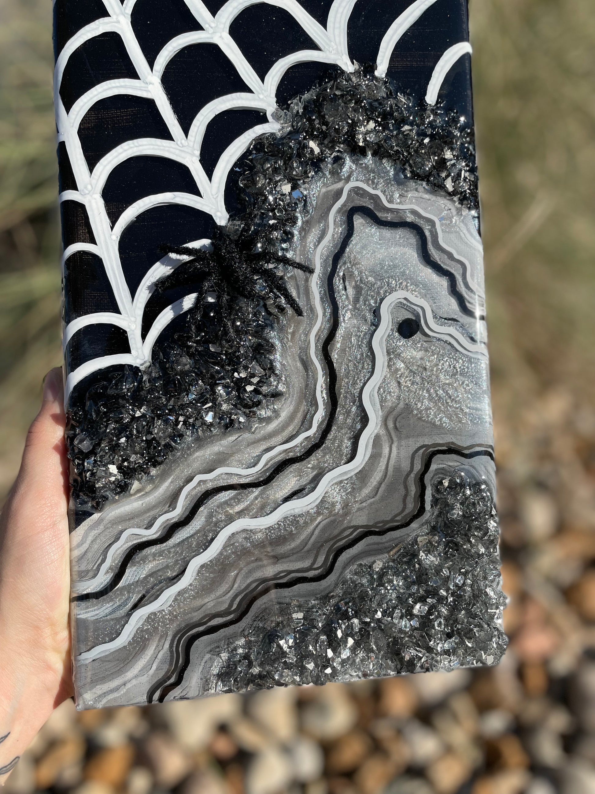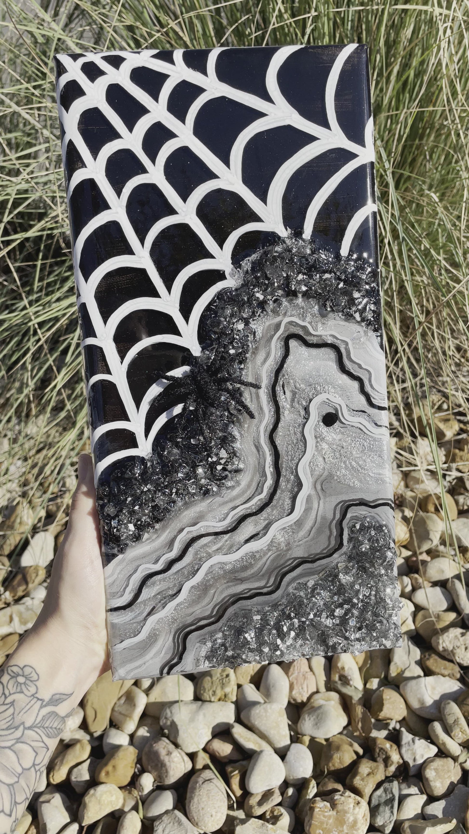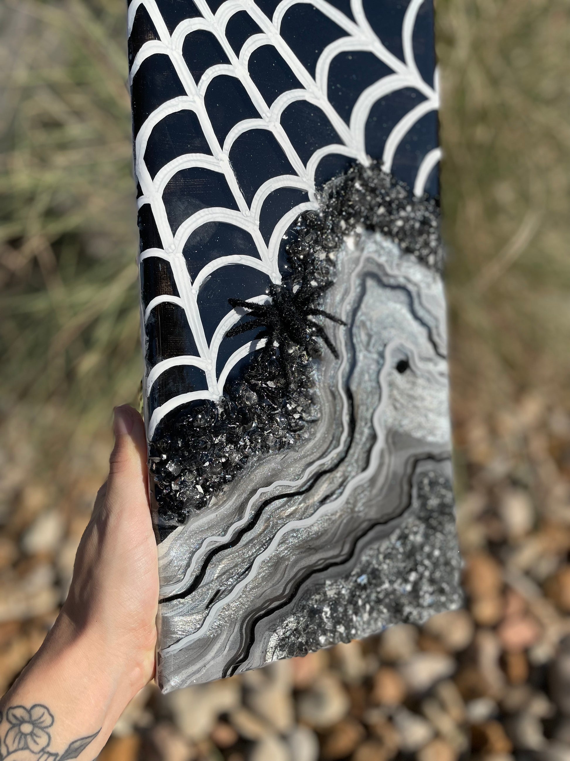 This spooky geode piece has a faux spider and a hand drawn spider web that is integrated into the geode rocks.