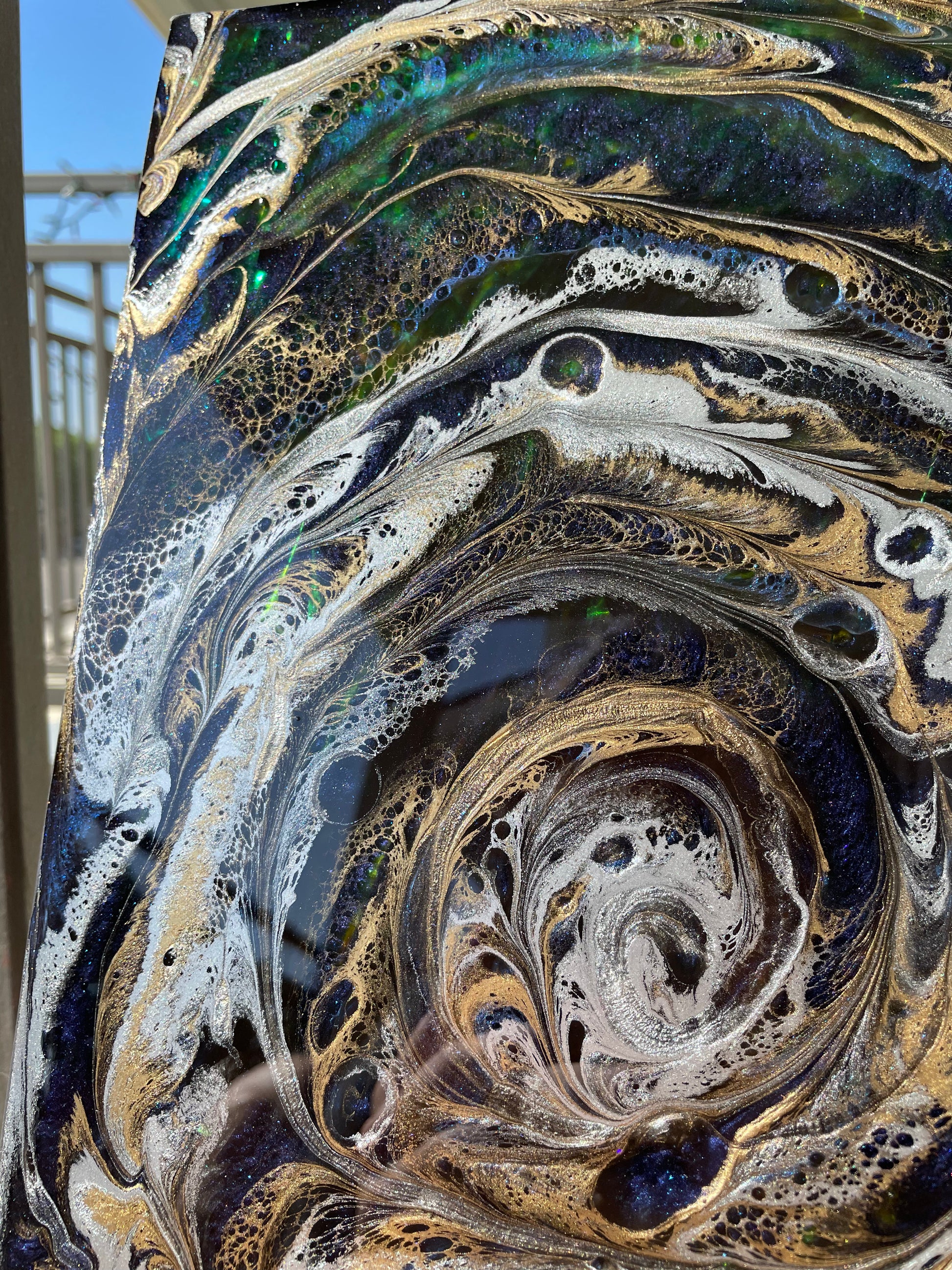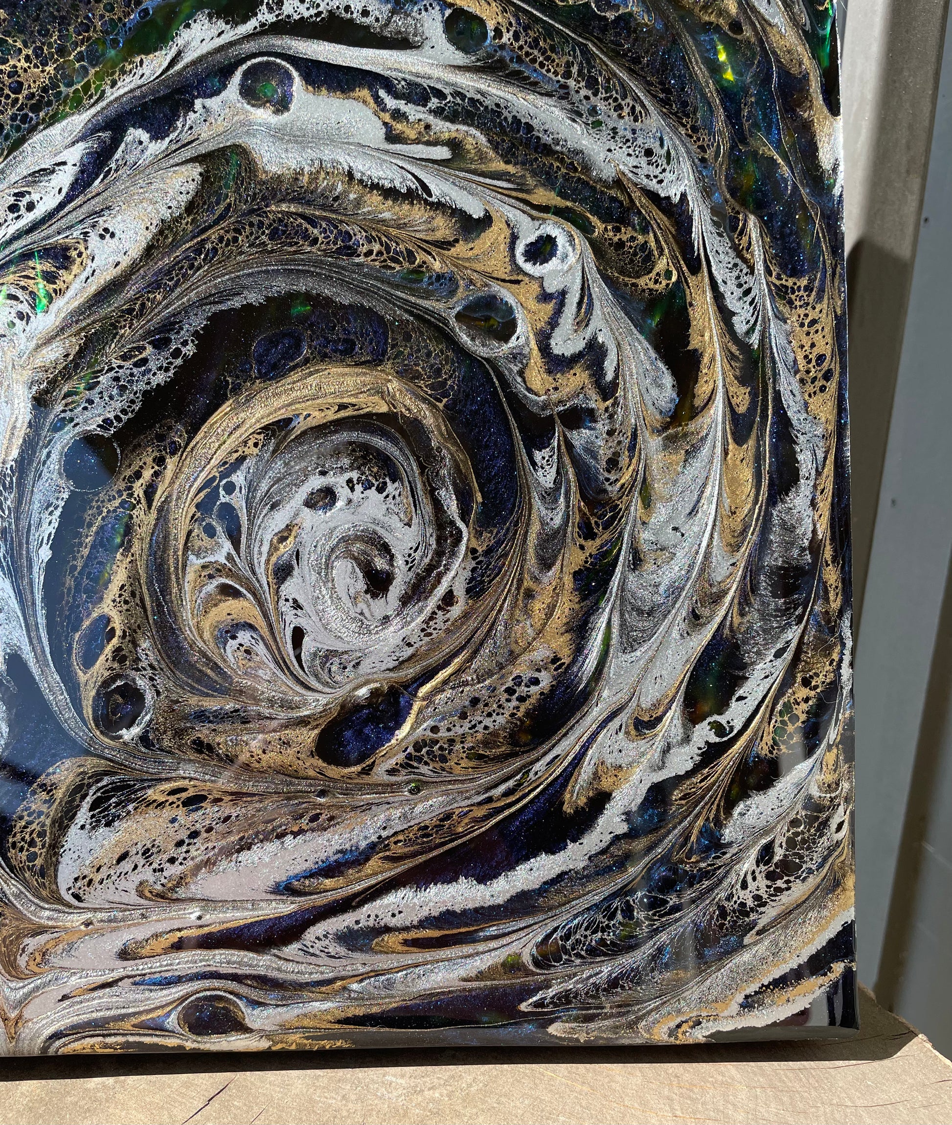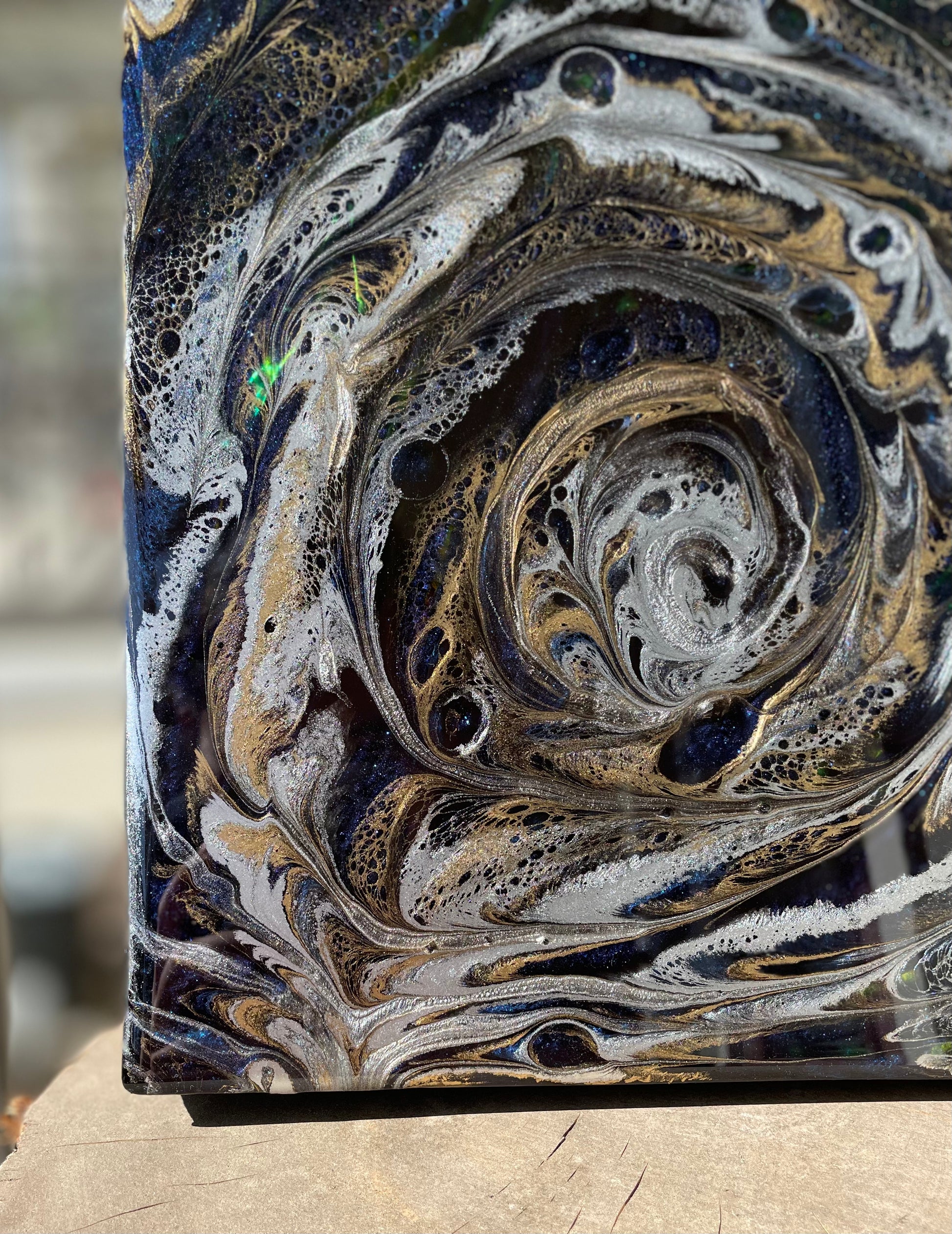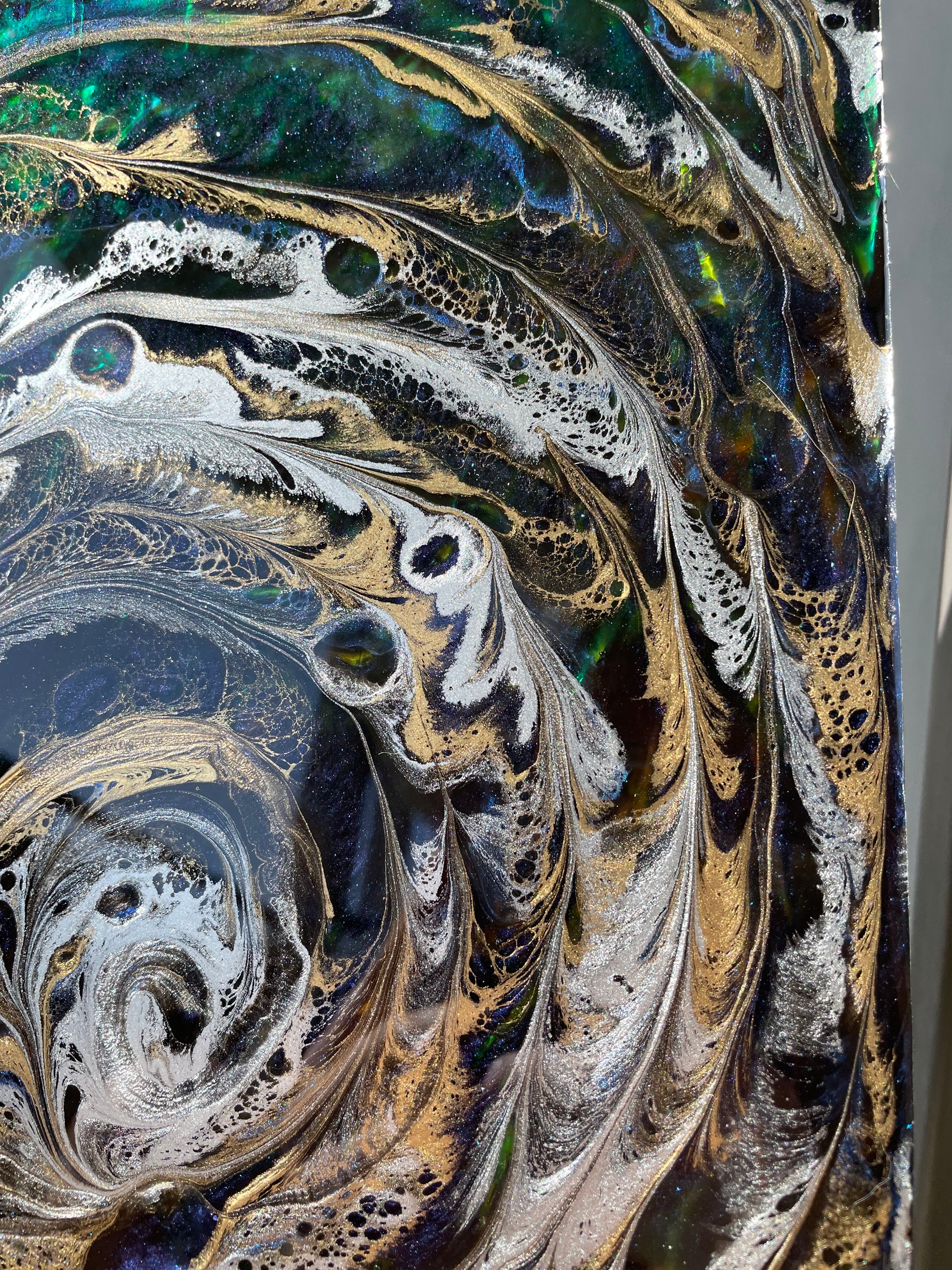 This piece is inspired by a black hole/Alice in wonderland vibe. The colors in this piece are black, silver, gold and hints of interference blue with some sparkle and holographic hints throughout.