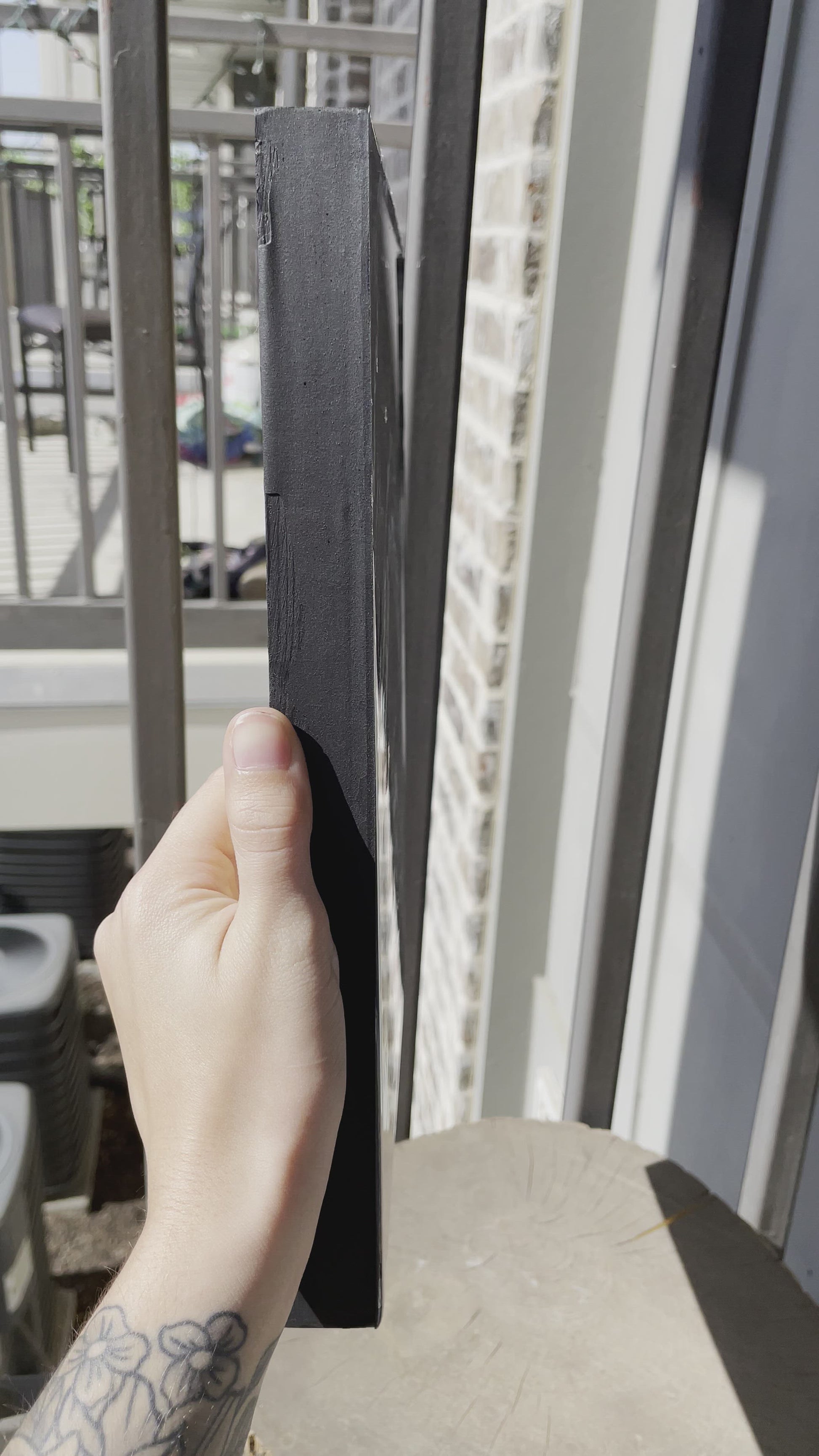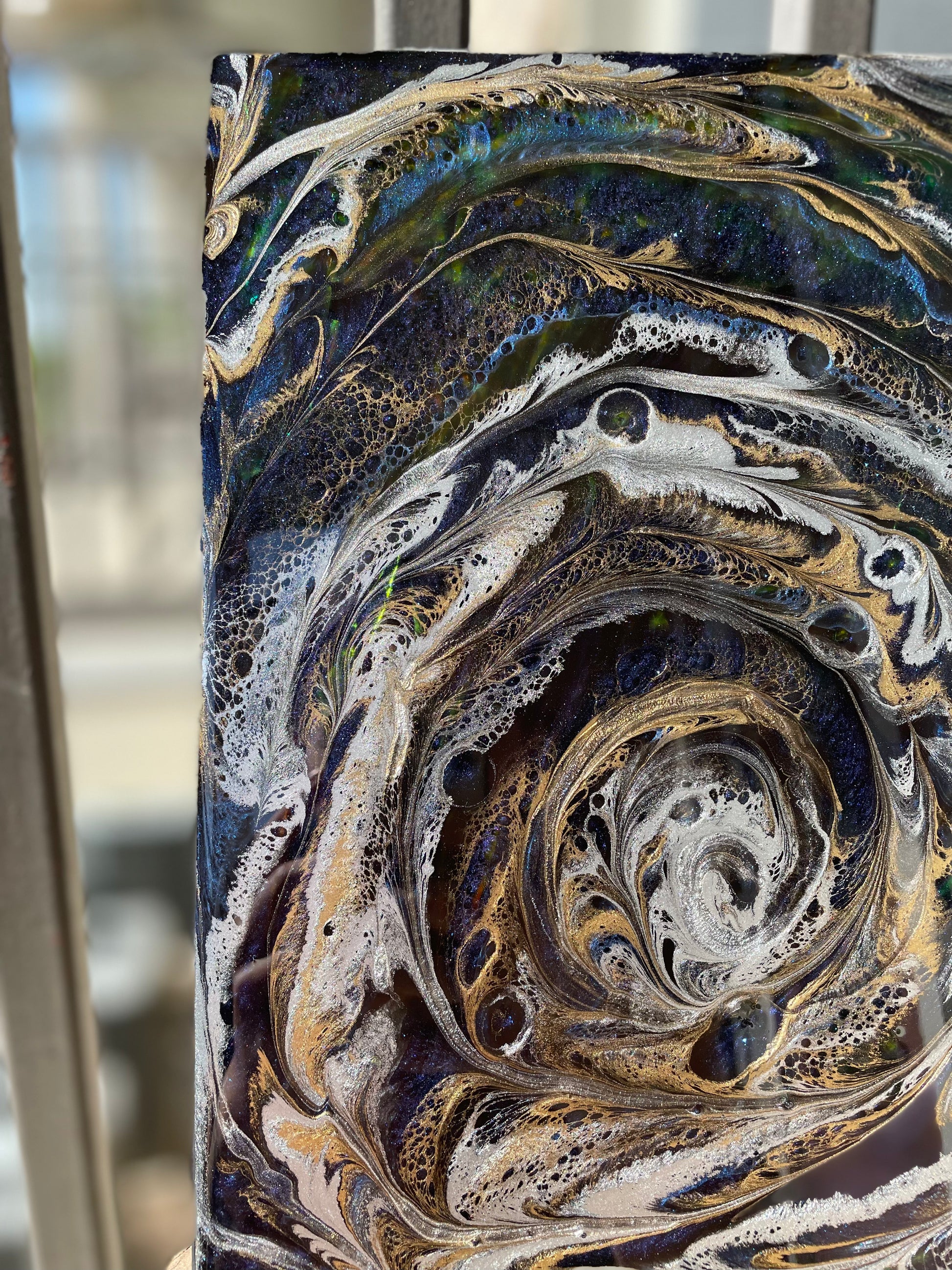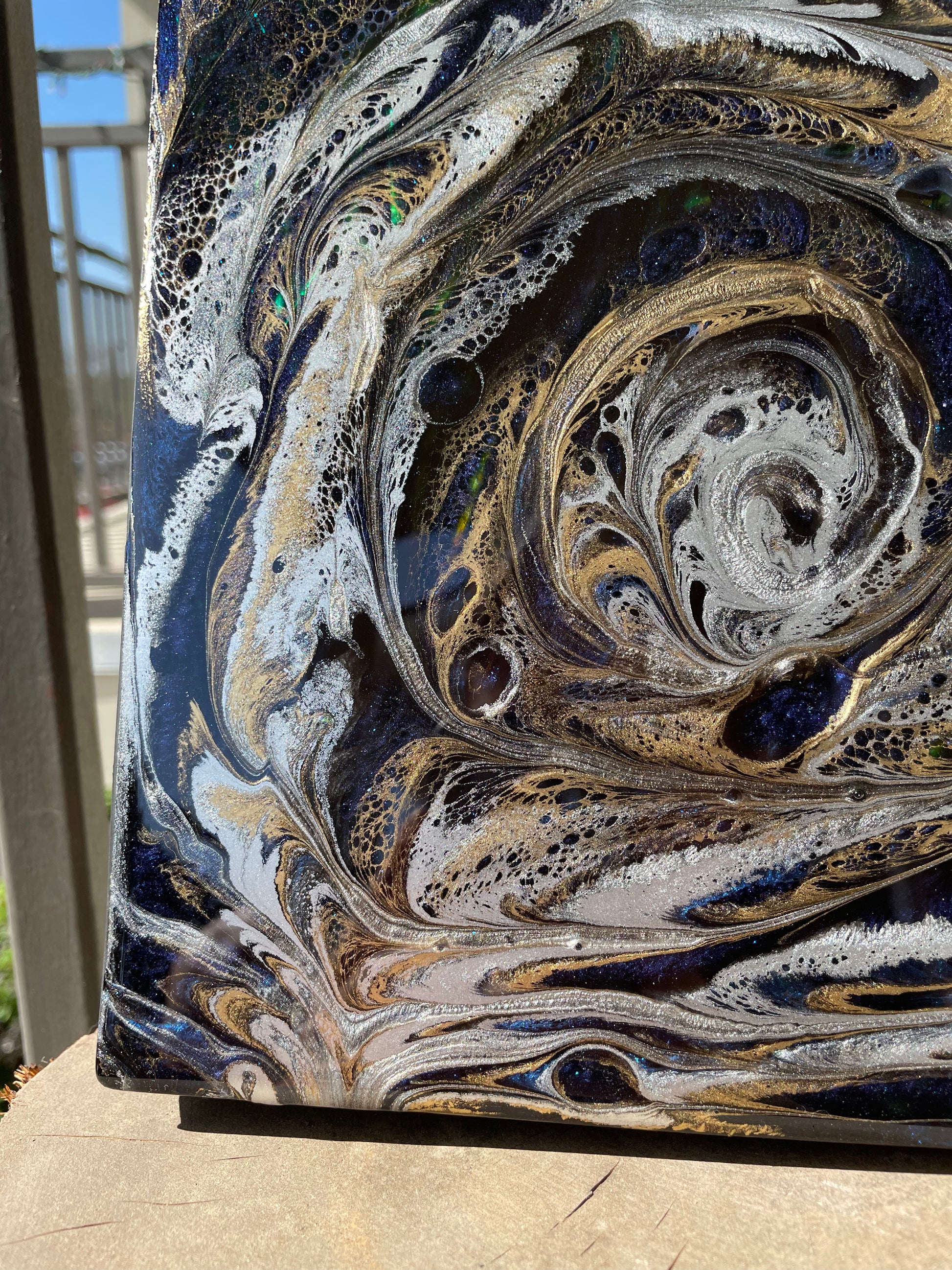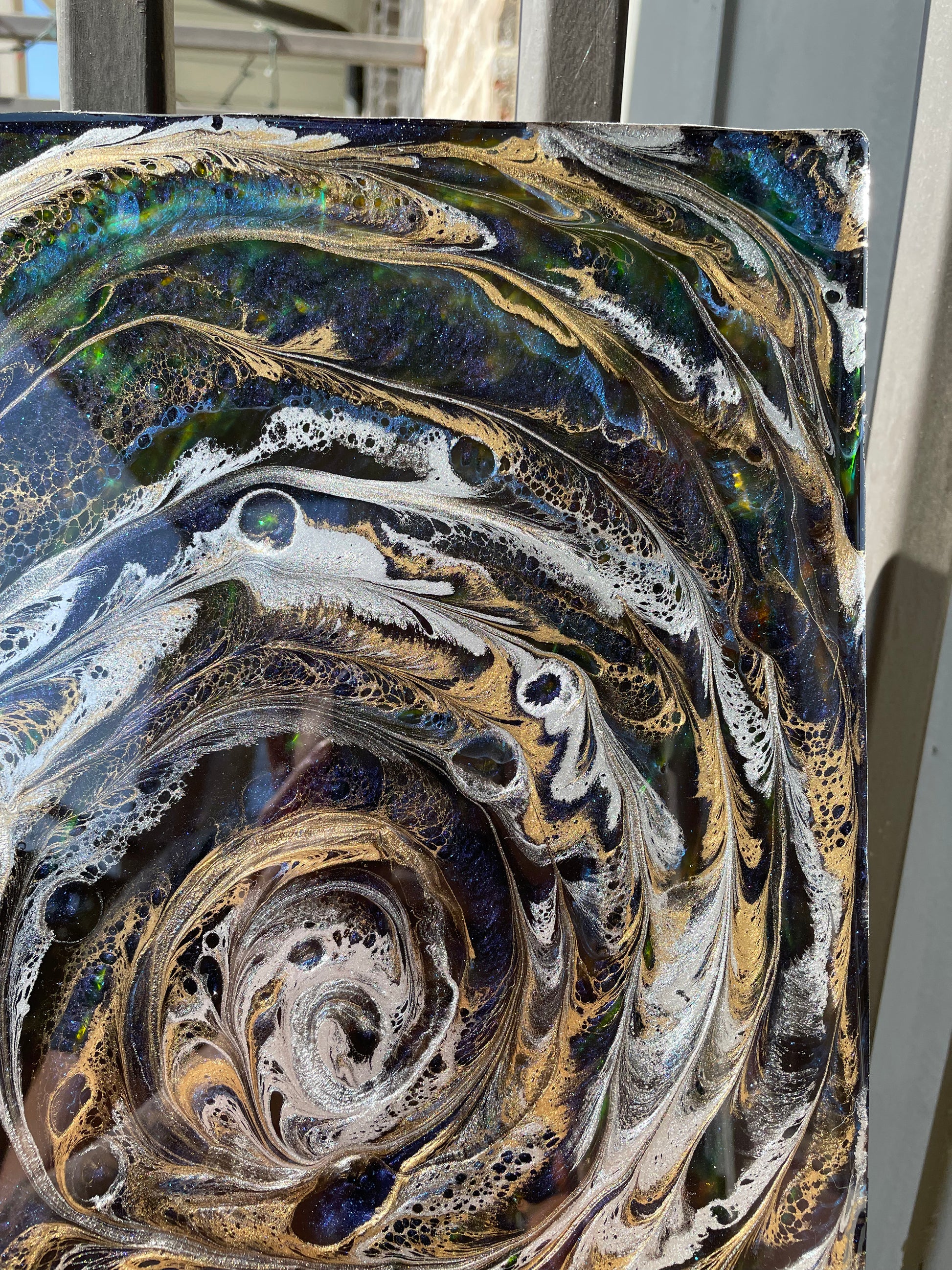This piece is inspired by a black hole/Alice in wonderland vibe. The colors in this piece are black, silver, gold and hints of interference blue with some sparkle and holographic hints throughout.