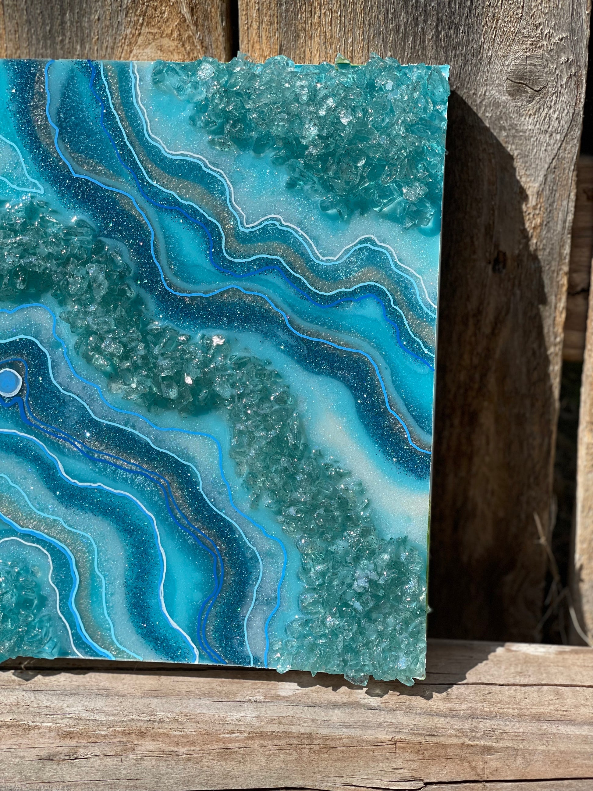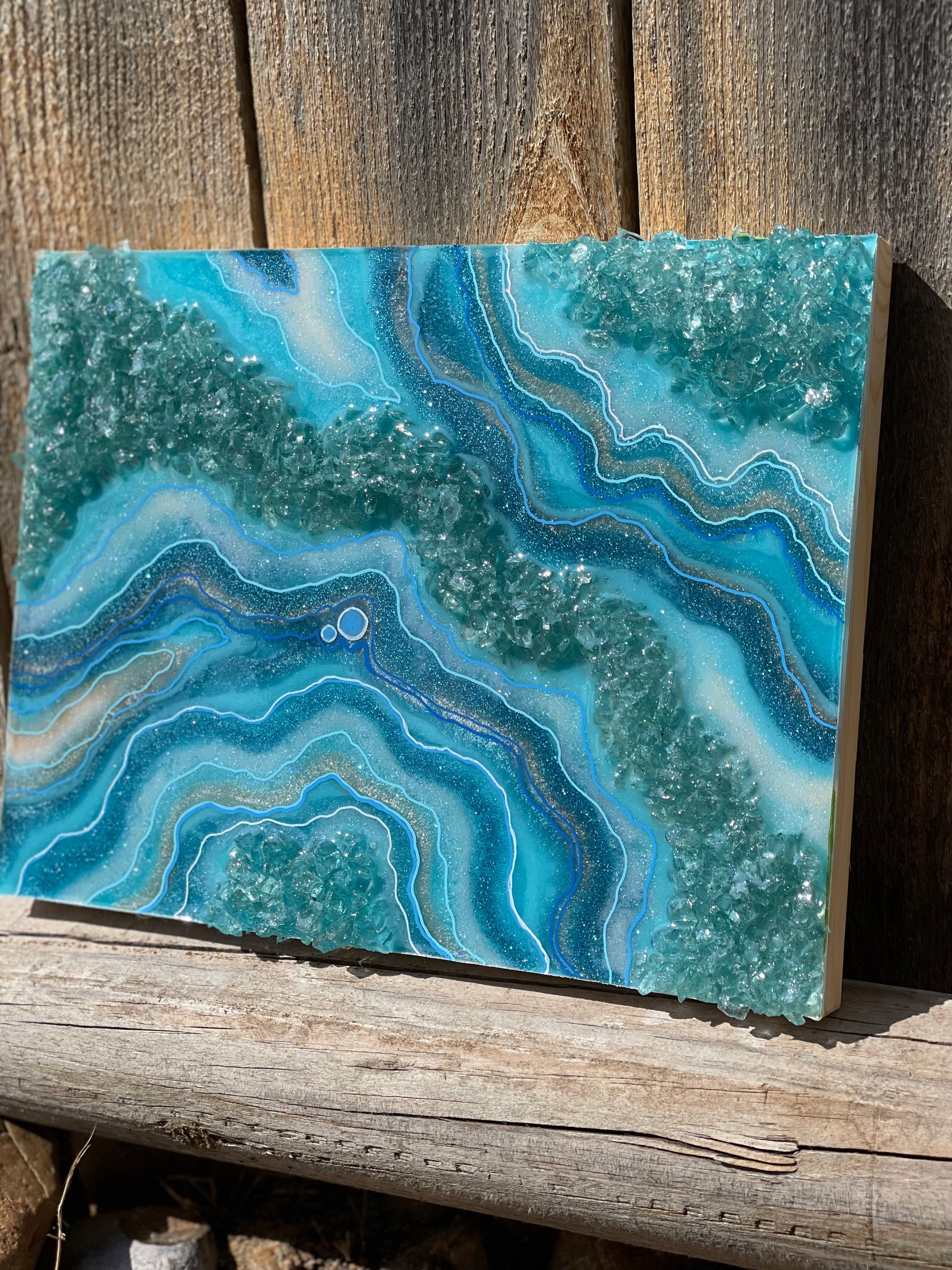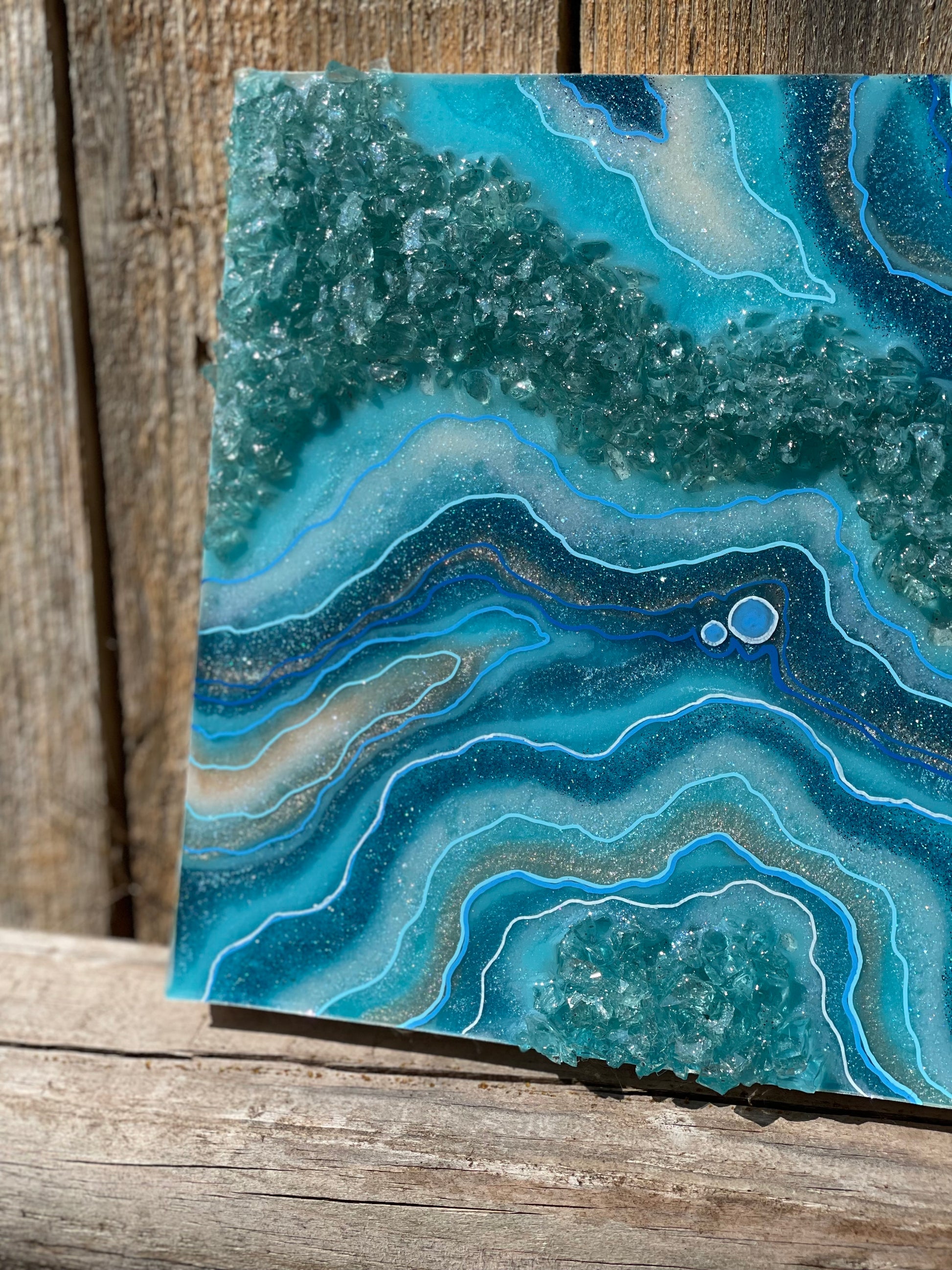 9x12 resin geode made with resin, pigments, faux rocks & fine line details