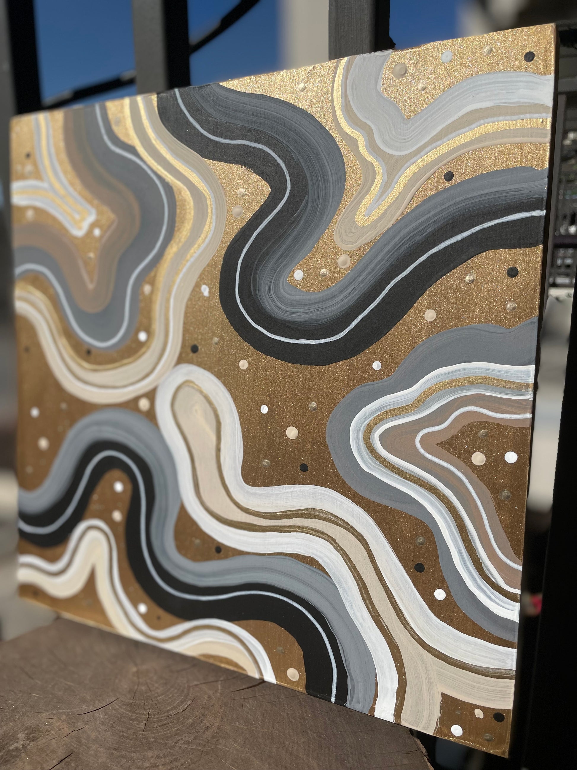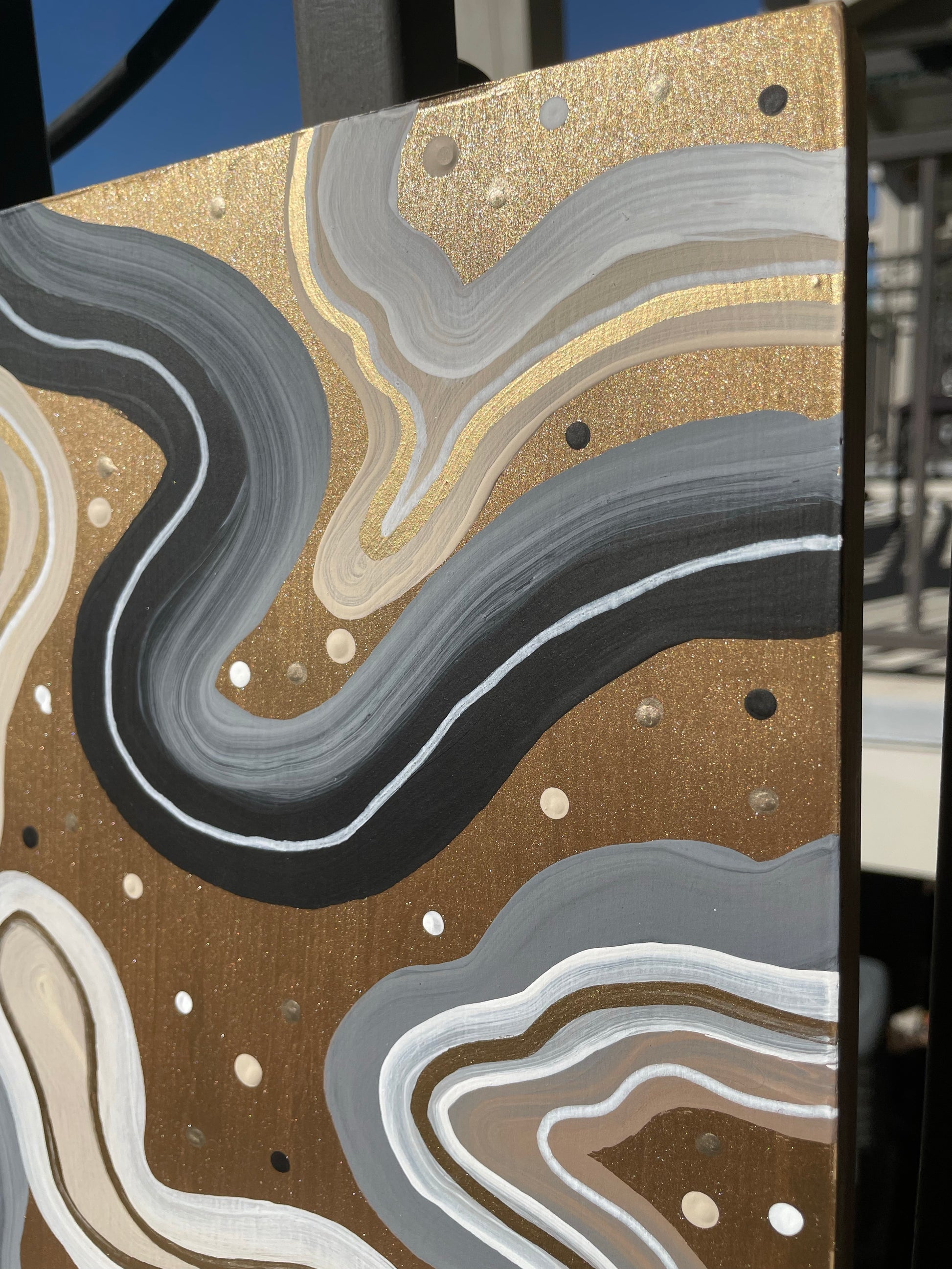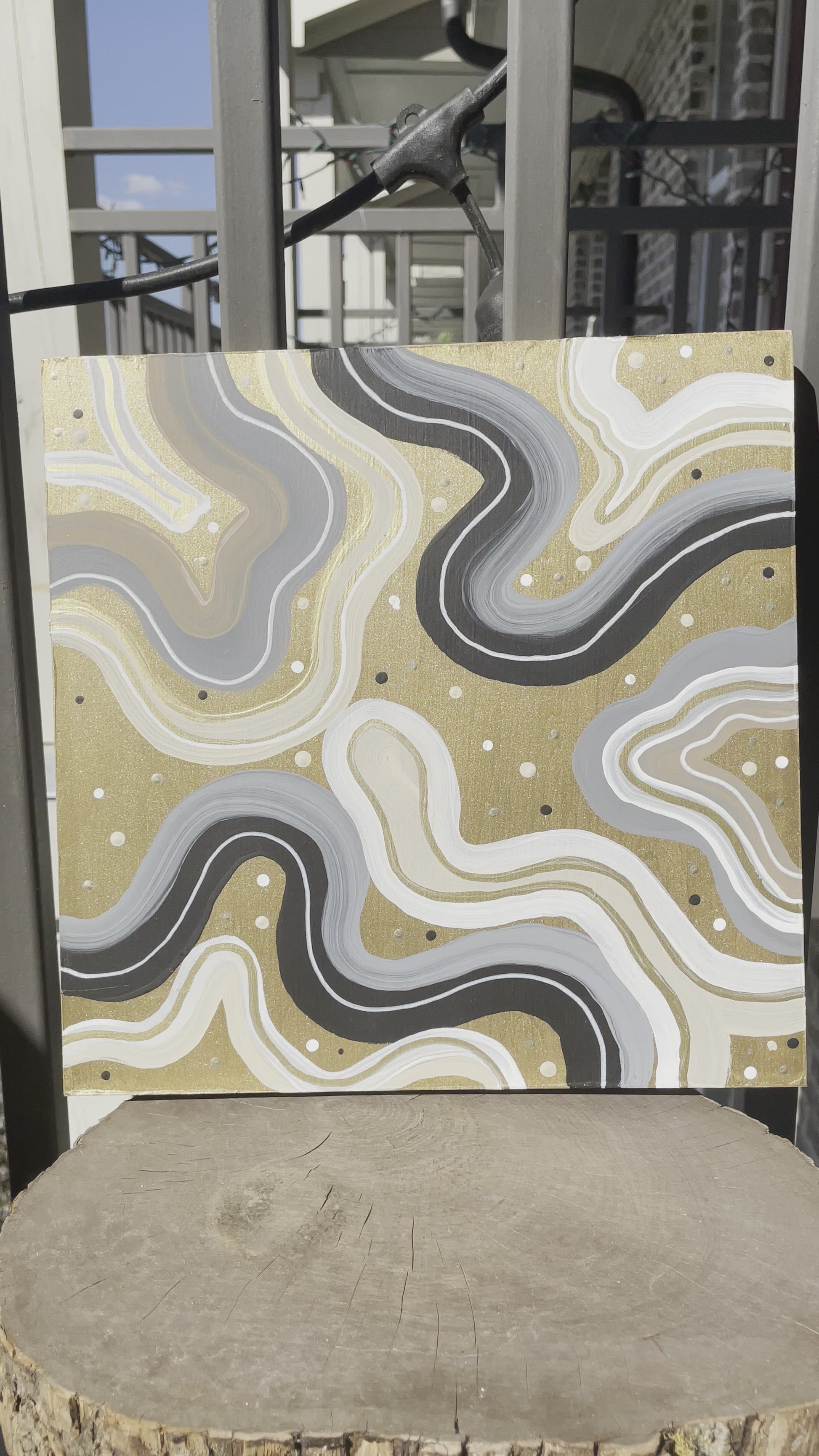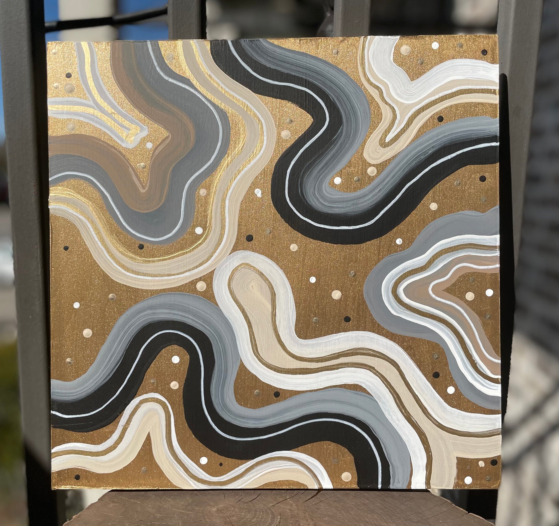 This is a 12x12 abstract wall art piece made with acrylic paint. The sides of this piece are painted gold. The vision for this piece just came to my mind as I was moving the brush along the canvas, my favorite way to work, intuitively.