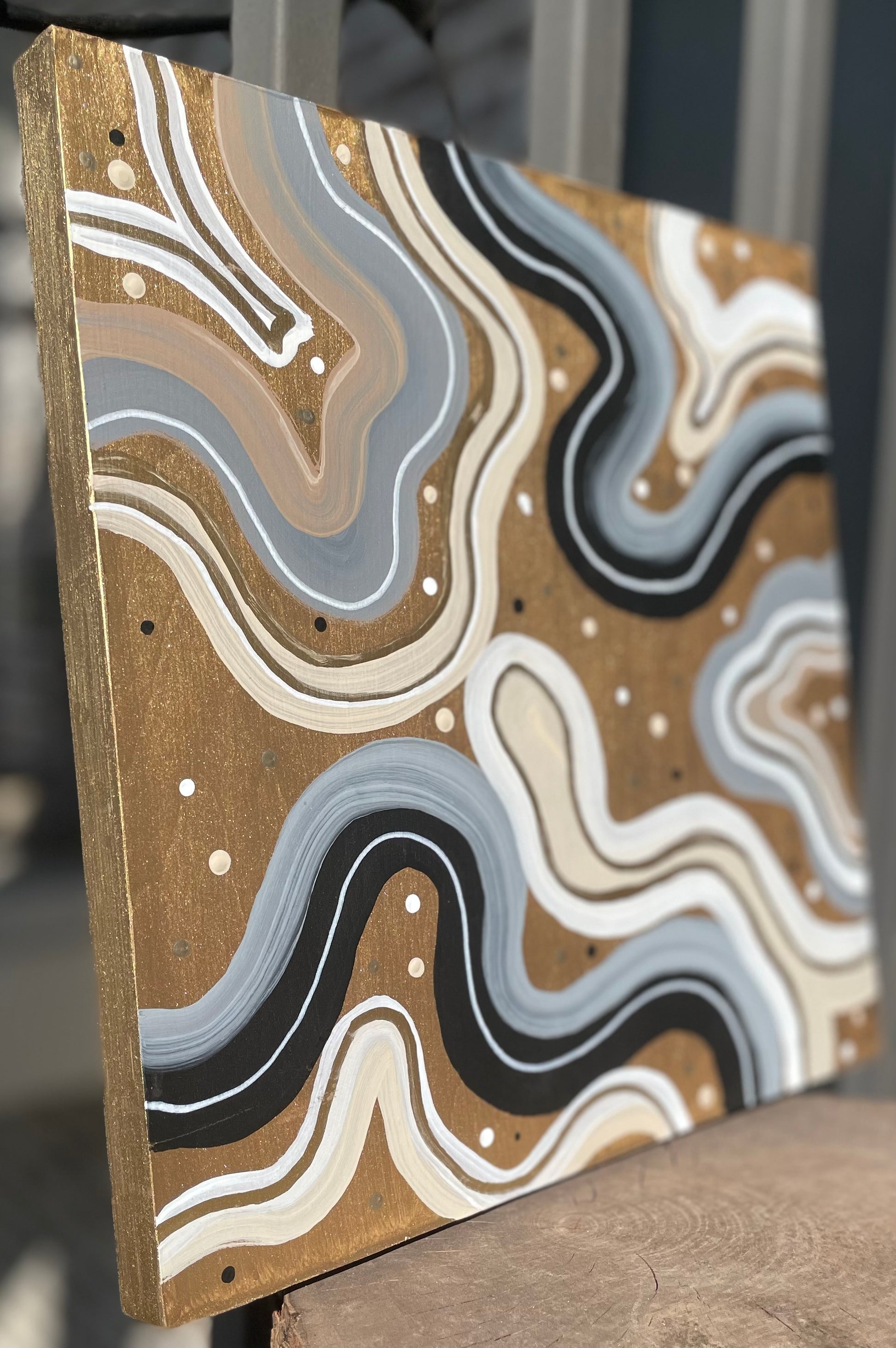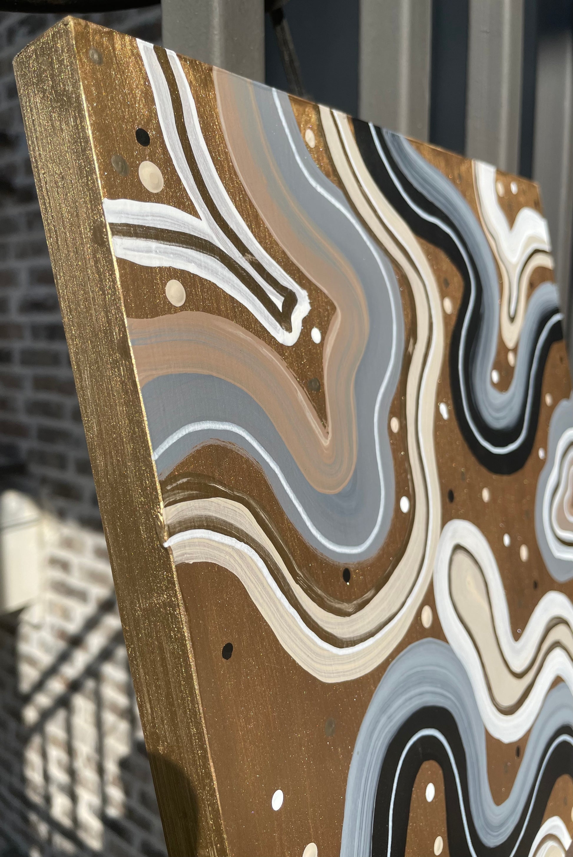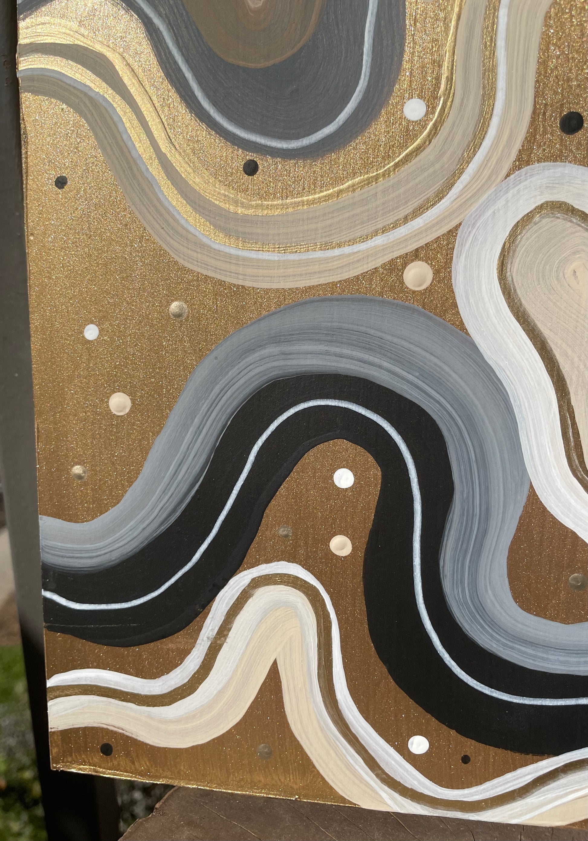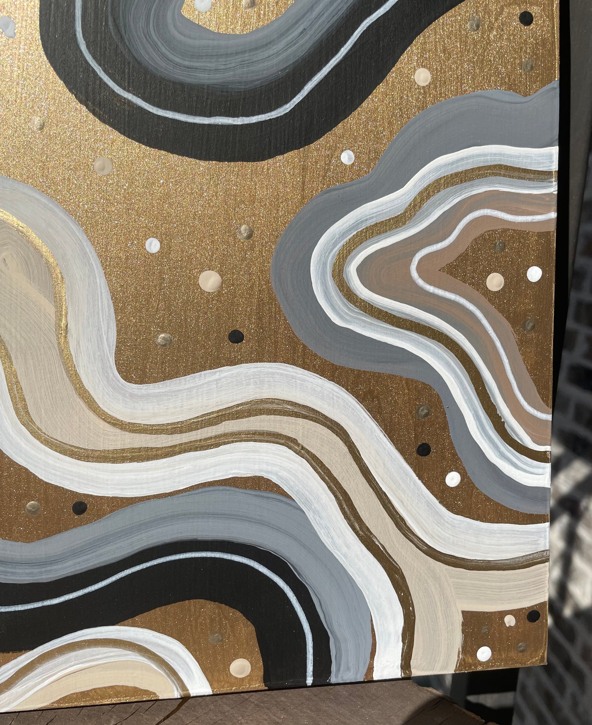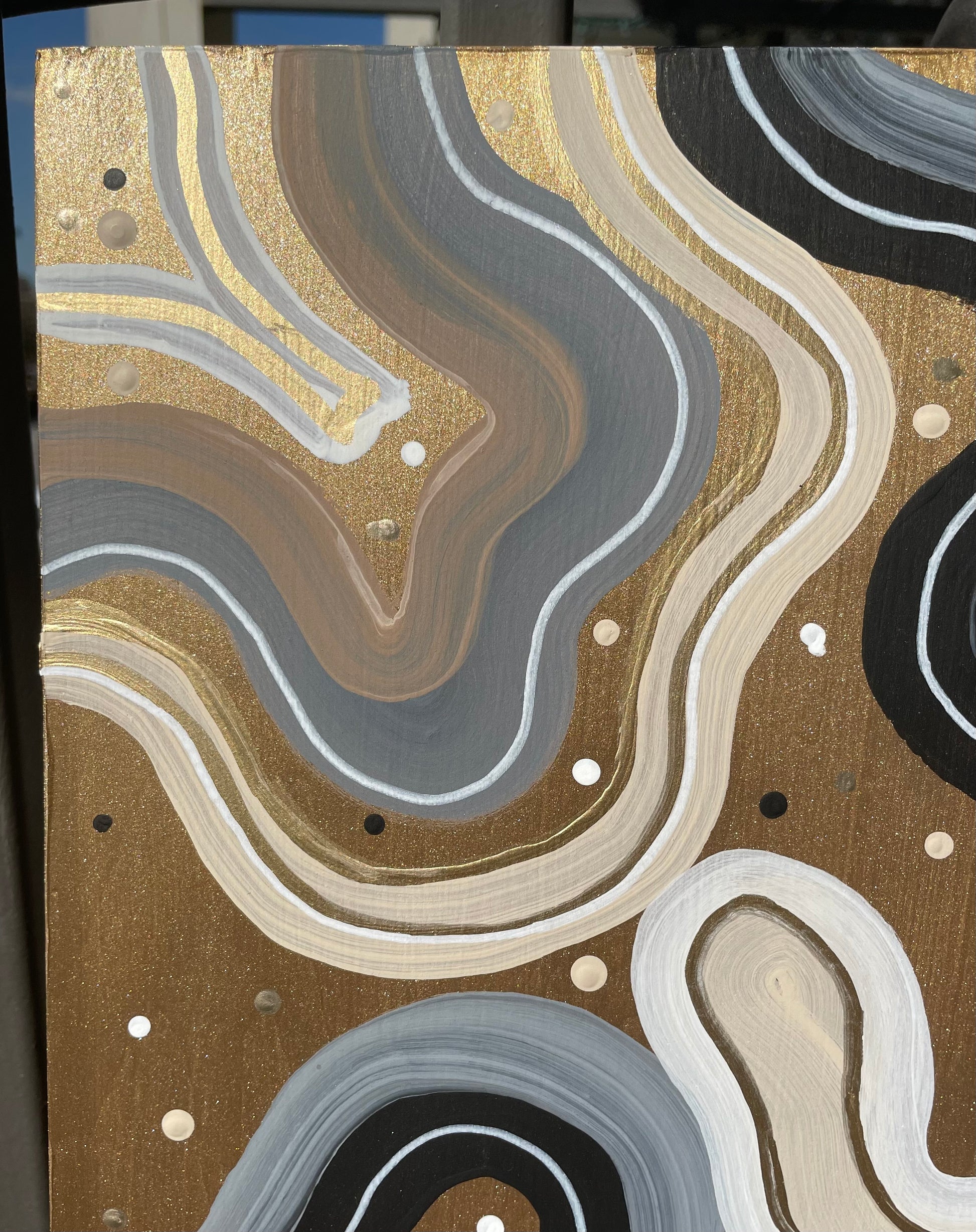 This is a 12x12 abstract wall art piece made with acrylic paint. The sides of this piece are painted gold. The vision for this piece just came to my mind as I was moving the brush along the canvas, my favorite way to work, intuitively.