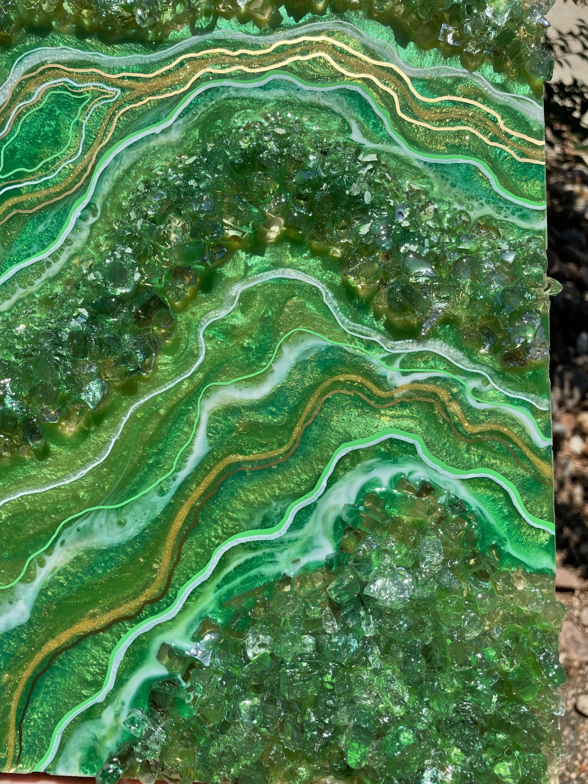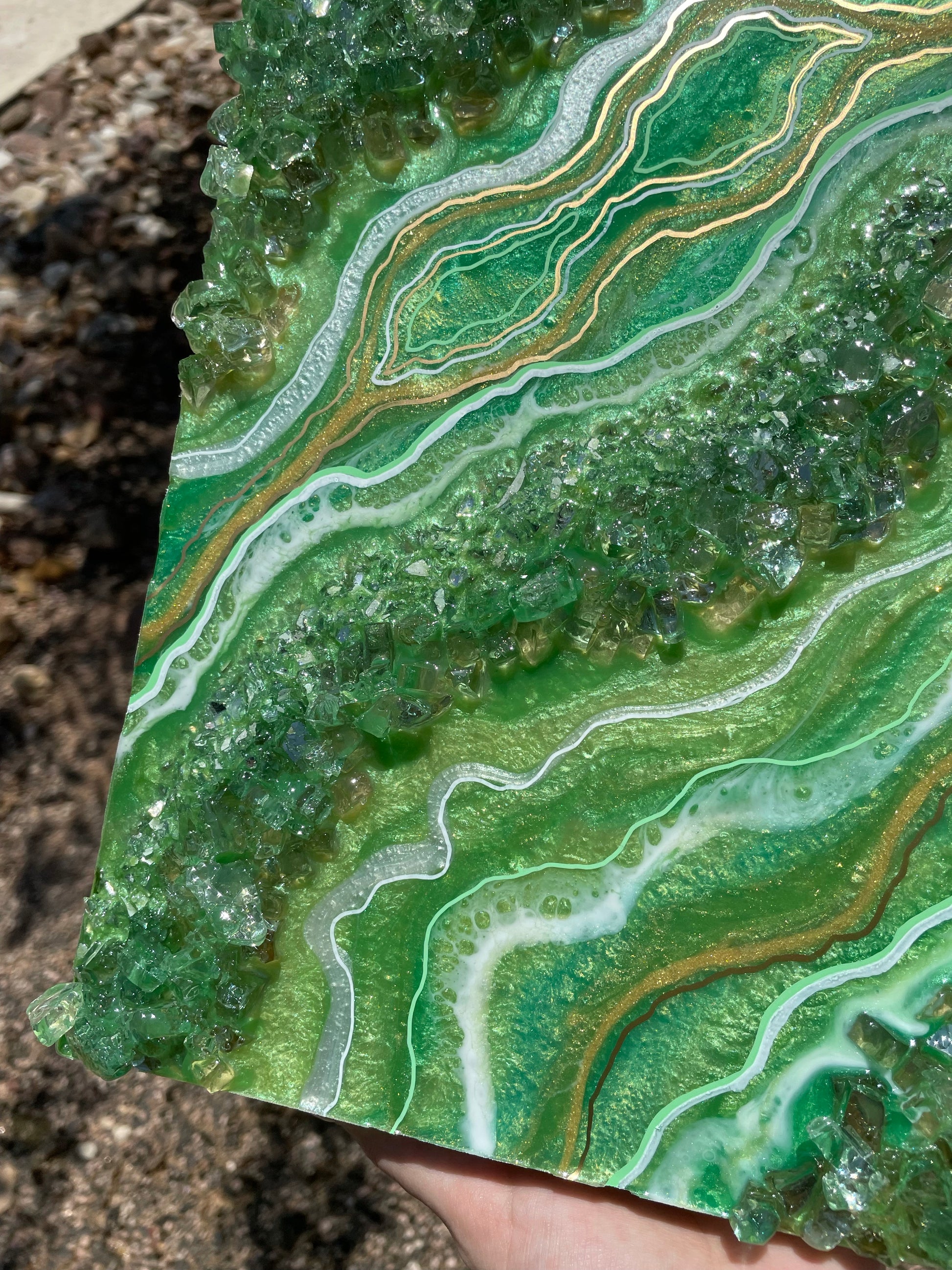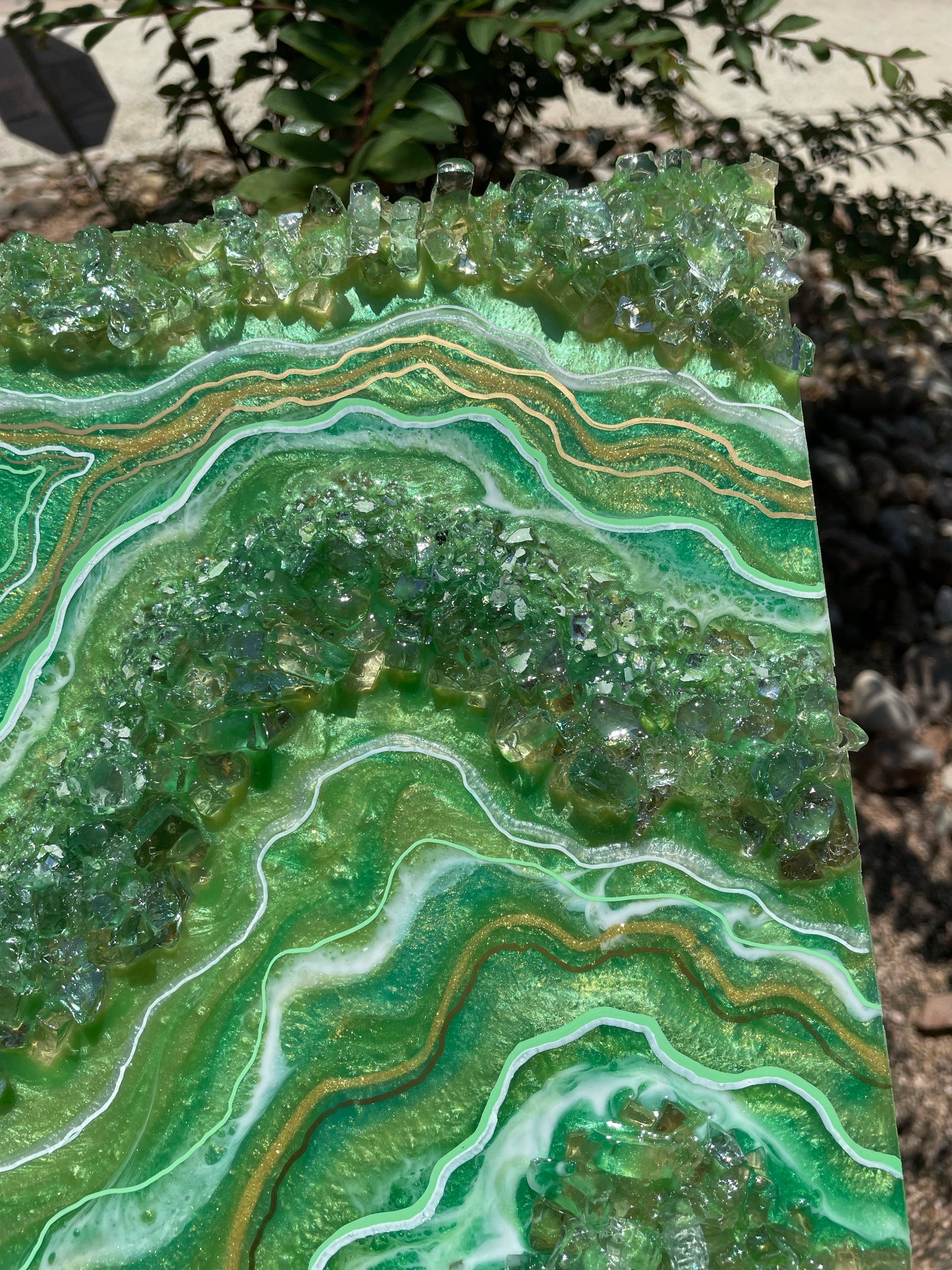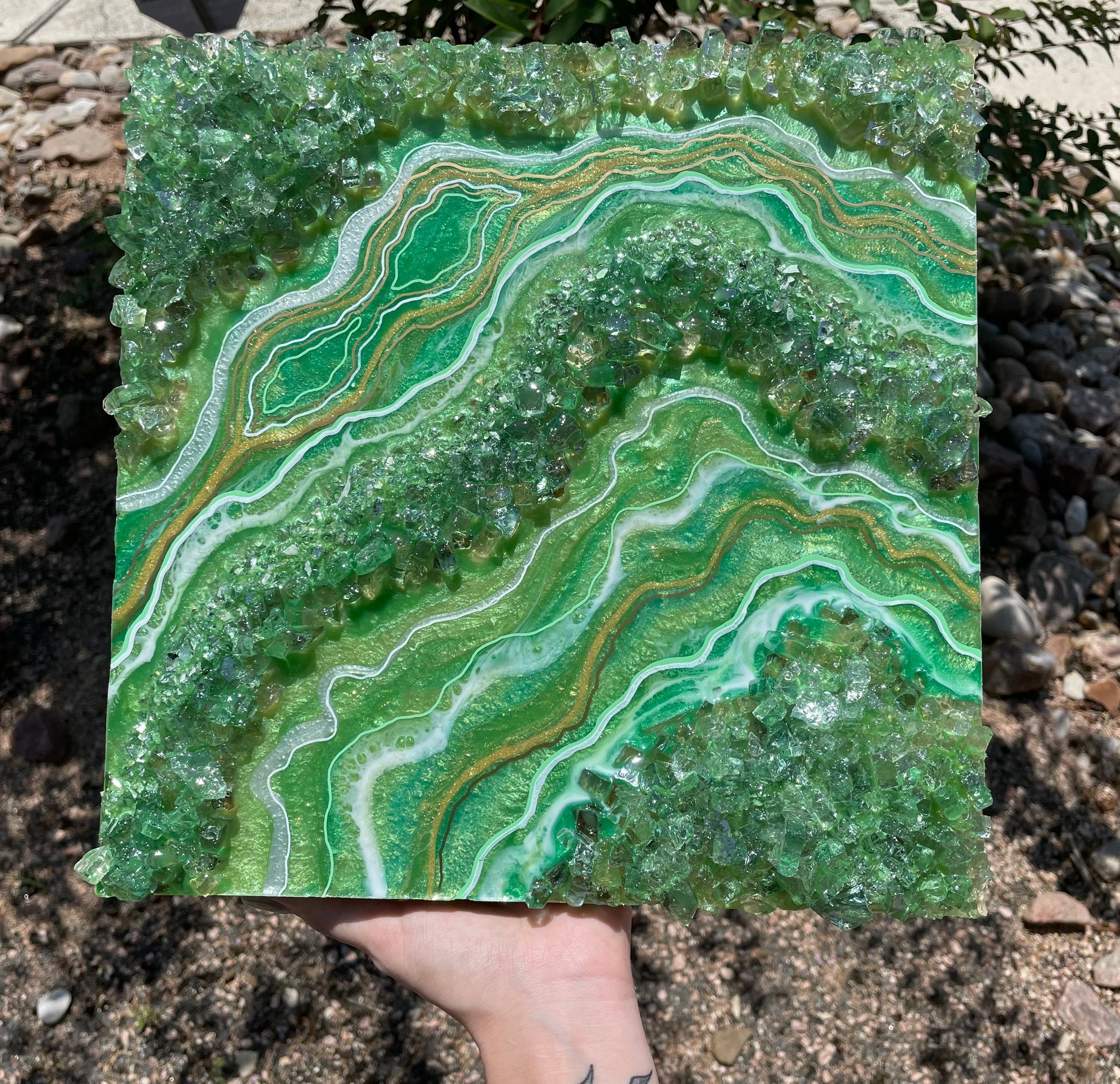 12x12 resin geode with 1/2” sides to be able to hang with push pins. This geode is made of shades of green, gold & white to resemble an agate geode slice