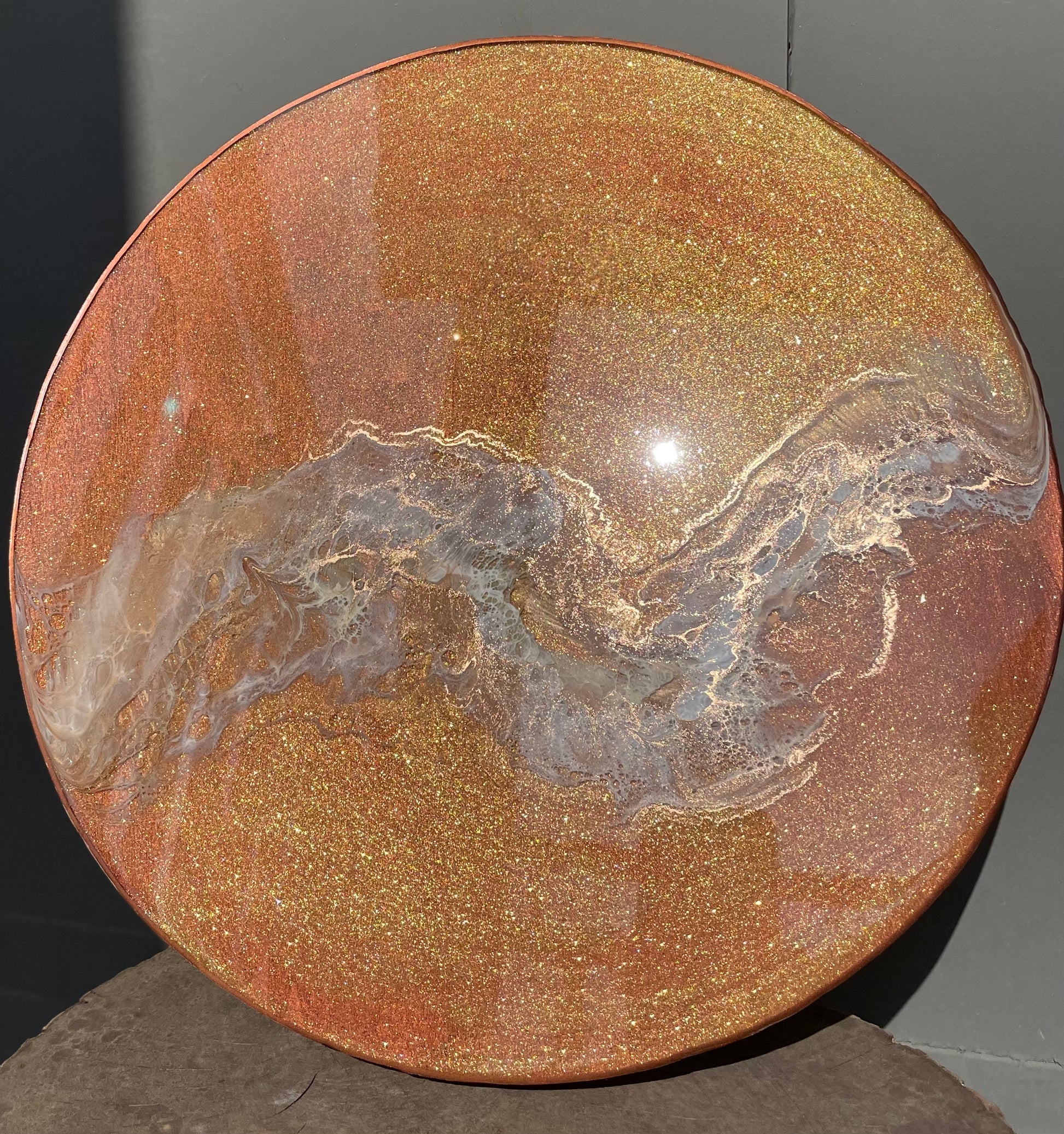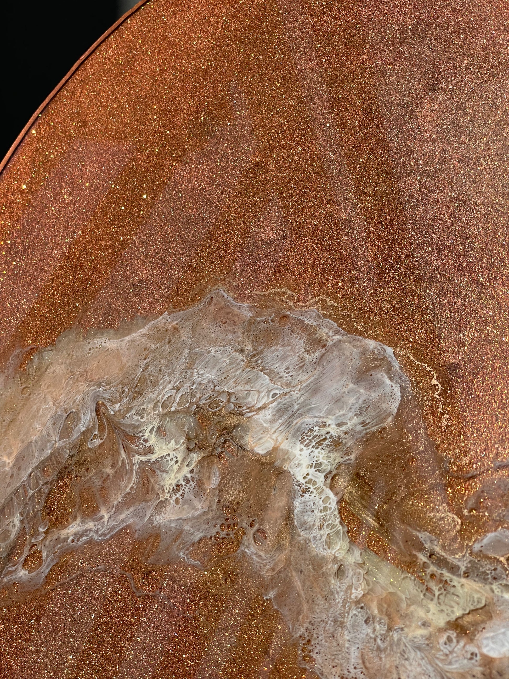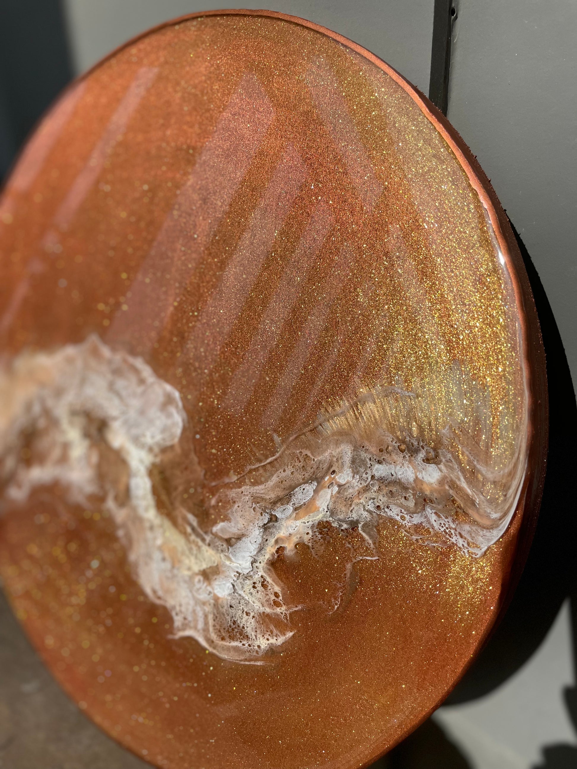 13” round resin abstract wall art. This piece has a painted background that is a coral/bronze color, with gold sparkle pigment and a wispy layer of creme, metallic gold, and white. The sides of this piece are painted bronze with an additional bronze rim.