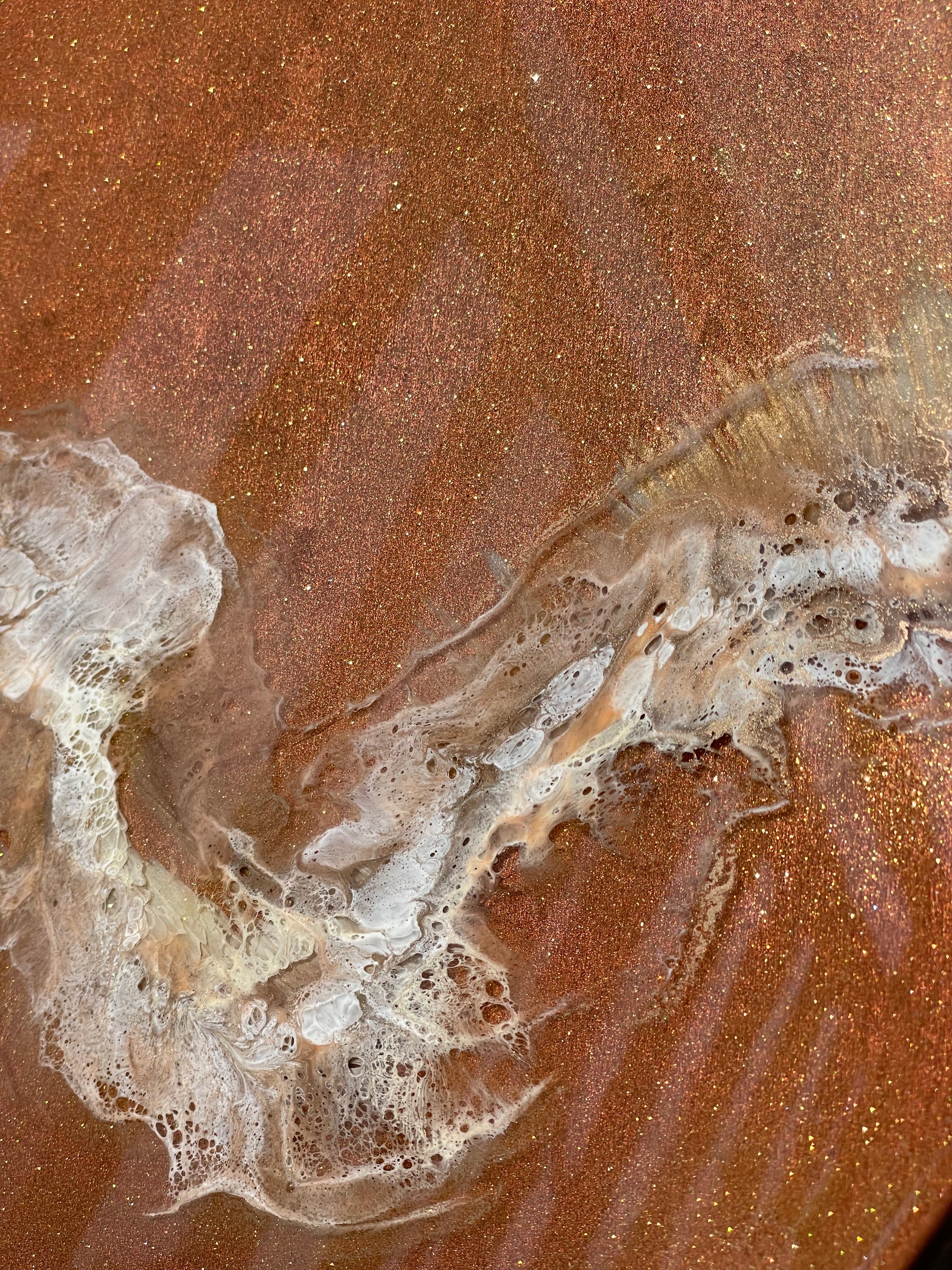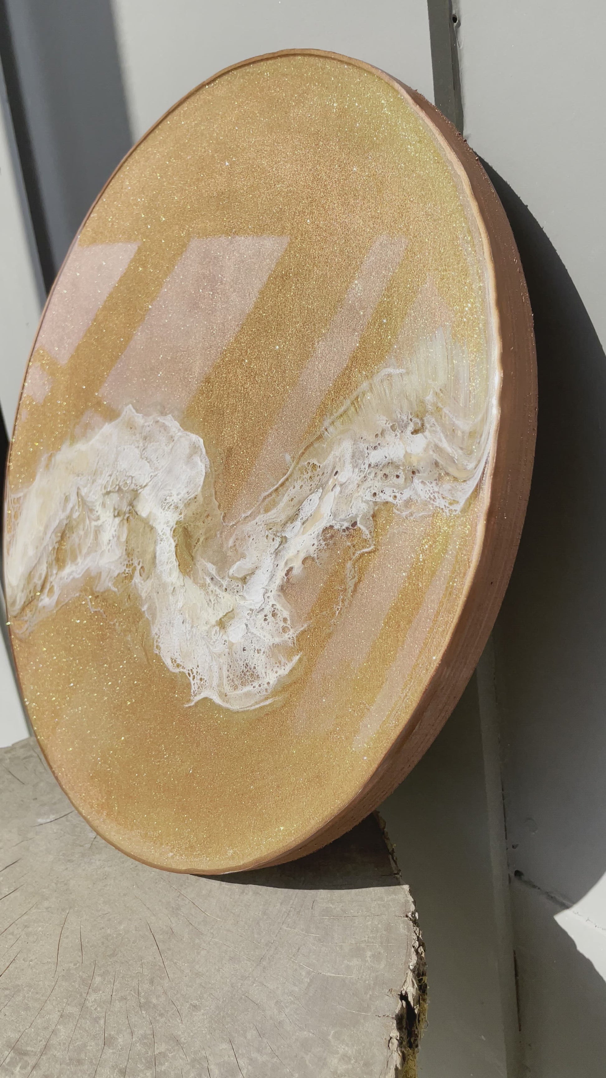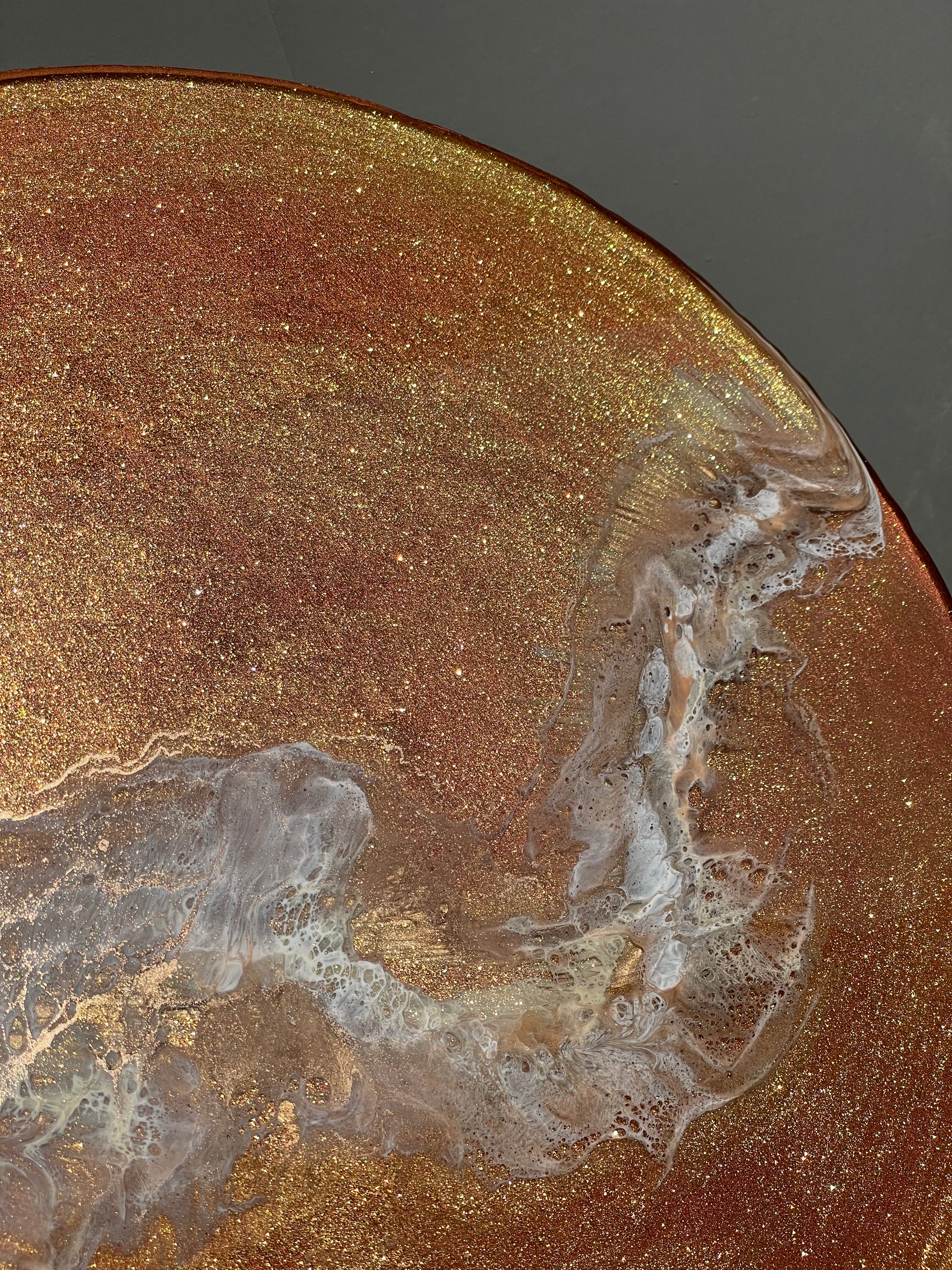 13” round resin abstract wall art. This piece has a painted background that is a coral/bronze color, with gold sparkle pigment and a wispy layer of creme, metallic gold, and white. The sides of this piece are painted bronze with an additional bronze rim.