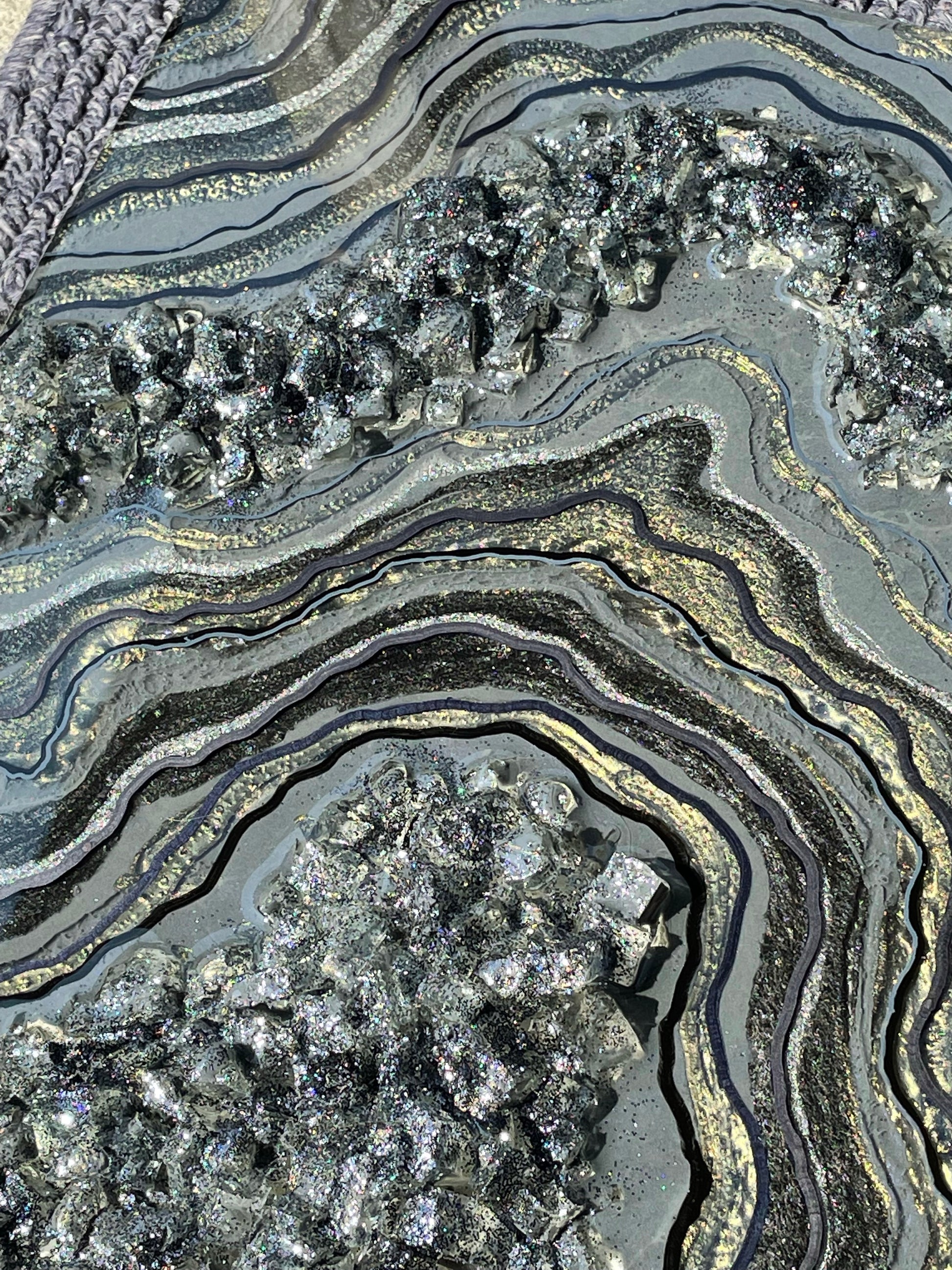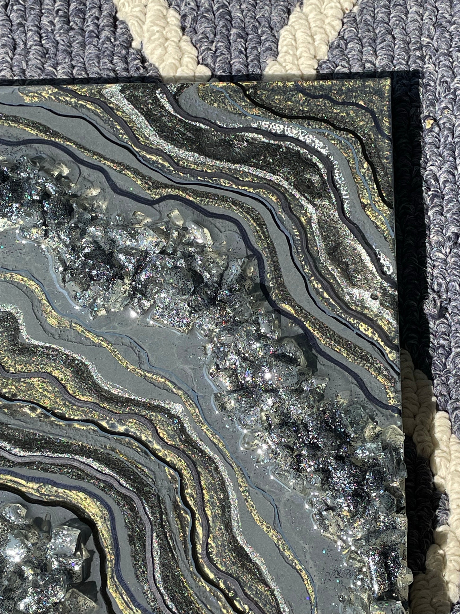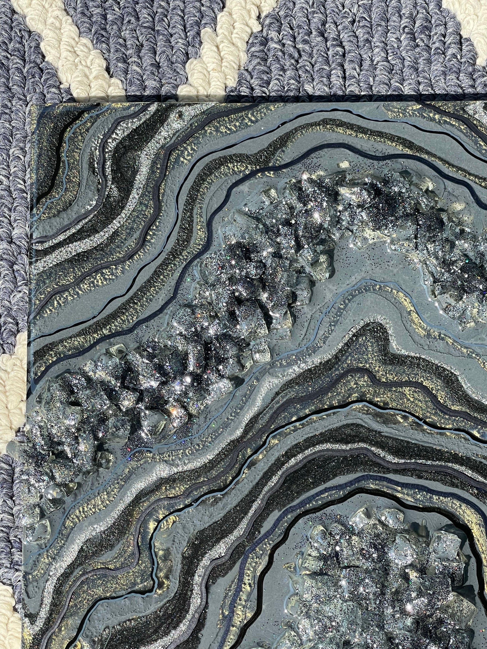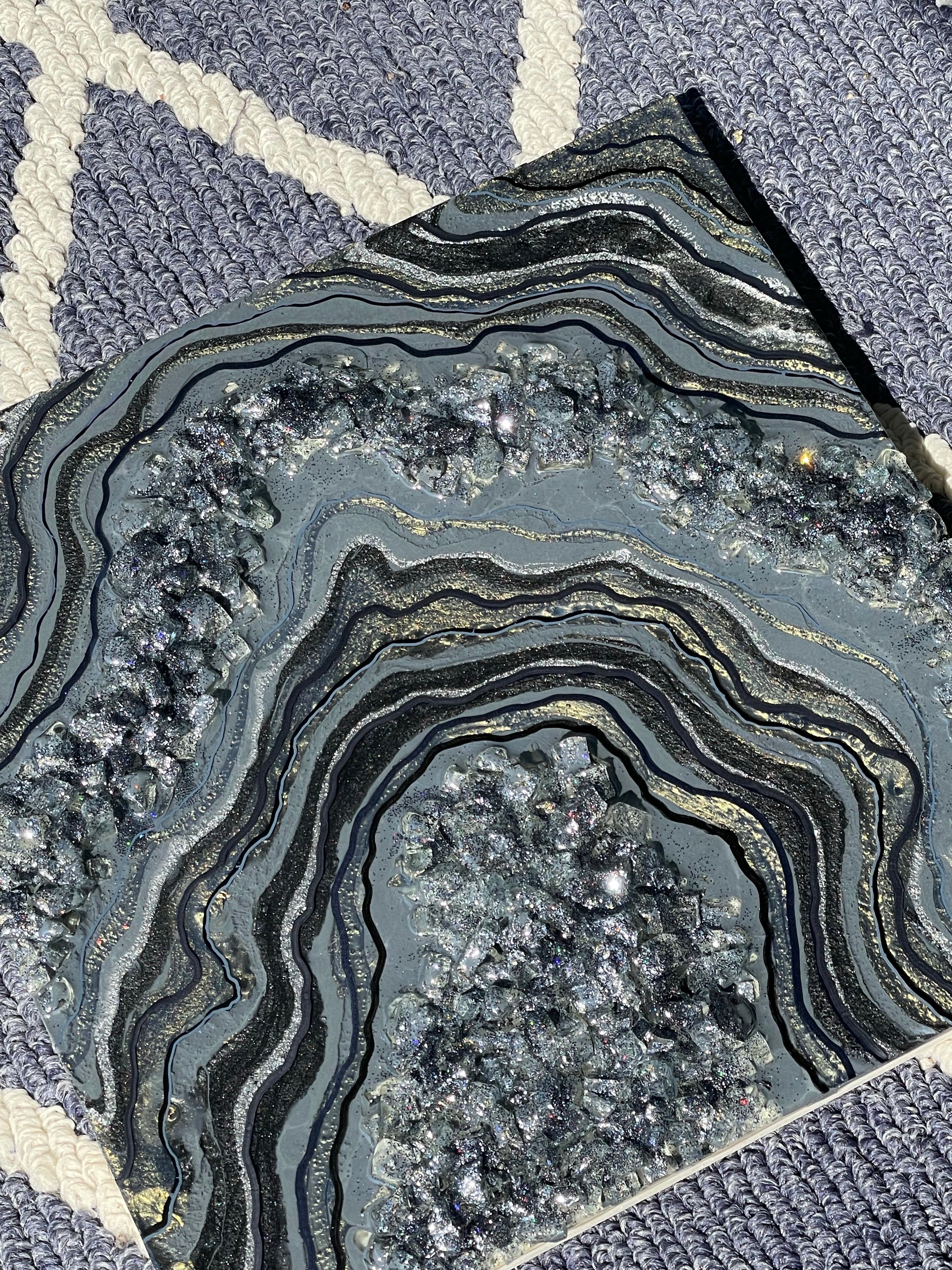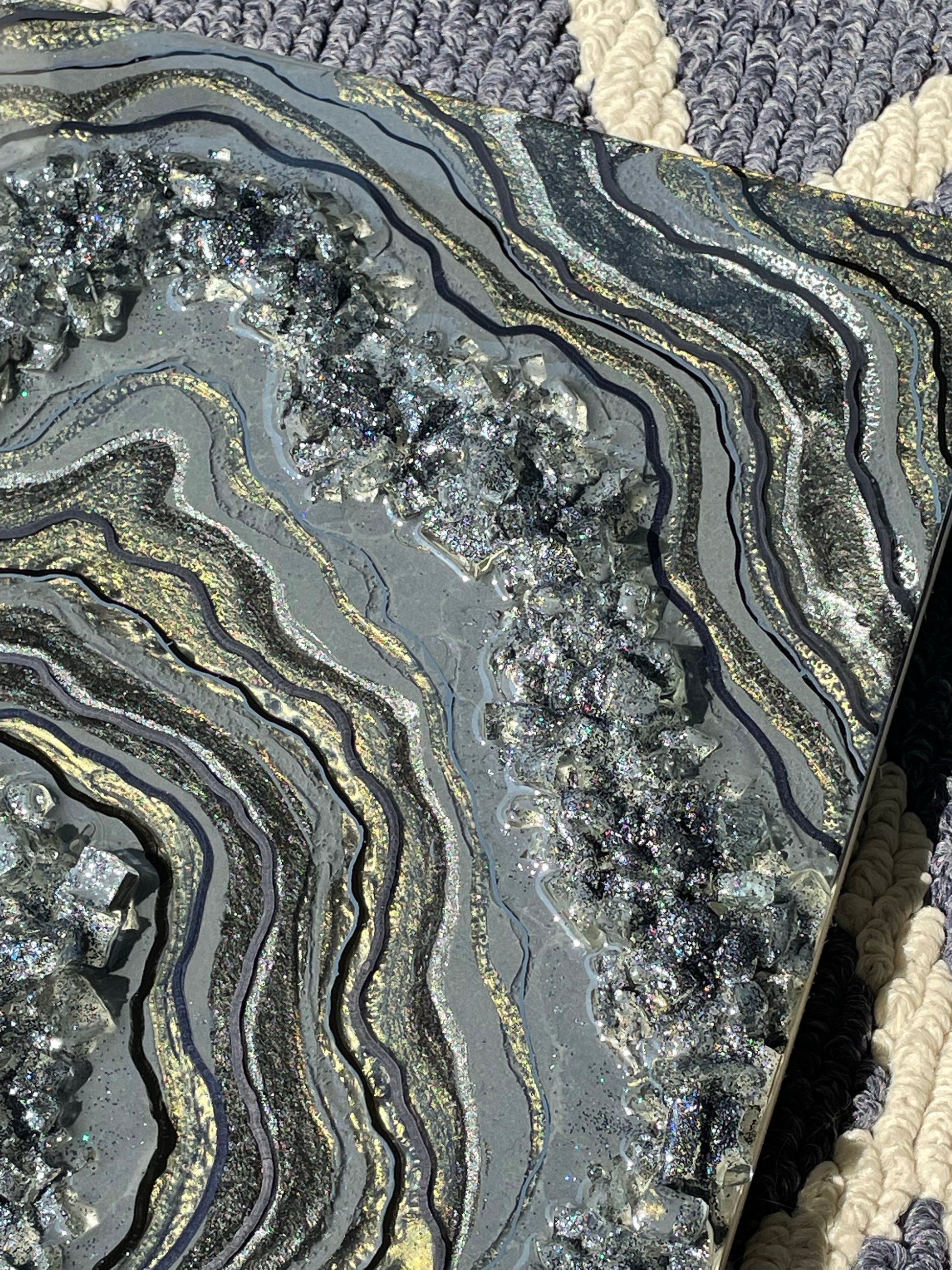 This geode recreation is inspired by the color graphite. This piece is made with resin, pigments, fine line details & glitter.
