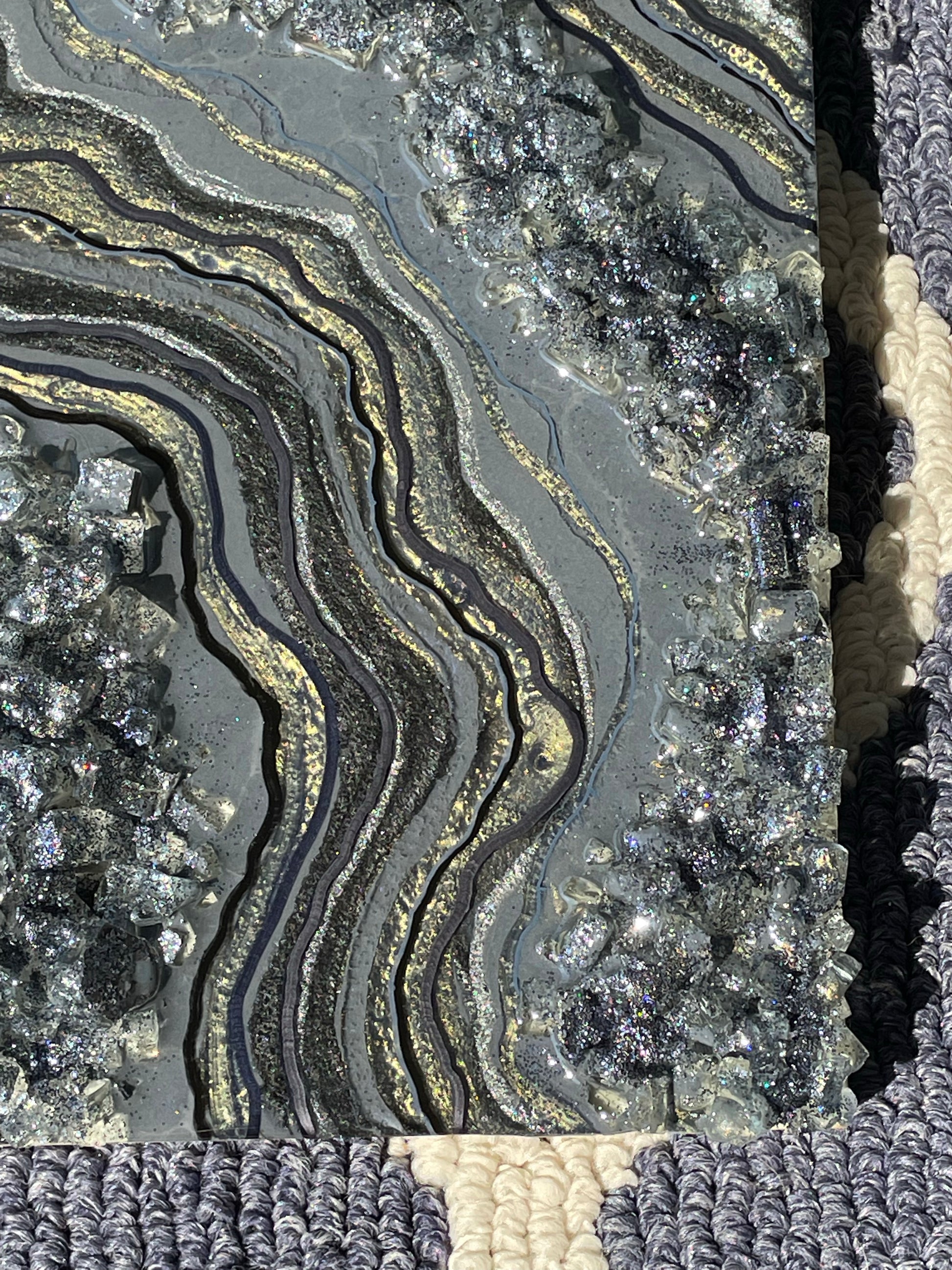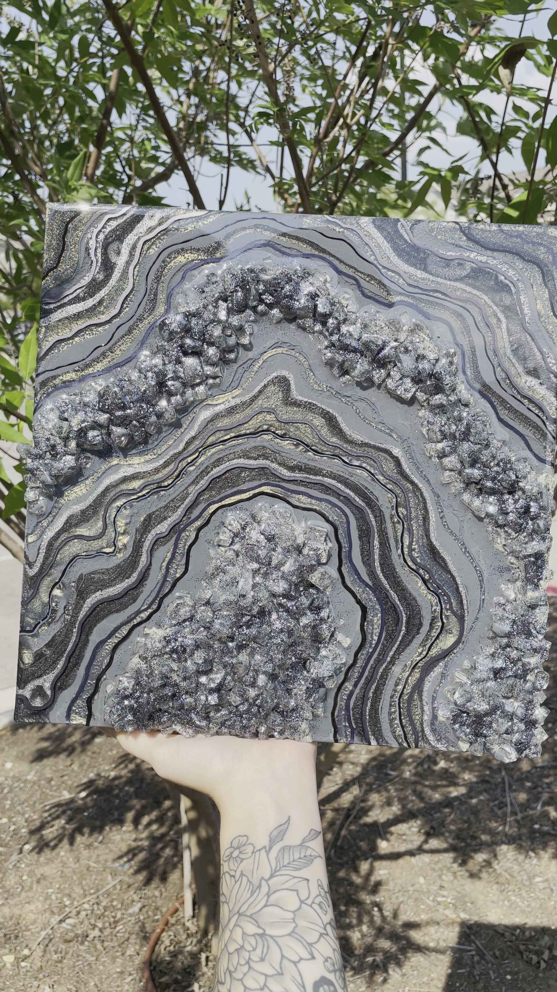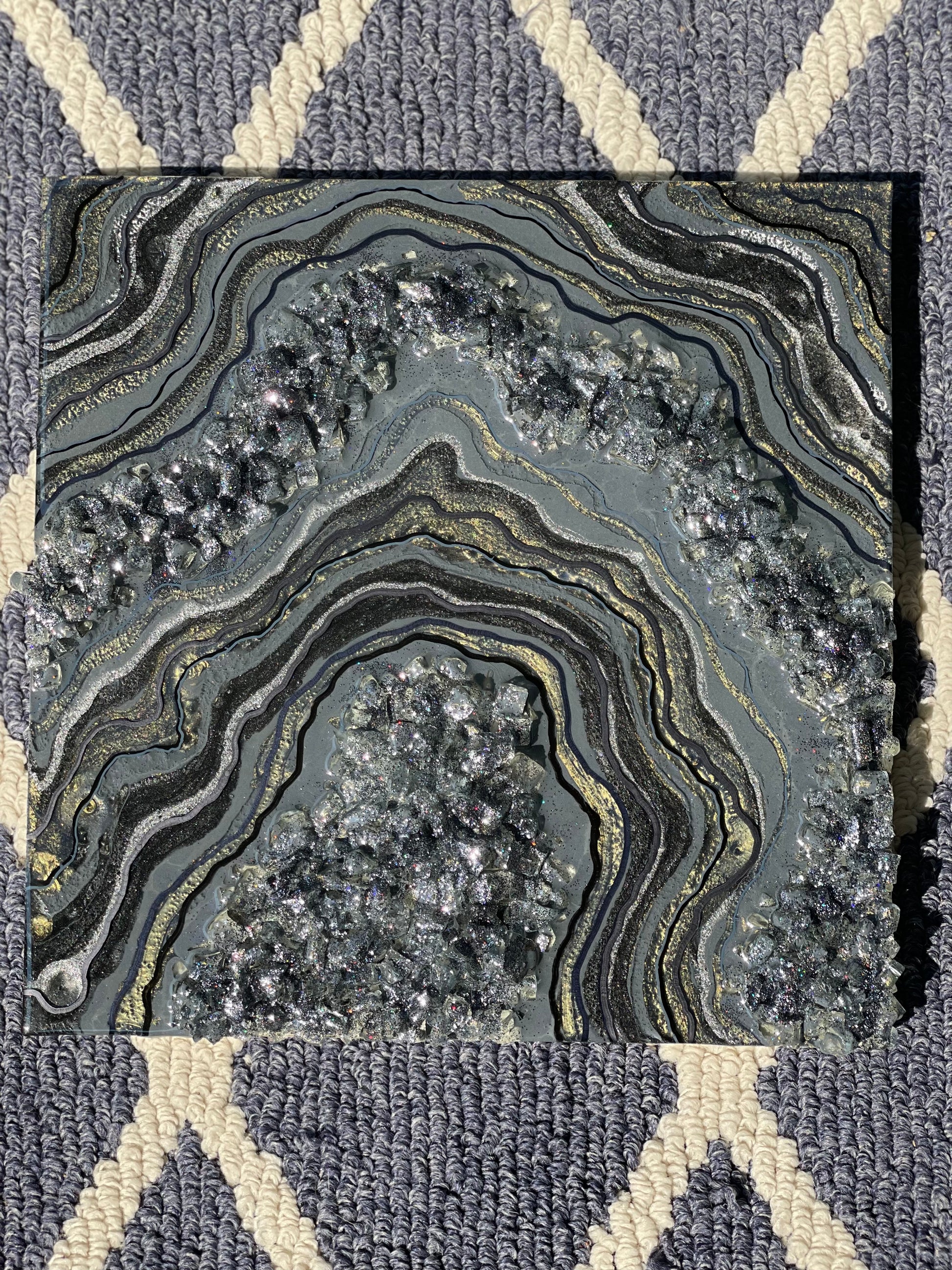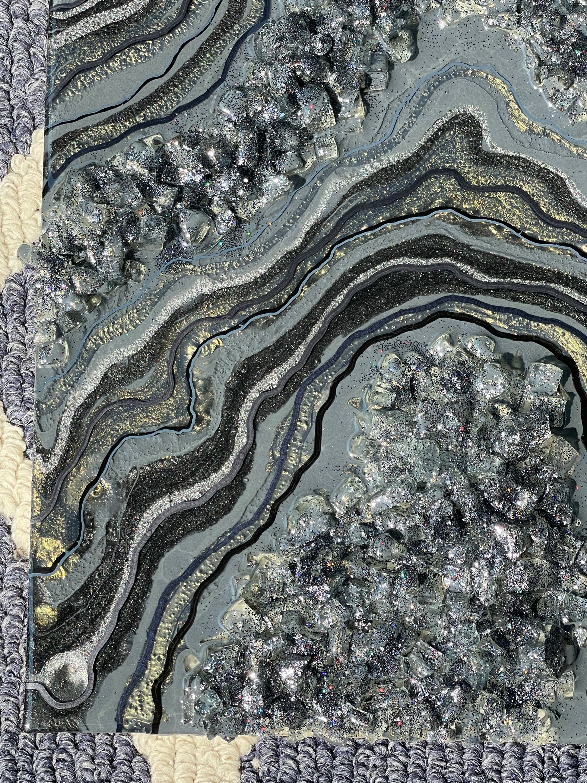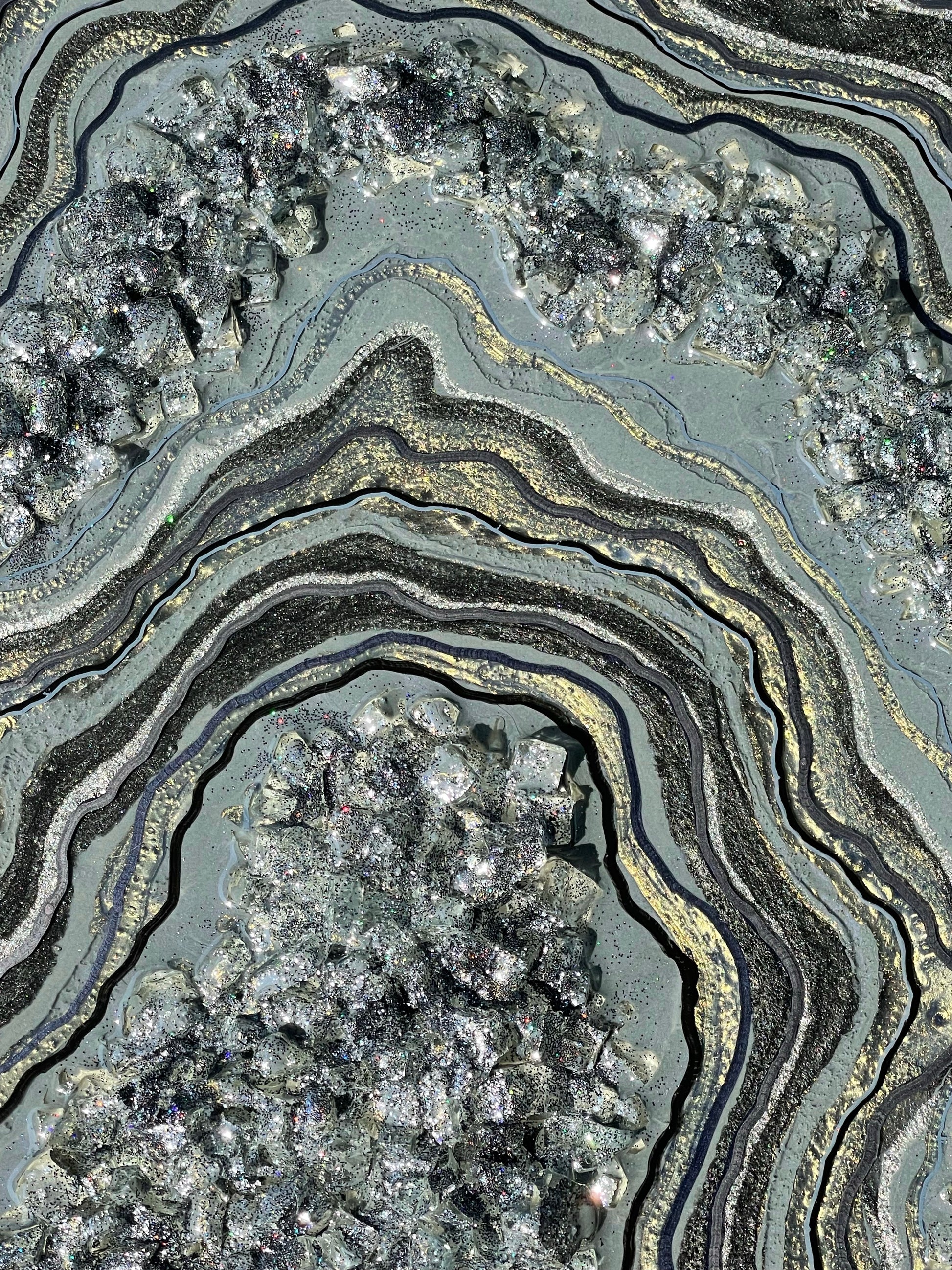 This geode recreation is inspired by the color graphite. This piece is made with resin, pigments, fine line details & glitter.