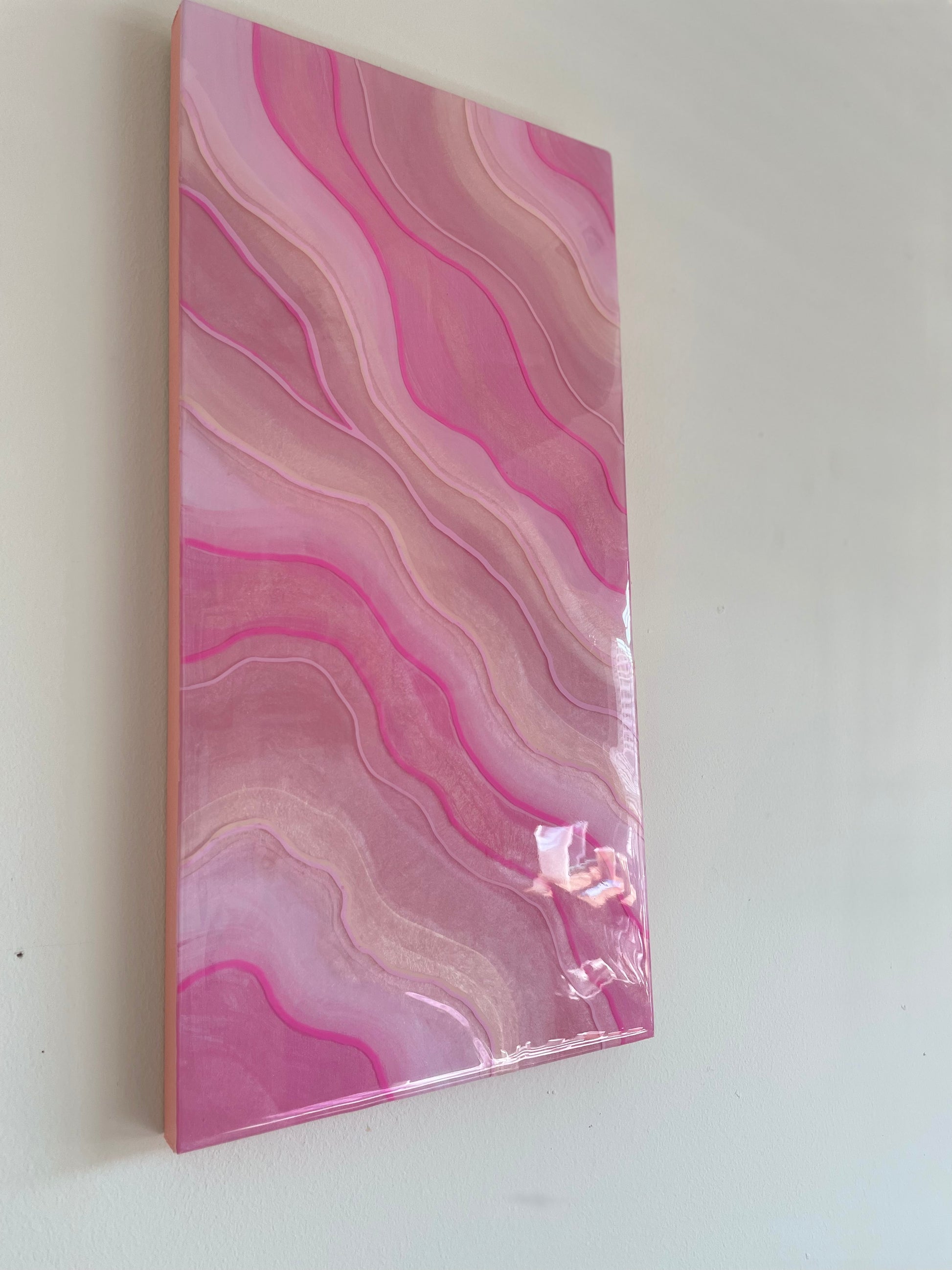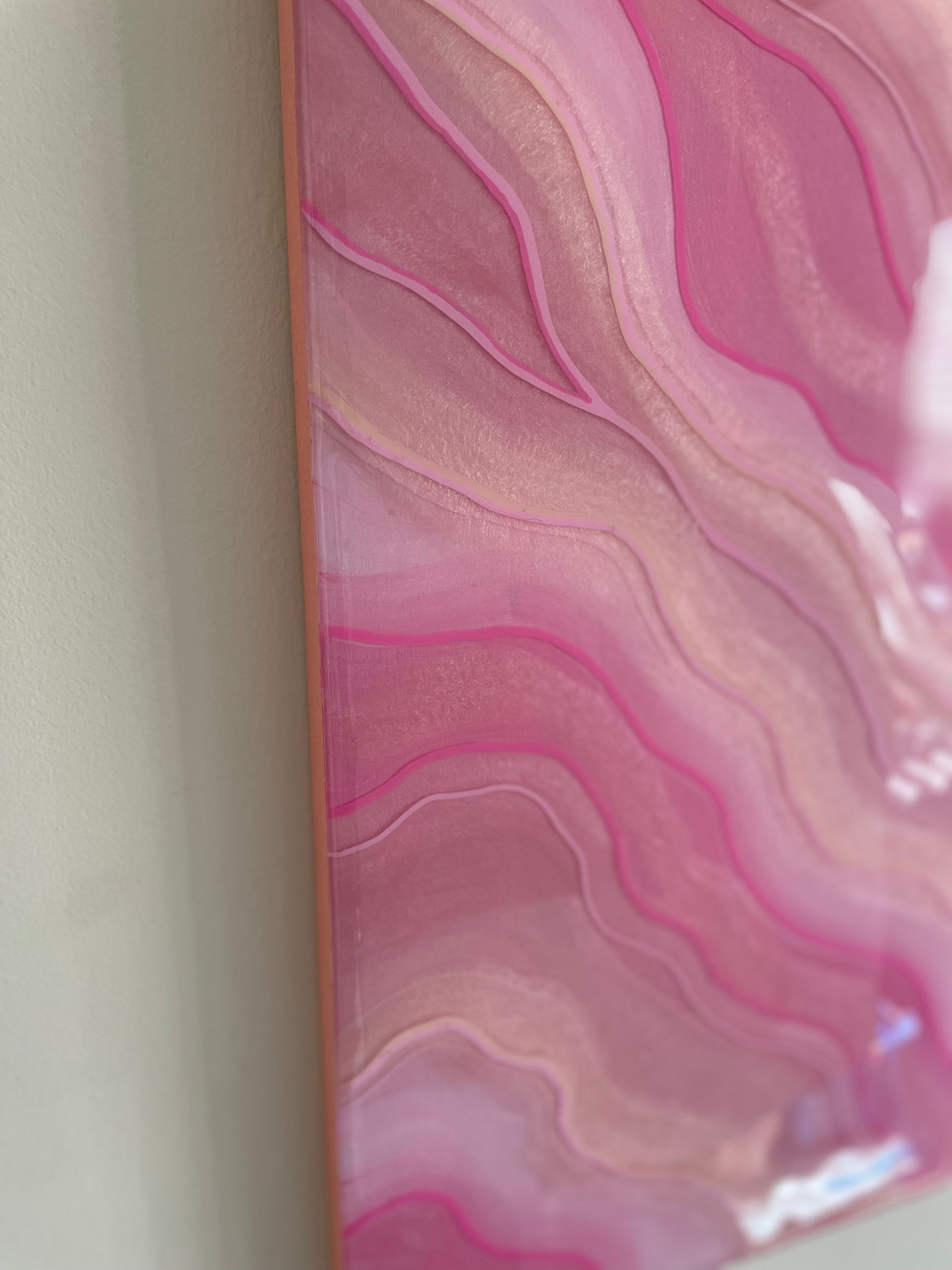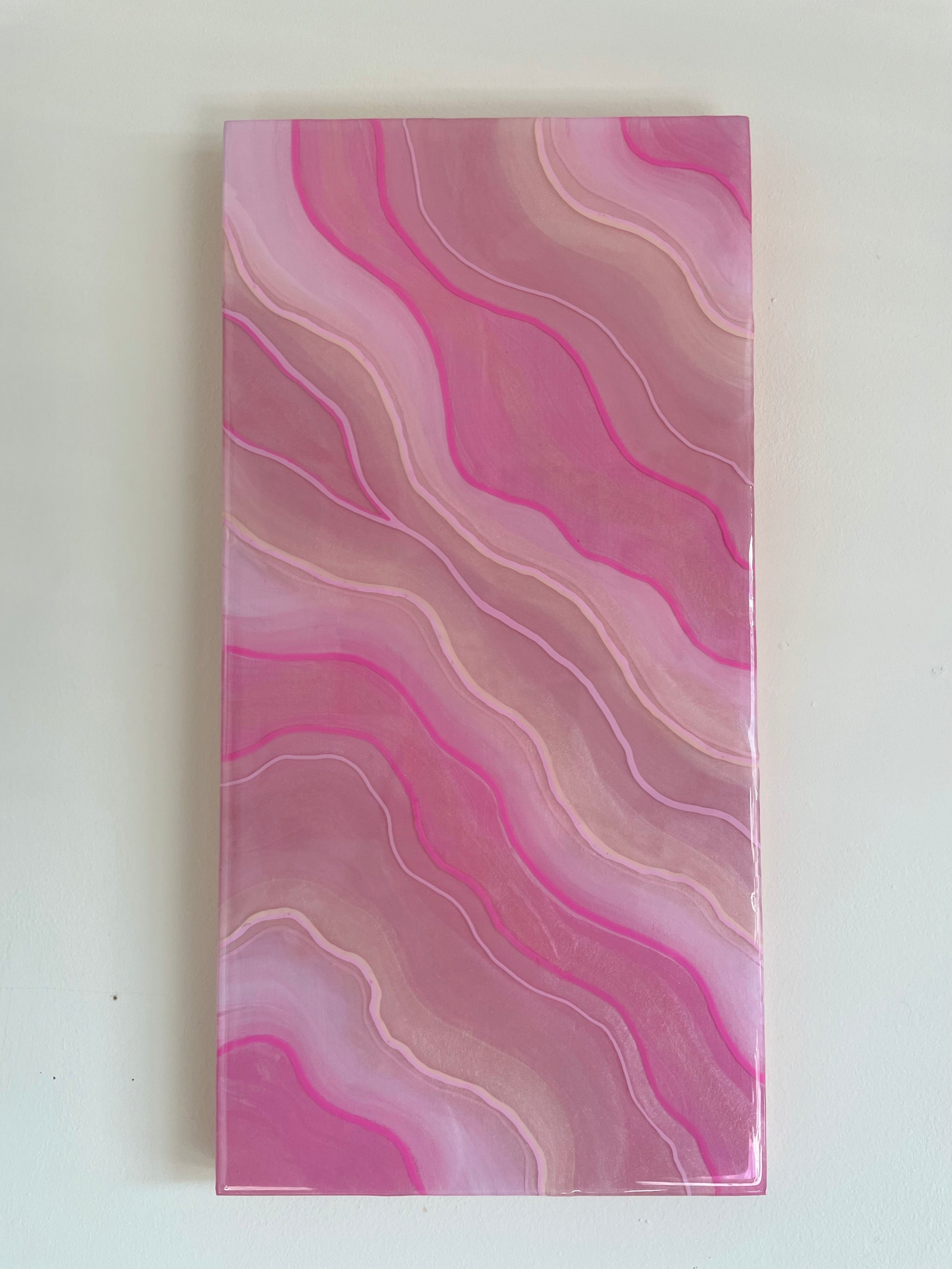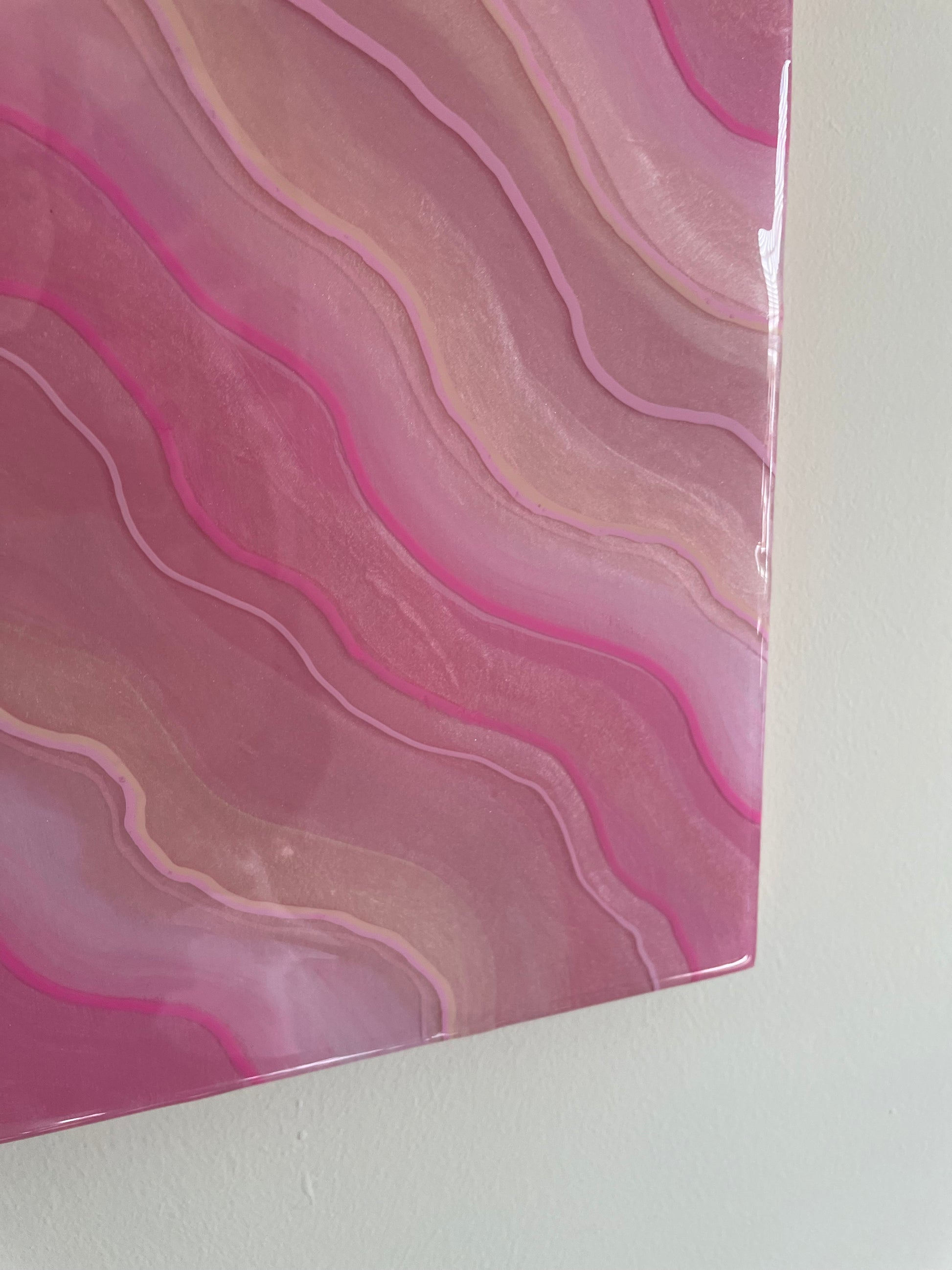 8x16 mixed media; this pink geode slice recreation is made with multiple layers to enhance the amount of depth. You’ll see a painted geode background with pigmented resin on top & fine line details to mimic a geode slice.