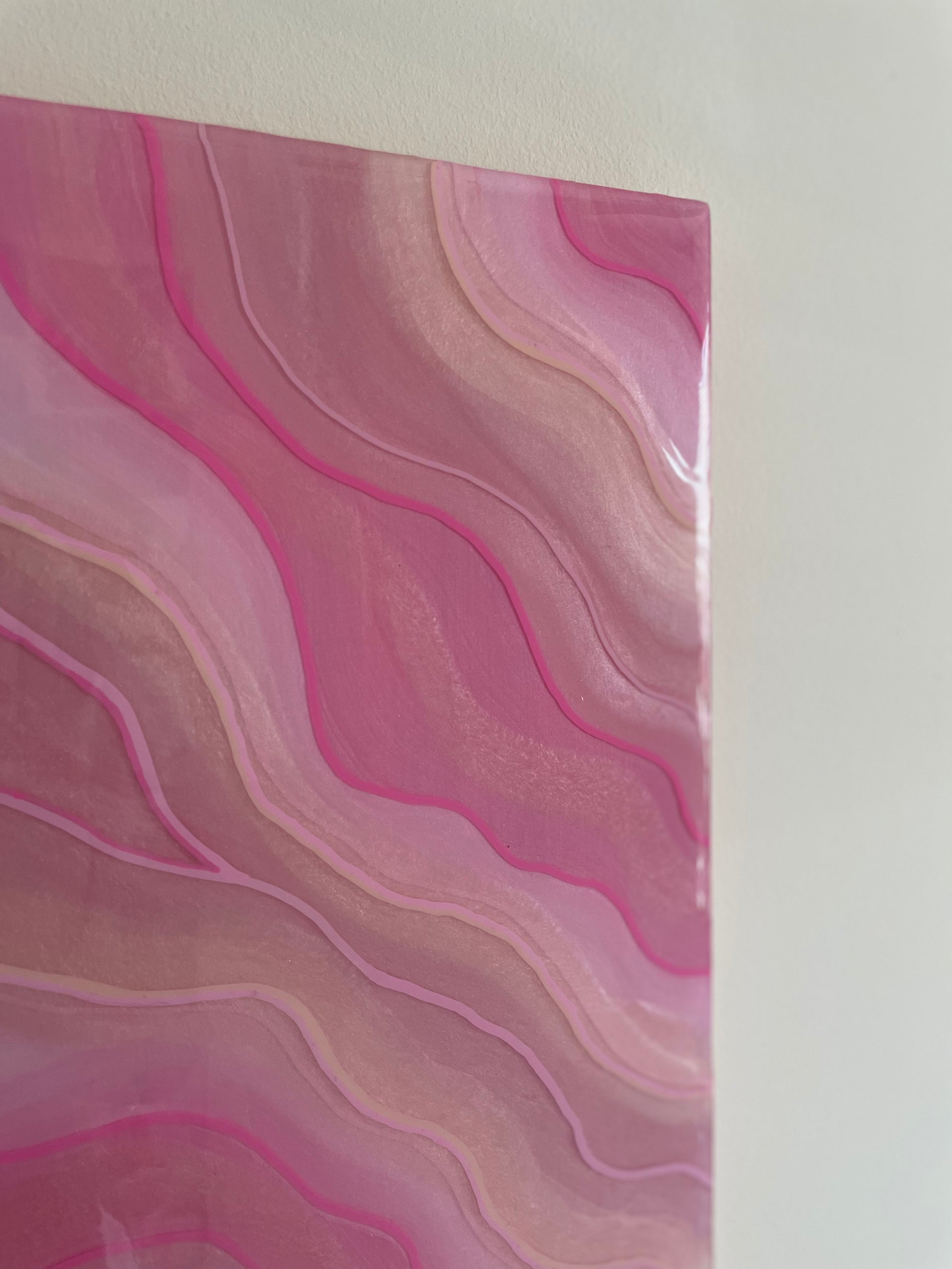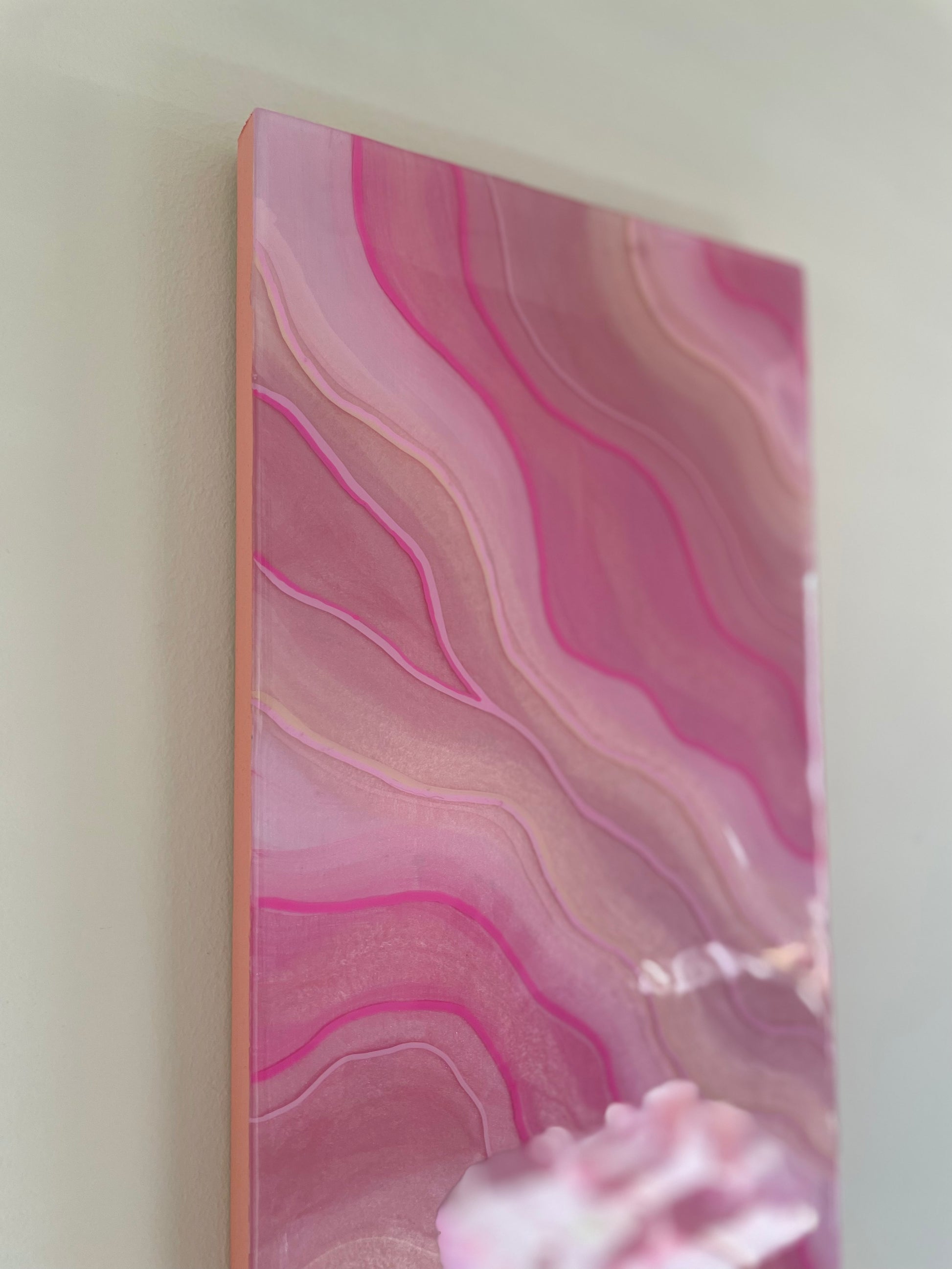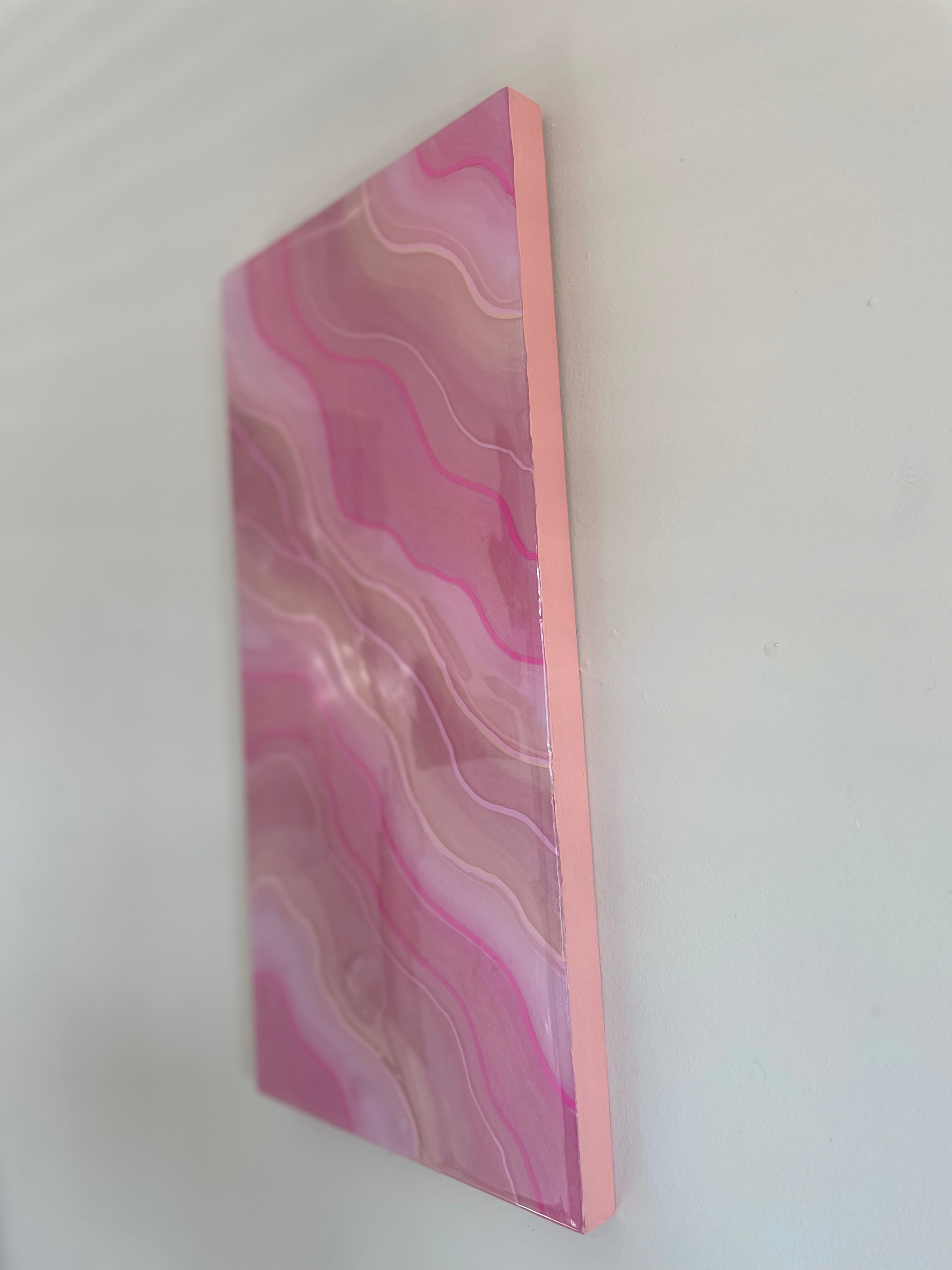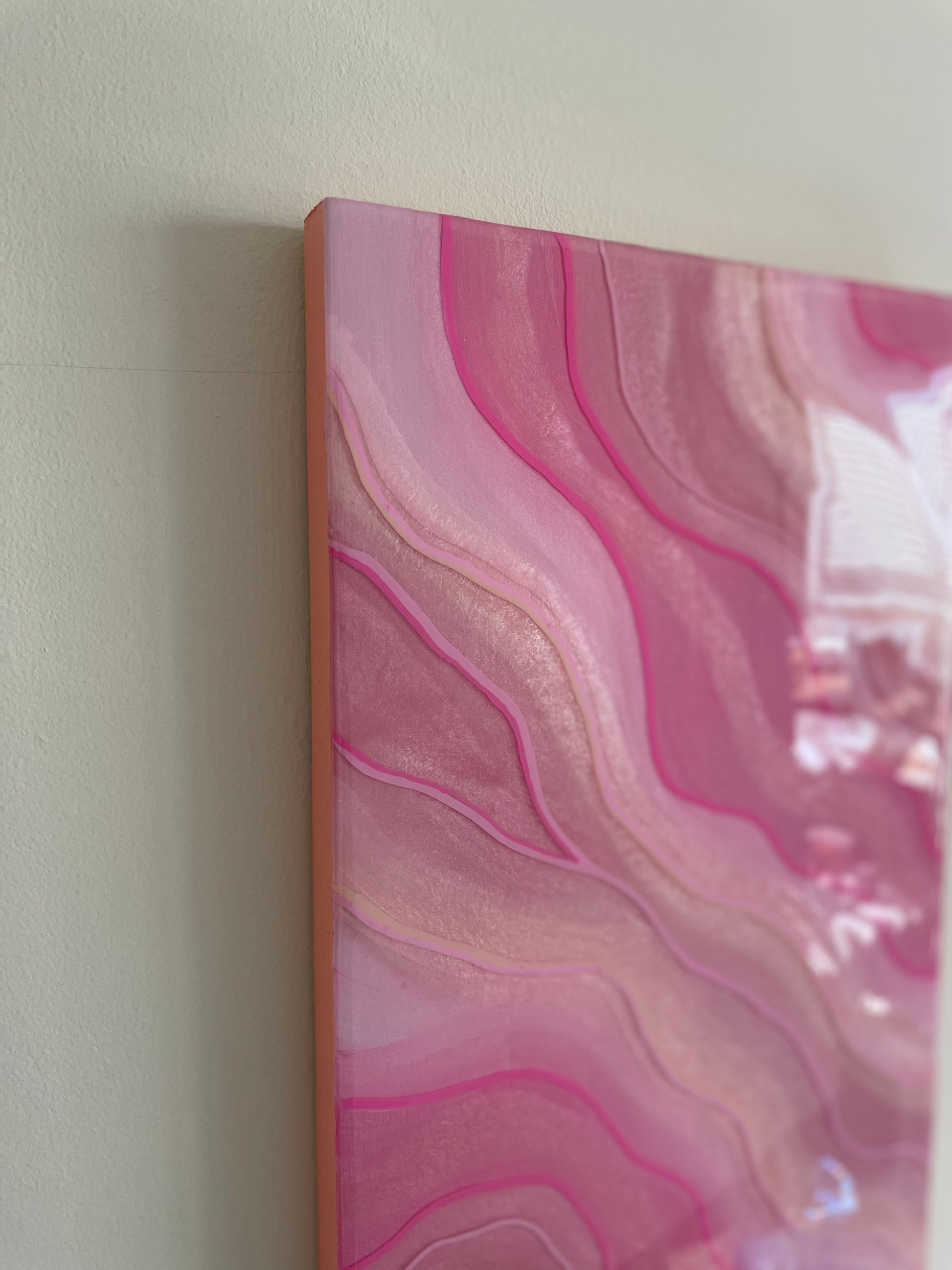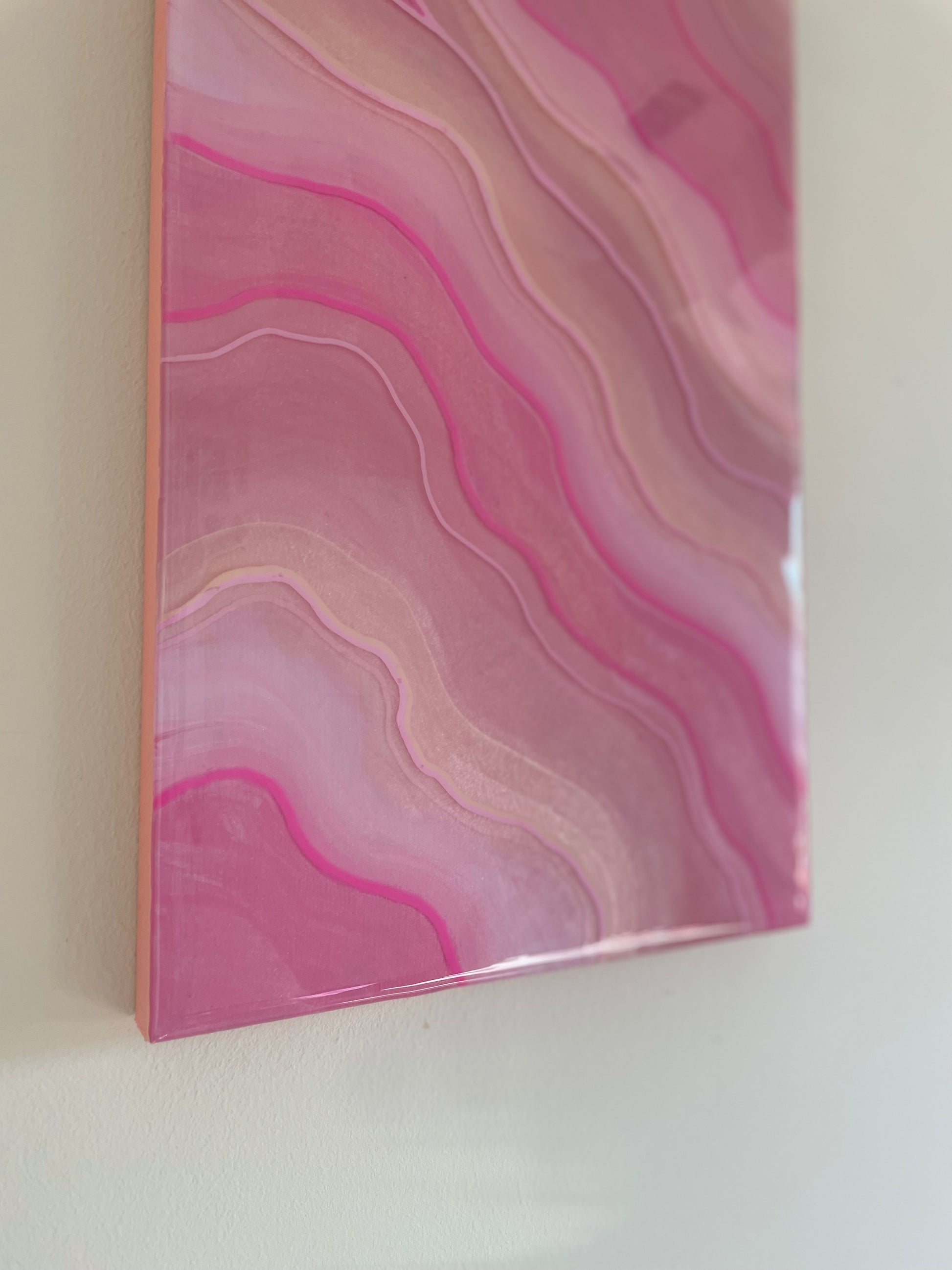 8x16 mixed media; this pink geode slice recreation is made with multiple layers to enhance the amount of depth. You’ll see a painted geode background with pigmented resin on top & fine line details to mimic a geode slice.