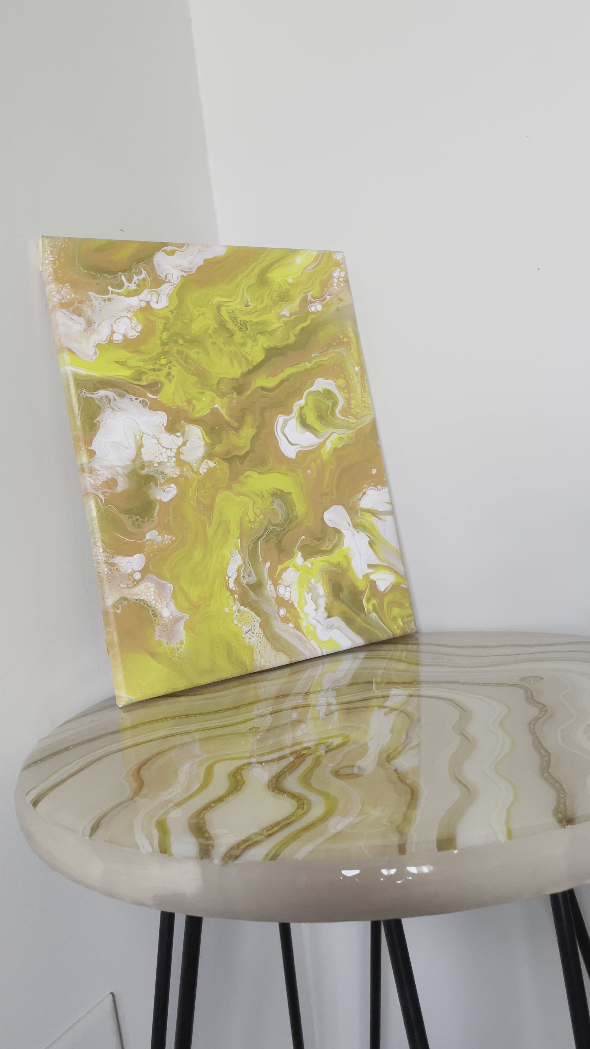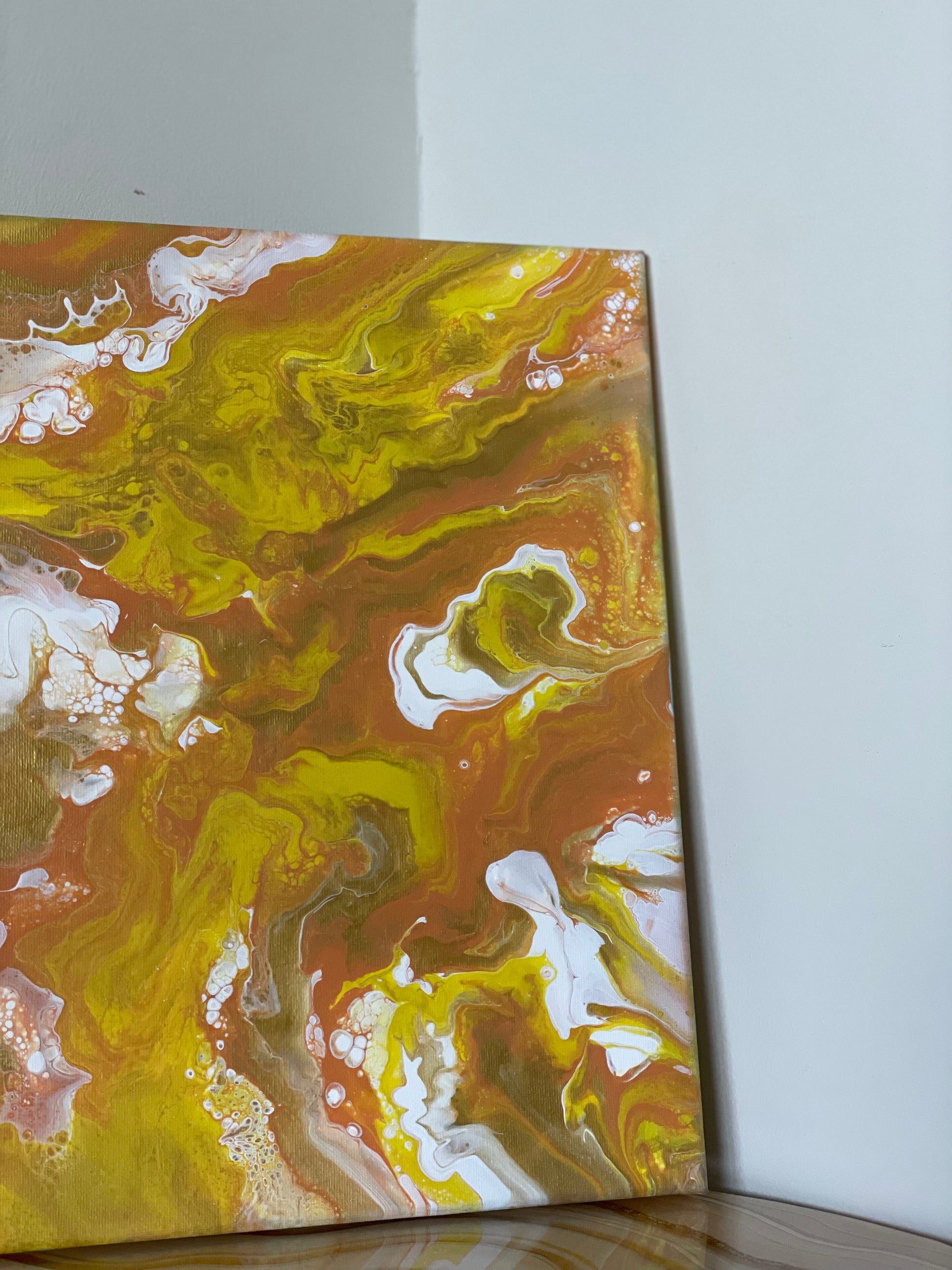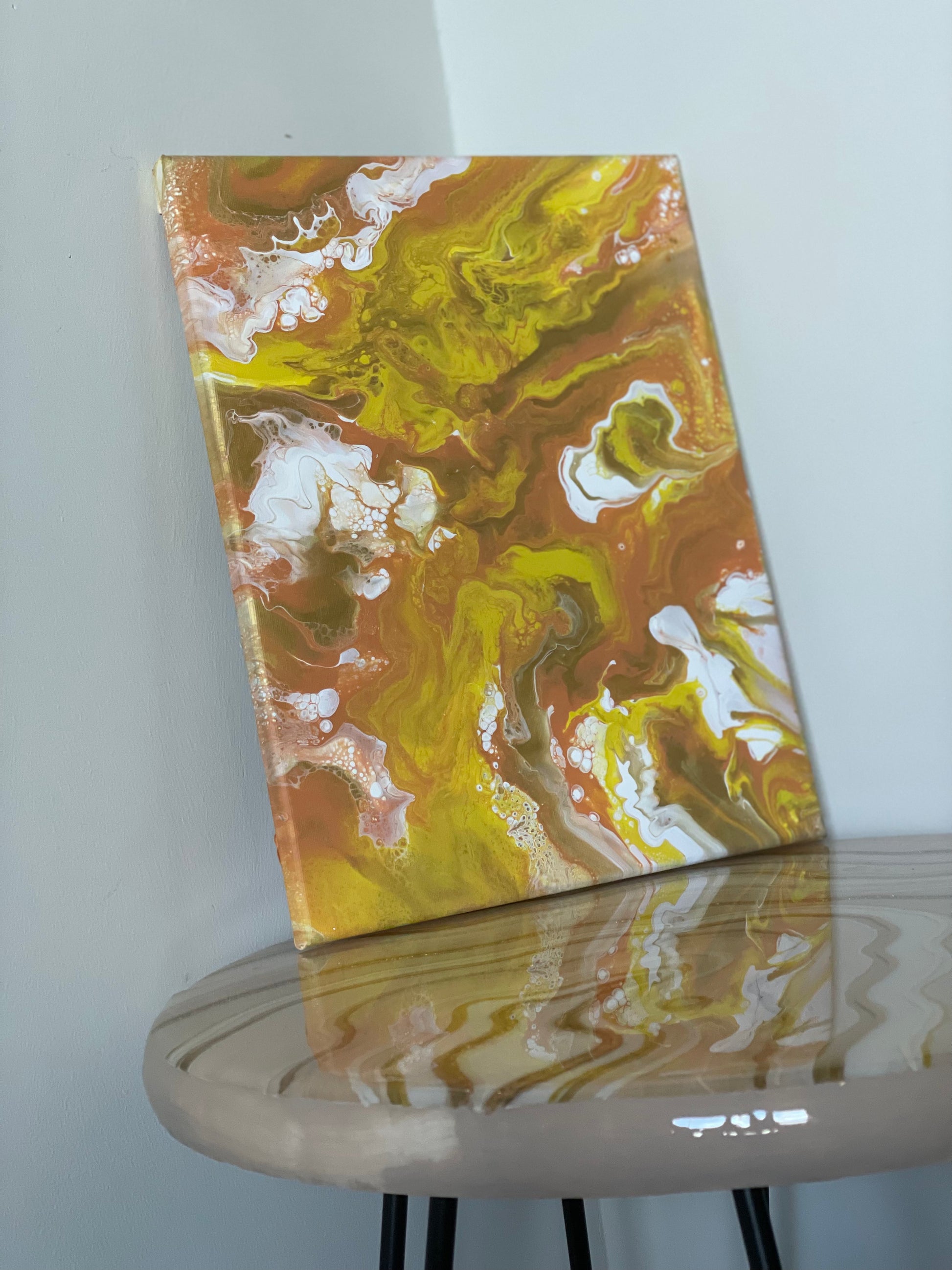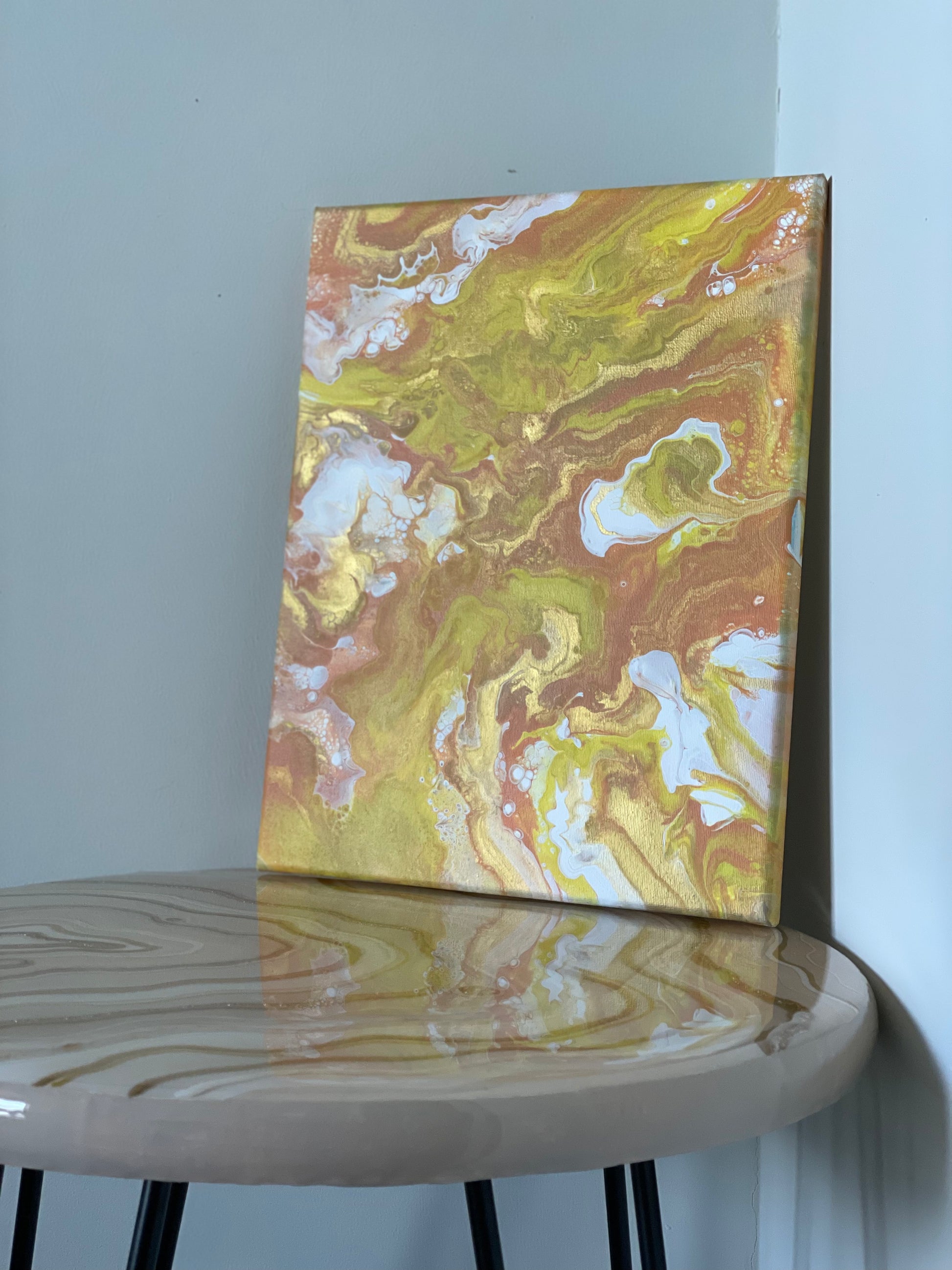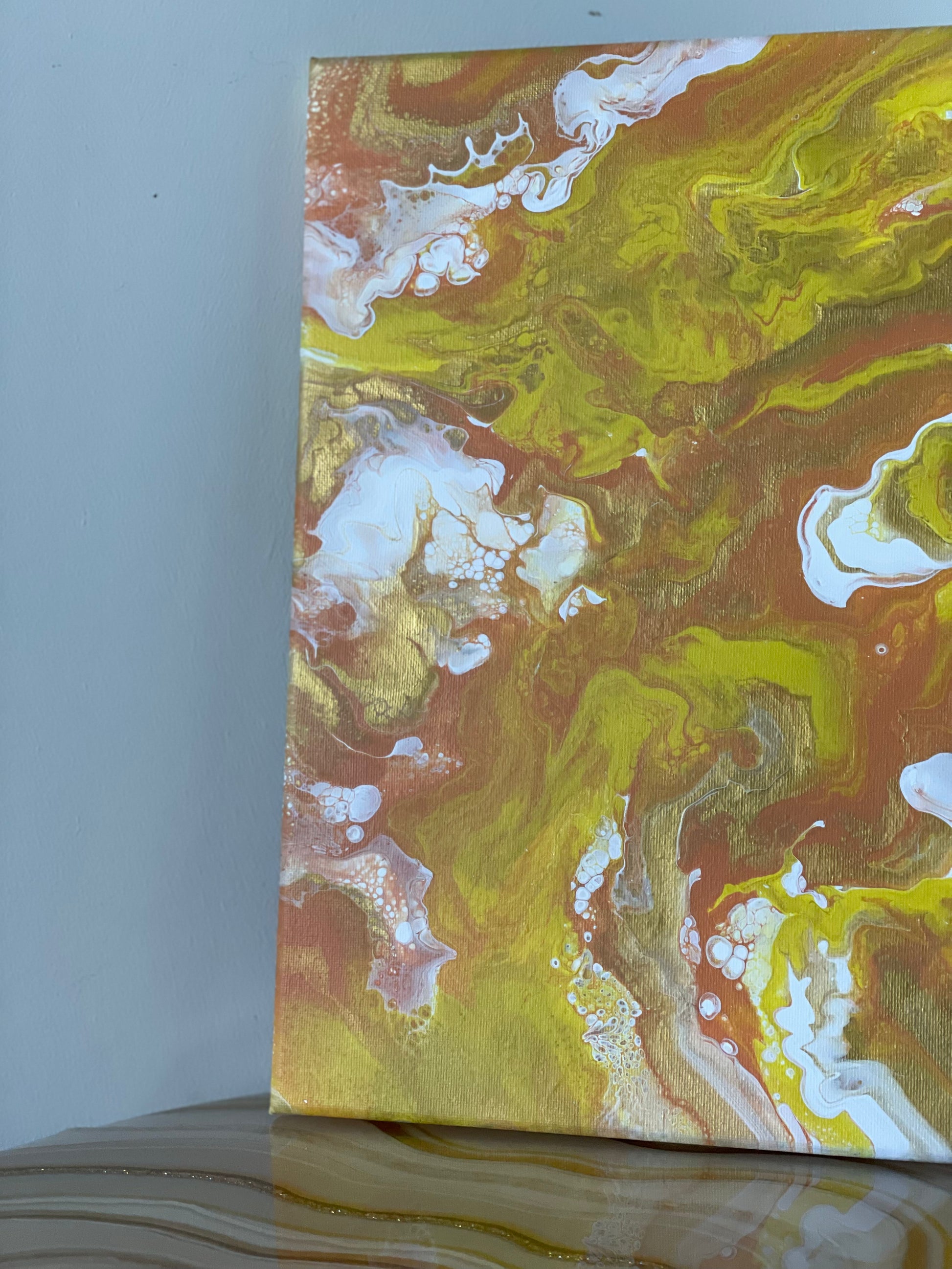 11x14 acrylic pour; made with orange, yellow, white and metallic copper paint.