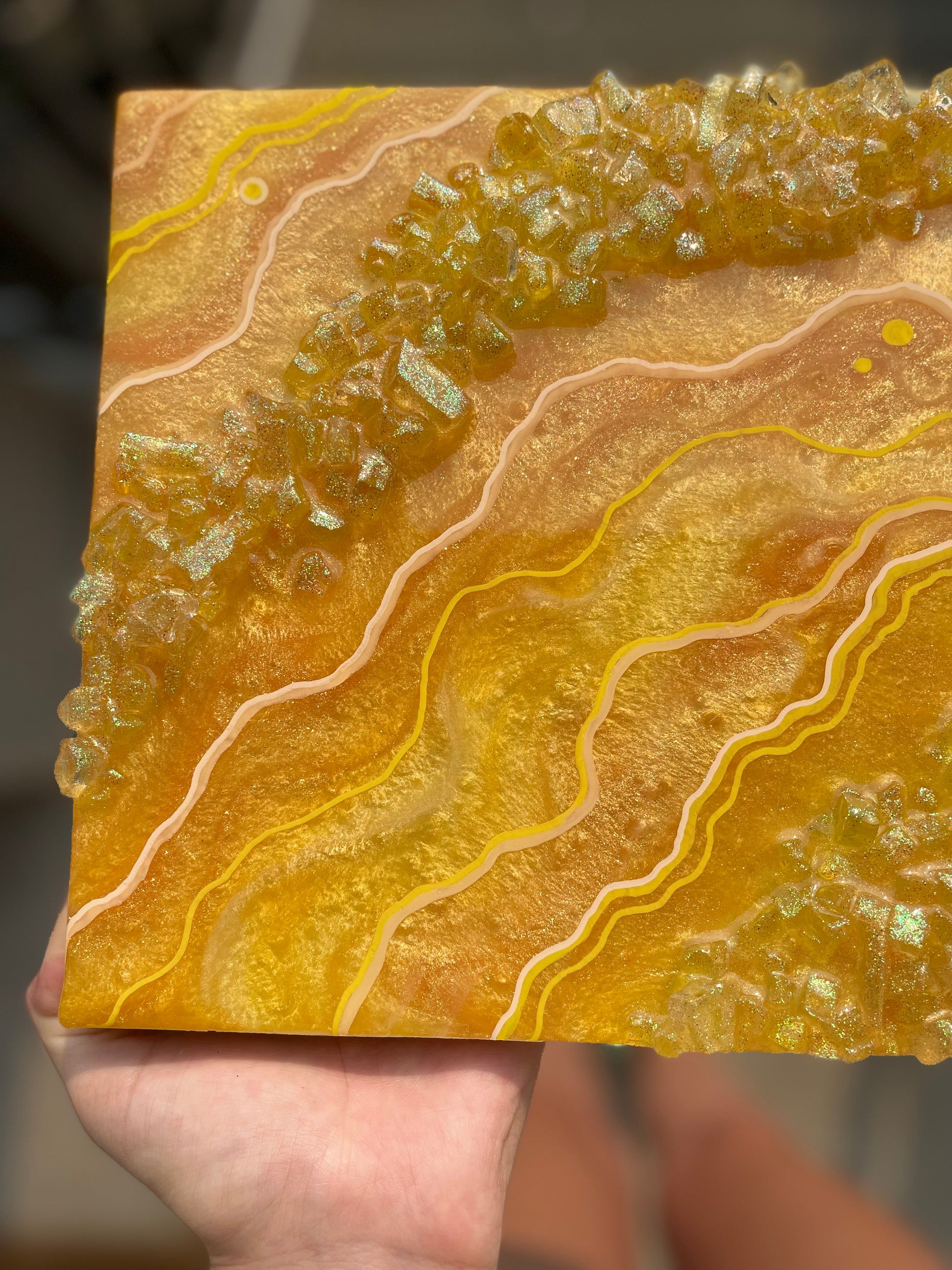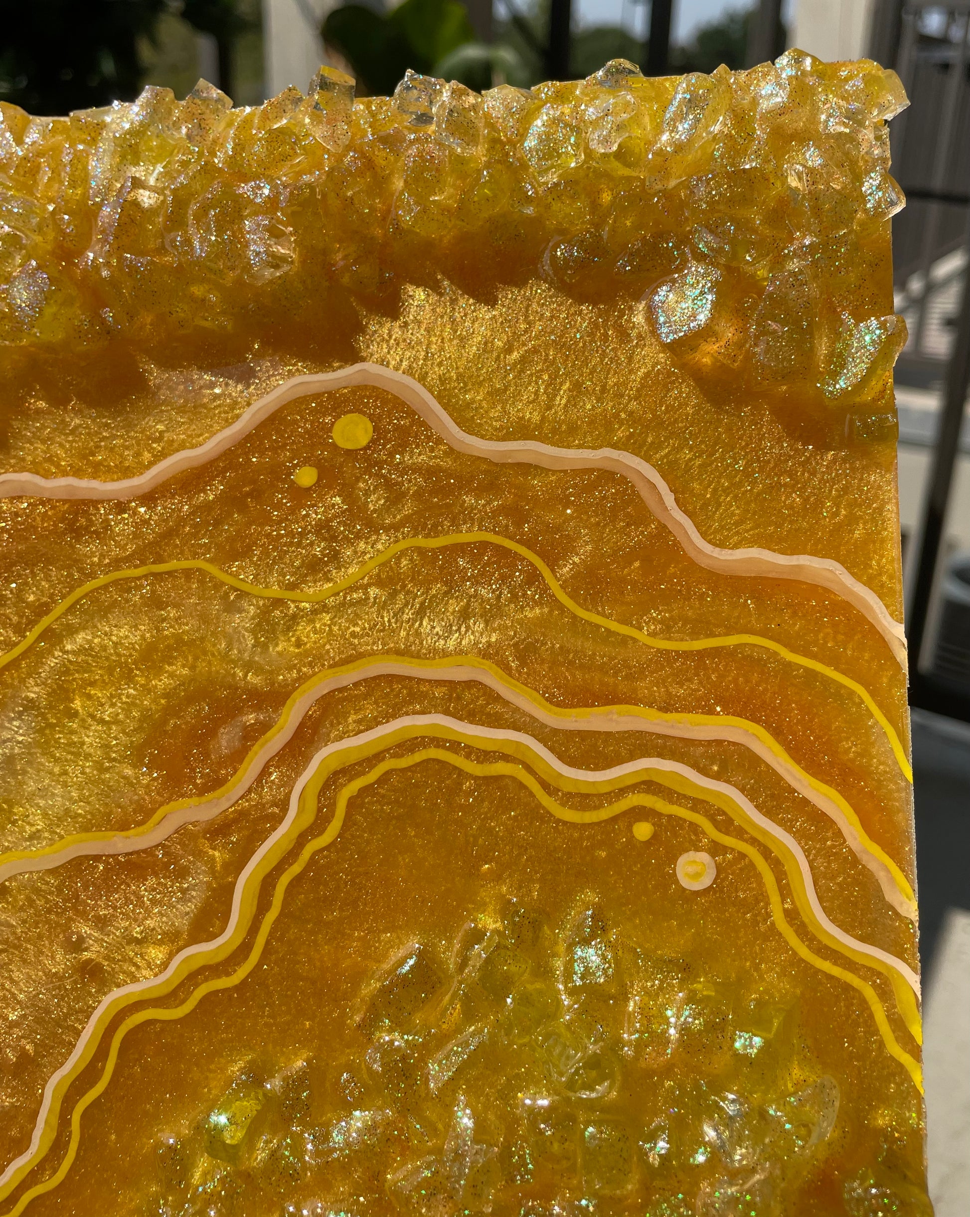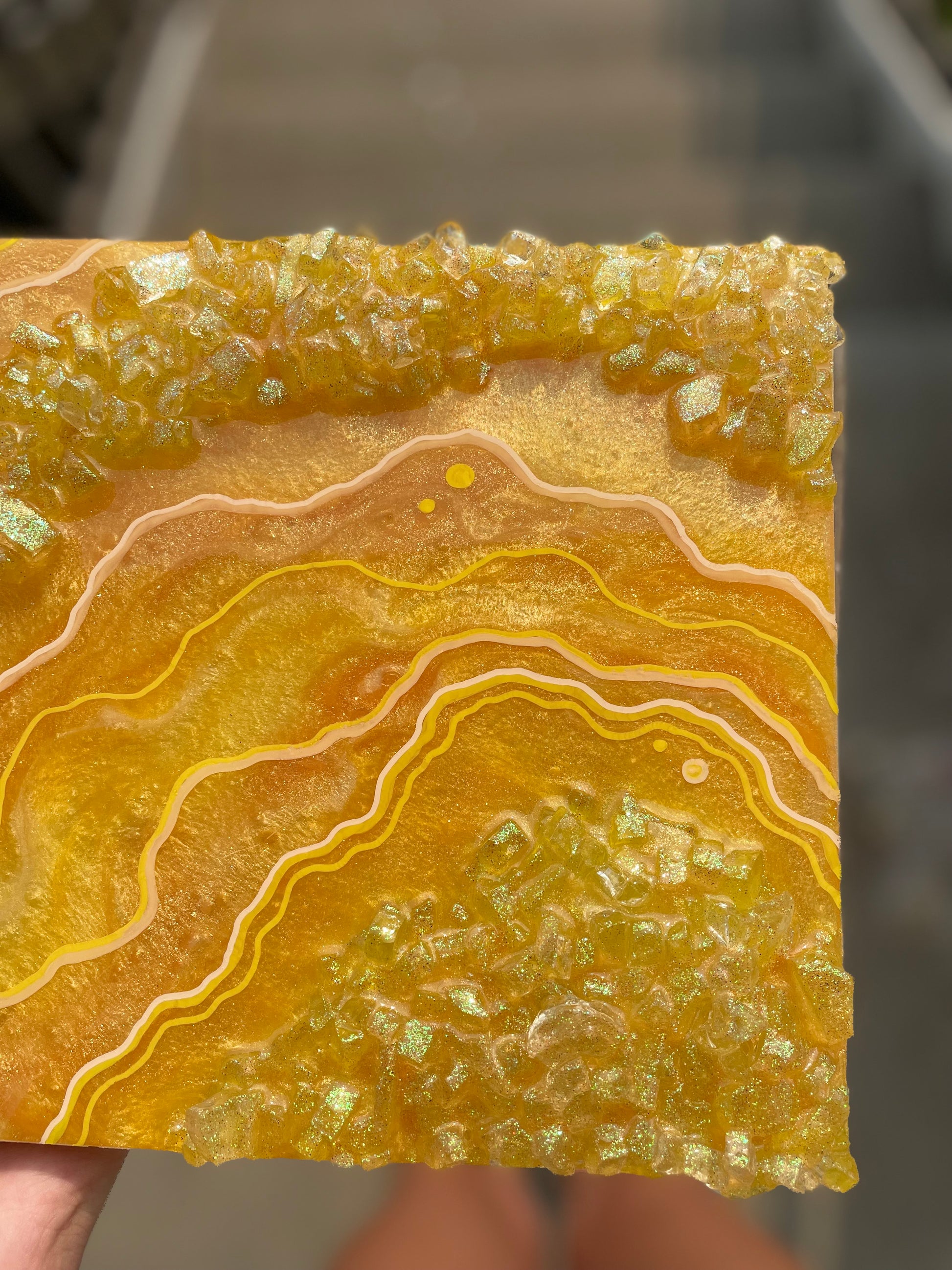 Mini Citrine geode slice recreation made with pigmented resin, faux rocks, glitter & fine line details.