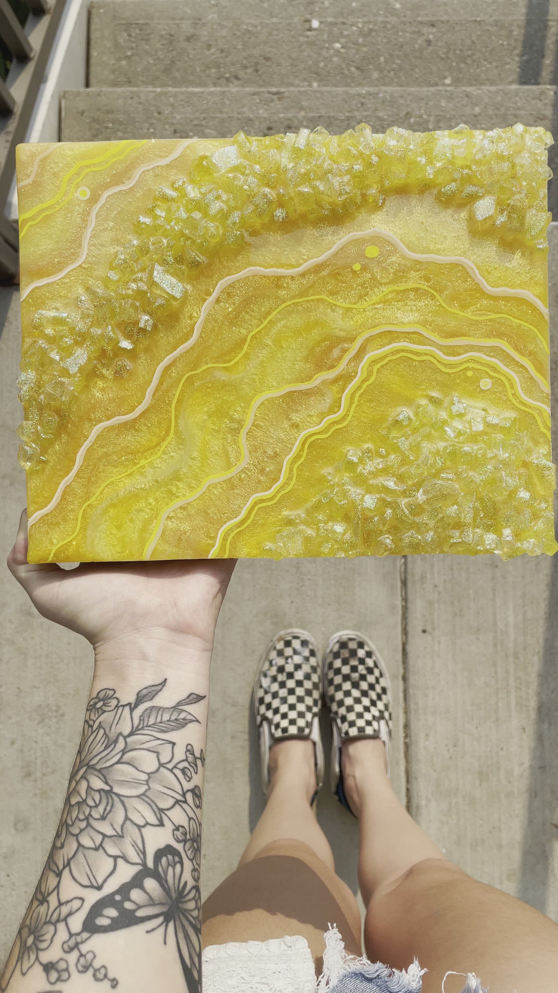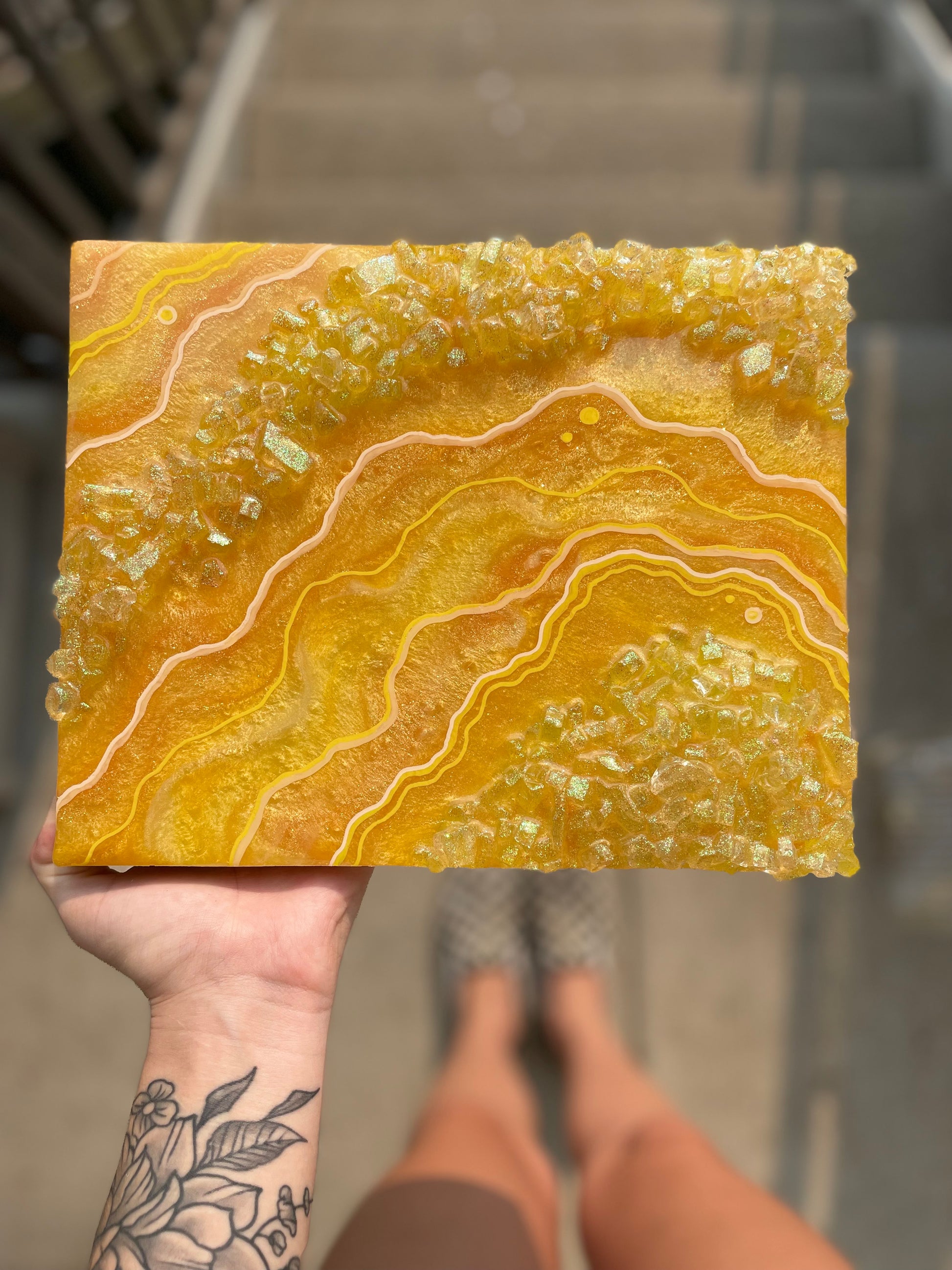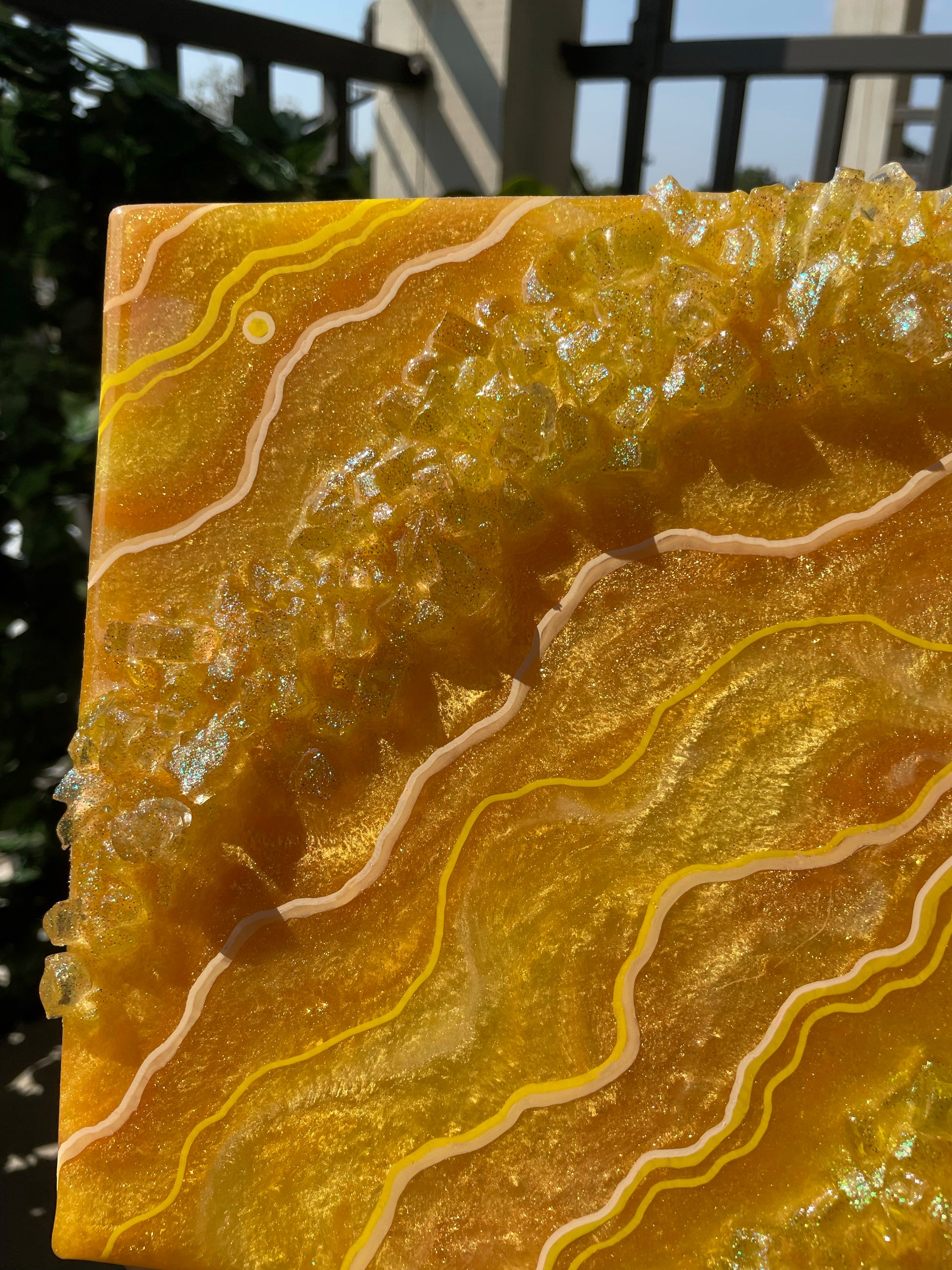 Mini Citrine geode slice recreation made with pigmented resin, faux rocks, glitter & fine line details.