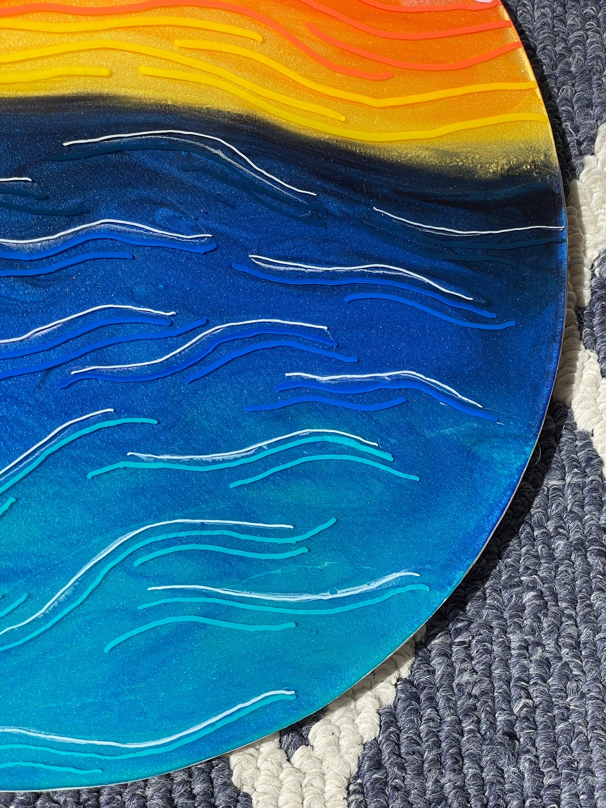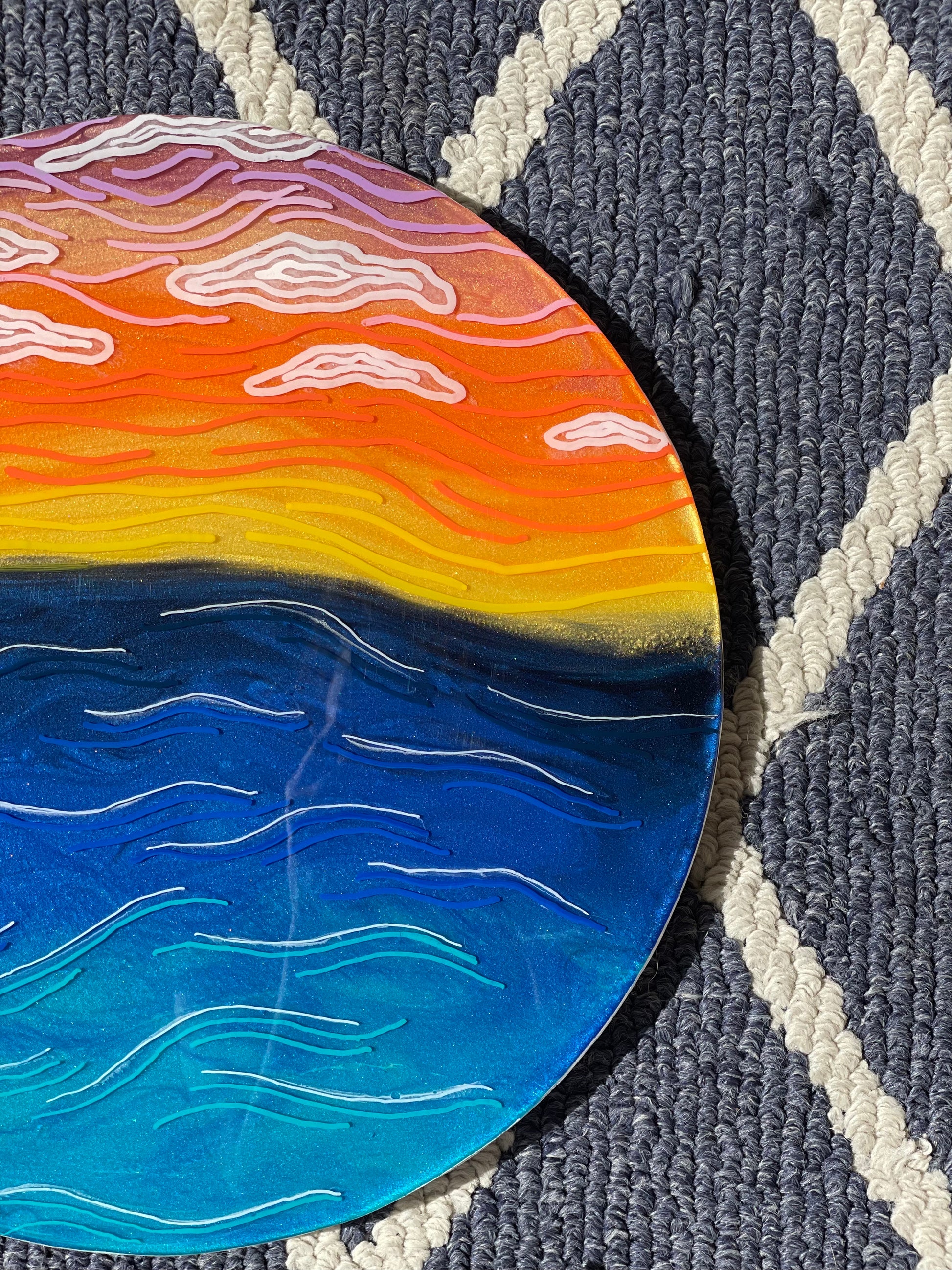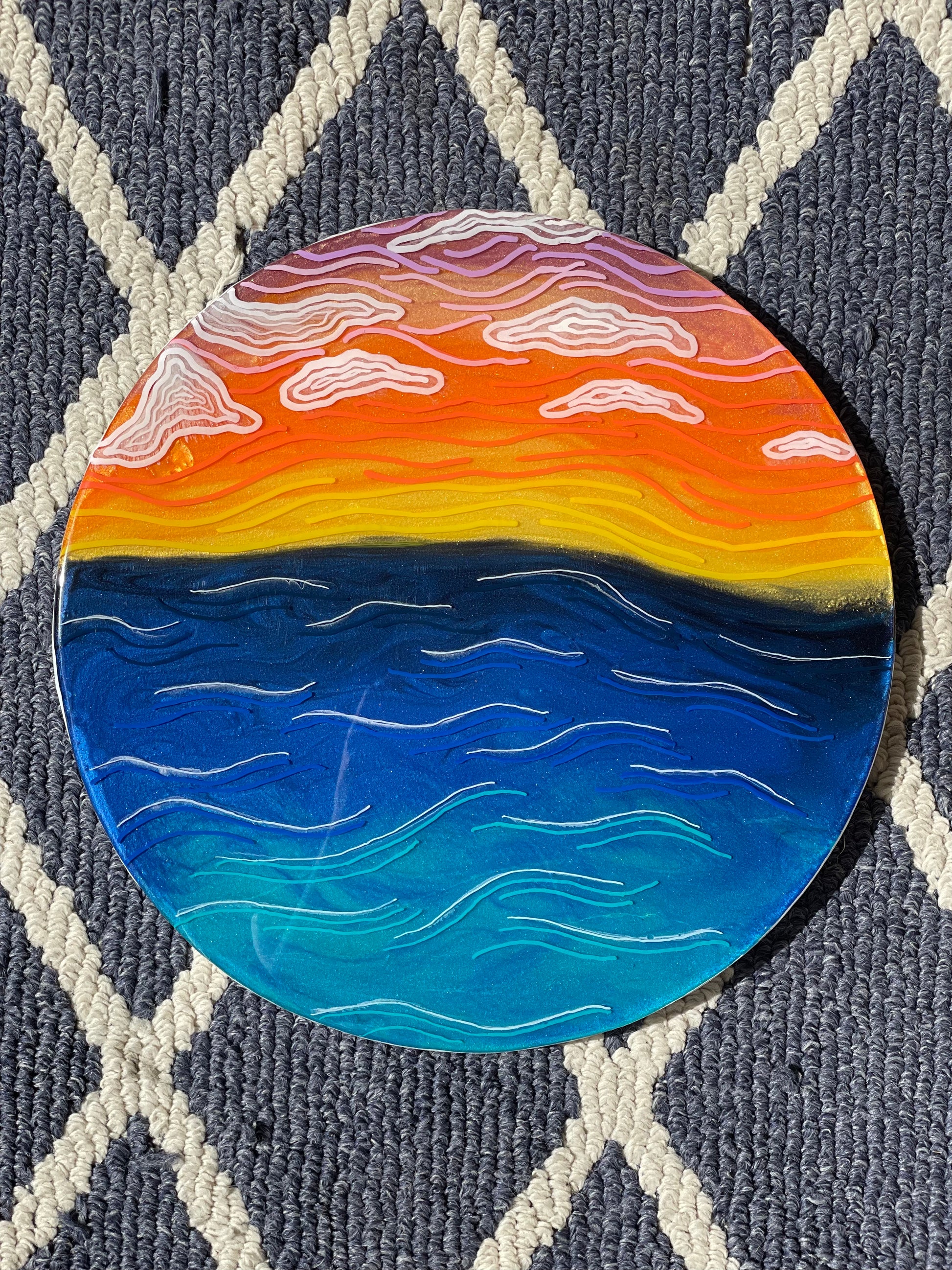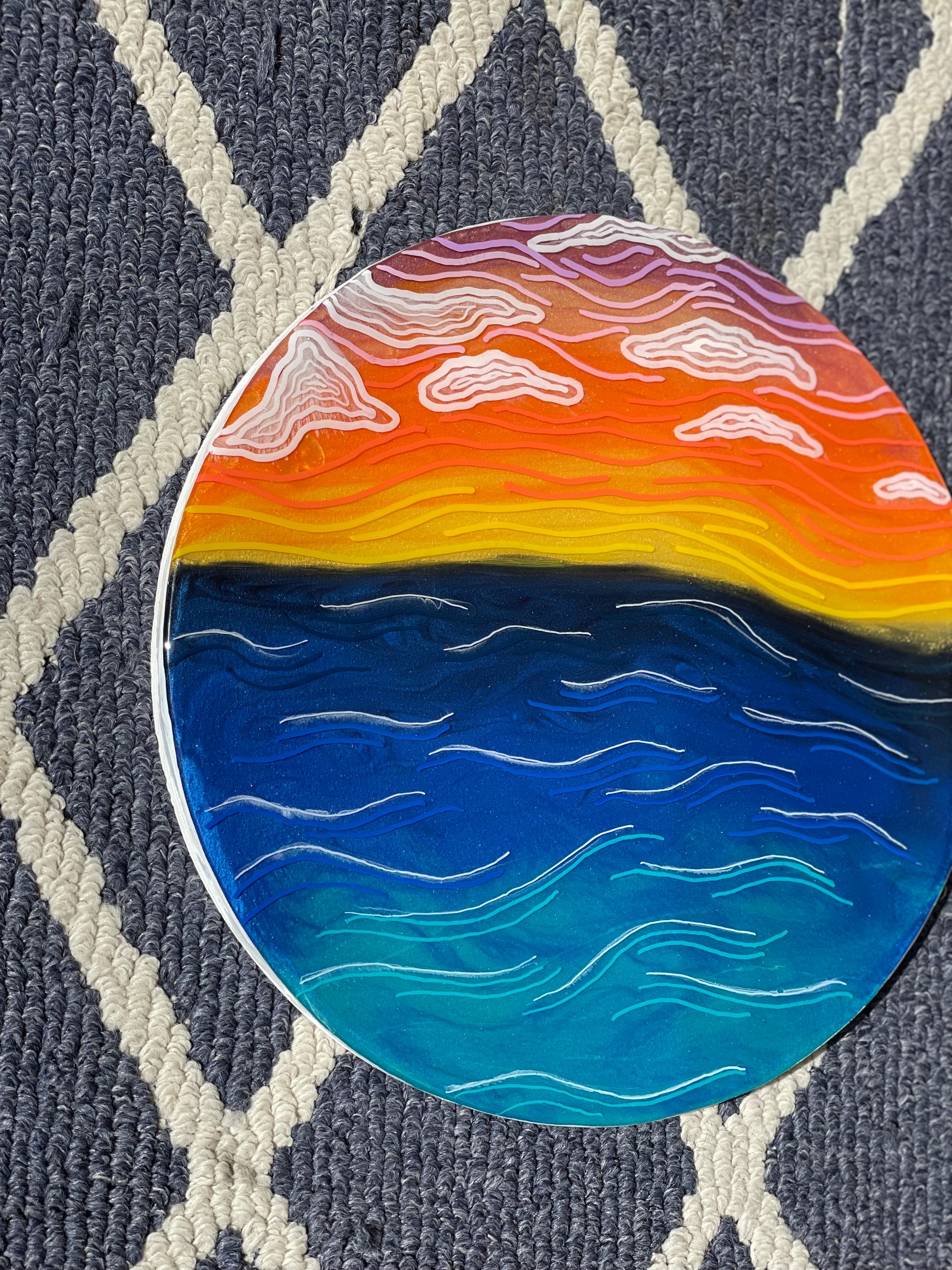 13” round canvas wall art; made with resin, pigment and fine line details to give you an abstract view of natures beautiful sunset. The sides of this piece are painted white.