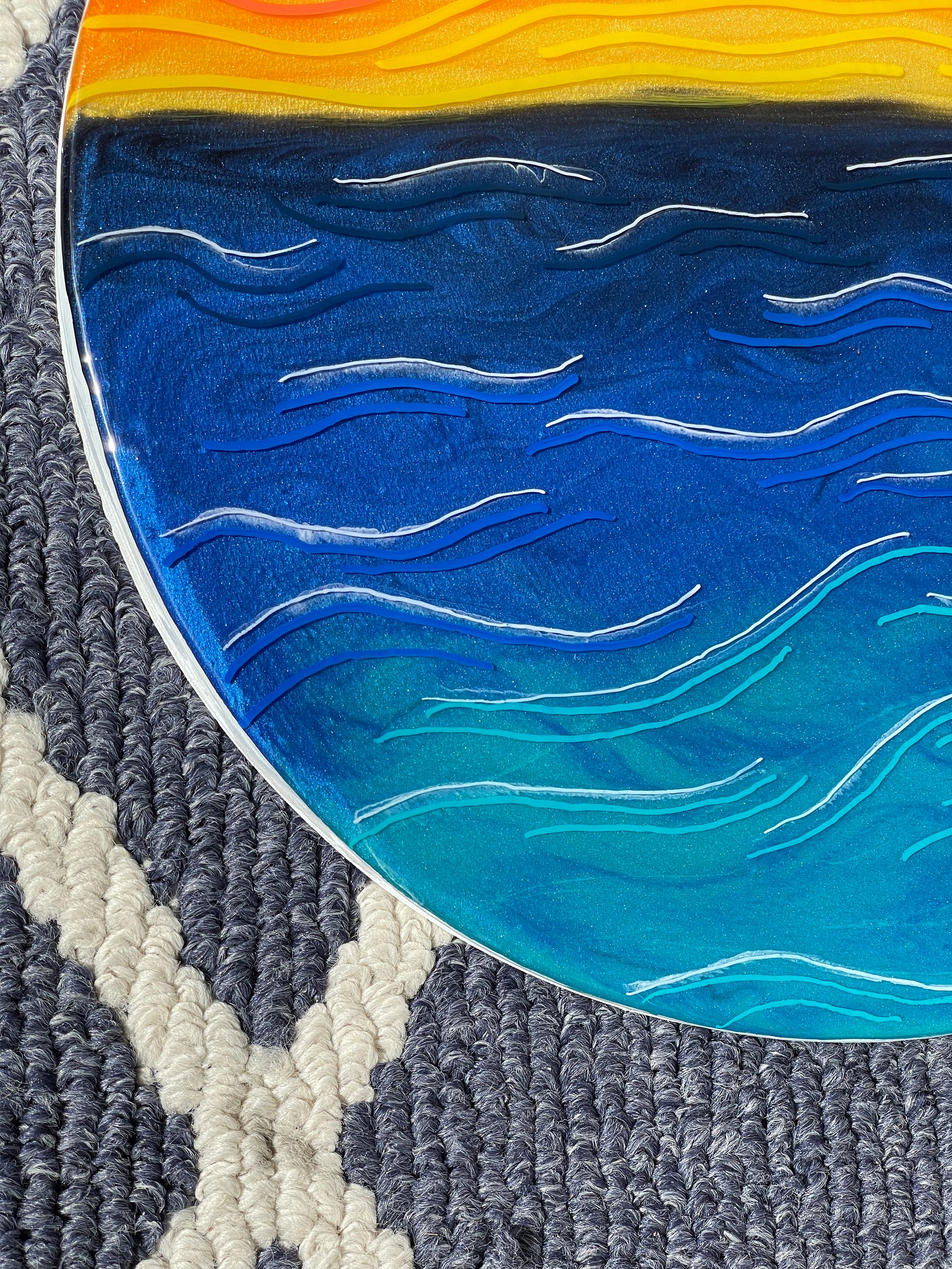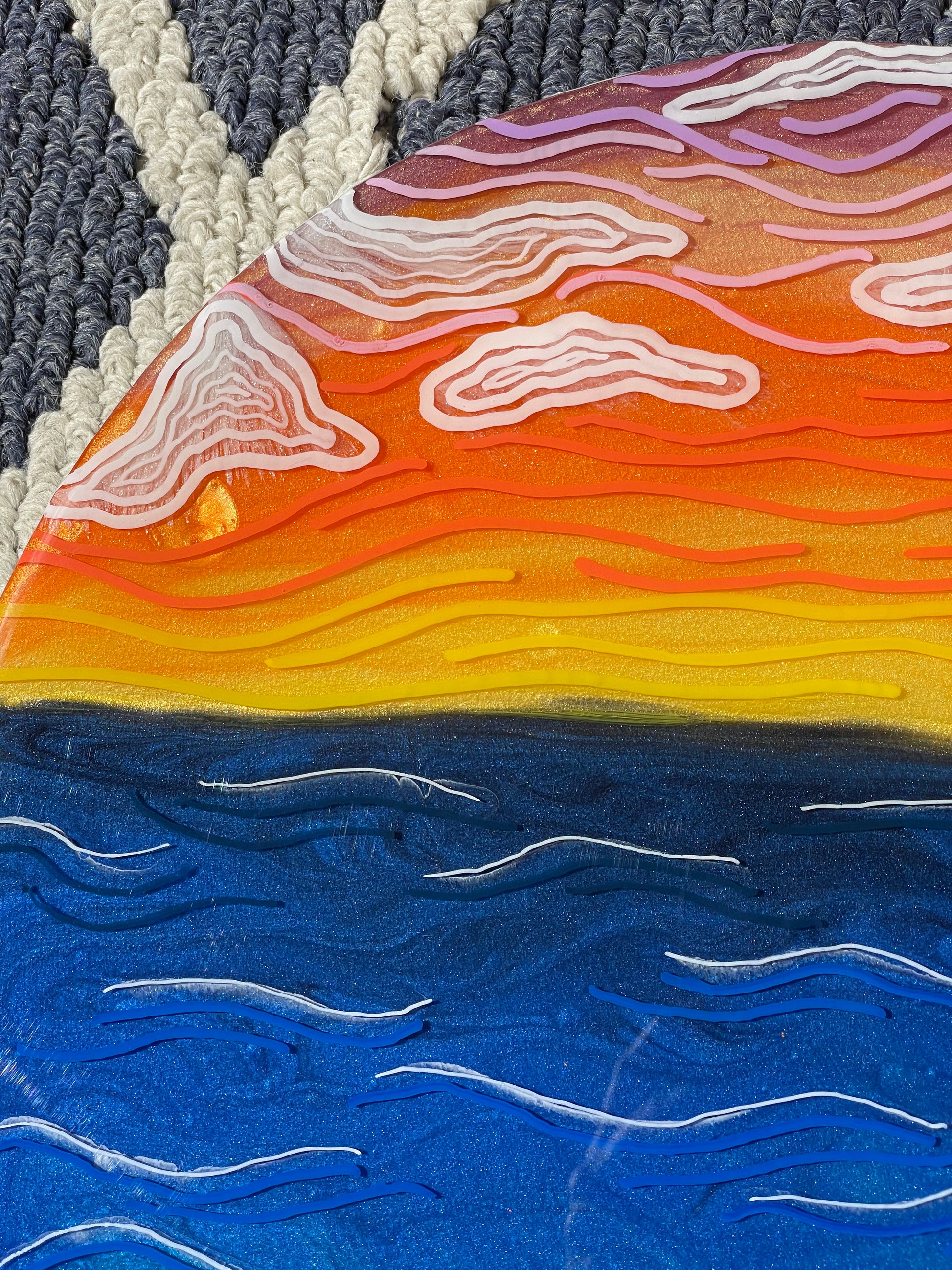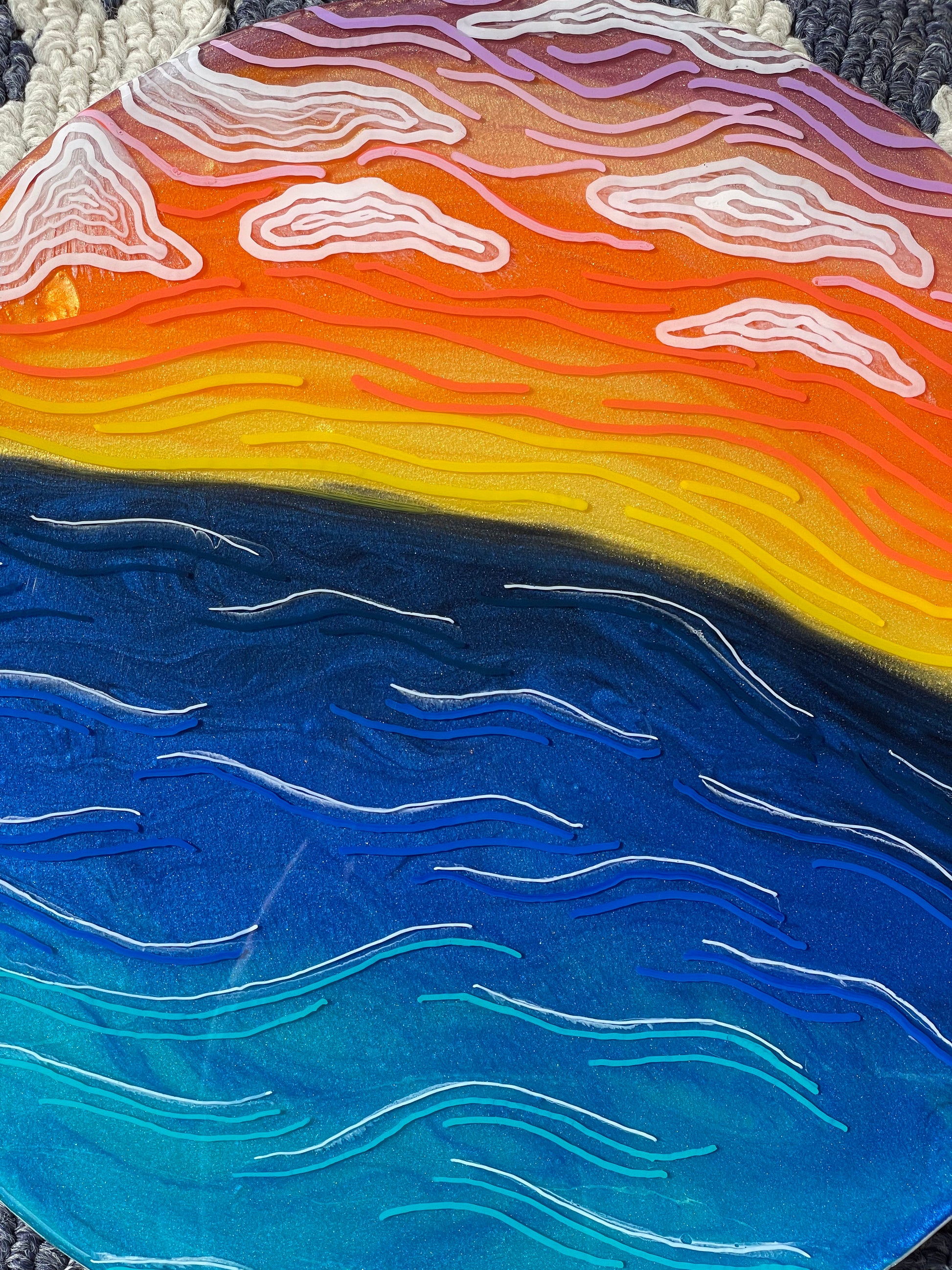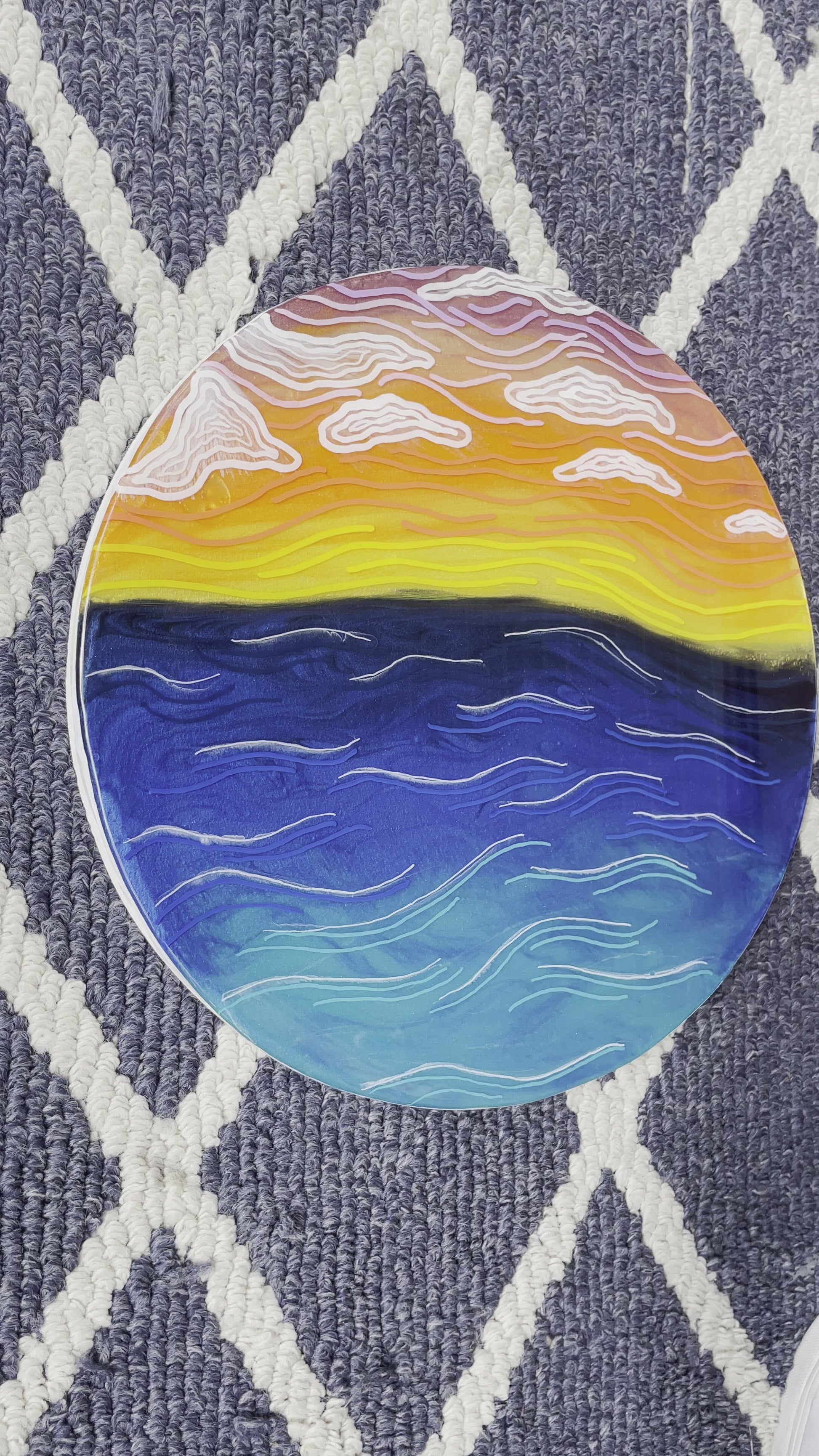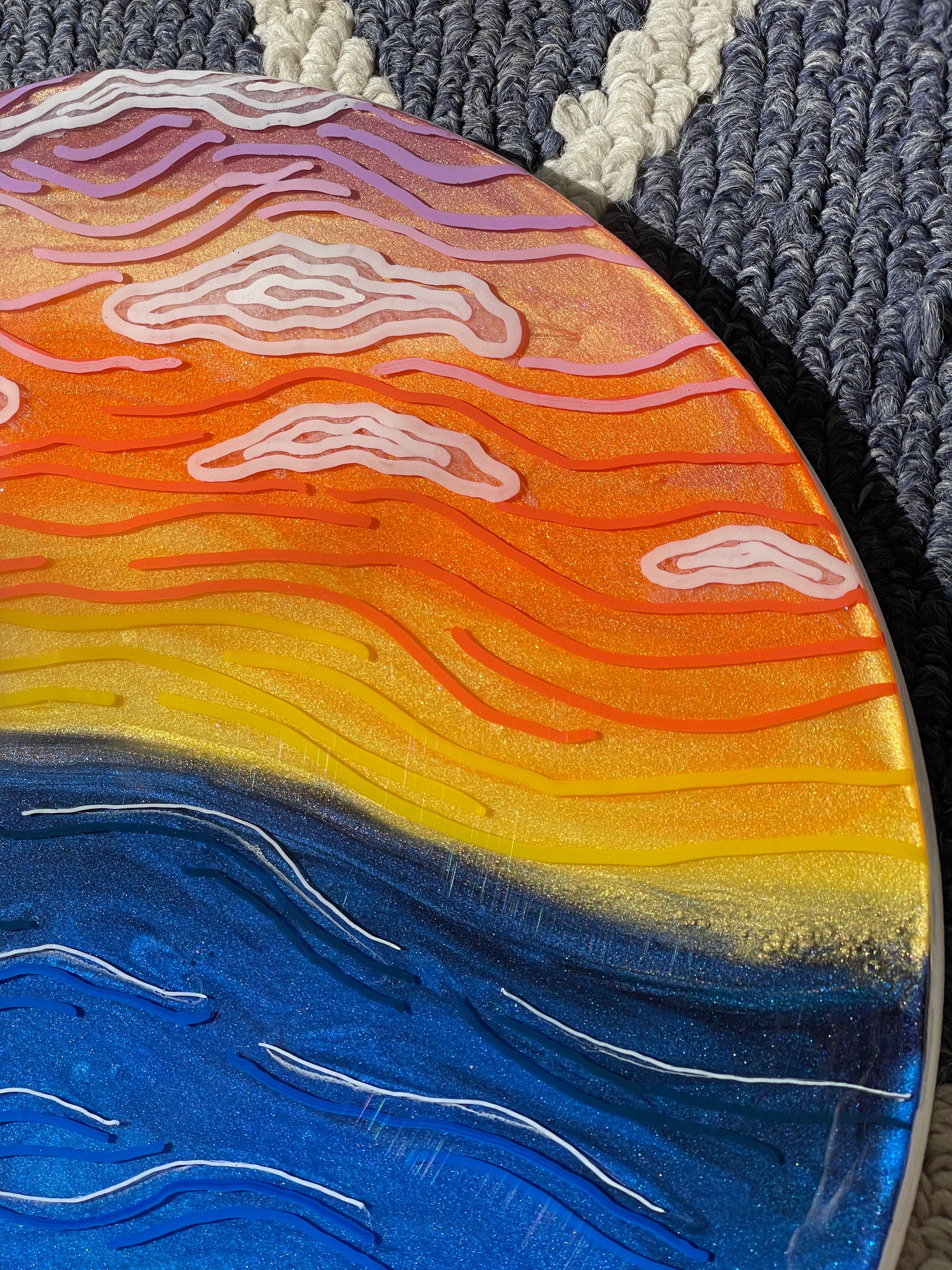 13” round canvas wall art; made with resin, pigment and fine line details to give you an abstract view of natures beautiful sunset. The sides of this piece are painted white.