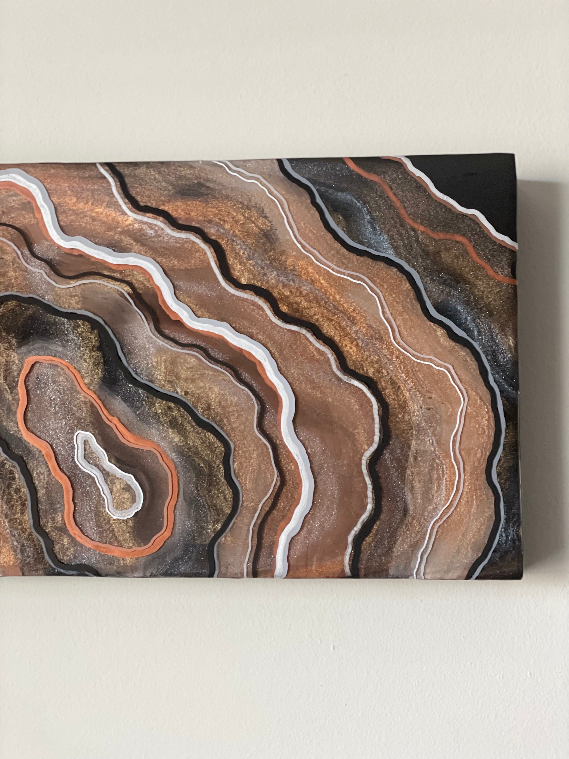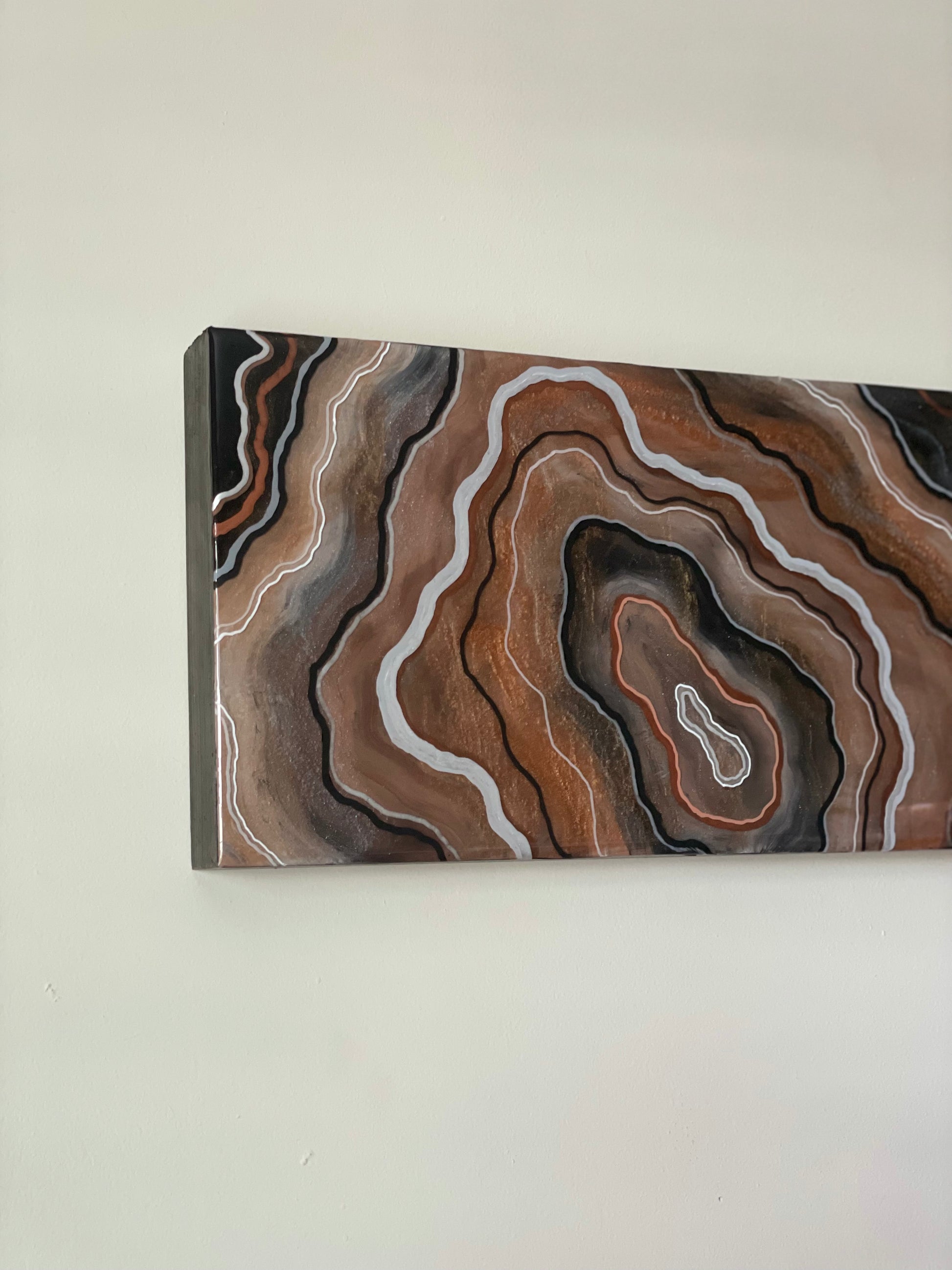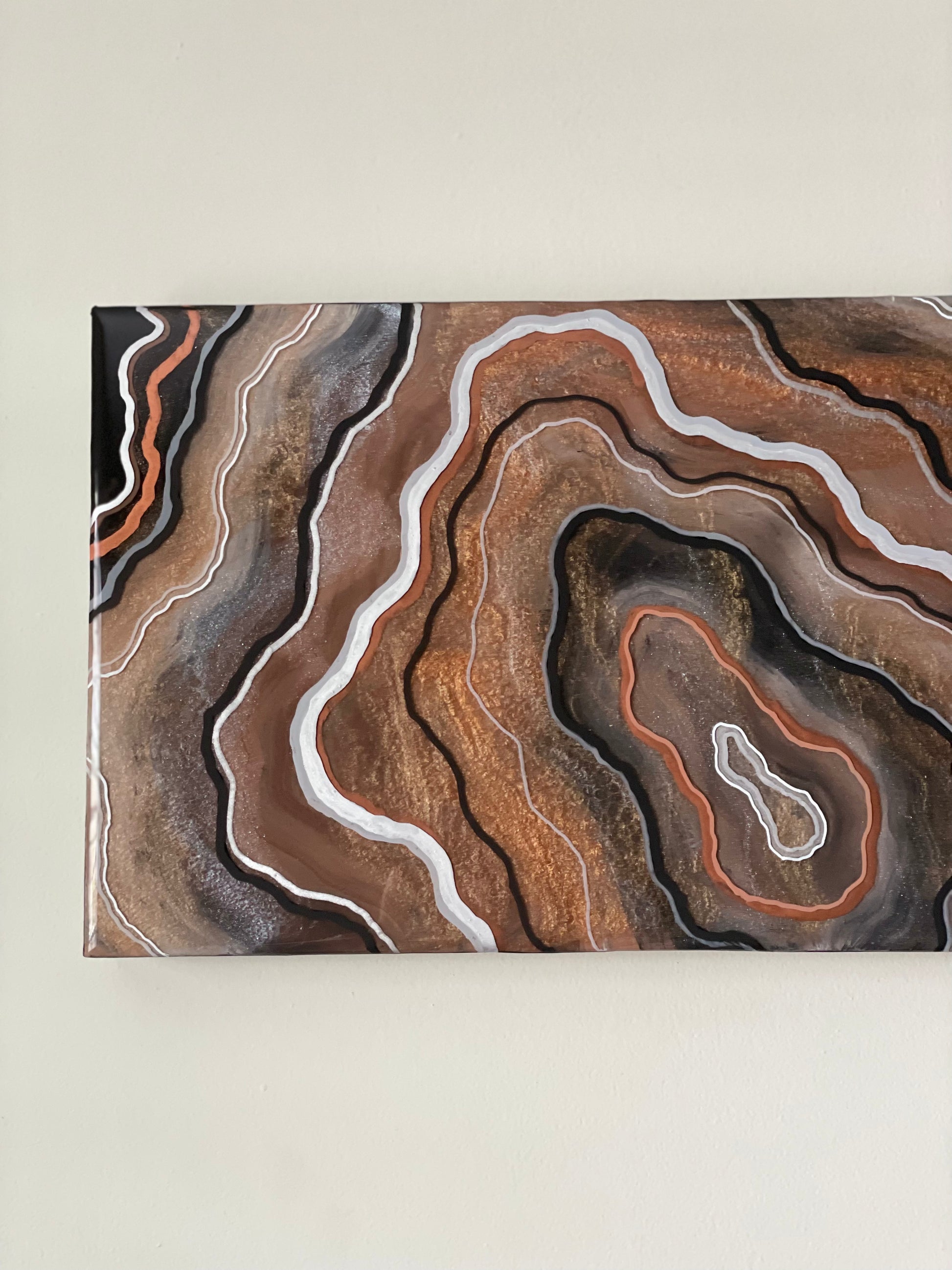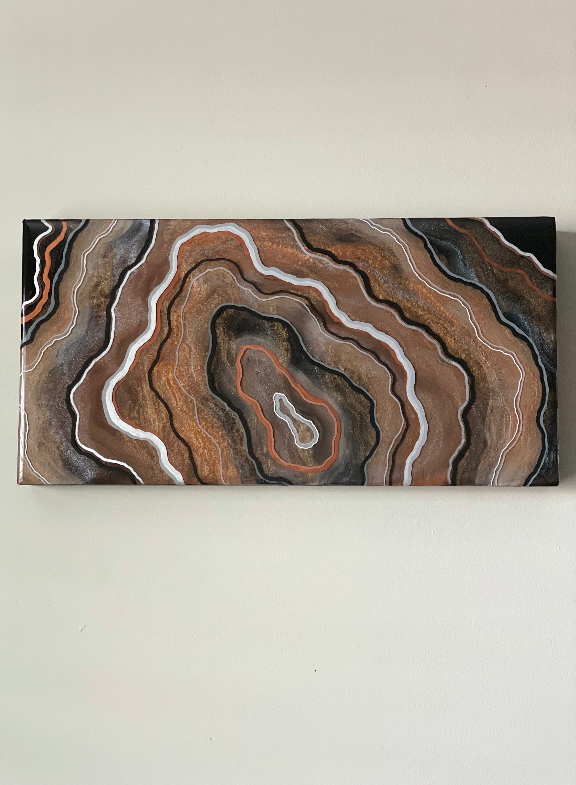 8x16 wood canvas artwork with 1 1/2 inch black painted sides. This geode inspired piece is made of neutral colors; a painted geode background with resin enhancements between layers.