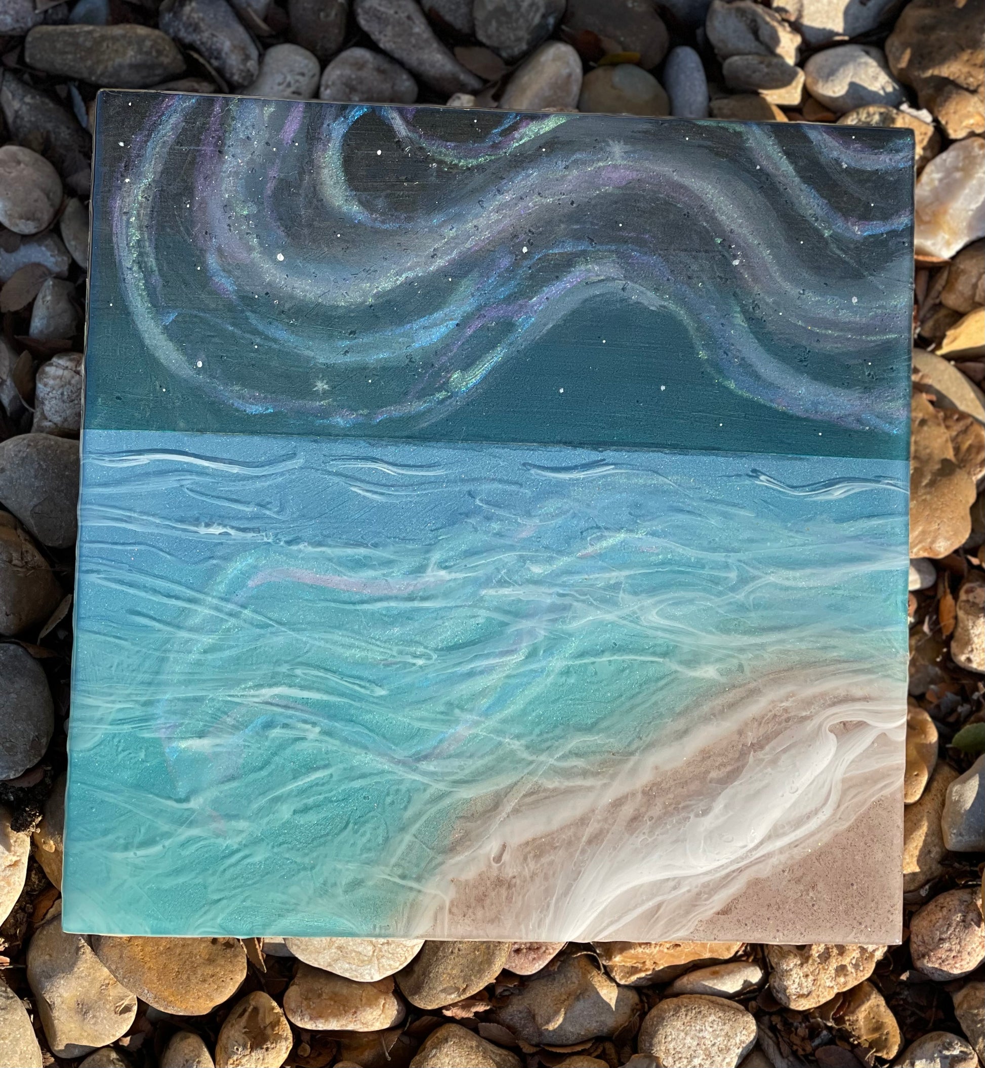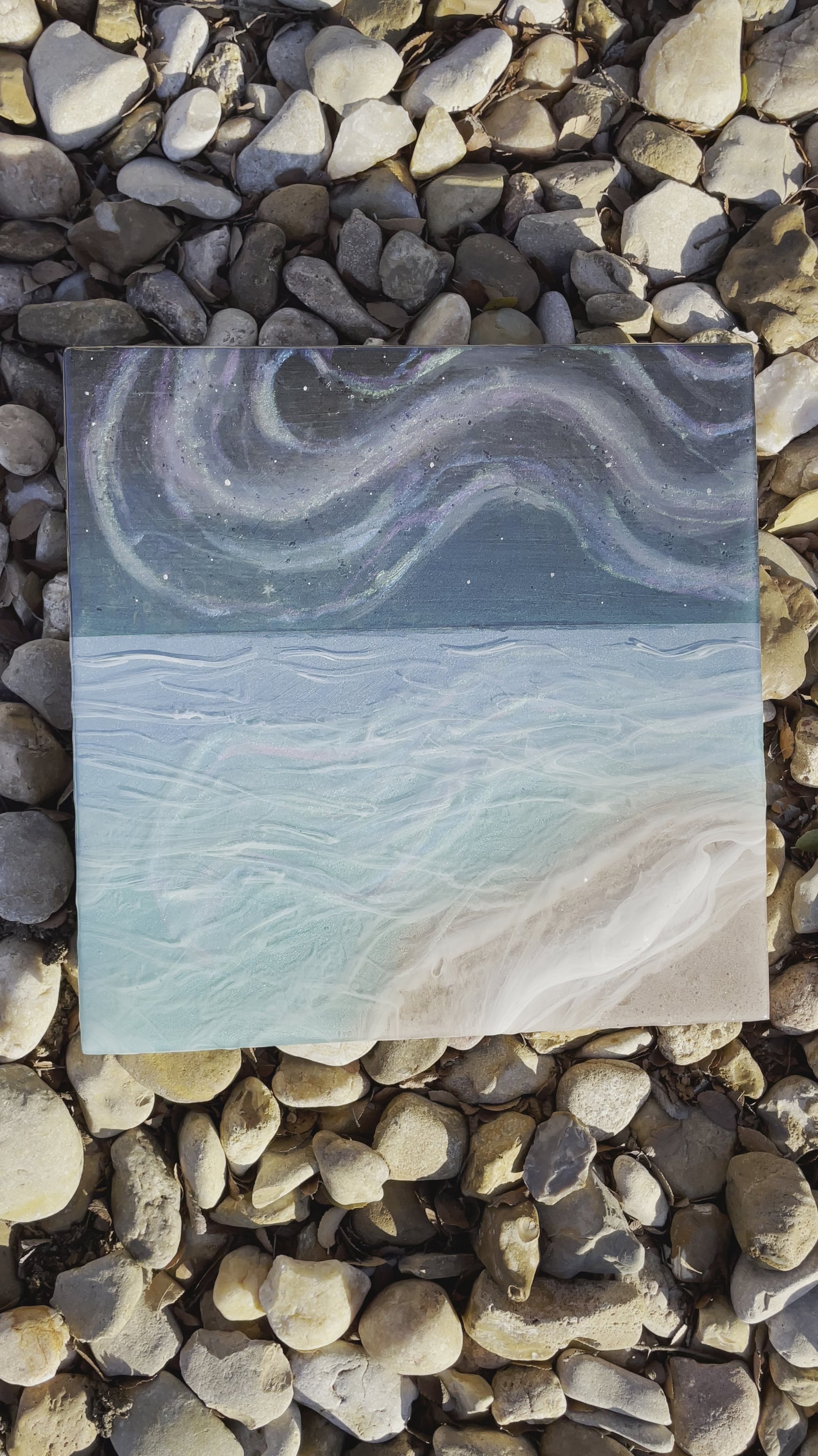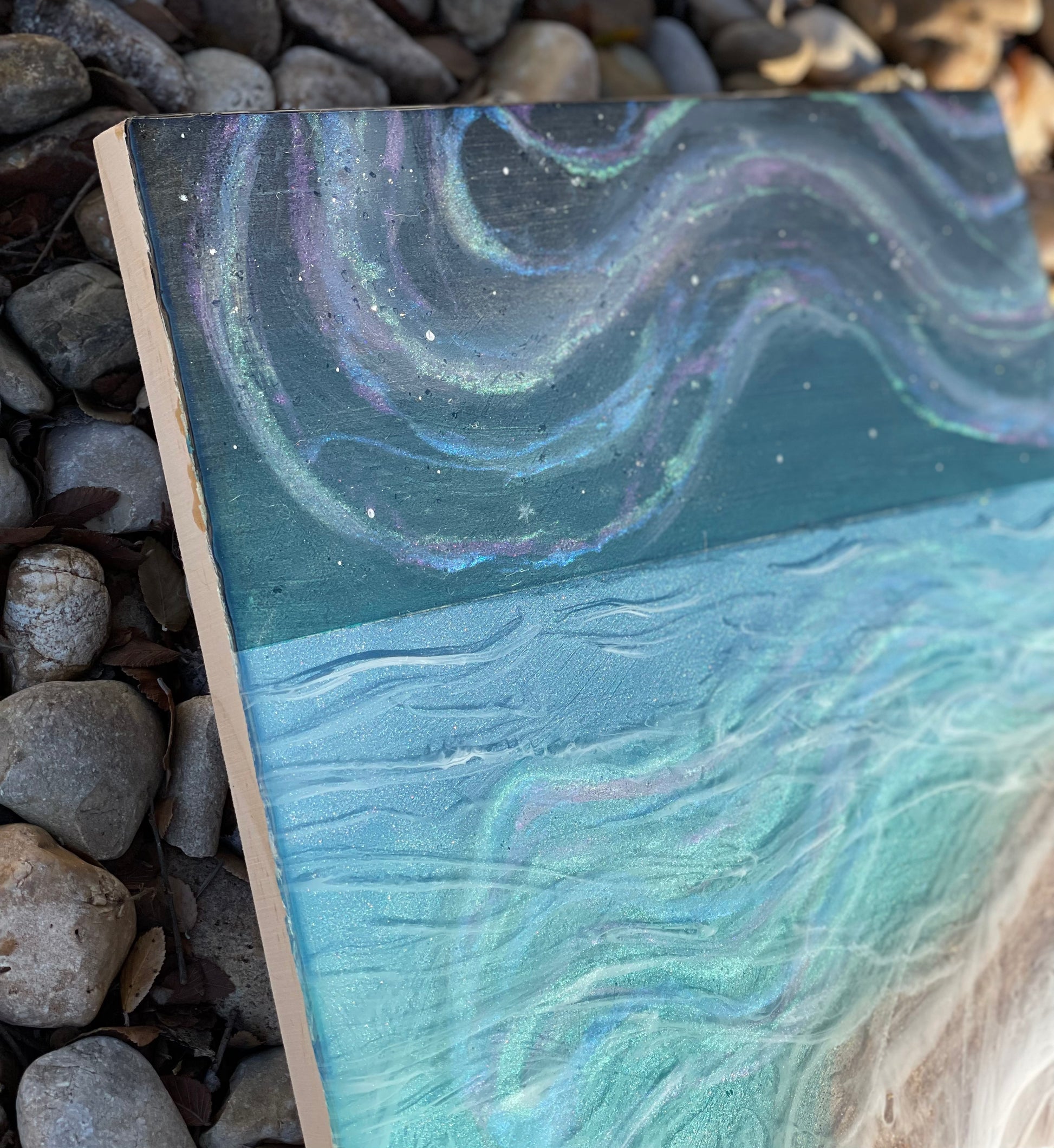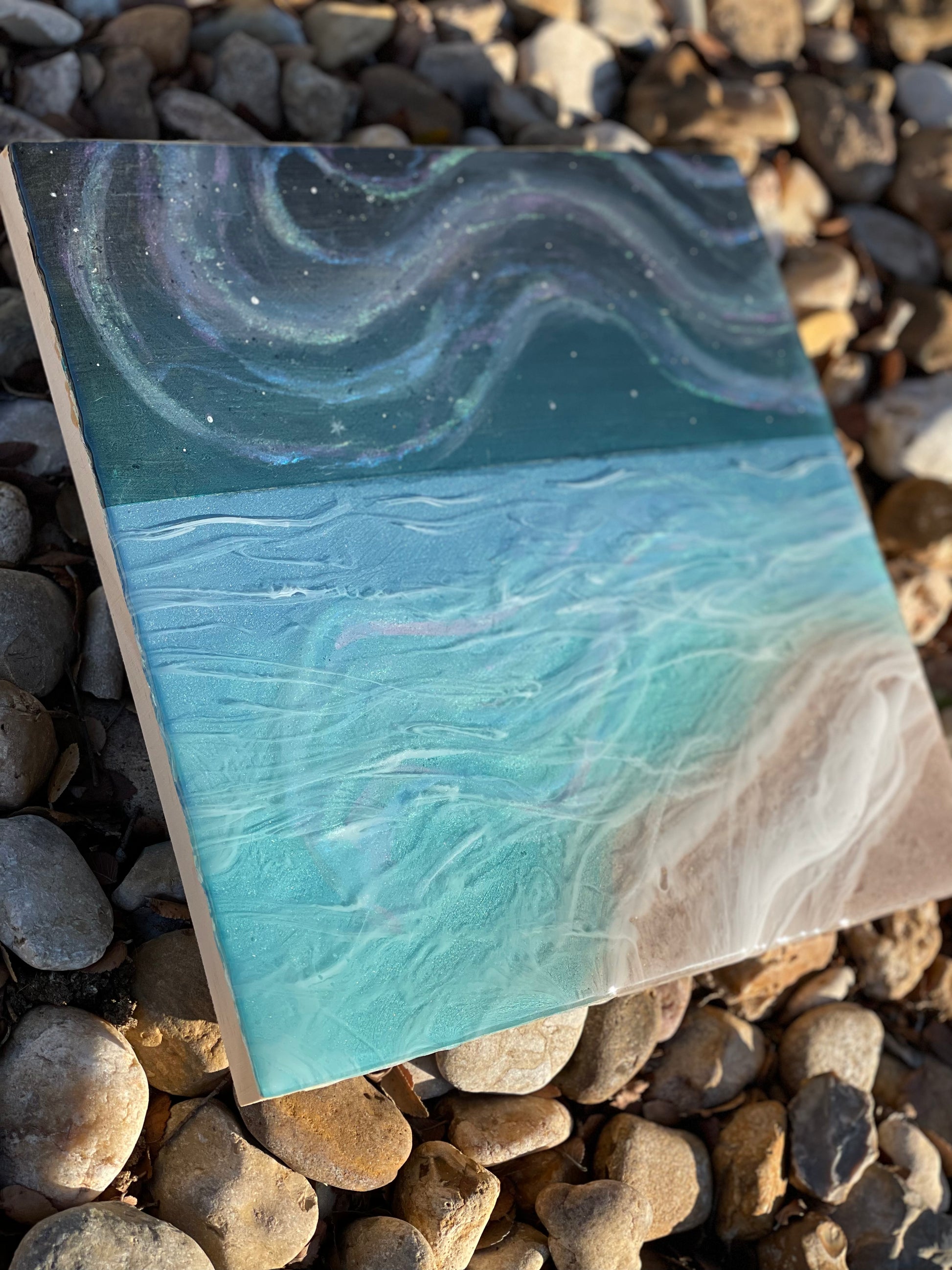 12x12 ocean/Aurora borealis inspired mixed media wall art. ((1/2 inch wood sides))