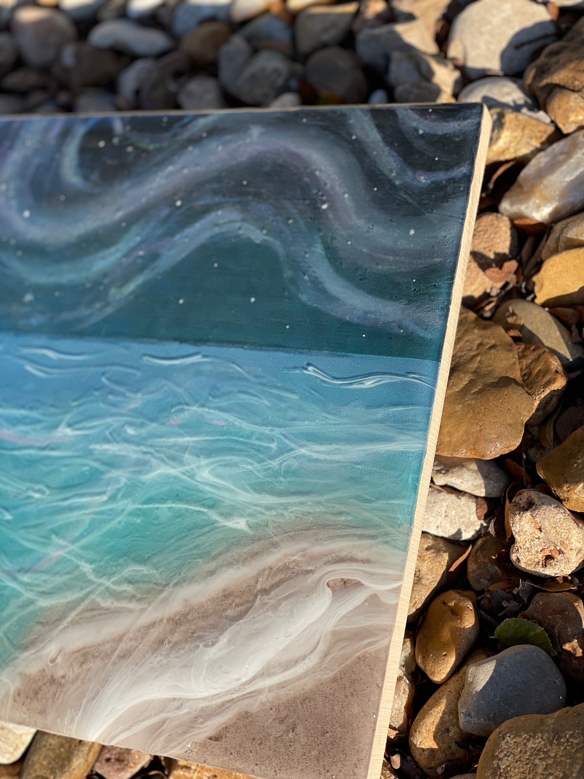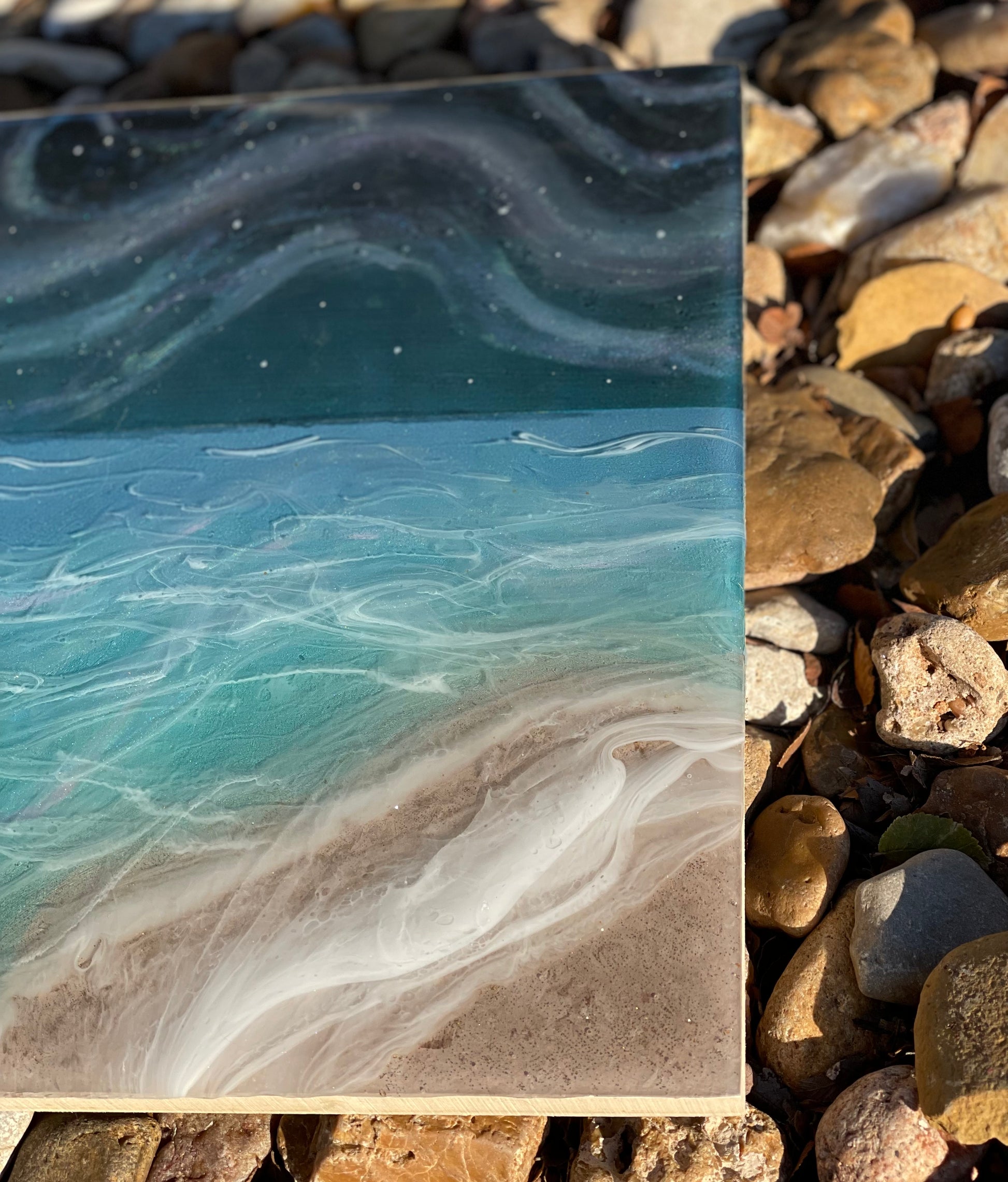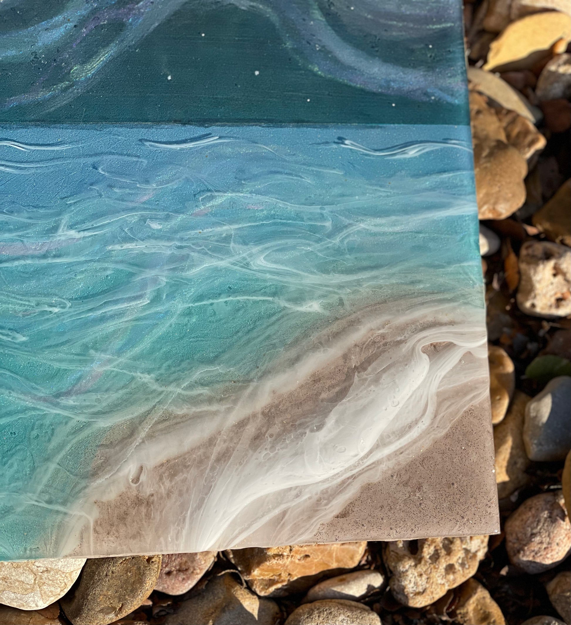 This piece is made of a painted background, resin enhancements, and a bit of sparkle to make the sky pop. There is also multiple resin layers to add depth within the ocean.