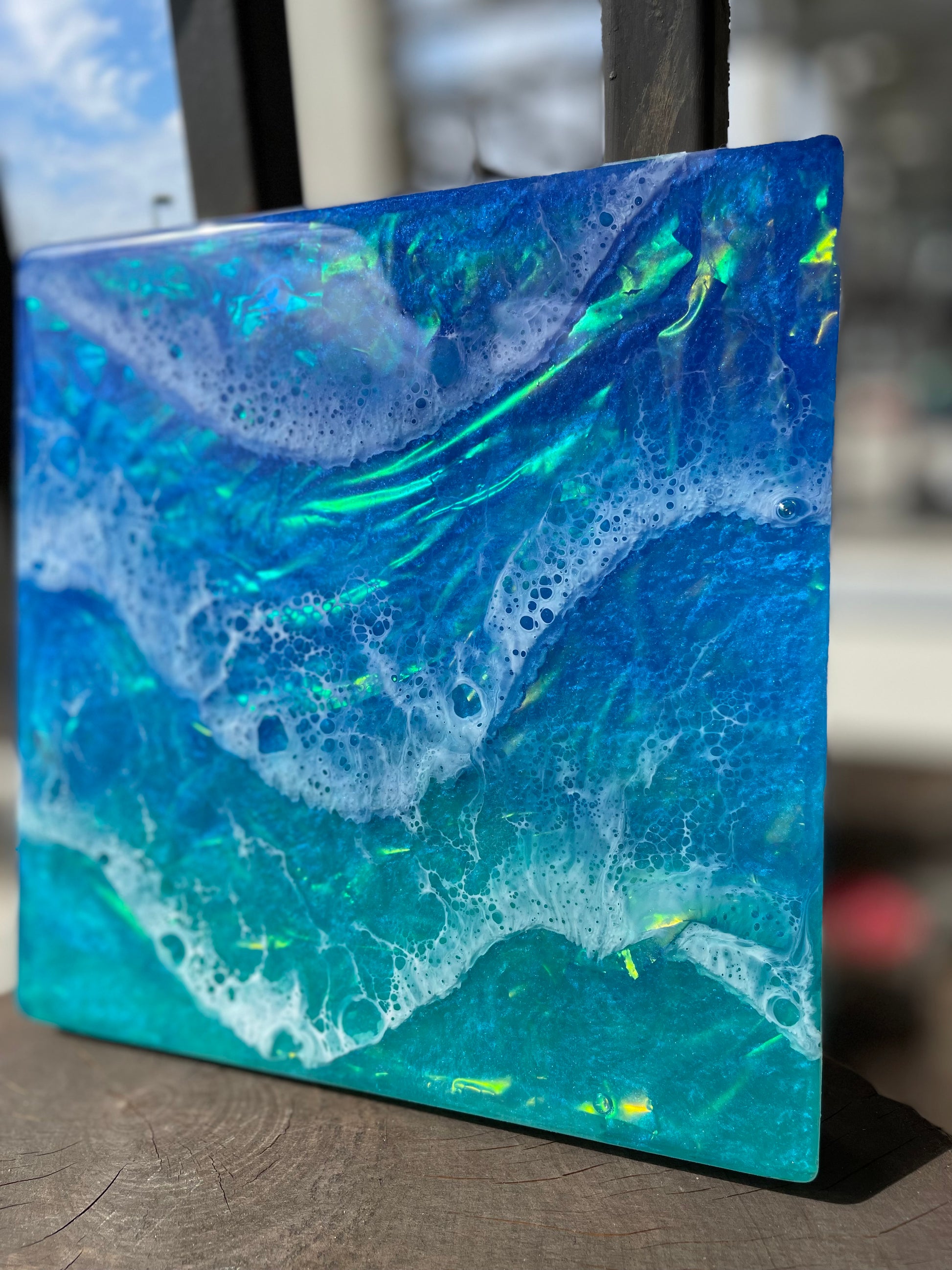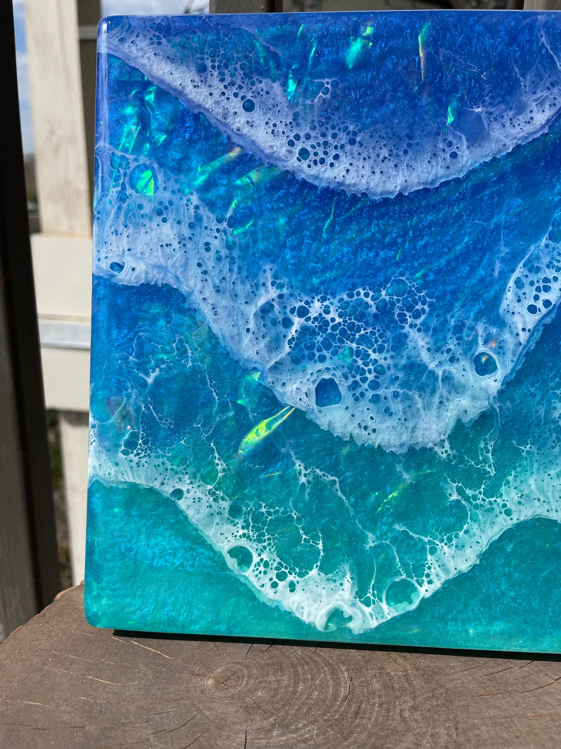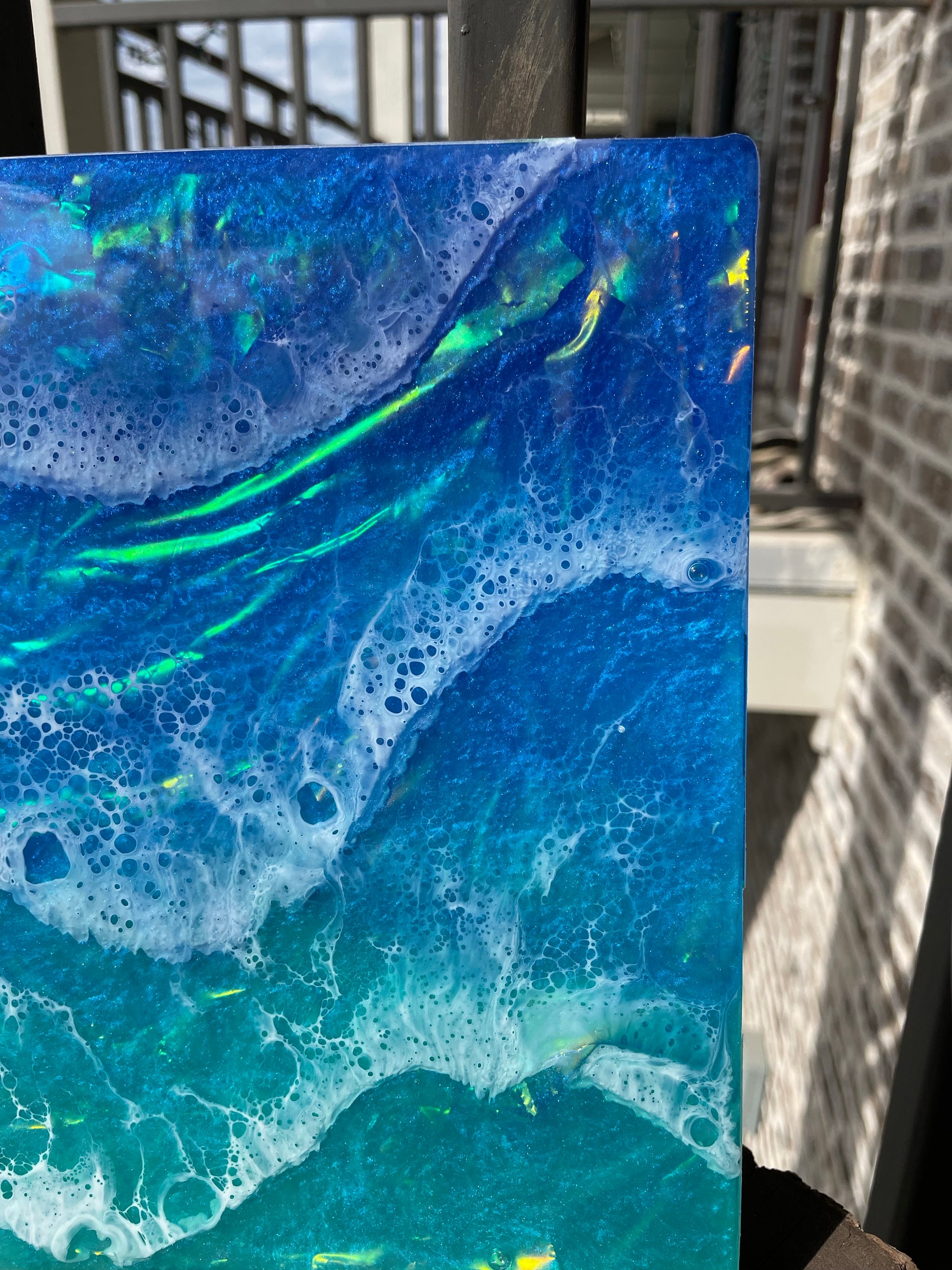 8x8 ocean inspired wall art. This is a holographic ocean piece with 3 water waves and wood sides.