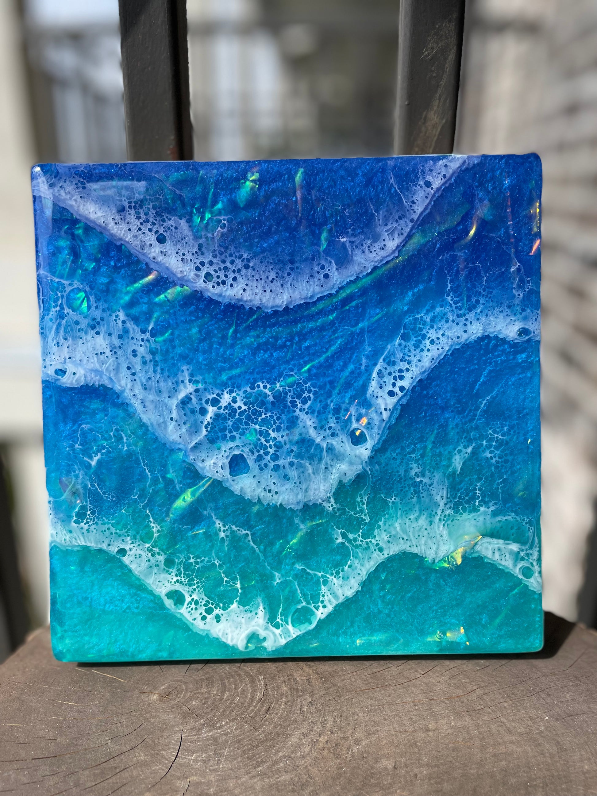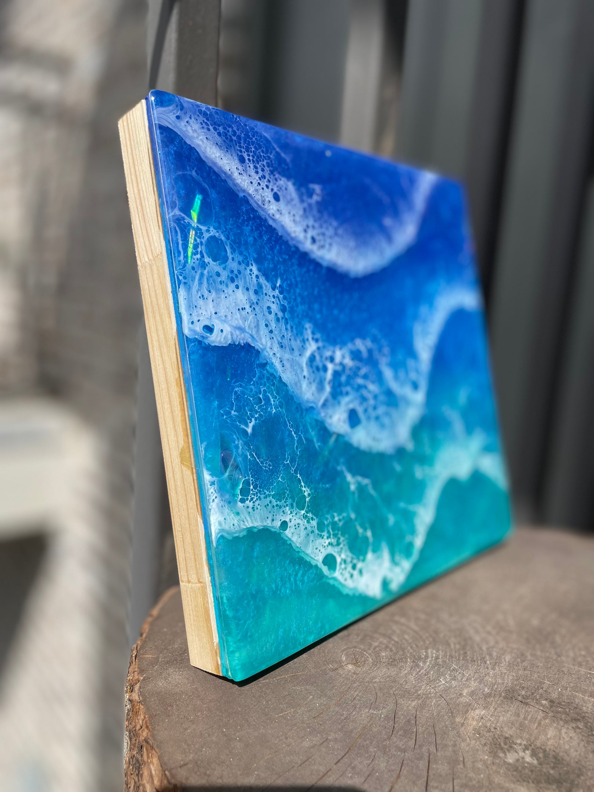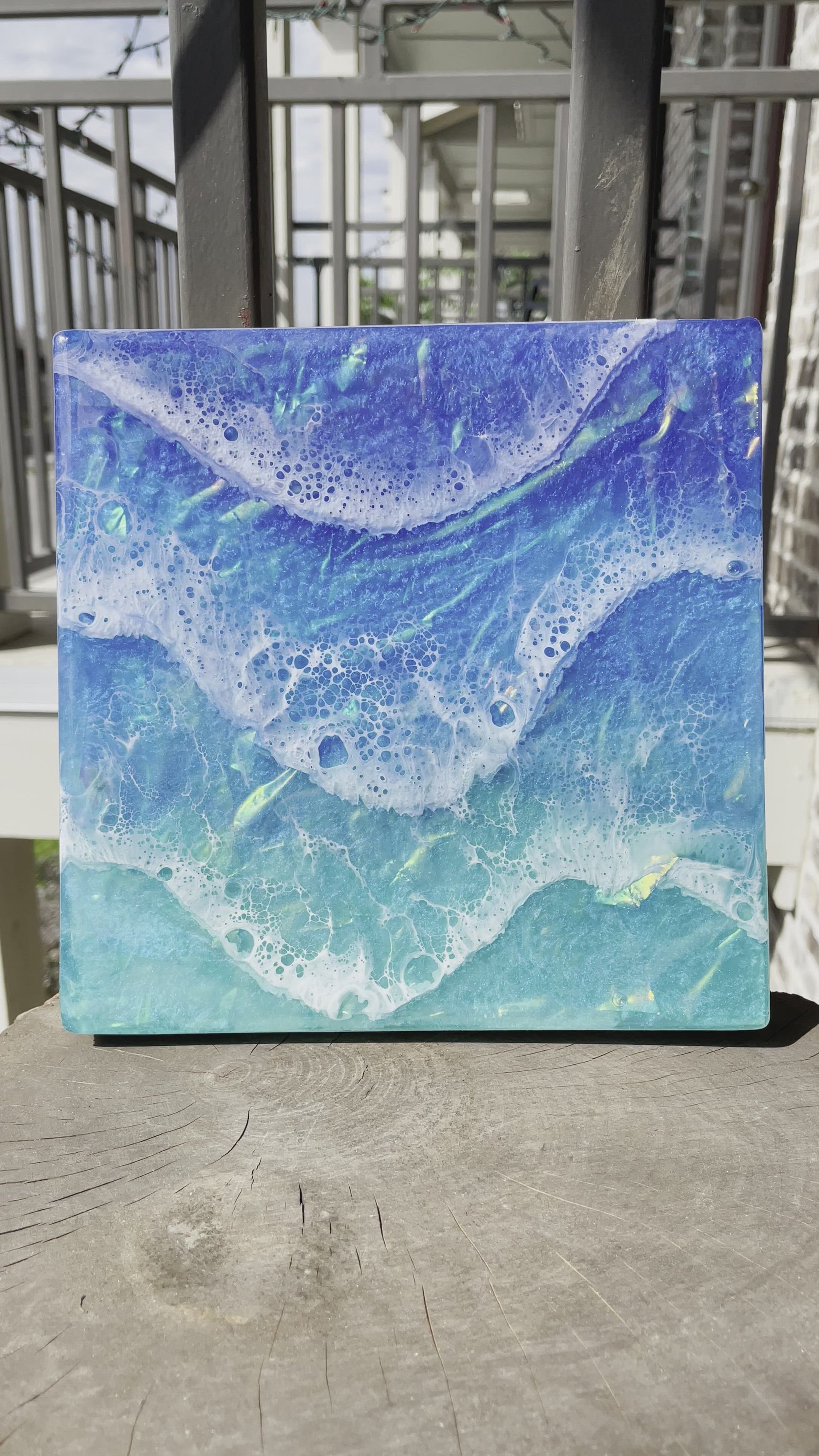 8x8 ocean inspired wall art. This is a holographic ocean piece with 3 water waves and wood sides.