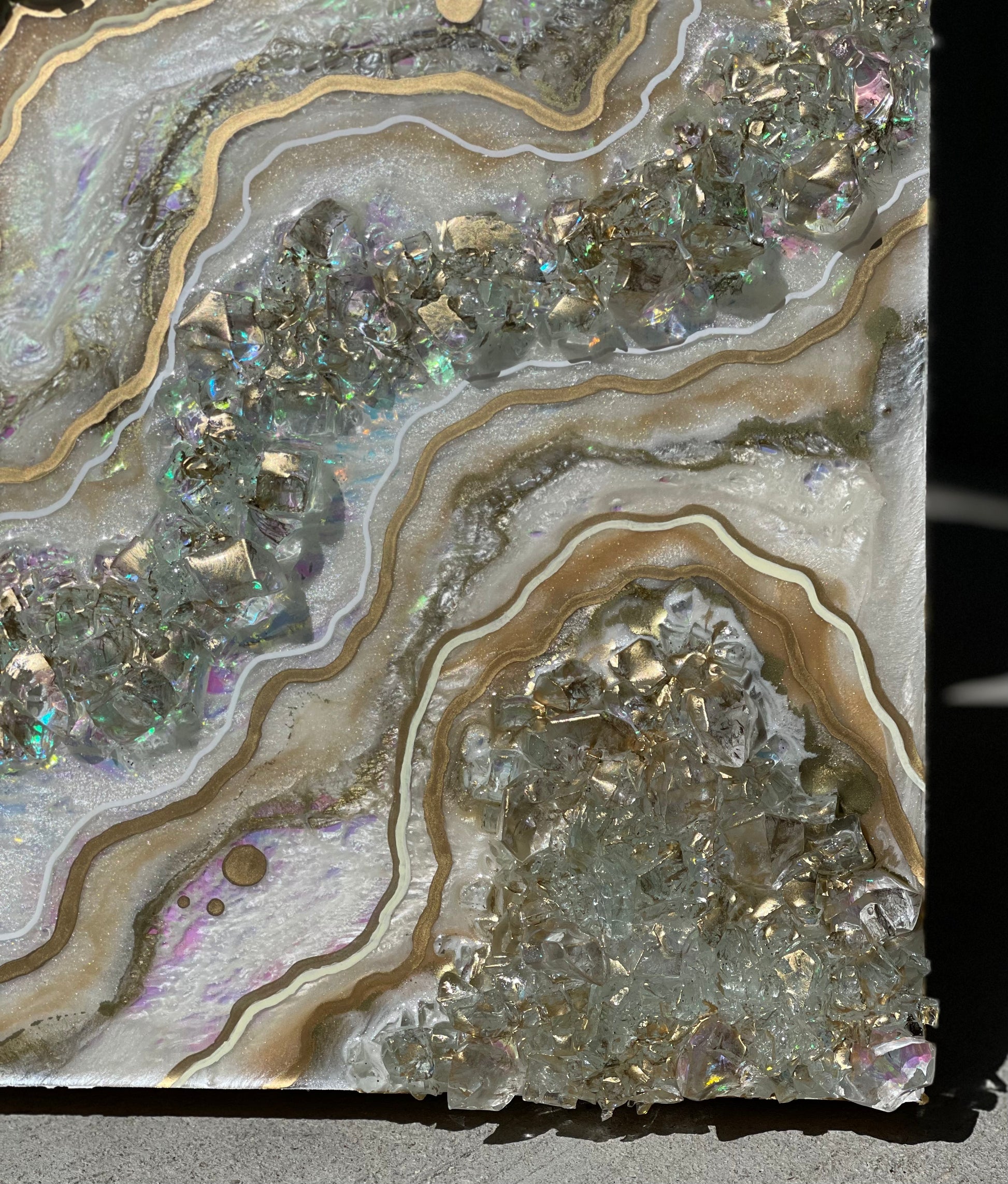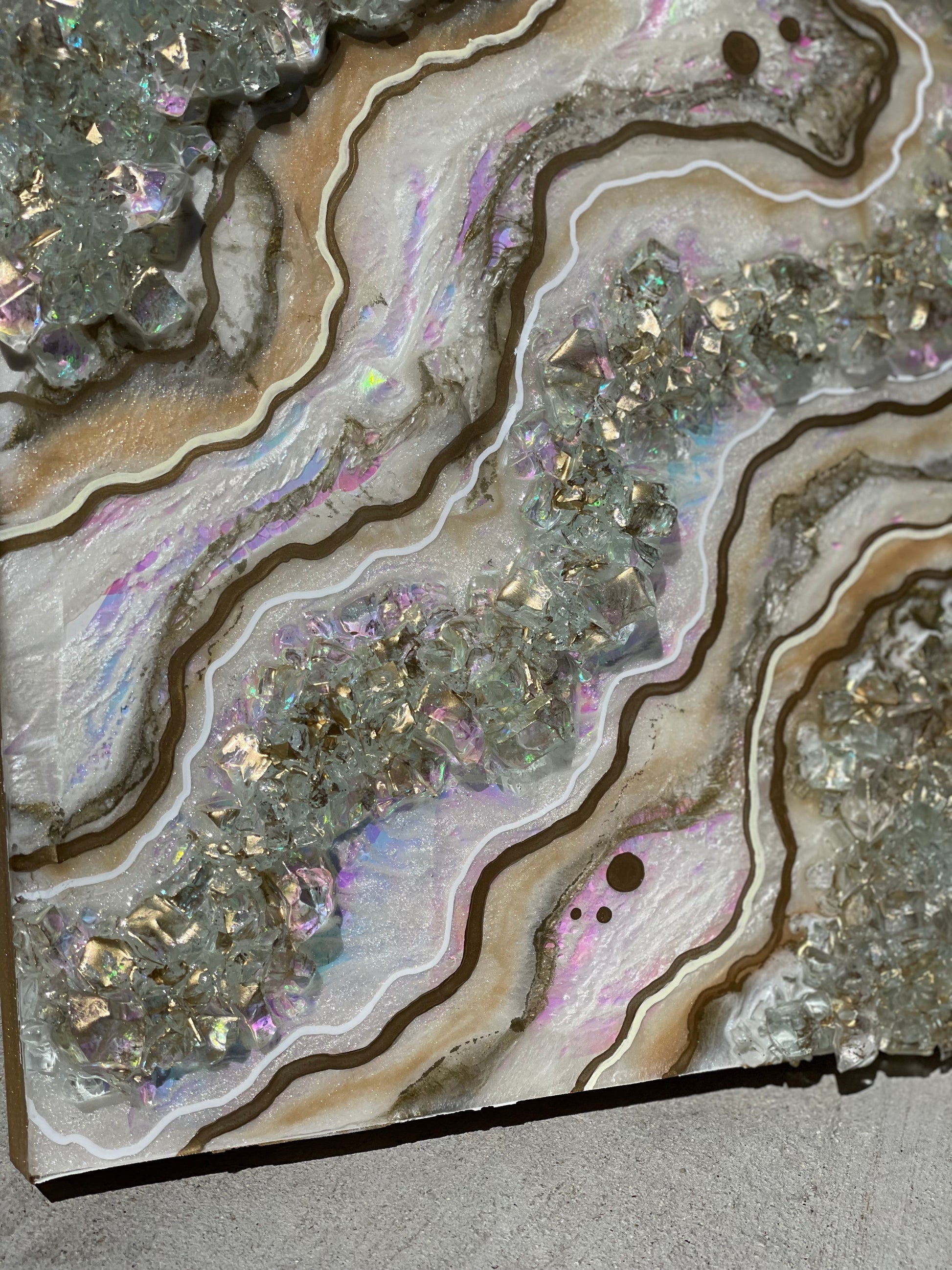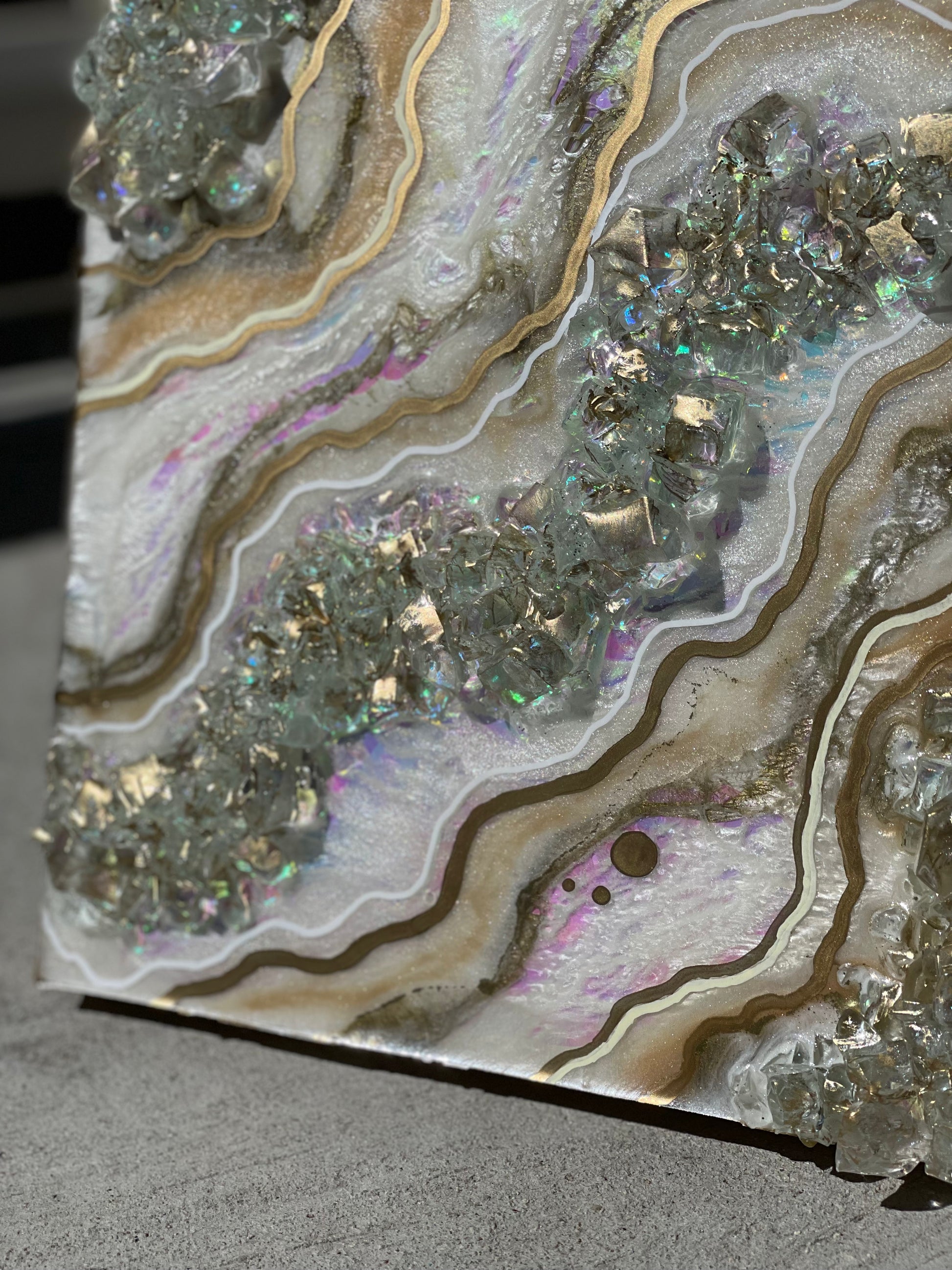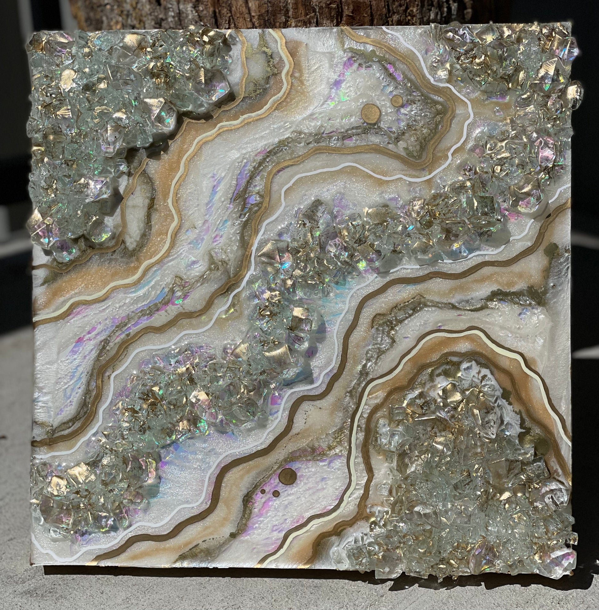 12x12 inch canvas with 1/2 inch gold painted sides. This geode recreation is made to resemble an opal stone.