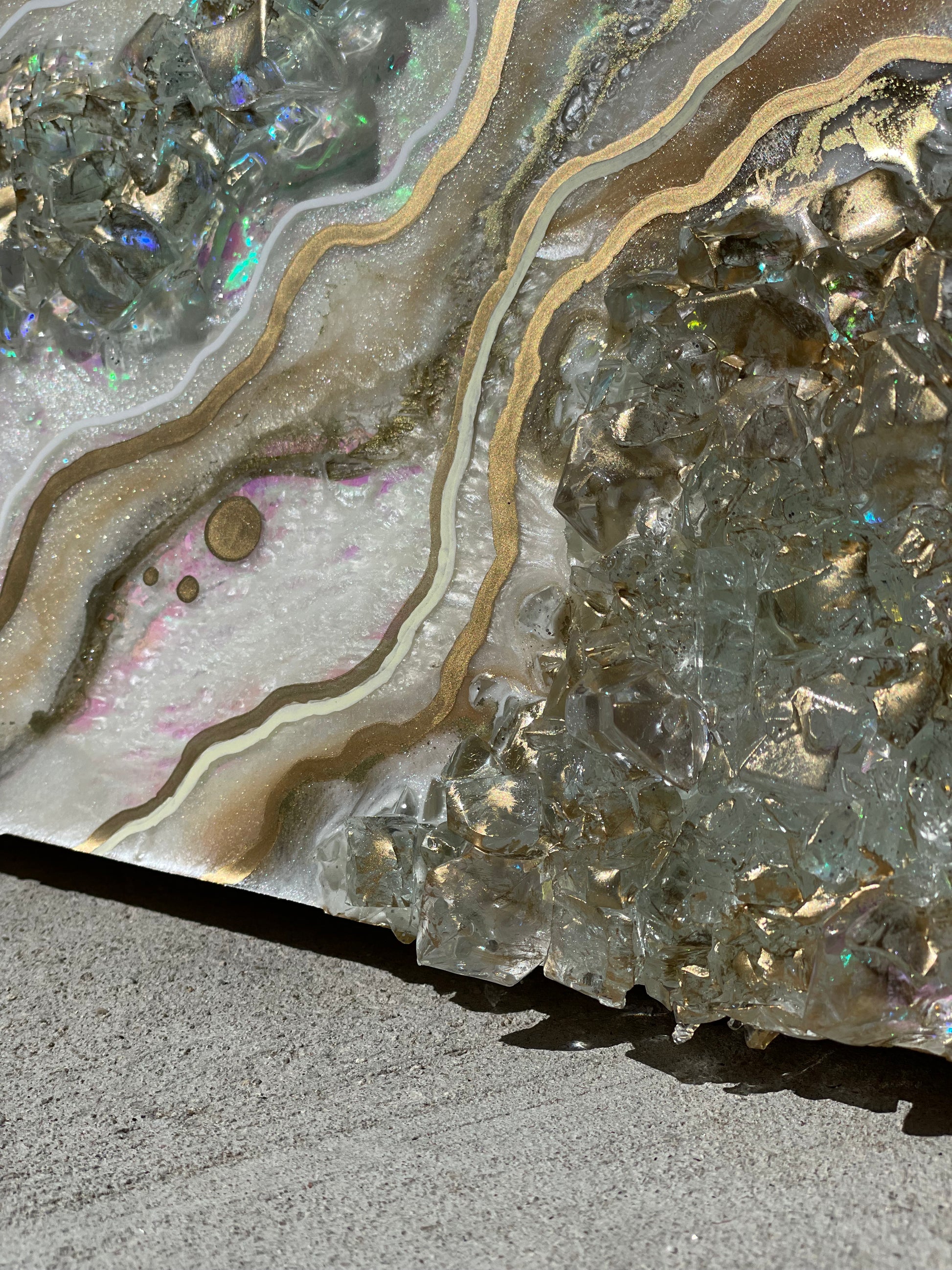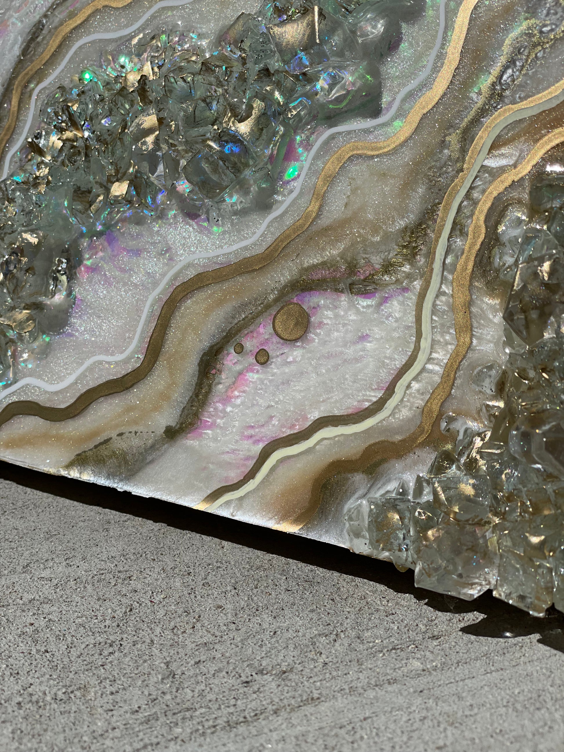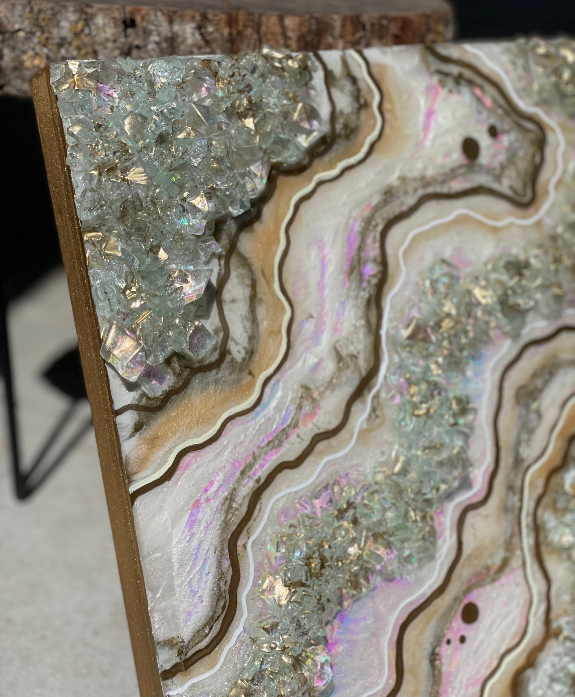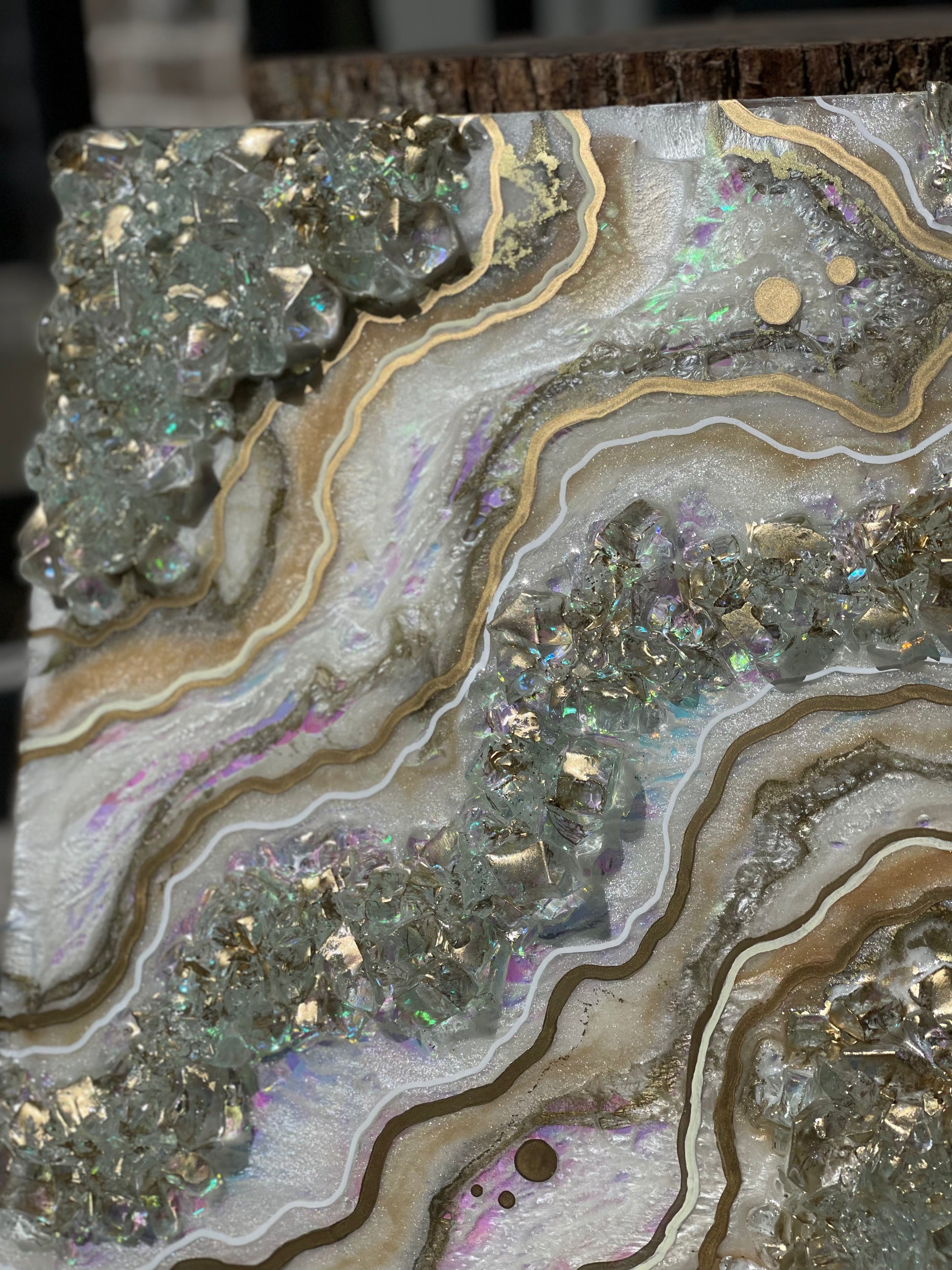 12x12 inch canvas with 1/2 inch gold painted sides. This geode recreation is made to resemble an opal stone.