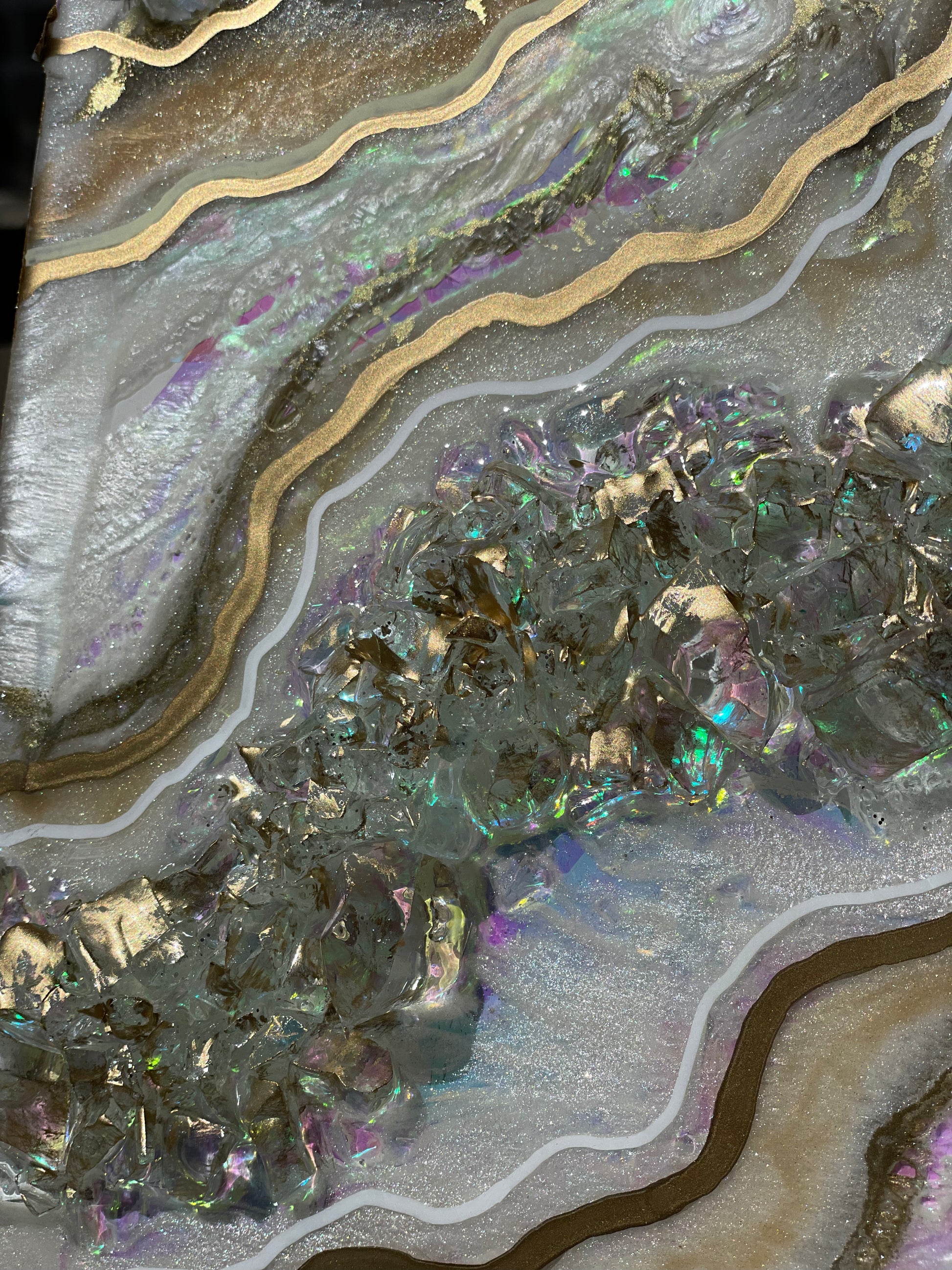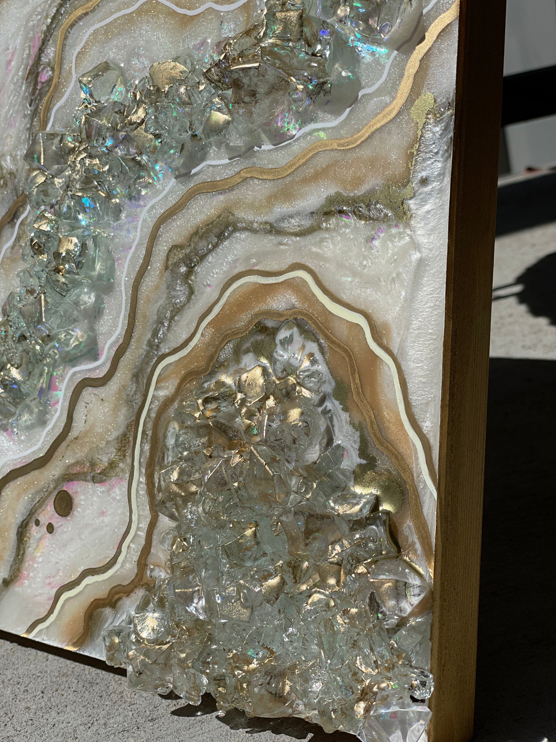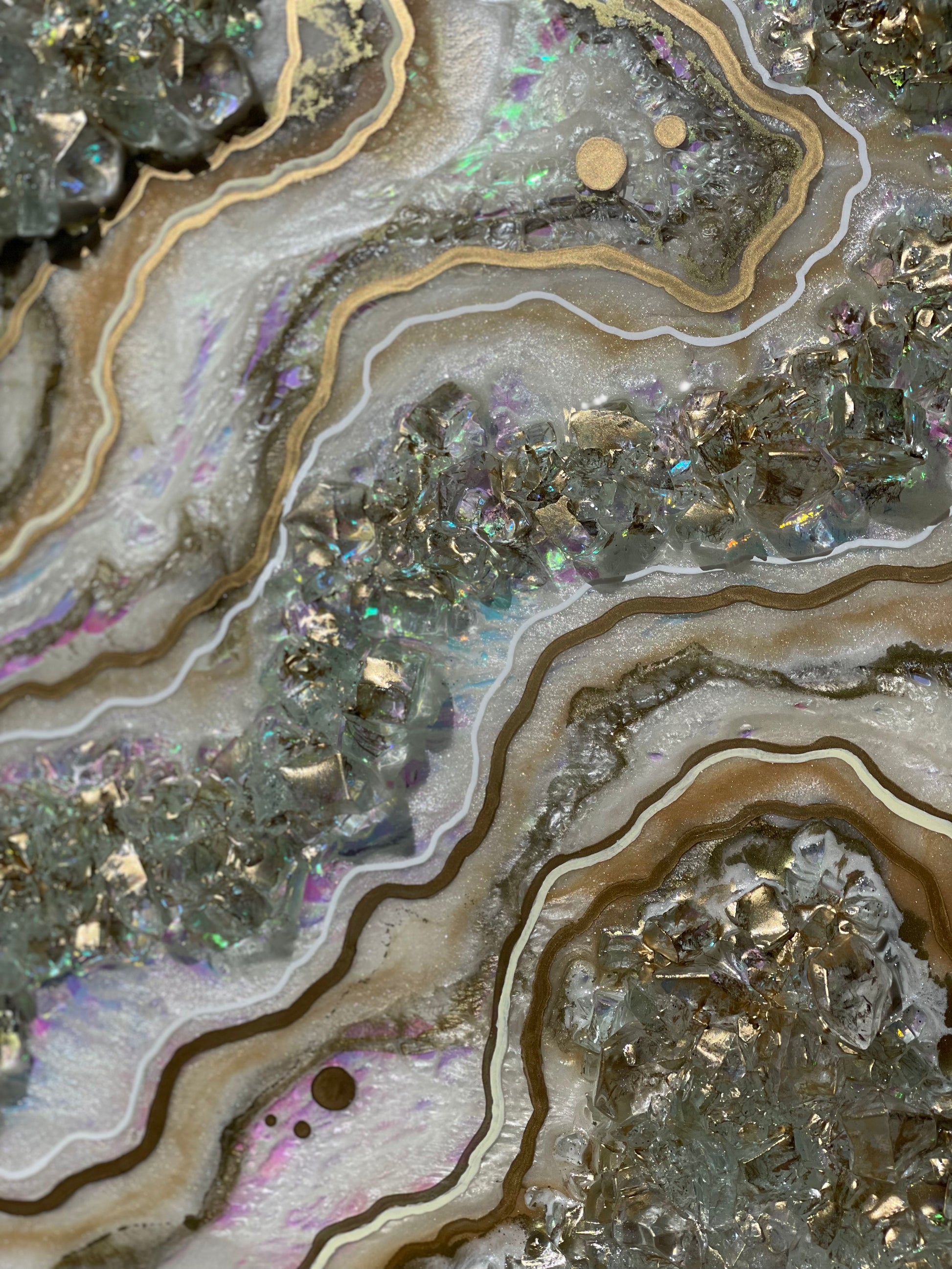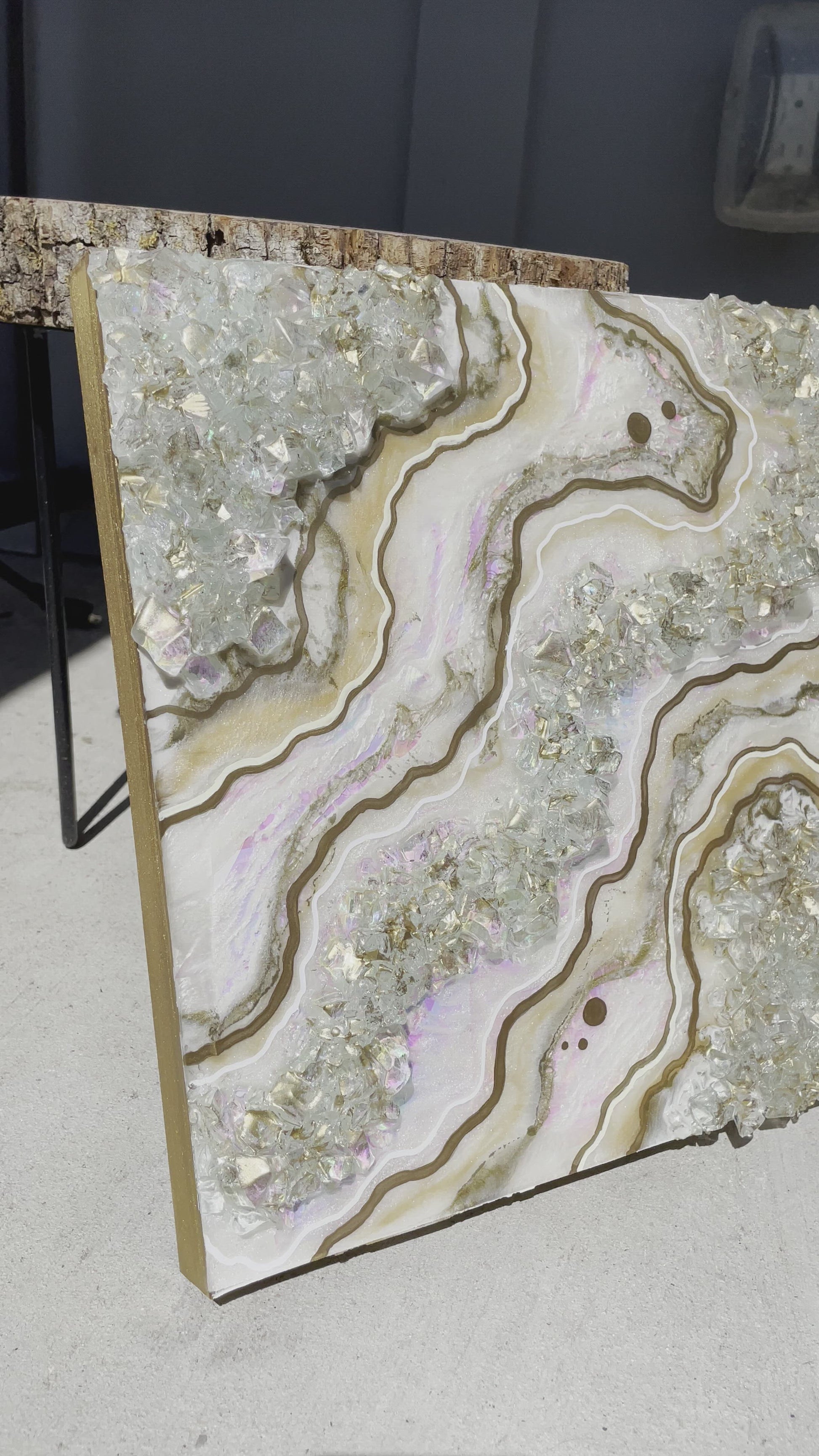 12x12 inch canvas with 1/2 inch gold painted sides. This geode recreation is made to resemble an opal stone.