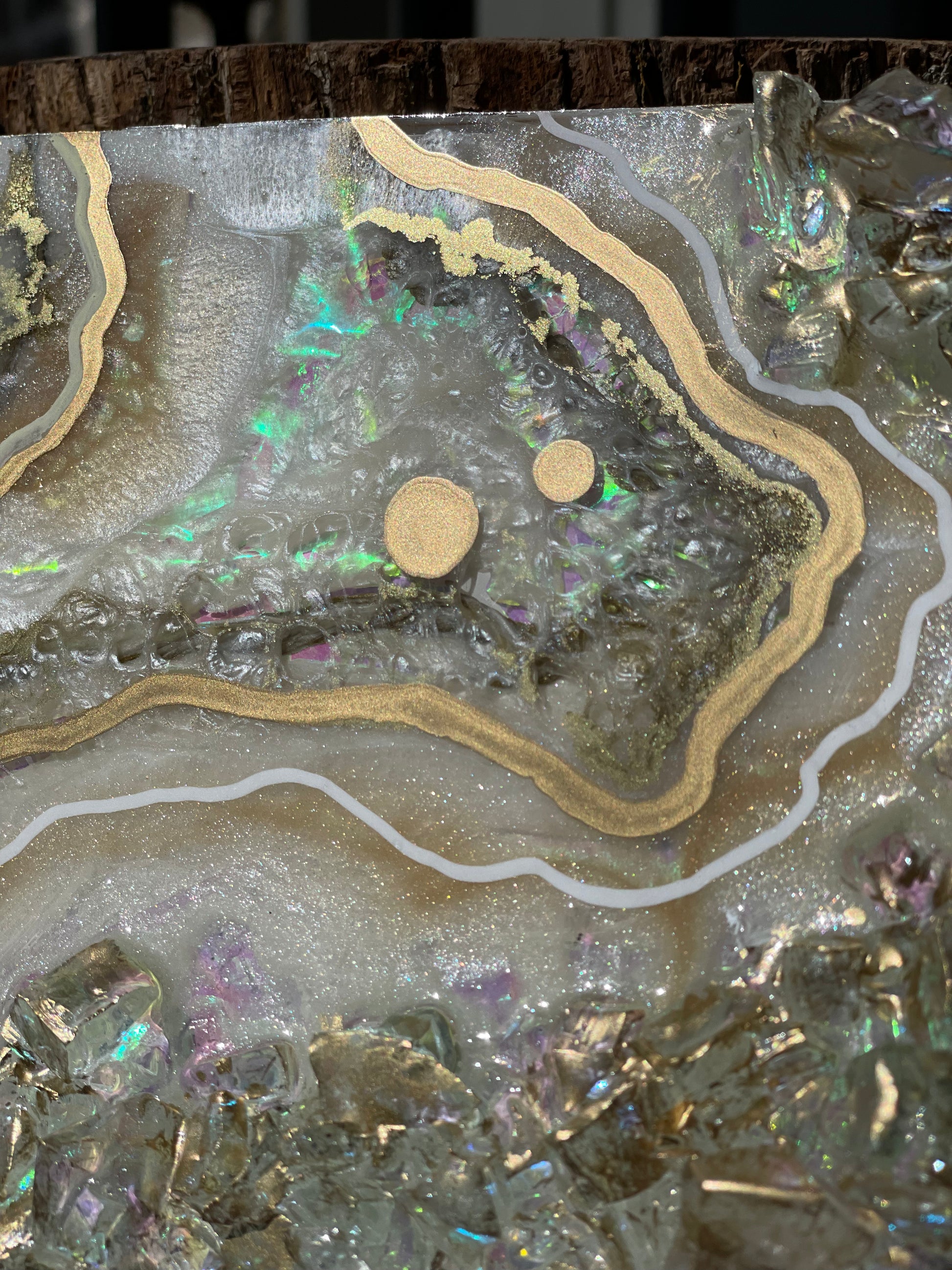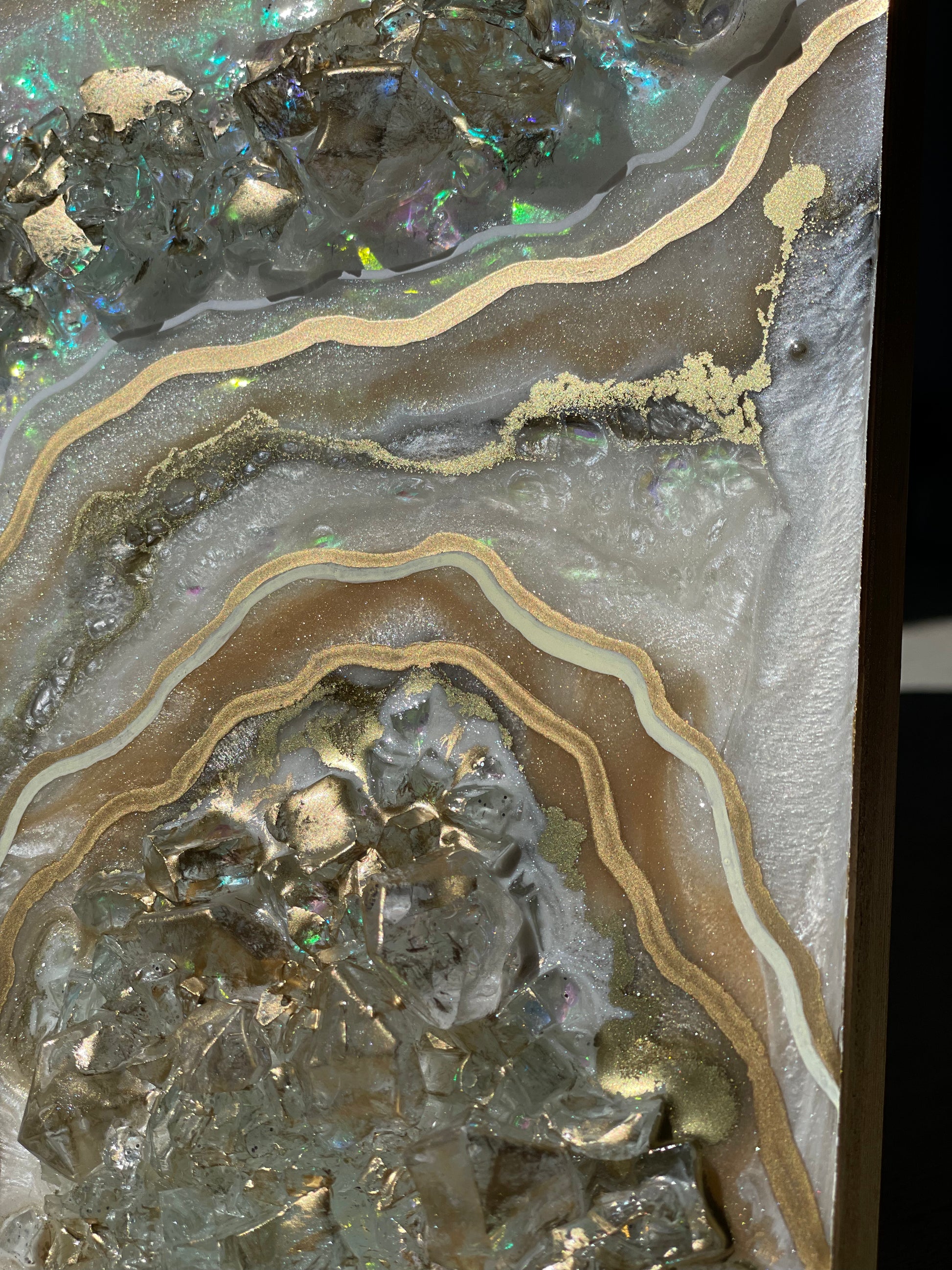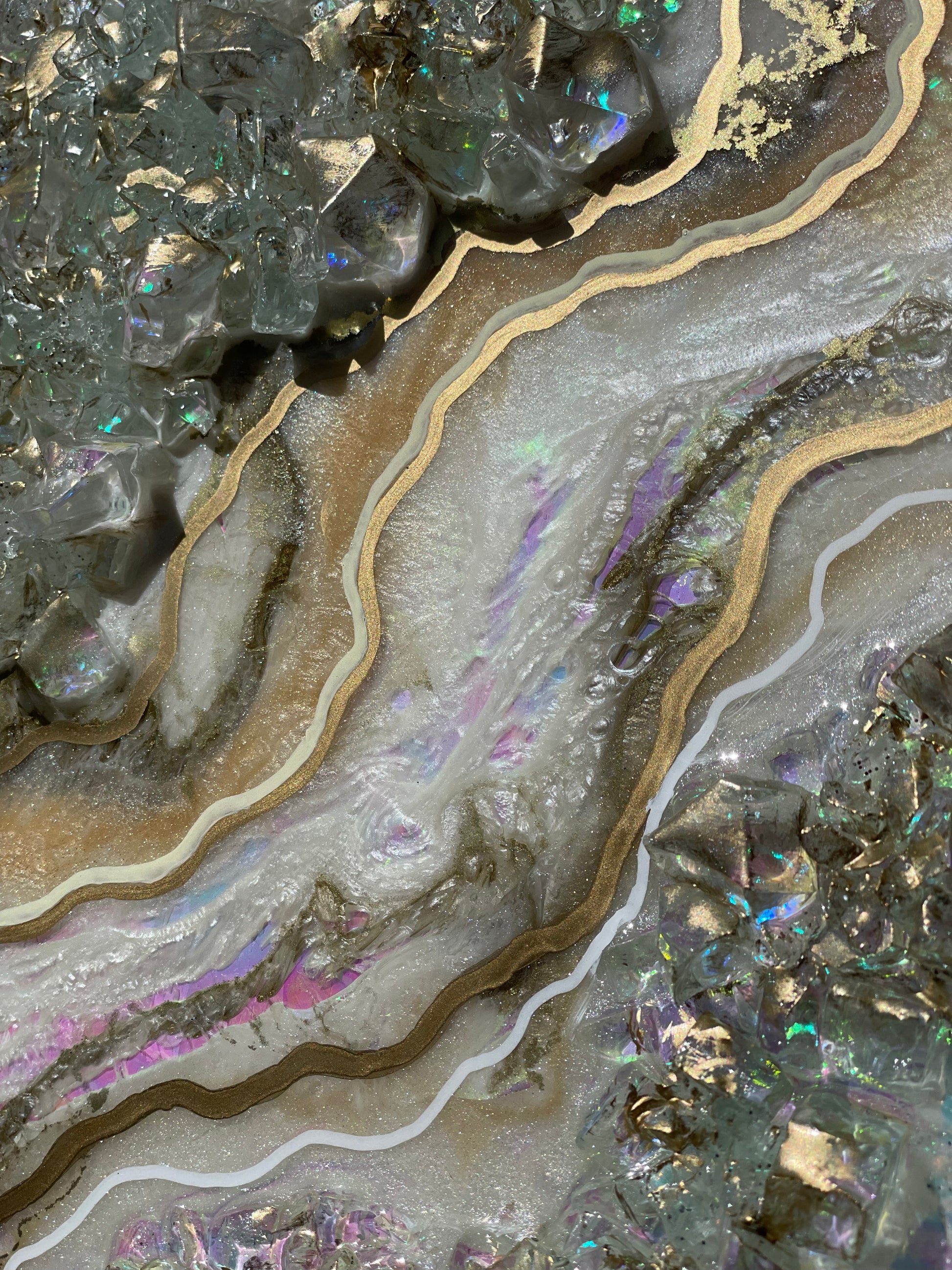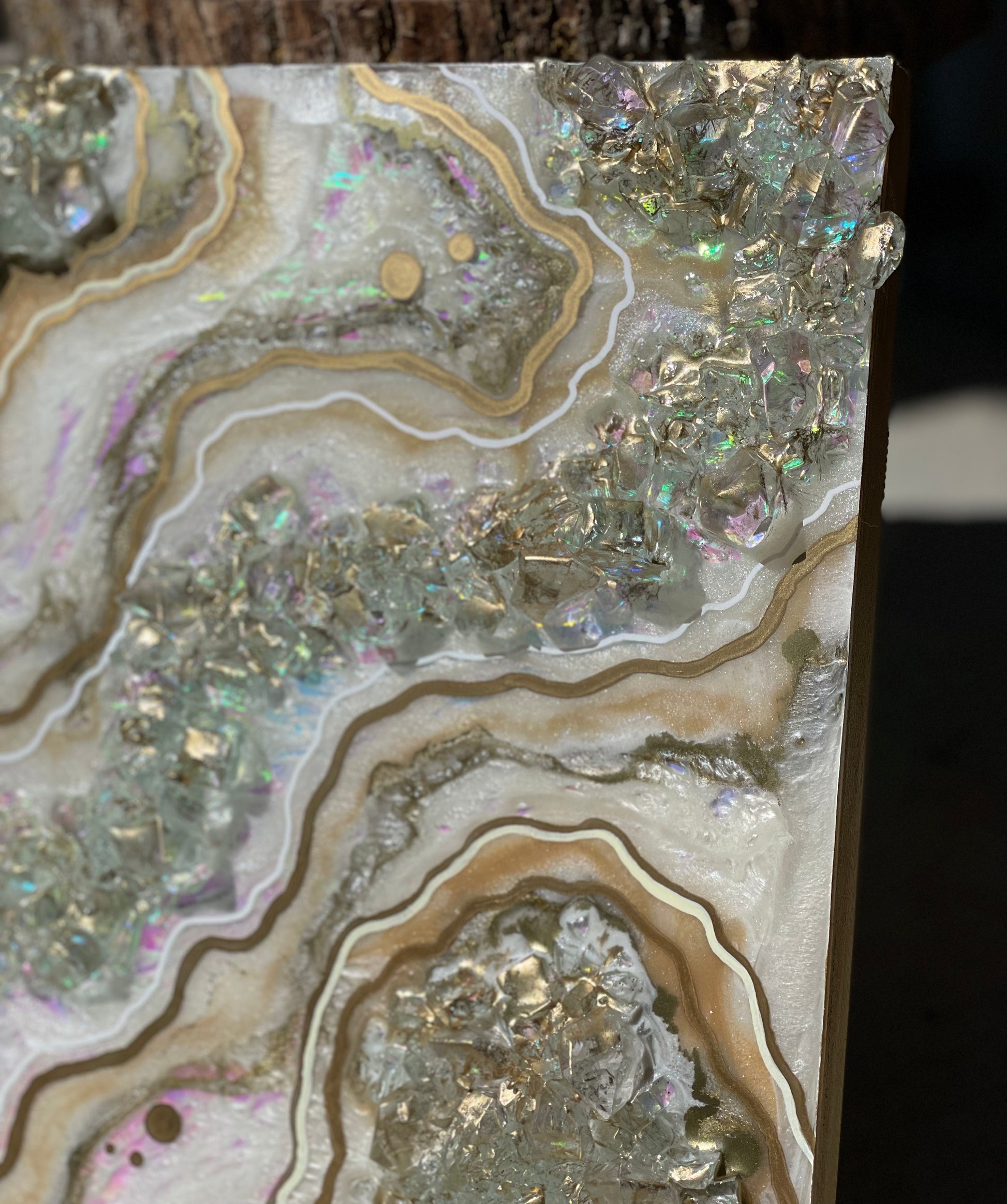 12x12 inch canvas with 1/2 inch gold painted sides. This geode recreation is made to resemble an opal stone.