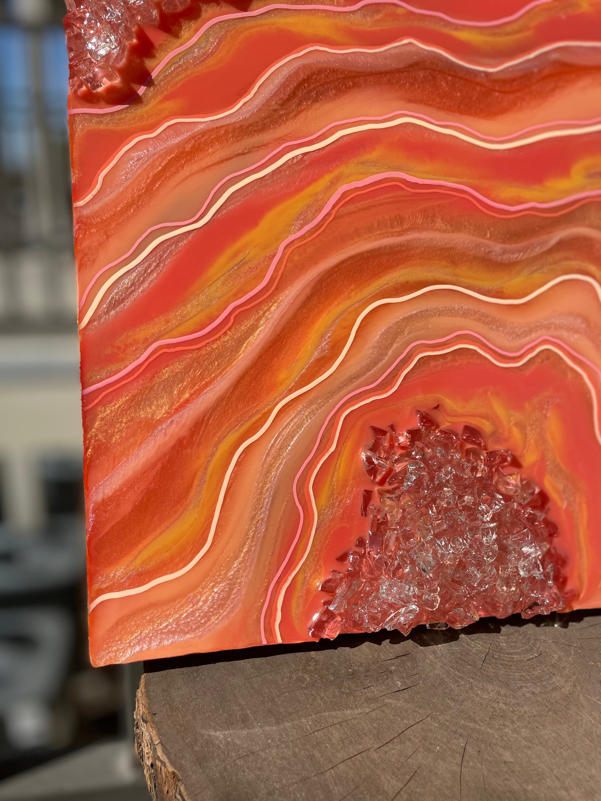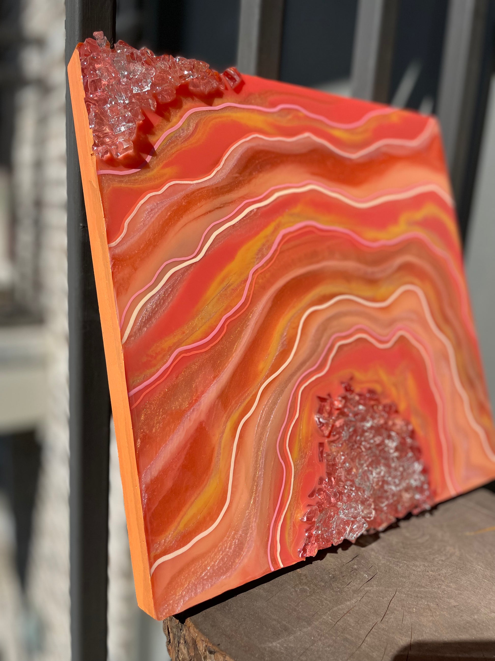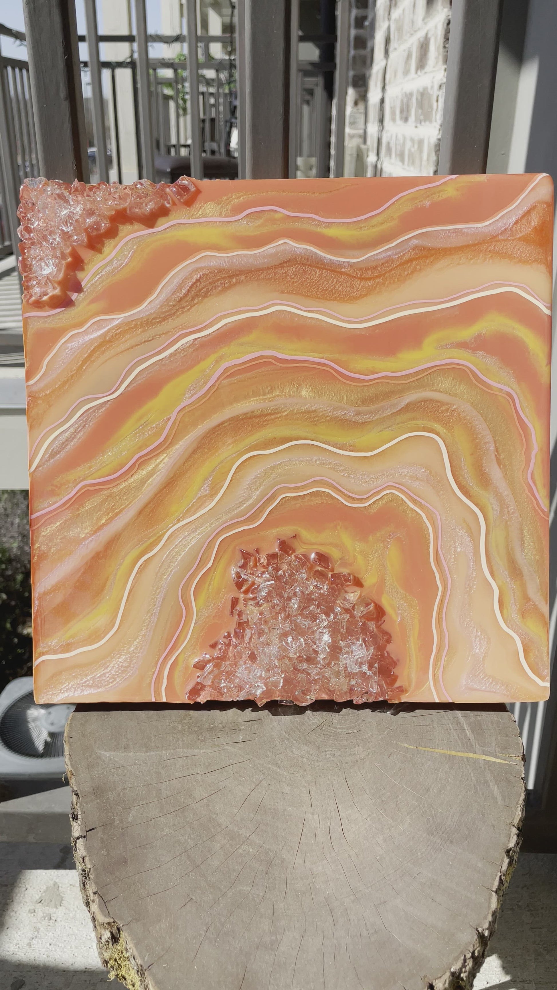 12x12 inch canvas with 1/2 inch sides painted orange. Made with the colors of coral, orange and soft details of light pink.