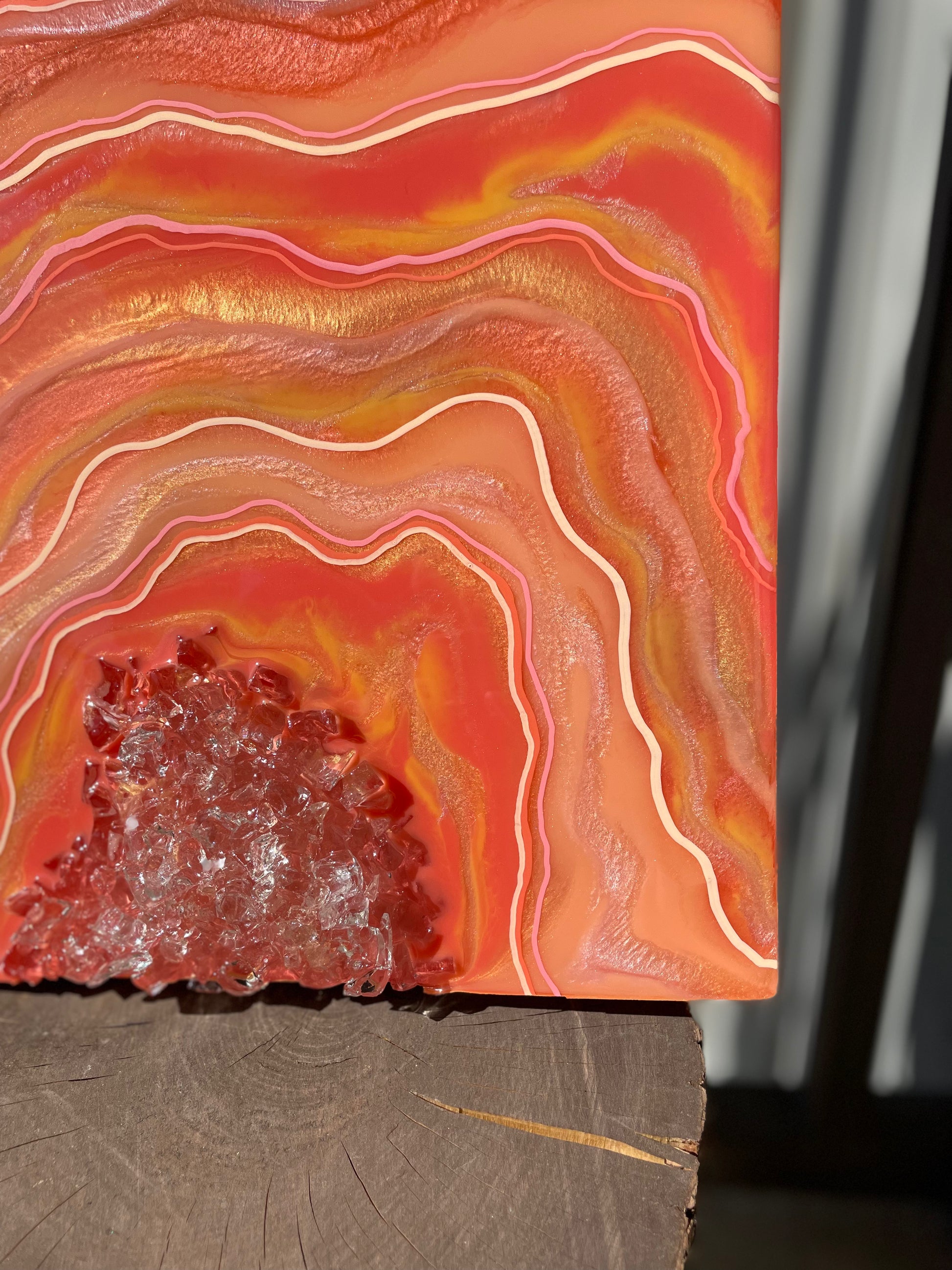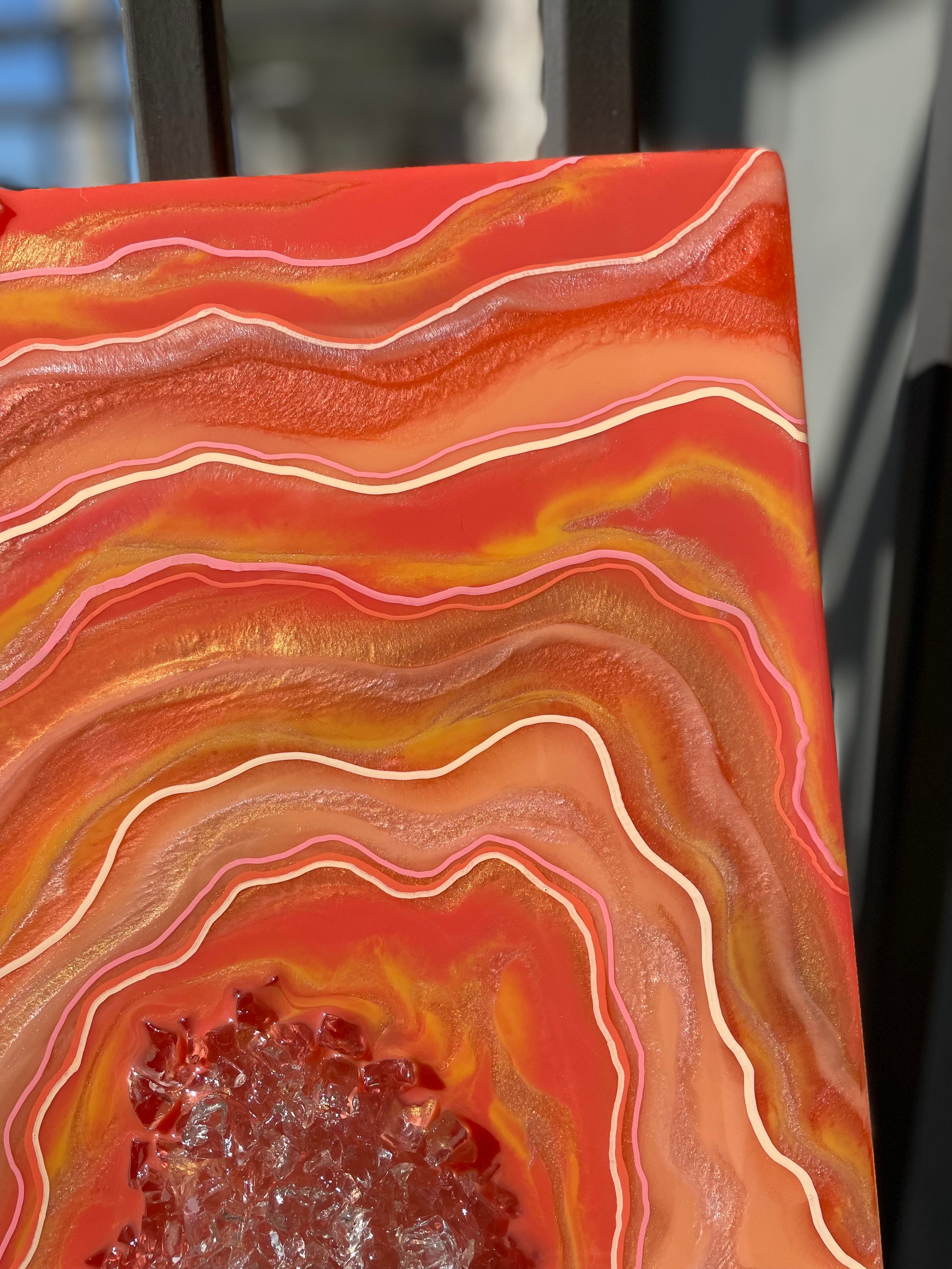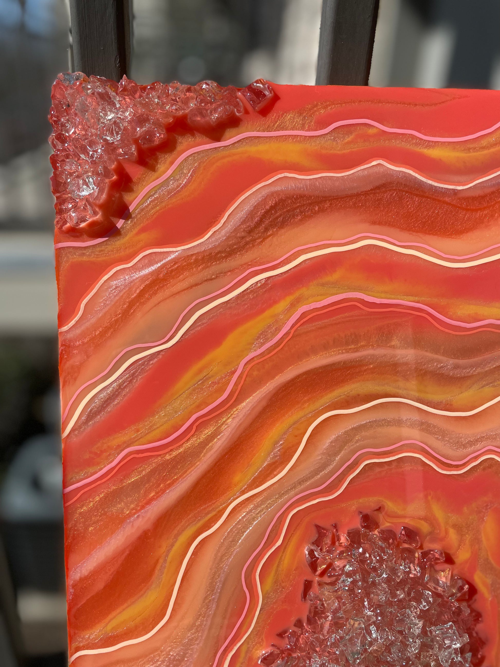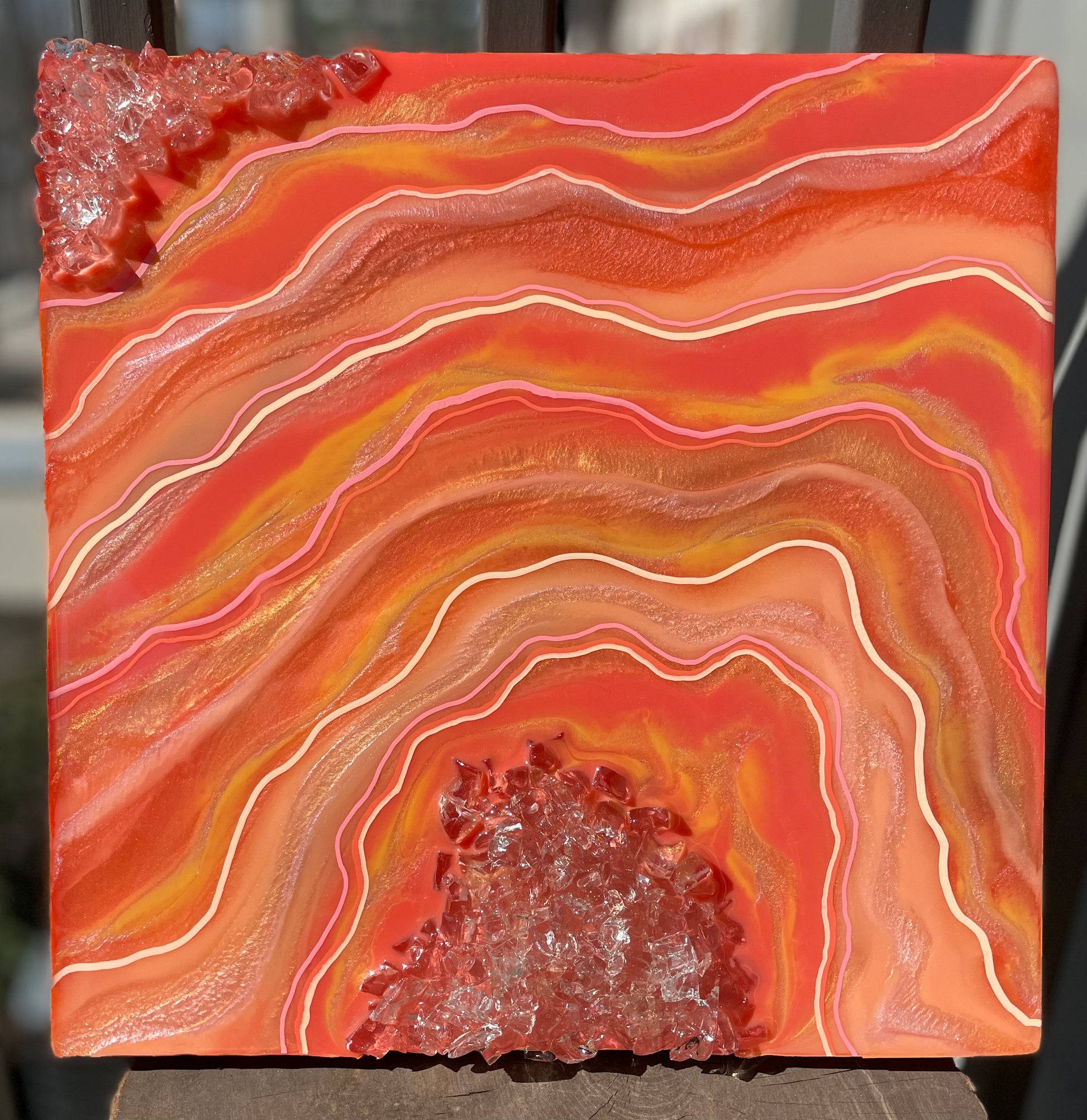 12x12 inch canvas with 1/2 inch sides painted orange. Made with the colors of coral, orange and soft details of light pink.