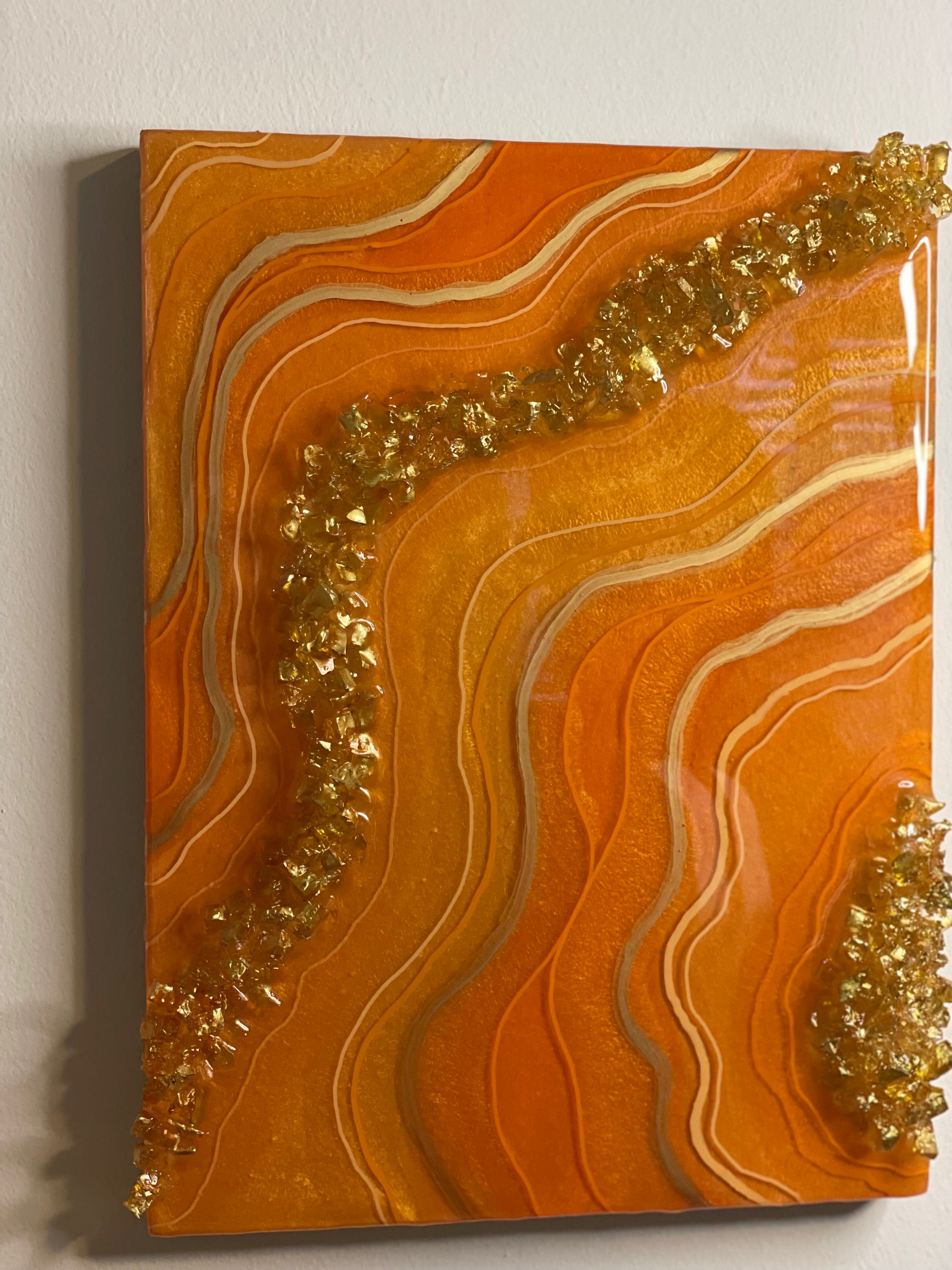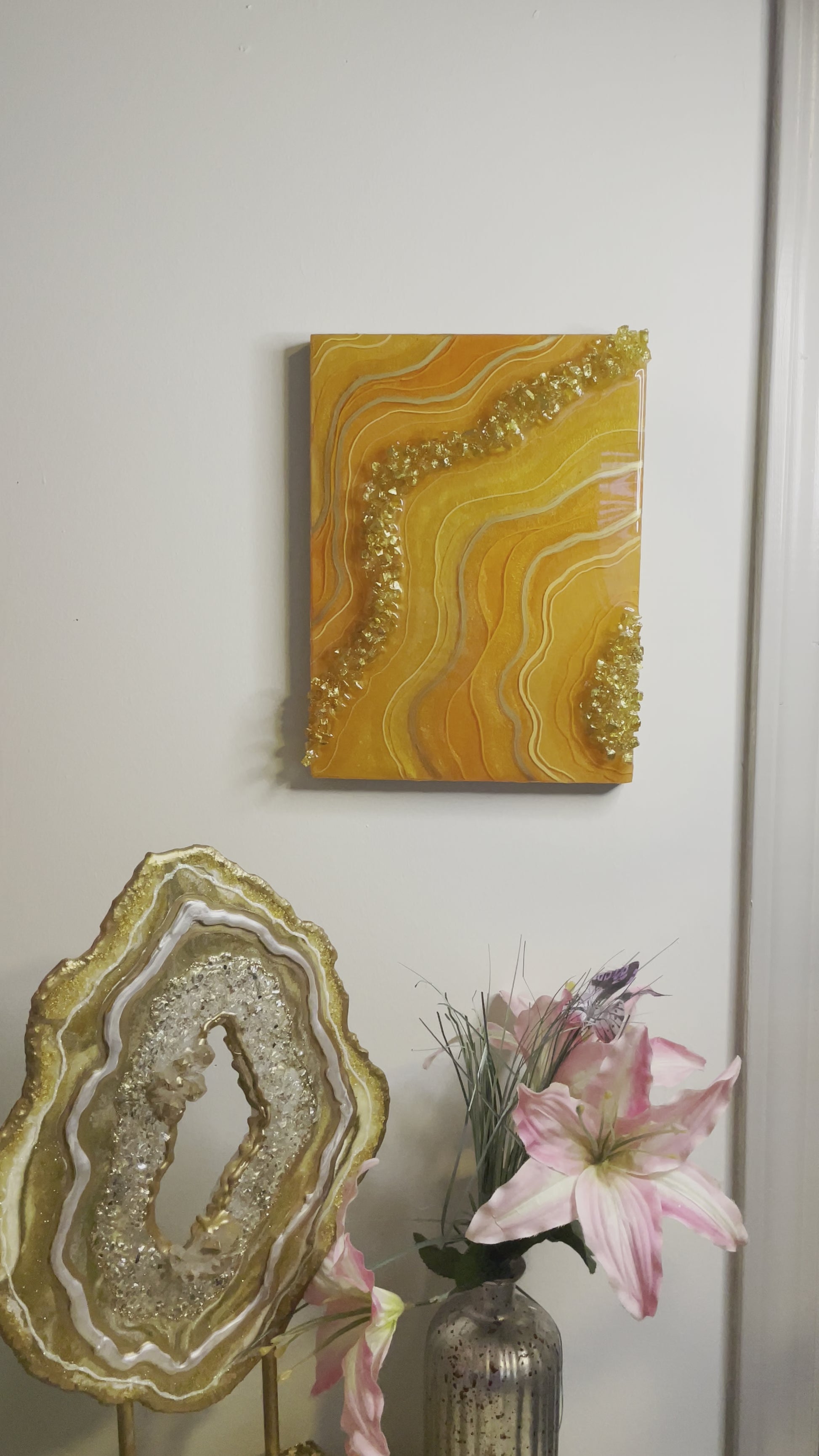 9x12 mixed media, geode wall art; 1/2’ sides painted gold.