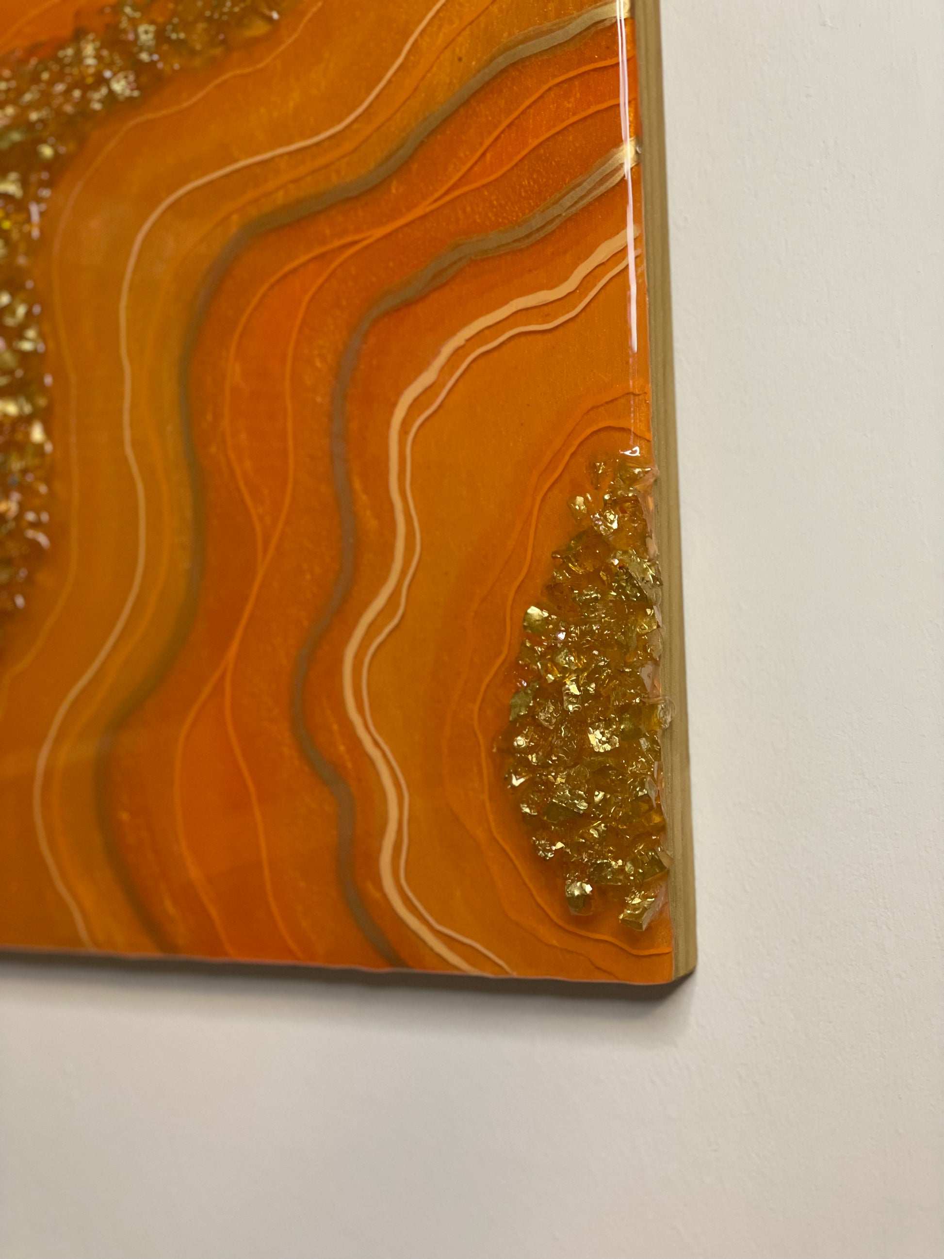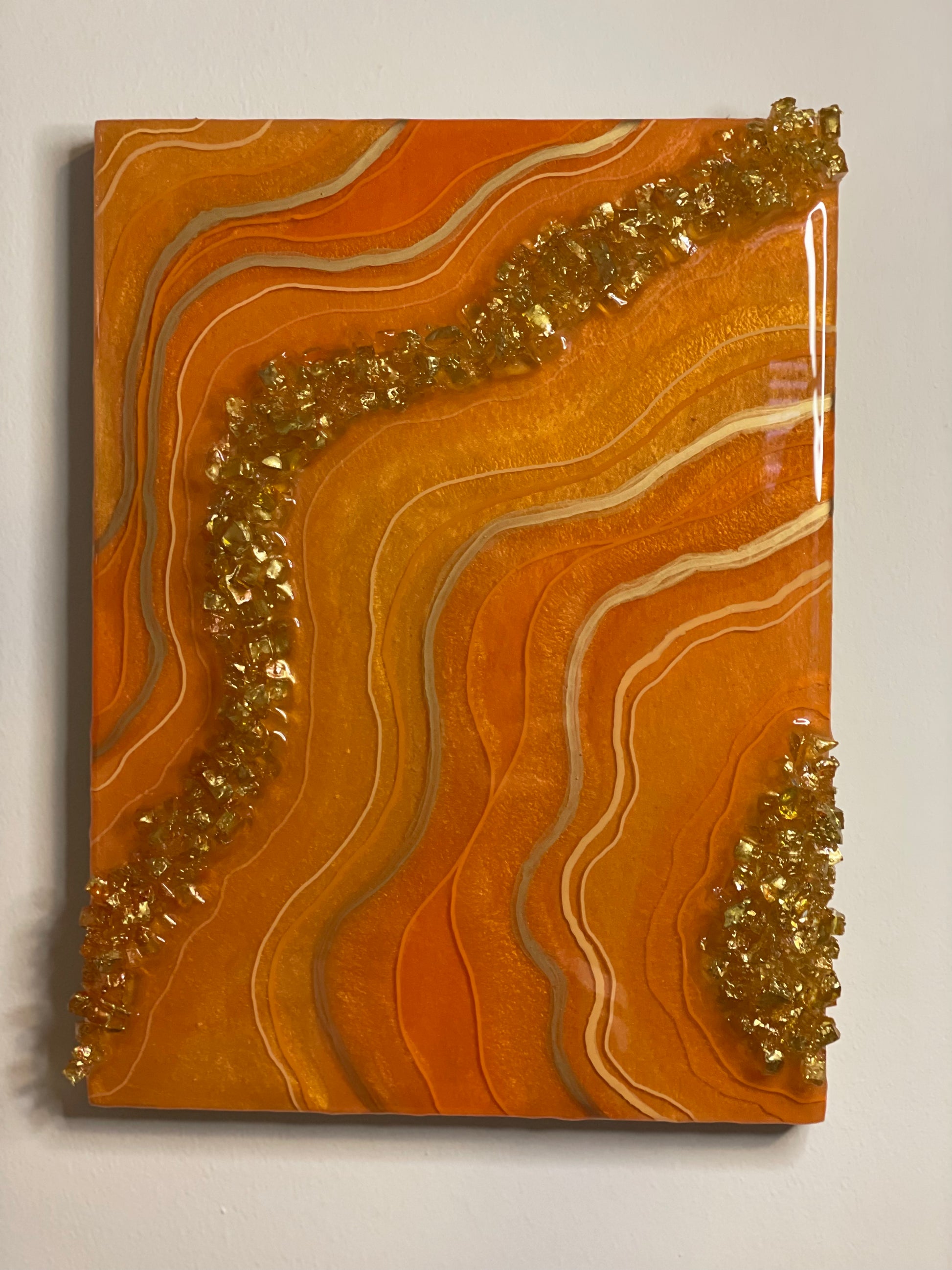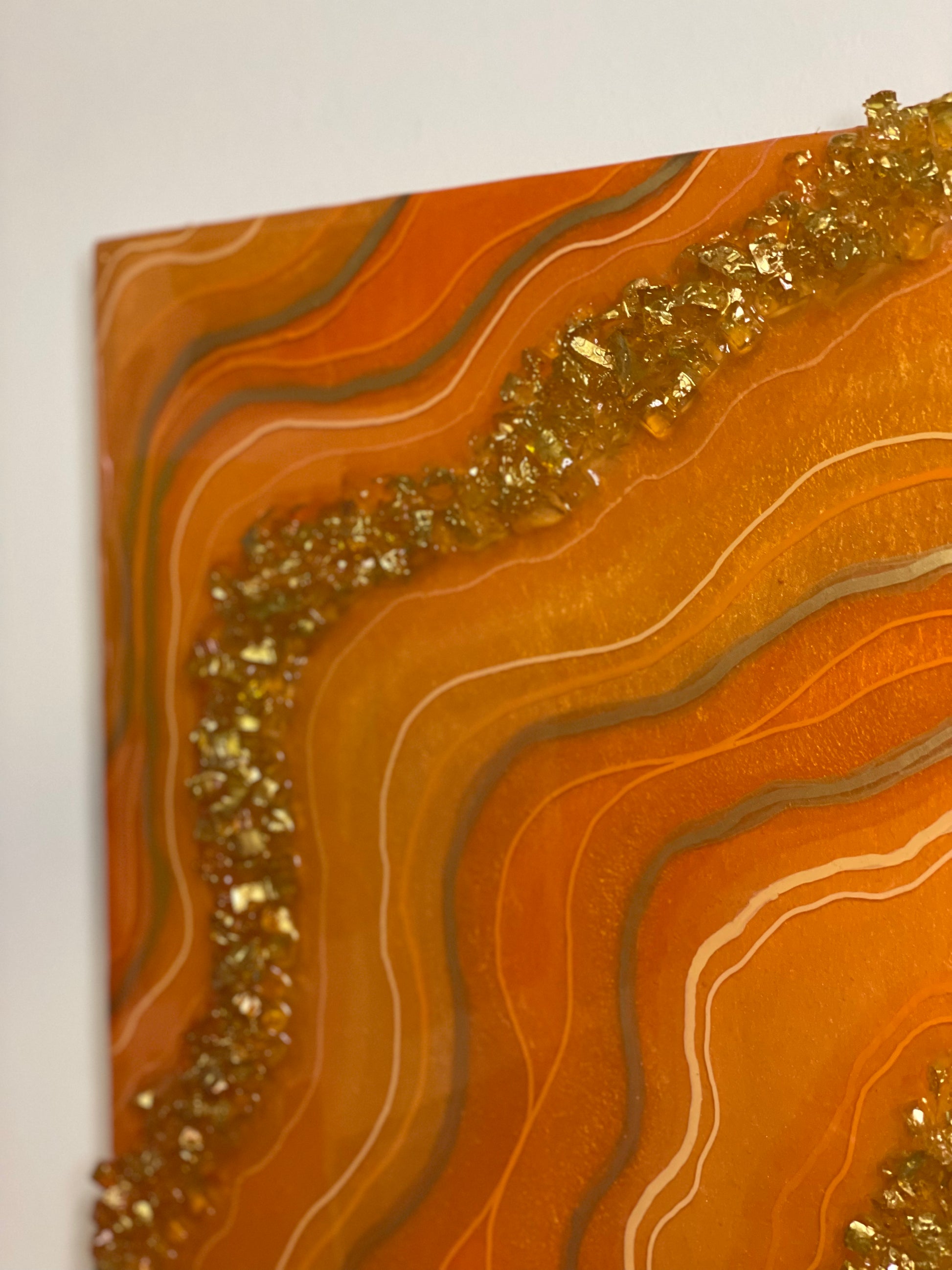This piece is created with multiple layers to enhance the depth, and to make it resemble a geode slice. The rocks are painted orange and gold for a nice metallic pop of color to bring out the detailed lines.