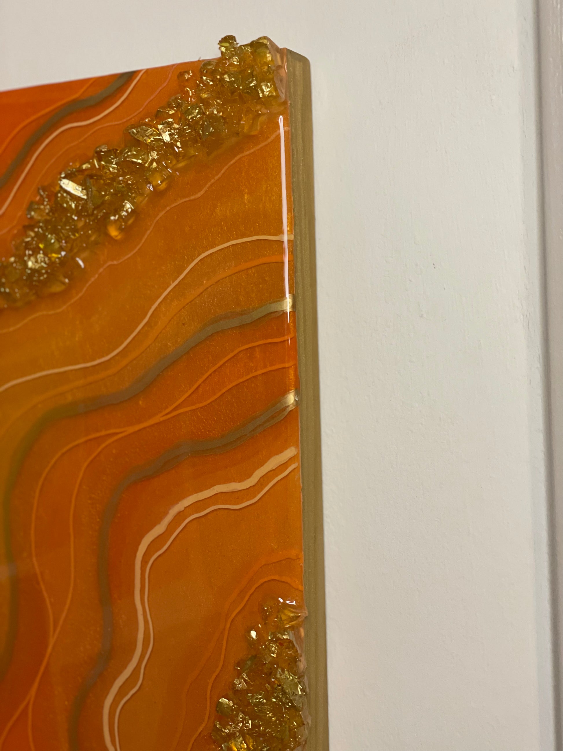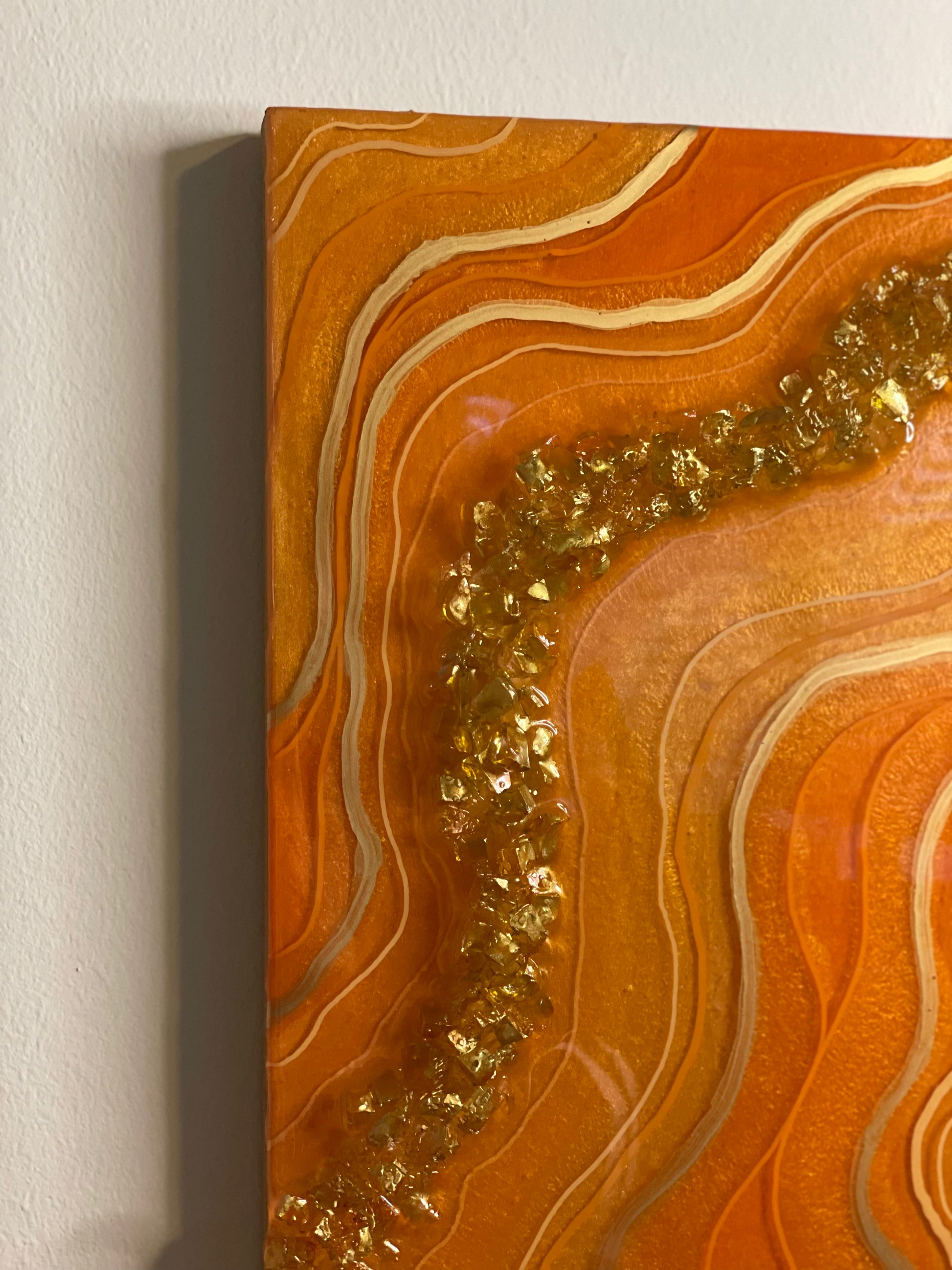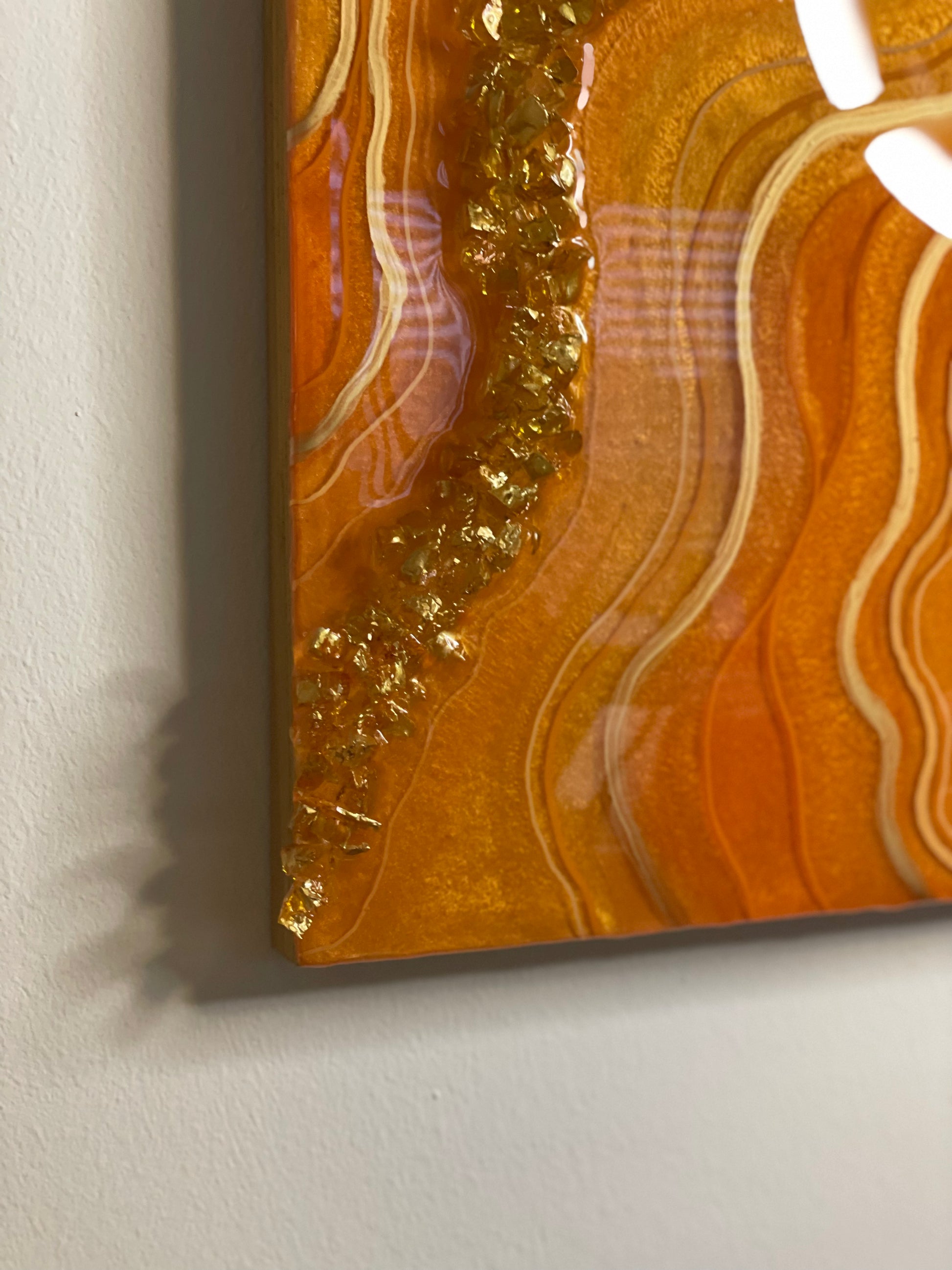 This piece is created with multiple layers to enhance the depth, and to make it resemble a geode slice. The rocks are painted orange and gold for a nice metallic pop of color to bring out the detailed lines.